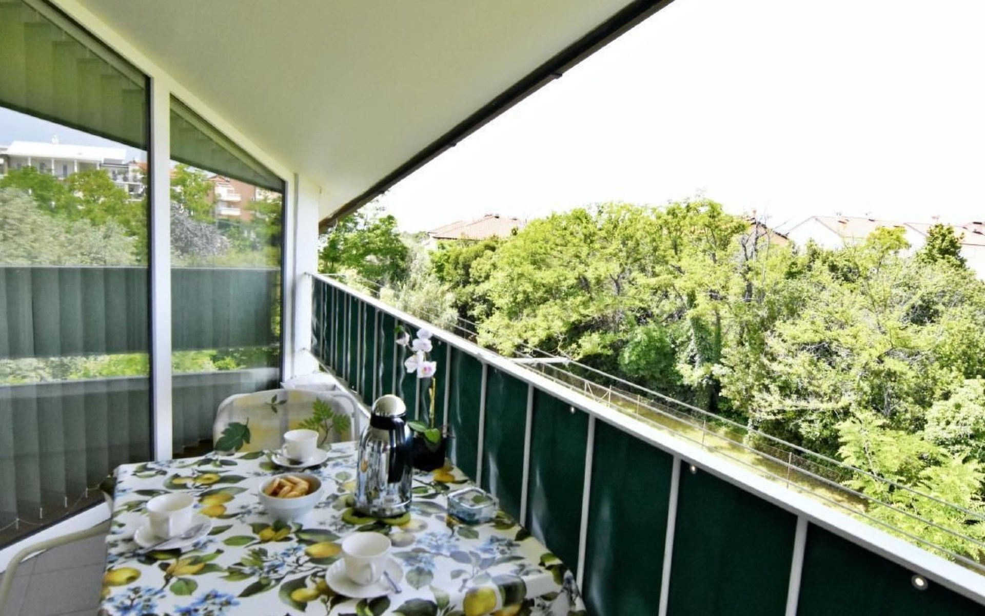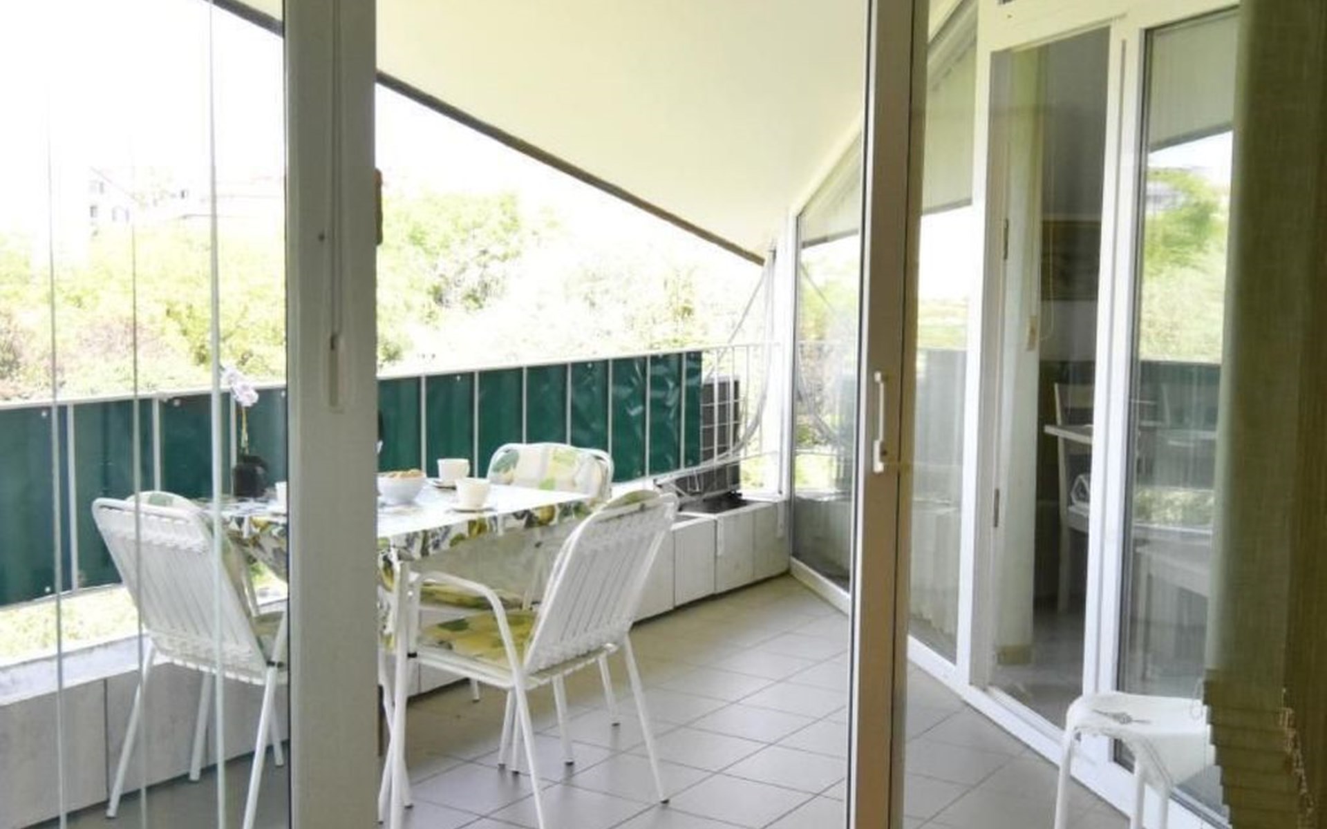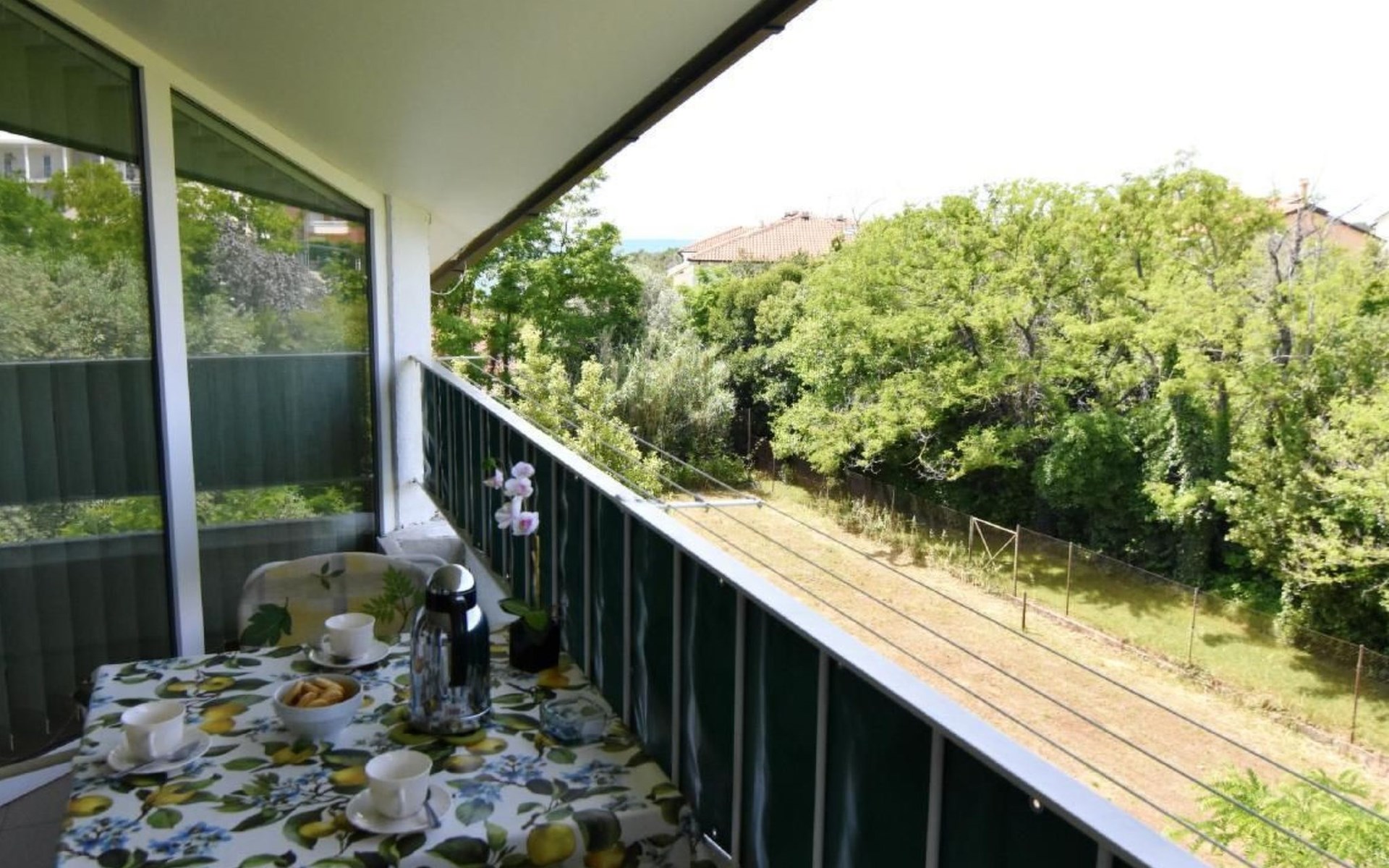 Der äußere Bereich des Apartments zeichnet sich durch einen überdachten Balkon mit einem bezaubernden Blick auf den Park und teilweise auf das Meer aus. Hier können Gäste den duftenden Morgenkaffee oder ein Glas Wein bei Sonnenuntergang genießen, während sie die ruhige Umgebung und die leichte Meeresbrise in sich aufnehmen.