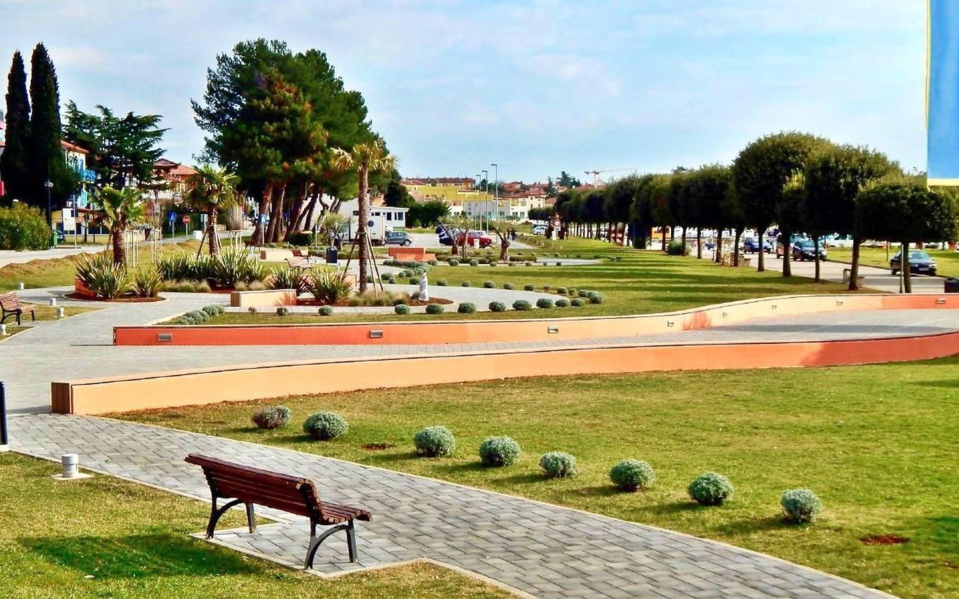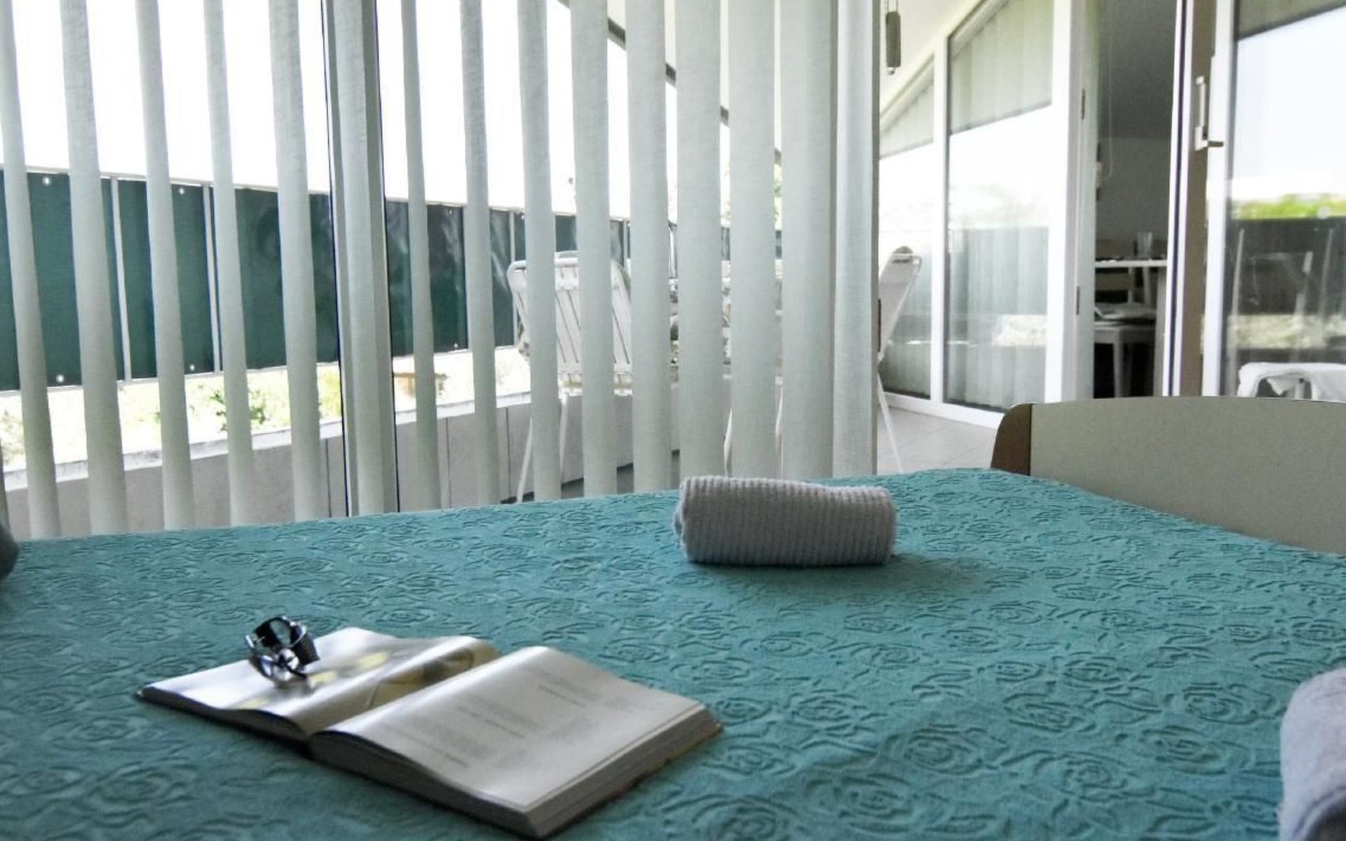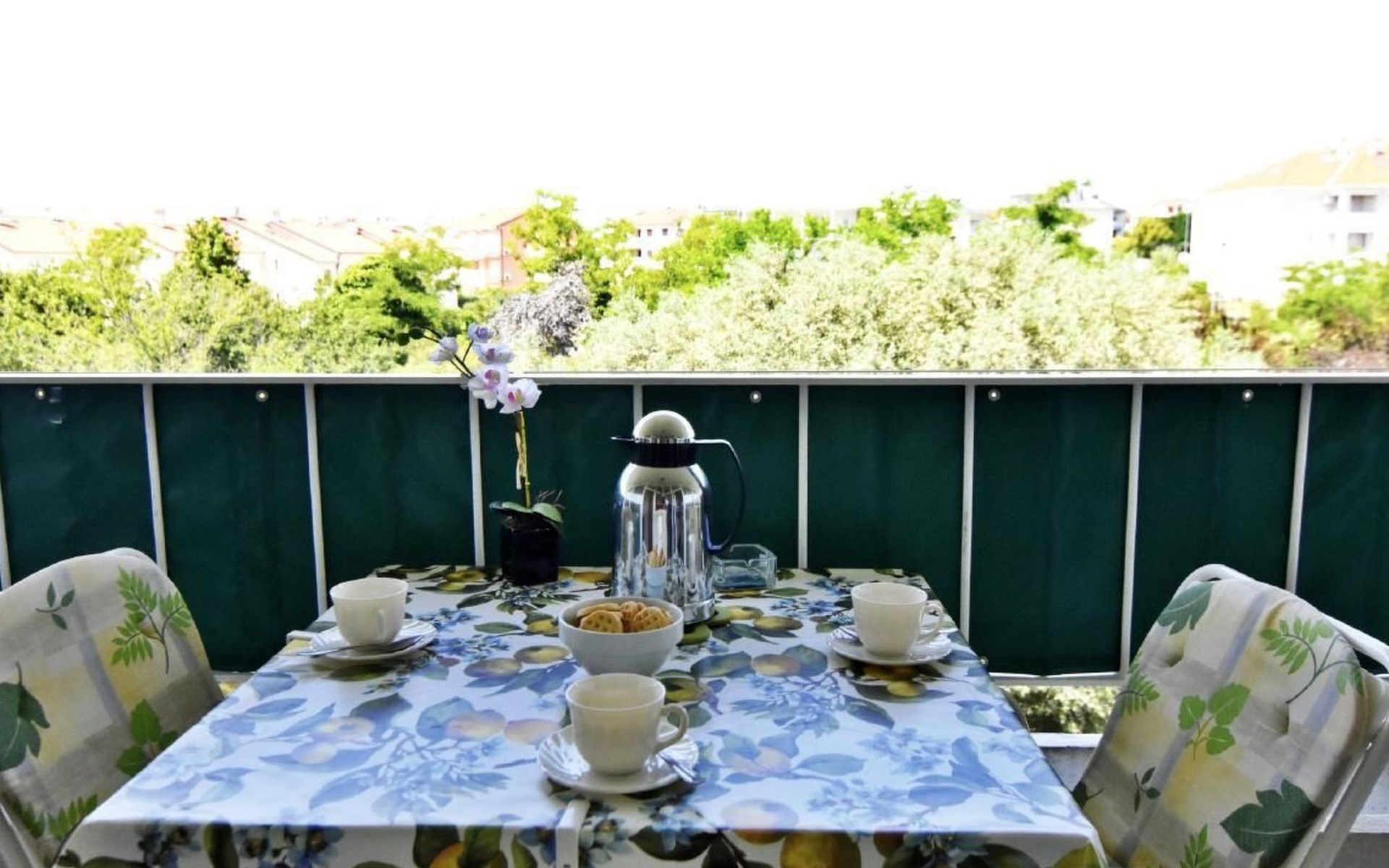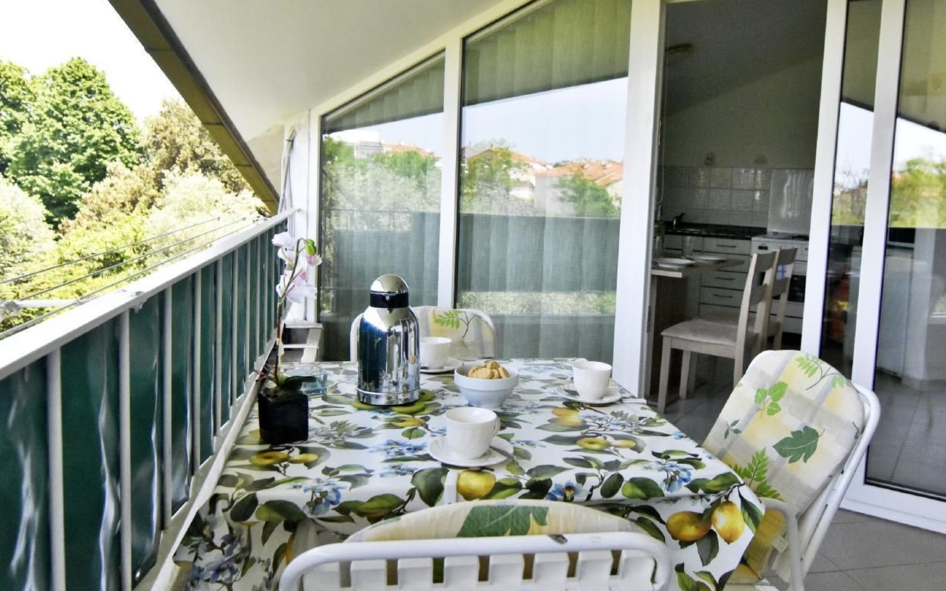 Der äußere Bereich des Apartments zeichnet sich durch einen überdachten Balkon mit einem bezaubernden Blick auf den Park und teilweise auf das Meer aus. Hier können Gäste den duftenden Morgenkaffee oder ein Glas Wein bei Sonnenuntergang genießen, während sie die ruhige Umgebung und die leichte Meeresbrise in sich aufnehmen.
