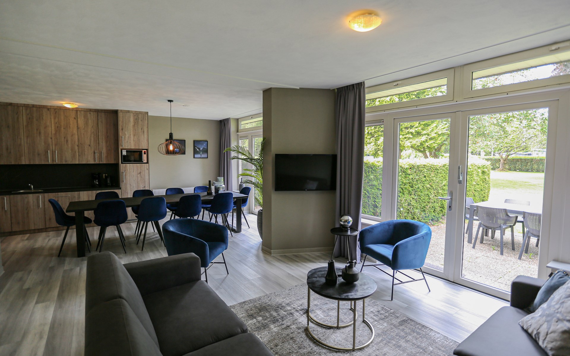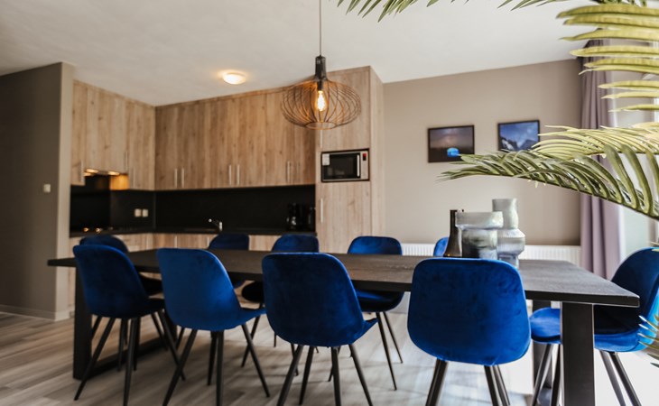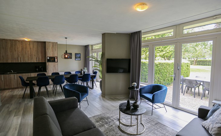 Dieser voll möblierte Bungalow ist für bis zu 10 Personen geeignet. Der Bungalow hat ein geräumiges Wohnzimmer mit offener Küche. Das Wohnzimmer verfügt über Standardgeräte wie einen Flachbildfernseher, einen DVD-Player und einen Radio-CD-Player. Die offene Küche enthält einen Herd mit vier Kochplatten, einen Kühlschrank mit Gefrierfach, eine Kaffeemaschine, eine Kombinationsmikrowelle, einen Geschirrspüler und einen Wasserkocher. Es gibt fünf Schlafzimmer, von denen drei ein Doppelbett und zwei Einzelbetten haben. 2 Schlafzimmer haben eine mechanische Lüftung. Der Bungalow verfügt über zwei Schlafzimmer mit einer Dusche und es gibt zwei separate Toiletten. Draußen auf der Terrasse haben Sie Gartenmöbel inklusive eines Sonnenschirms zu Ihrer Verfügung.