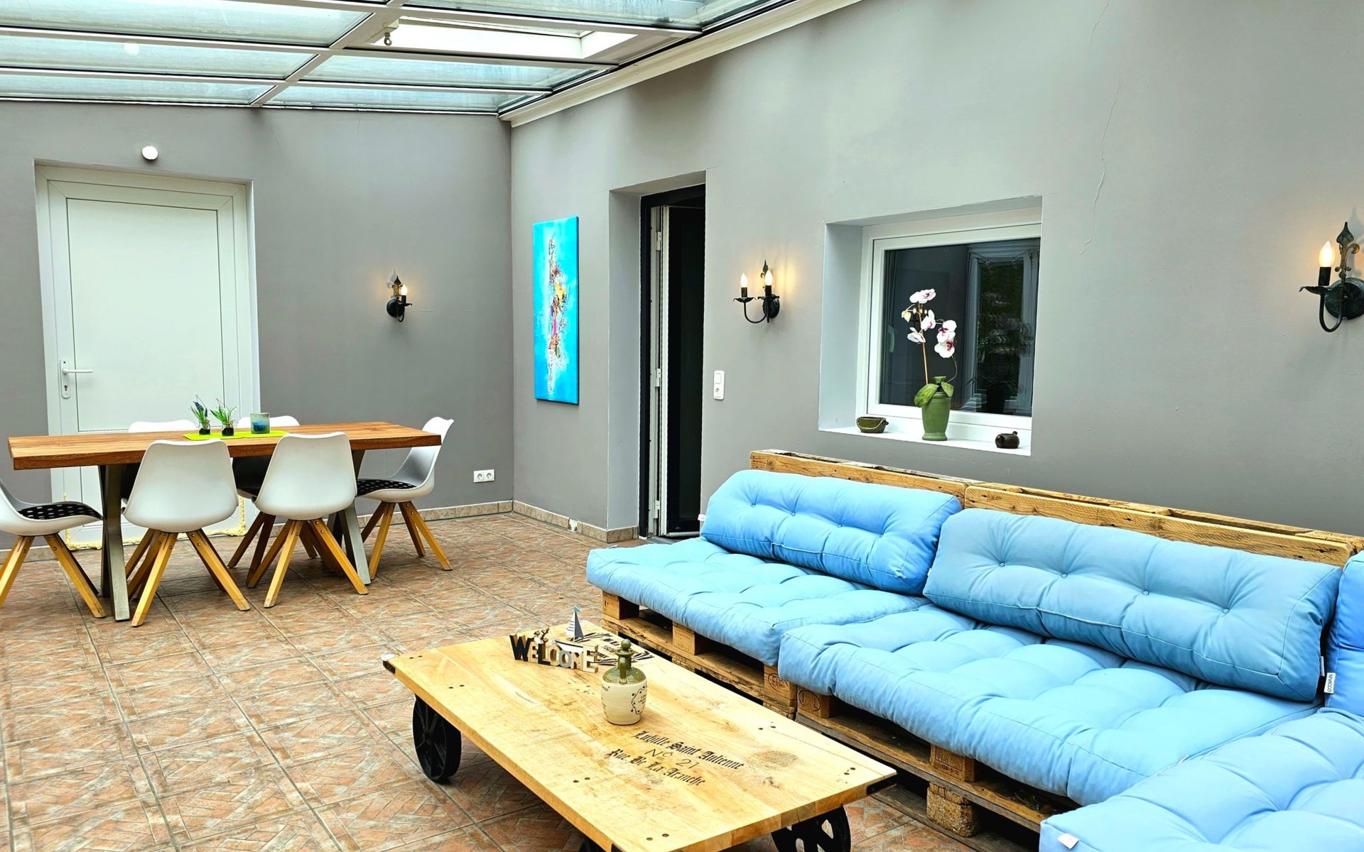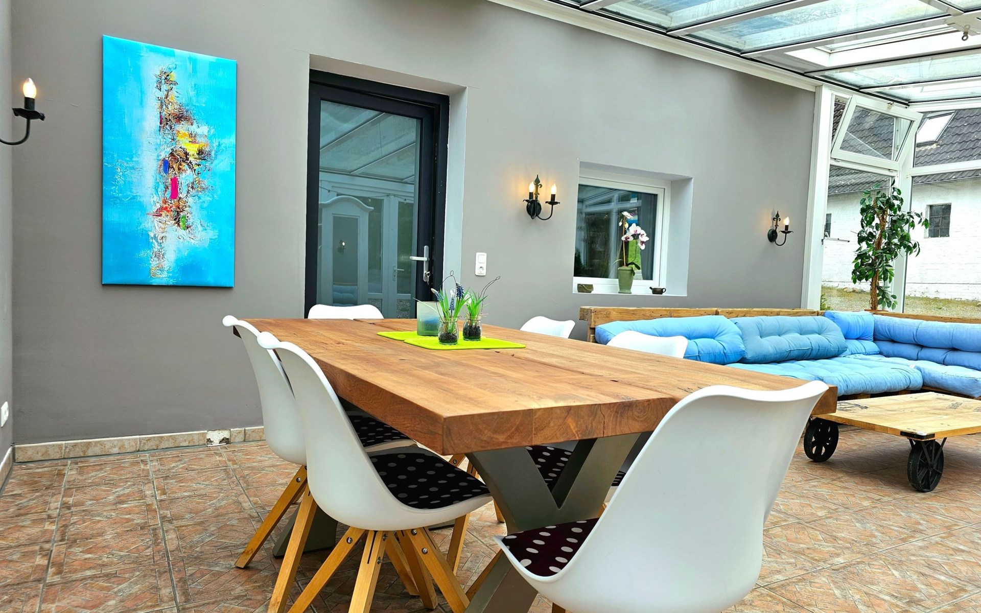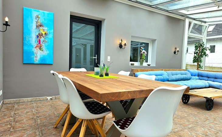 Ein weiteres Highlight: der helle, verglaste Wintergarten – ein Ort zum Lesen, Ausruhen oder einfach nur, um mit Blick in die Natur die Seele baumeln zu lassen. Ob sonnig oder regnerisch – dieser Raum schenkt Ihnen das Gefühl, mitten in der Natur zu sein, bei jedem Wetter.