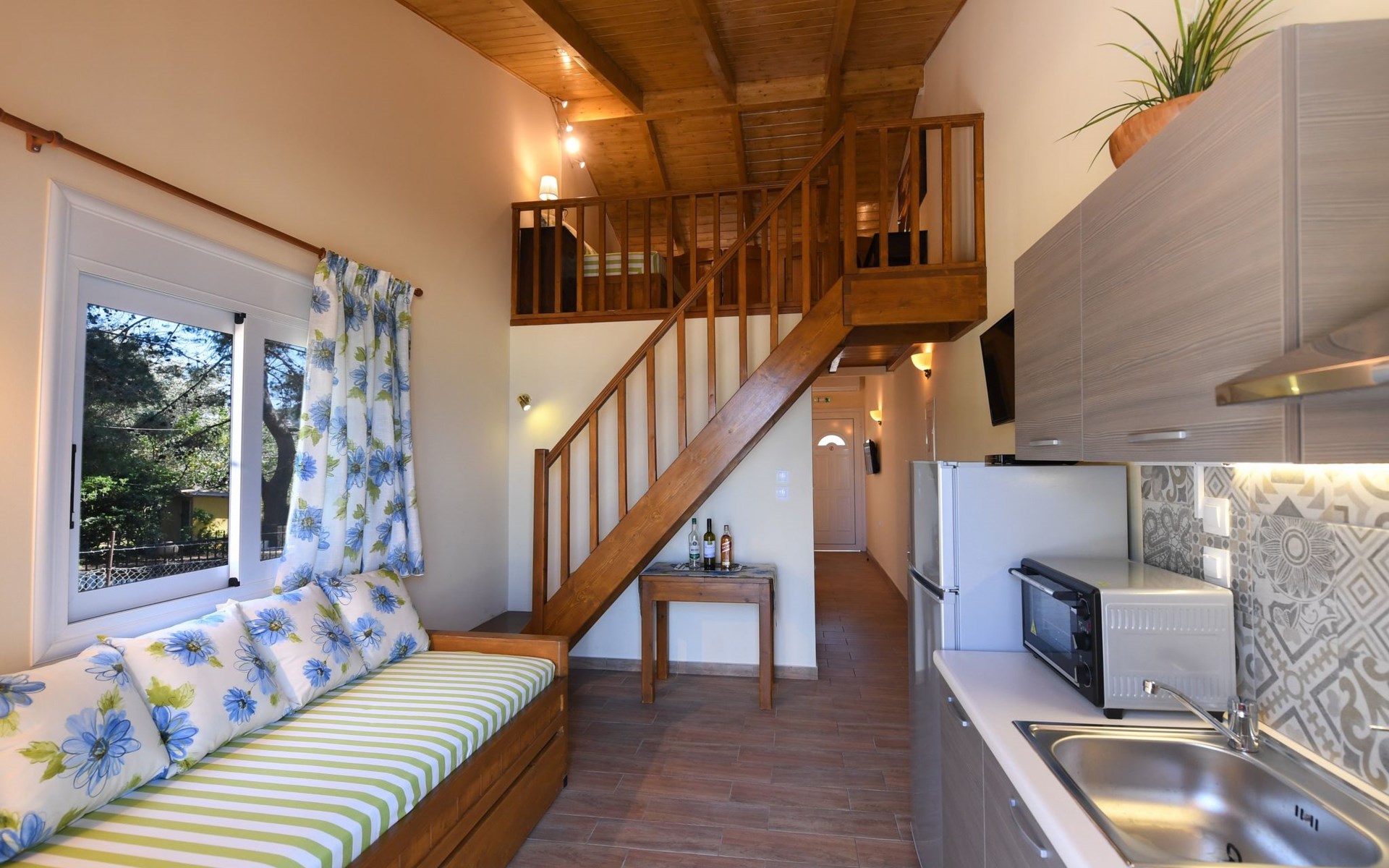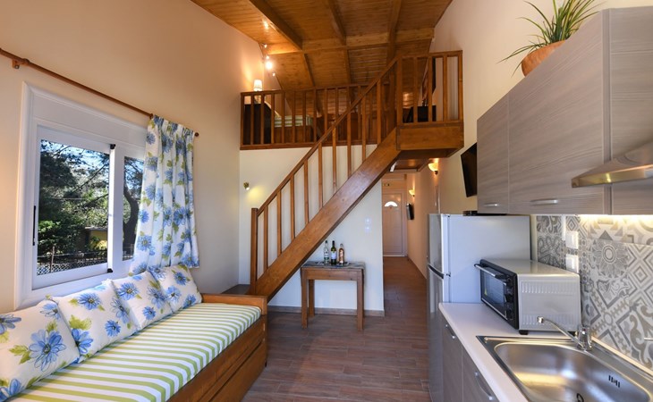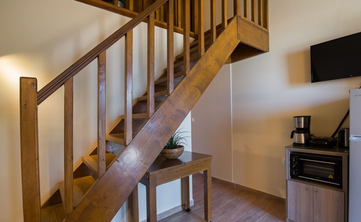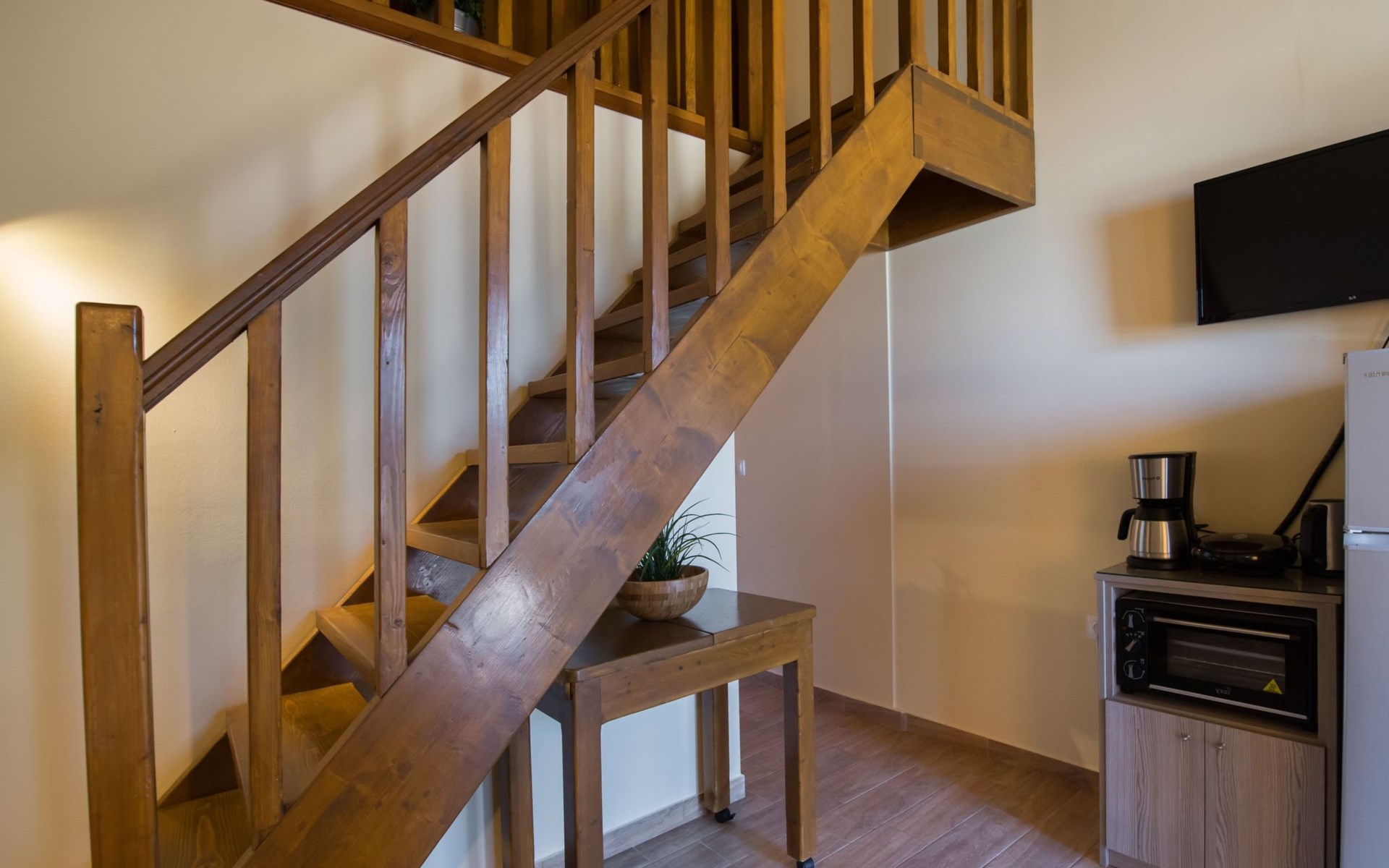 In diesem exquisiten Apartment sind die Gäste eingeladen, eine Mischung aus Komfort und Stil in den sorgfältig eingerichteten Räumen zu genießen. Die Innenfläche beträgt ca. 32 m² mit einer zusätzlichen gemütlichen Maisonette-Ebene von 8 m². Es verfügt über einen einladenden Wohnbereich mit einem ausziehbaren Einzelbettsofa und einem Flachbildfernseher, der nahtlos in eine voll ausgestattete Küchenzeile übergeht, die mit modernen Geräten wie einer doppelten Induktionskochplatte, einem Minibackofen und einer Nespresso-Kaffeemaschine ausgestattet ist. Die offene Gestaltung geht in einen Essbereich über, der durch einen Balkon mit Meerblick hervorgehoben wird, der einen ruhigen Morgen und ruhige Abende verspricht. Die Unterkunft verfügt außerdem über ein Hauptschlafzimmer mit einem Kingsize-Bett und ein zusätzliches Zwischengeschoss, das über eine Holztreppe erreichbar ist und als zweites Schlafzimmer mit einem Schlafsofa dient, so dass jeder Gast ausreichend Platz hat.