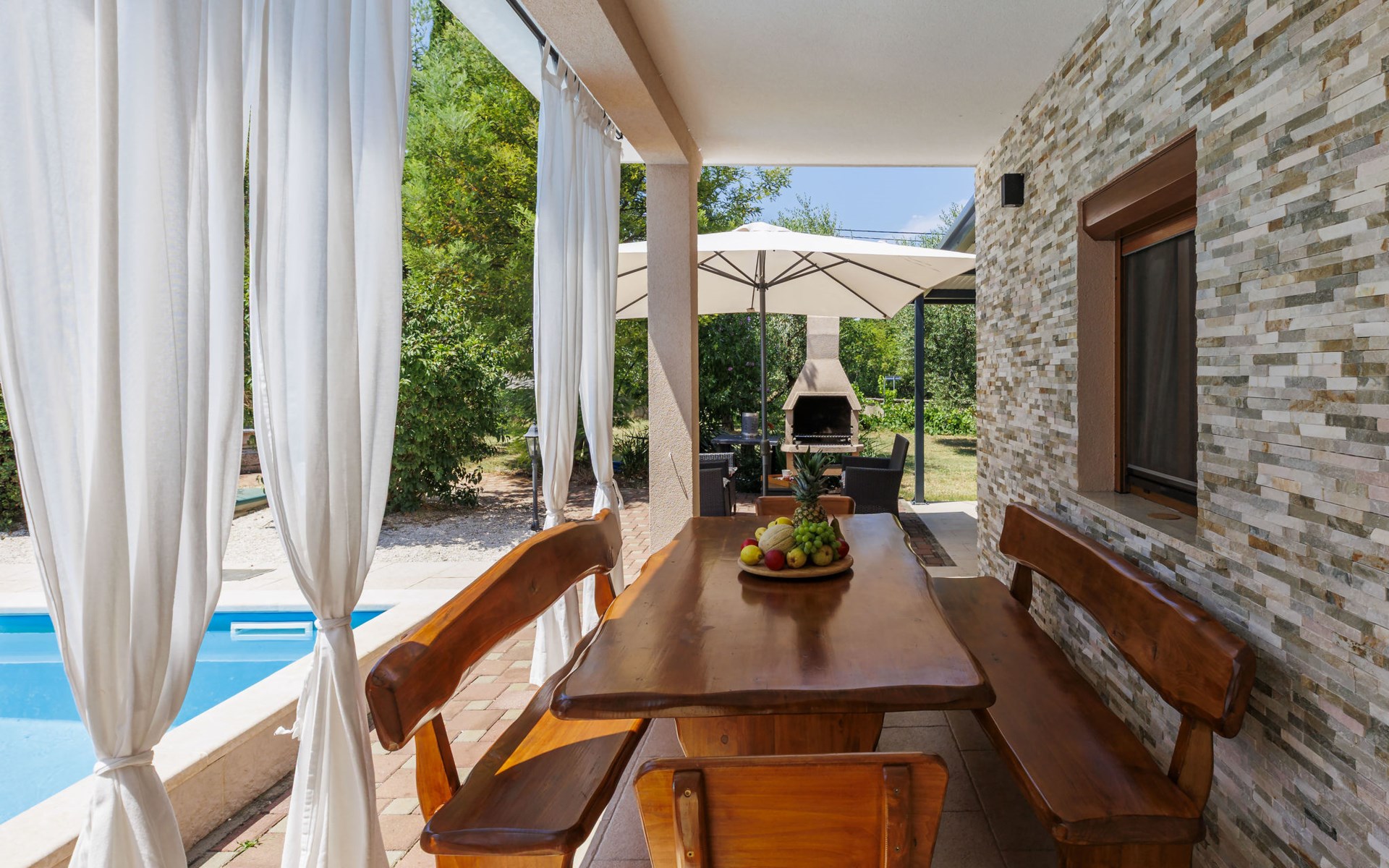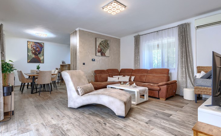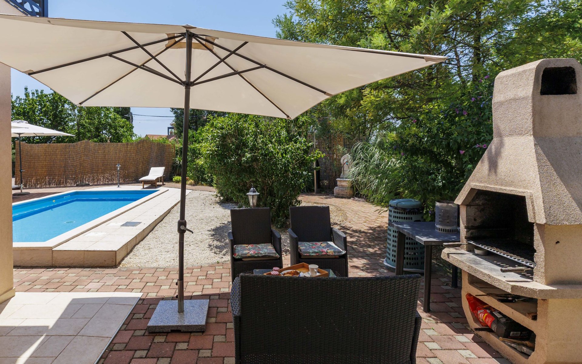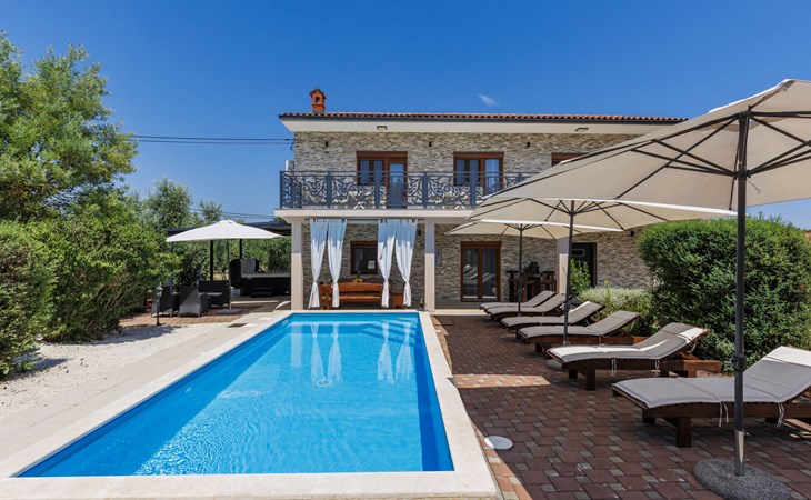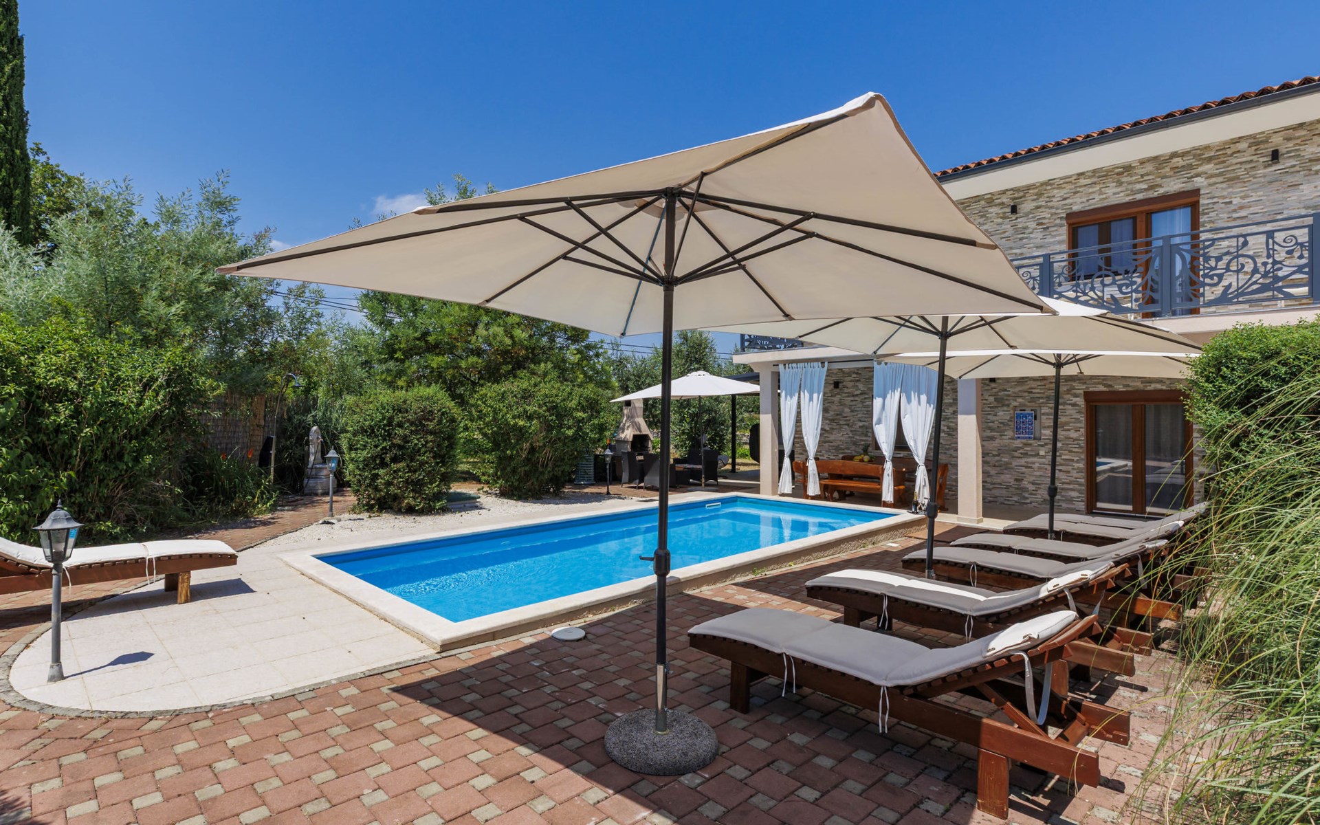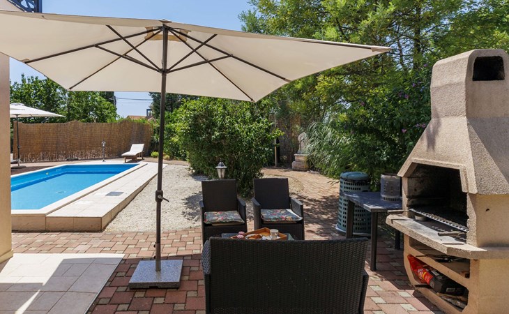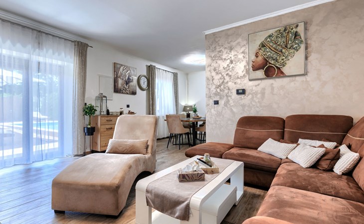 Marčana 11 km von Pula: Gemütliches Einfamilienhaus "Deno&Melly", auf 2 Stockwerken. Im Weiler Krvavići, 3 km vom Zentrum von Marčana, sonnige Lage, 10 km vom Meer. Zur Alleinbenutzung: Grundstück 2'000 m2 (eingezäunt), Garten mit Rasen und Pflanzen, Schwimmbad eckig (7 x 4 m, 140 cm tief, saisonale Verfügbarkeit: 01.Mar. - 01.Dez.) mit Innentreppe. Aussendusche, Sprudelbad, Terrasse (25 m2), Gartenmöbel, Grill, Poolpflege durch den Besitzer/Gärtner. Im Hause: Internetzugang, Sauna, Waschmaschine, Wäschetrockner. Parkplatz (für 3 Autos) beim Haus auf dem Grundstück. Einkaufsgeschäft 3 km, Restaurant 3 km, Bushaltestelle 3 km, Kieselstrand 10 km, Felsstrand 10 km. Der Besitzer akzeptiert keine Jugendgruppen.