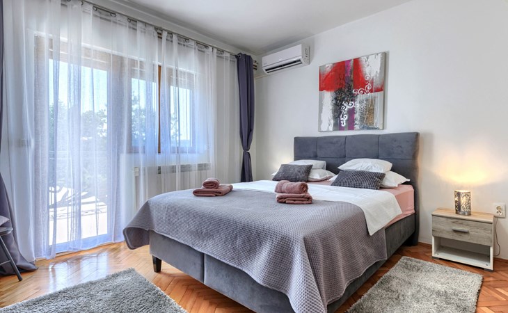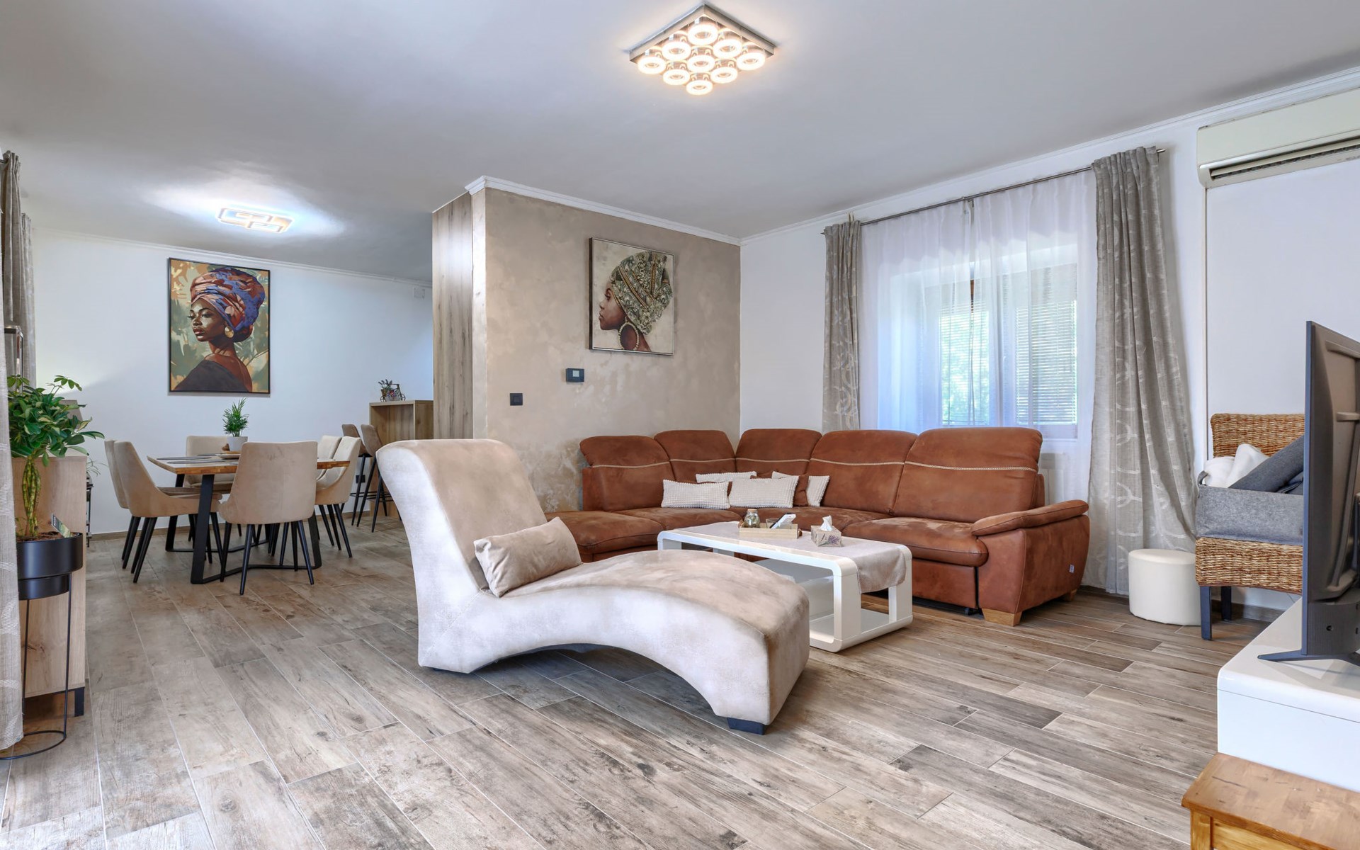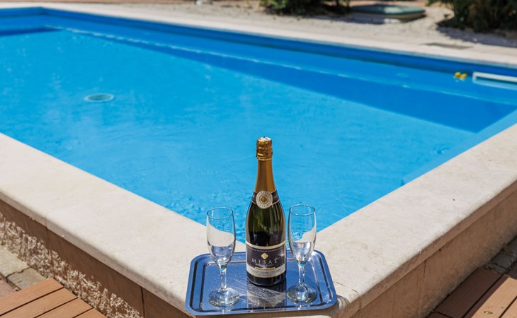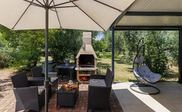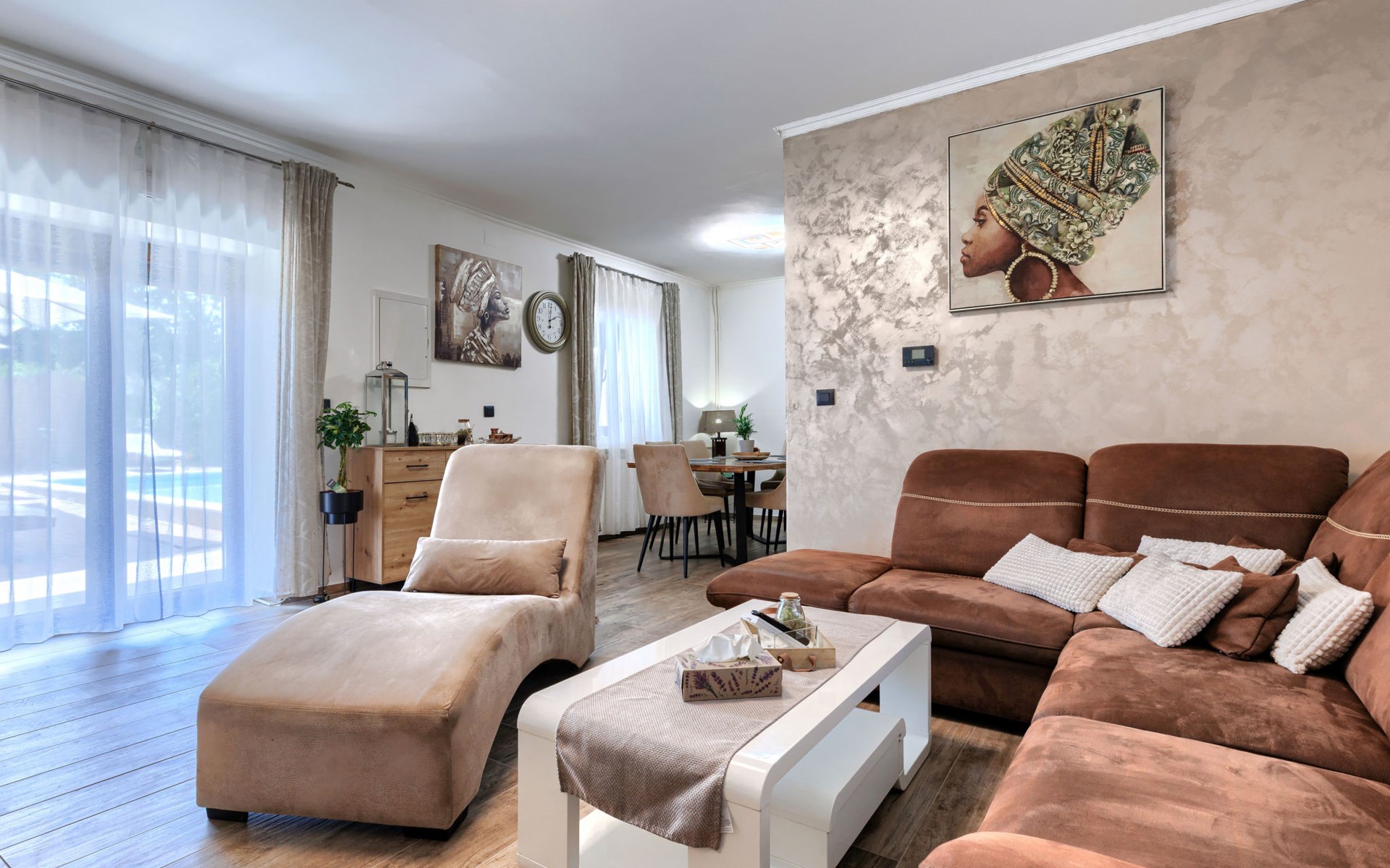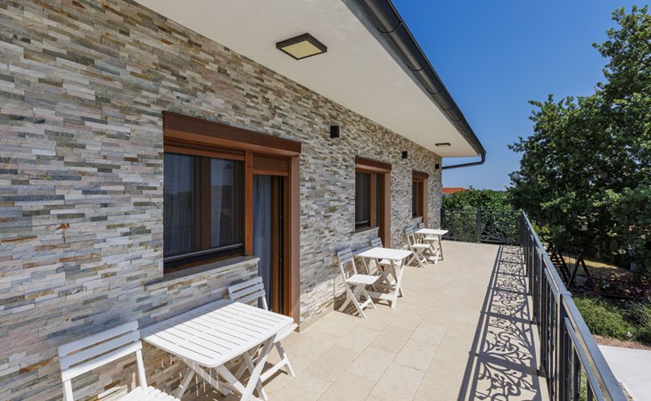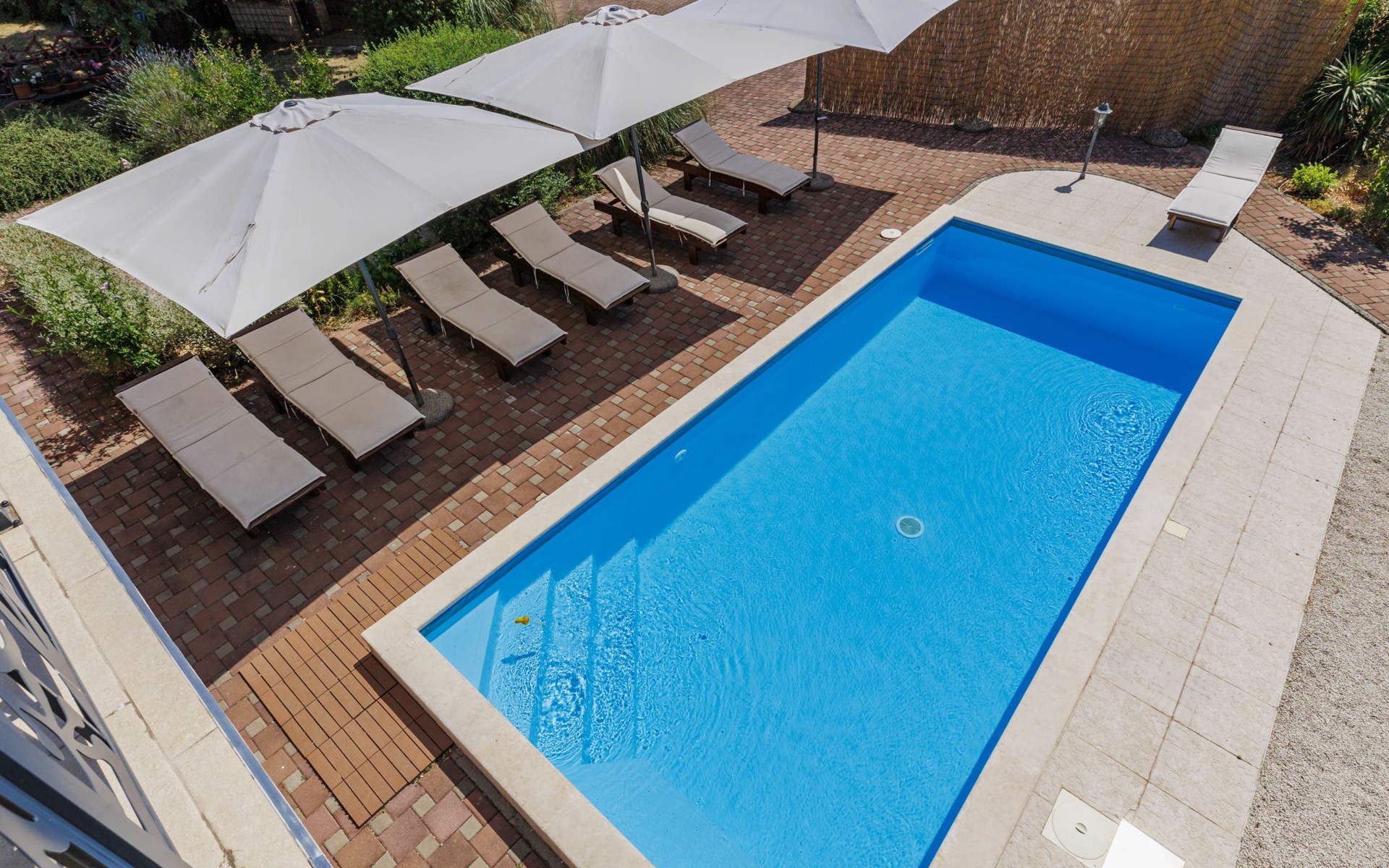 Marčana 11 km von Pula: Gemütliches Einfamilienhaus "Deno&Melly", auf 2 Stockwerken. Im Weiler Krvavići, 3 km vom Zentrum von Marčana, sonnige Lage, 10 km vom Meer. Zur Alleinbenutzung: Grundstück 2'000 m2 (eingezäunt), Garten mit Rasen und Pflanzen, Schwimmbad eckig (7 x 4 m, 140 cm tief, saisonale Verfügbarkeit: 01.Mar. - 01.Dez.) mit Innentreppe. Aussendusche, Sprudelbad, Terrasse (25 m2), Gartenmöbel, Grill, Poolpflege durch den Besitzer/Gärtner. Im Hause: Internetzugang, Sauna, Waschmaschine, Wäschetrockner. Parkplatz (für 3 Autos) beim Haus auf dem Grundstück. Einkaufsgeschäft 3 km, Restaurant 3 km, Bushaltestelle 3 km, Kieselstrand 10 km, Felsstrand 10 km. Der Besitzer akzeptiert keine Jugendgruppen.