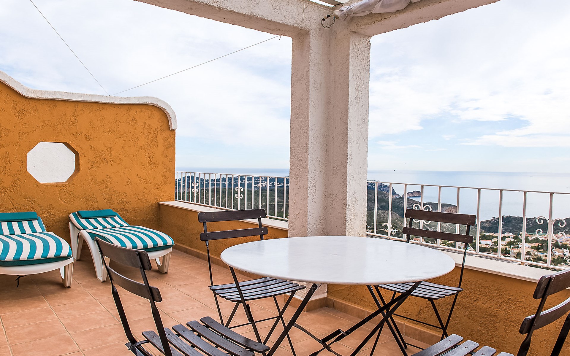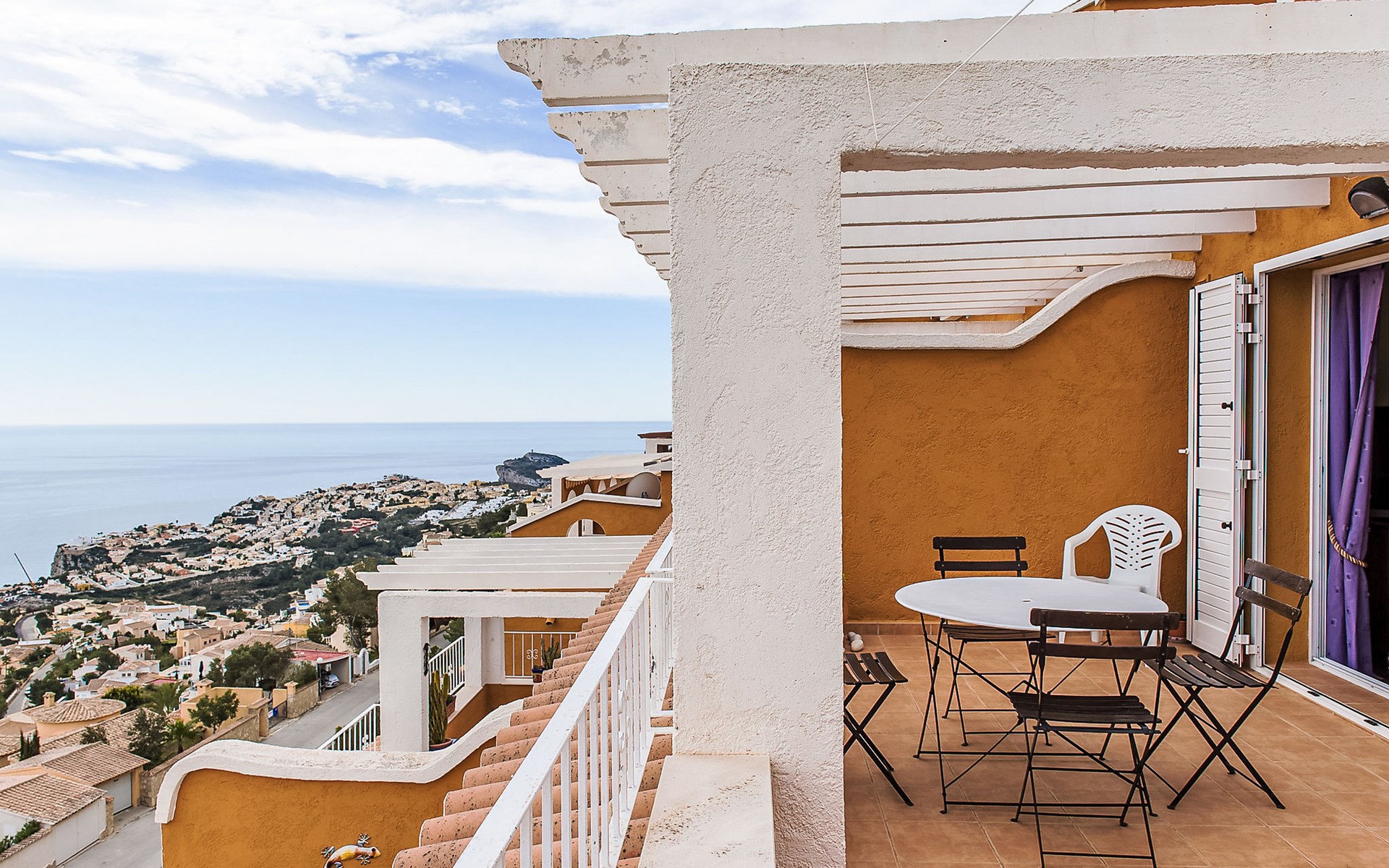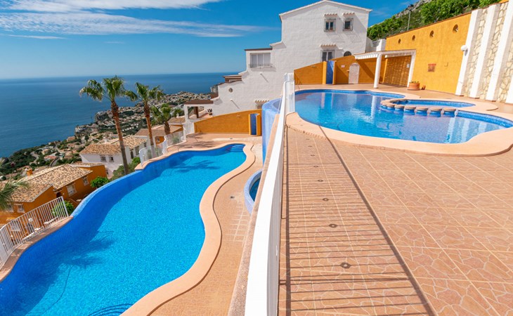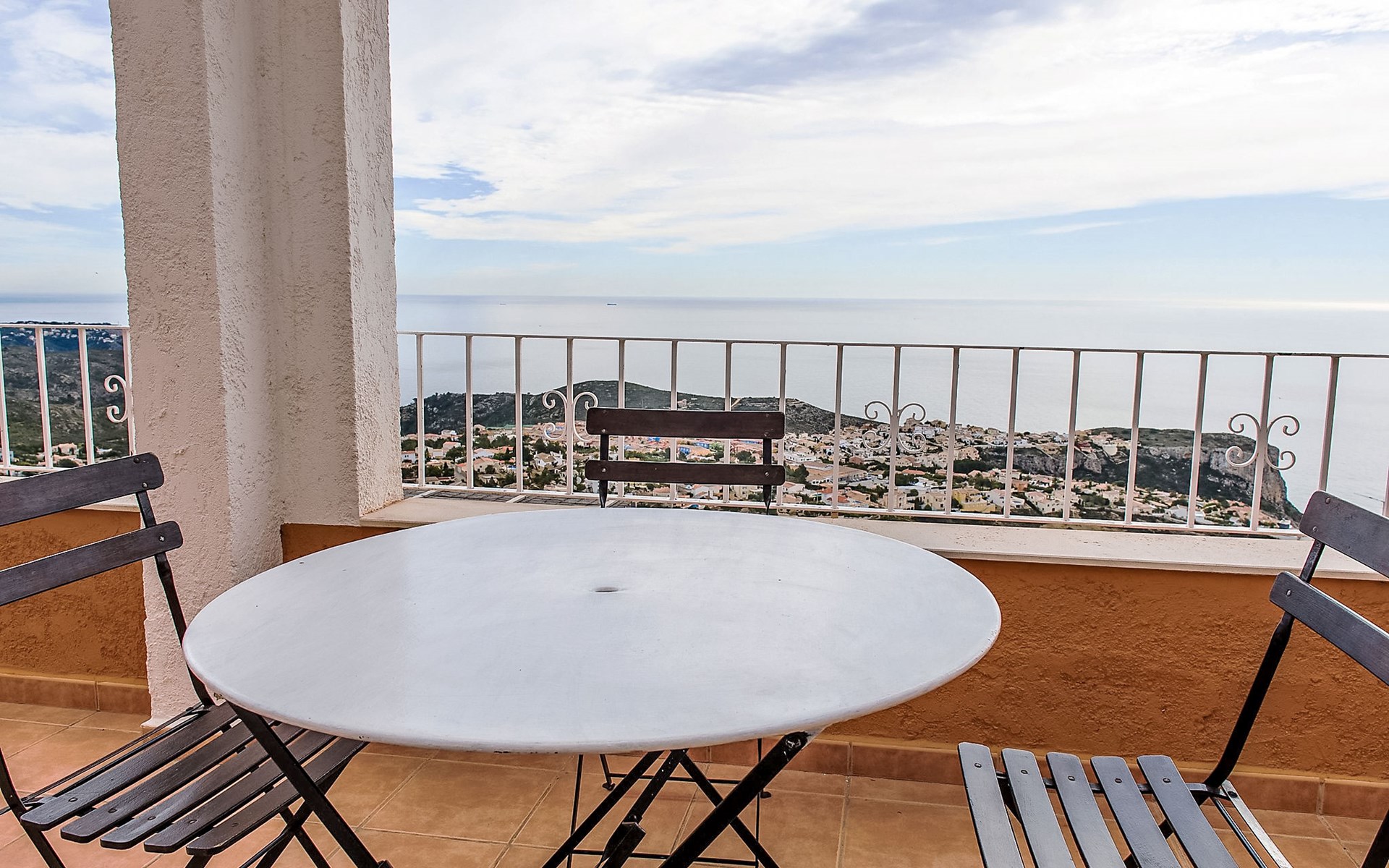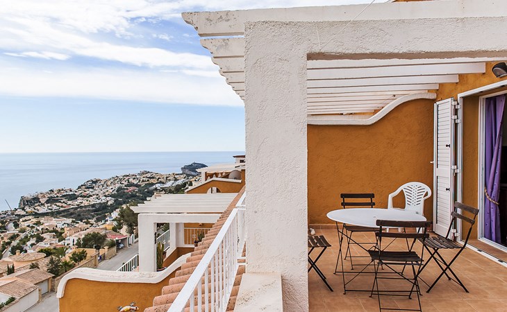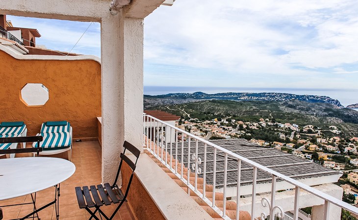 Benitachell: Feriensiedlung "Vista Mar", Baujahr 2008. Im Ortsteil Cumbre del Sol, ruhige, sonnige, erhöhte Lage, 3 km vom Meer. Zur Mitbenutzung: 2 Schwimmbäder (saisonale Verfügbarkeit: 01.Mar. - 30.Nov.) mit Innentreppe. Kinderbecken, Aussendusche, öffentliche Parkplätze auf der Strasse. Supermarkt 1 km, Einkaufszentrum 2 km, Restaurant 2 km, Bushaltestelle 6 km, Sandstrand "Arenal" 7 km, Badebucht 3 km. Bitte beachten: Fahrzeug empfohlen, kein Fahrstuhl vorhanden. Der Besitzer akzeptiert keine Jugendgruppen.