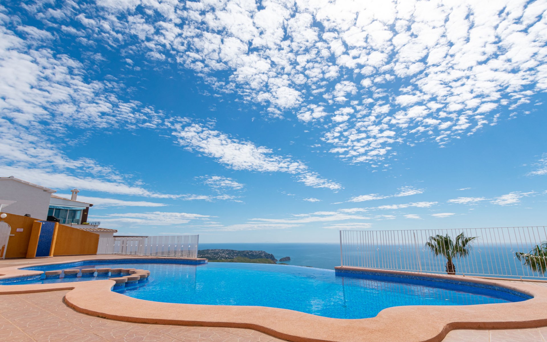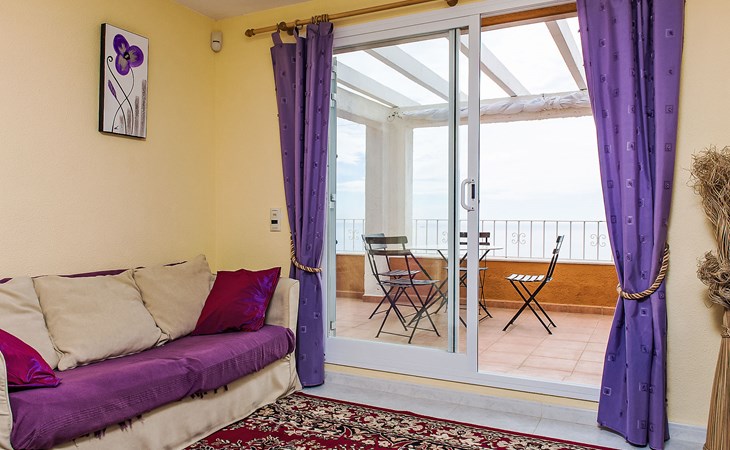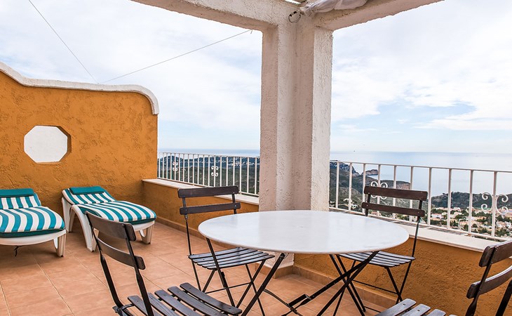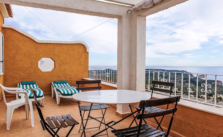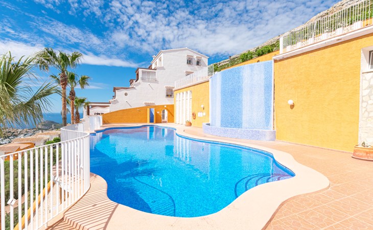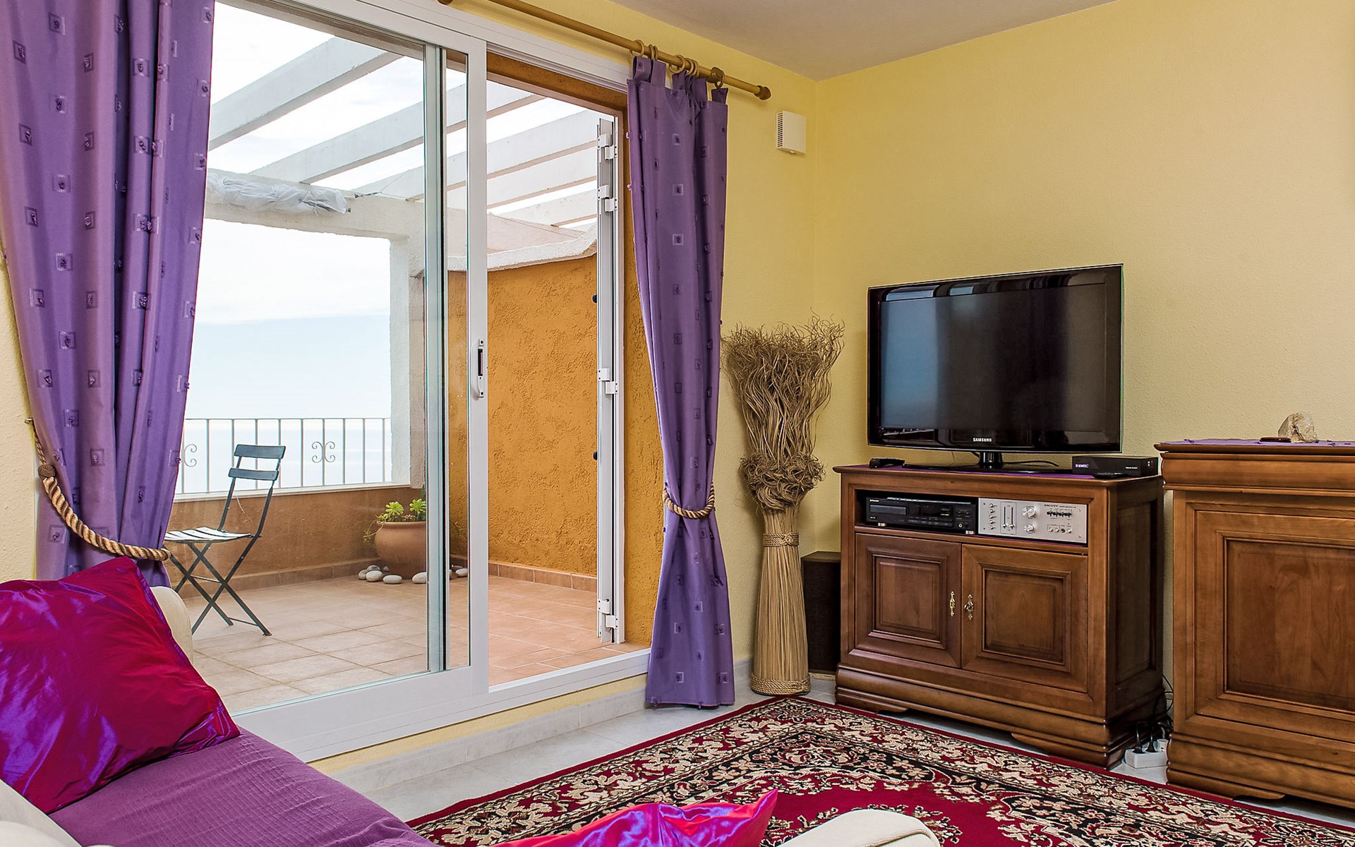 Benitachell: Feriensiedlung "Vista Mar", Baujahr 2008. Im Ortsteil Cumbre del Sol, ruhige, sonnige, erhöhte Lage, 3 km vom Meer. Zur Mitbenutzung: 2 Schwimmbäder (saisonale Verfügbarkeit: 01.Mar. - 30.Nov.) mit Innentreppe. Kinderbecken, Aussendusche, öffentliche Parkplätze auf der Strasse. Supermarkt 1 km, Einkaufszentrum 2 km, Restaurant 2 km, Bushaltestelle 6 km, Sandstrand "Arenal" 7 km, Badebucht 3 km. Bitte beachten: Fahrzeug empfohlen, kein Fahrstuhl vorhanden. Der Besitzer akzeptiert keine Jugendgruppen.