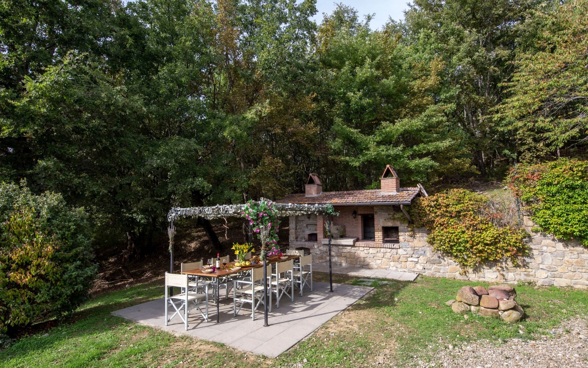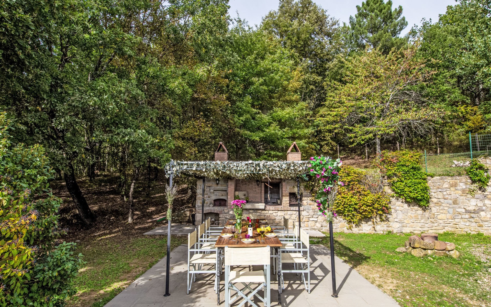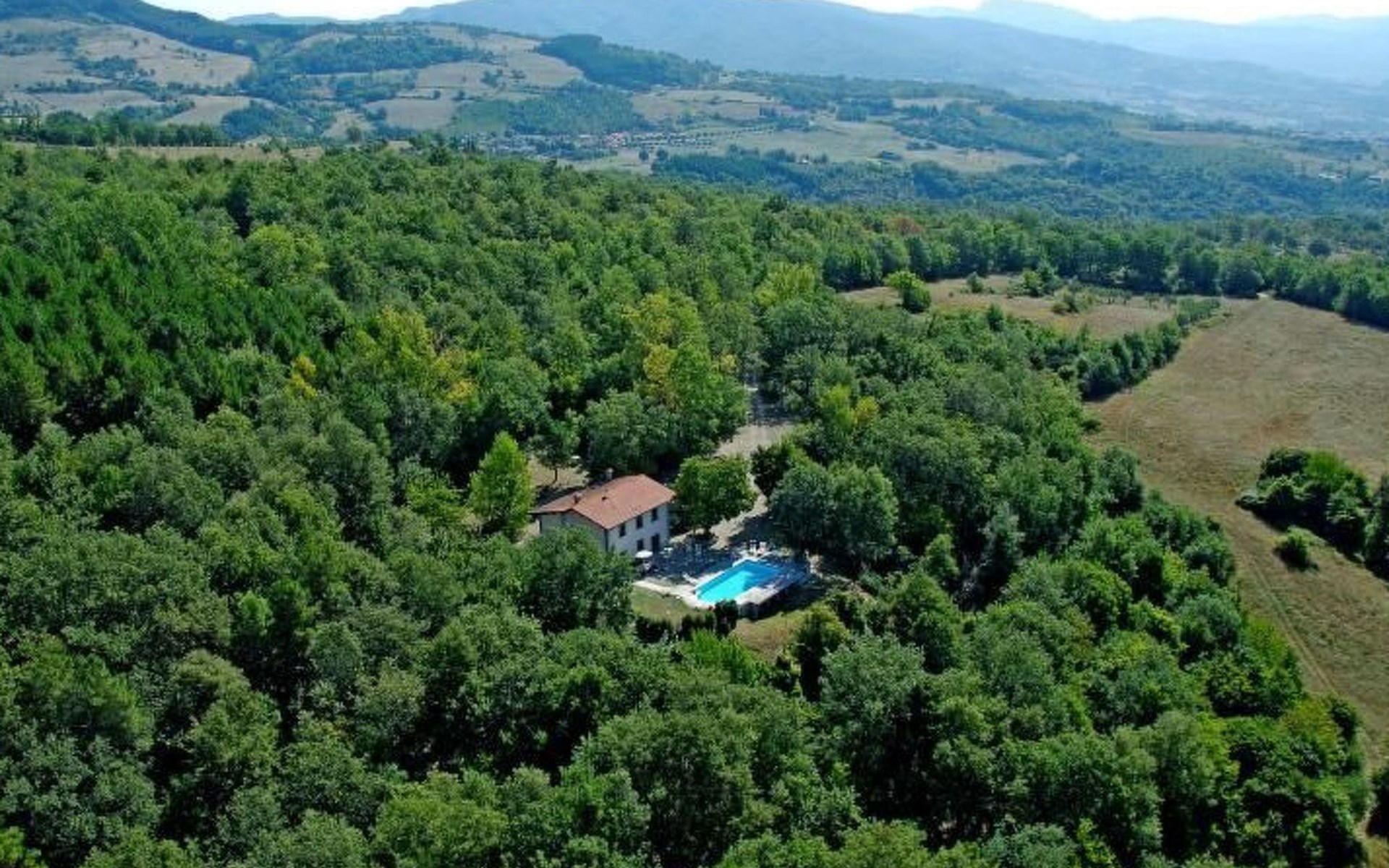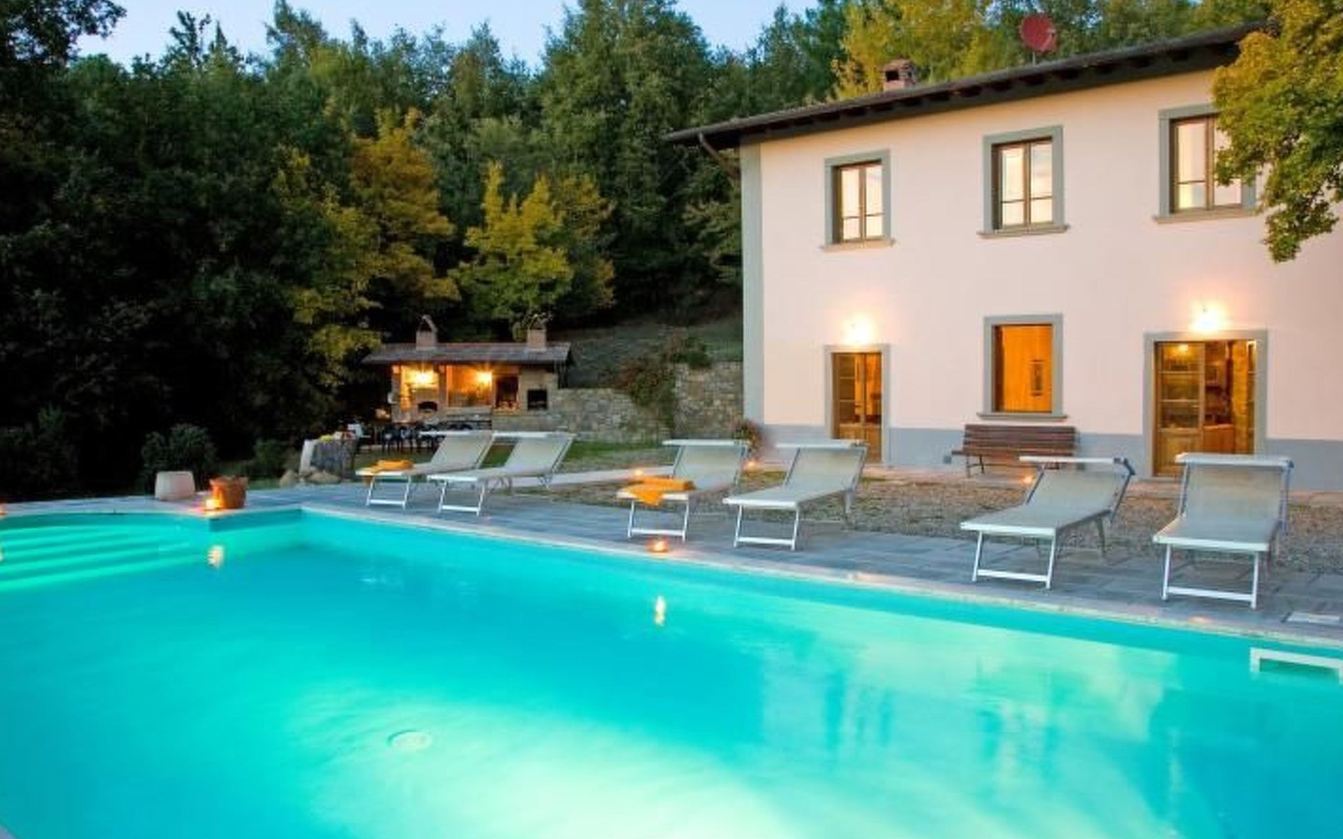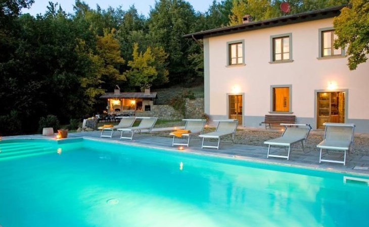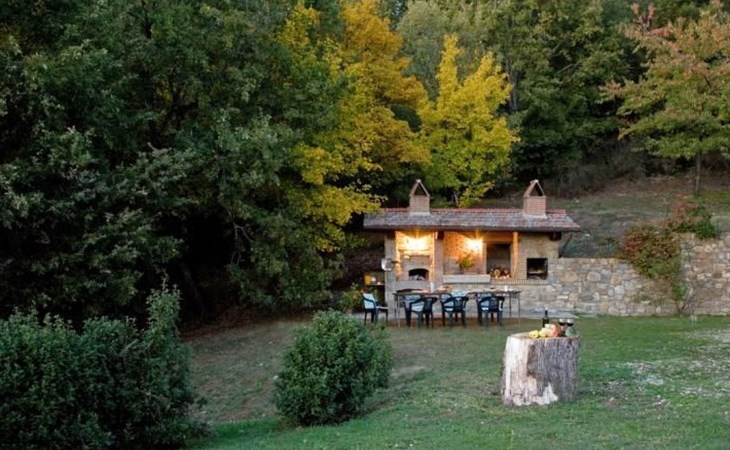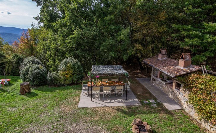 Im Außenbereich befindet sich der private Pool (5x11m) mit Innen- und Außenbeleuchtung, Dusche und Sonnenliegen (während der Zwischen- und Hochsaison geöffnet). Die Villa ist sehr hell und liegt sehr ruhig, umgeben von einem jahrhundertealten Eichenwald, in dem man Hirsche, Damhirsche und Rehe antreffen kann oder, je nach Jahreszeit, Pilze, Brombeeren oder Oliven sammeln kann. Deshalb ist die Villa der ideale Urlaubsort, an dem man umgeben von der Natur den Frieden genießen kann. Es gibt einen fantastischen gemauerten und überdachten Barbecue mit Beleuchtung, Grill, Holzofen zum Pizzabacken, Spüle mit Trinkwasser, Abstellflächen, Tisch und Stühlen, sodass man die Gerichte im Freien einnehmen und den herrlichen Ausblick auf das zauberhafte Tal Valle del Casentino genießen kann.