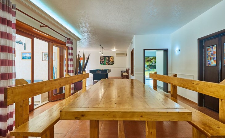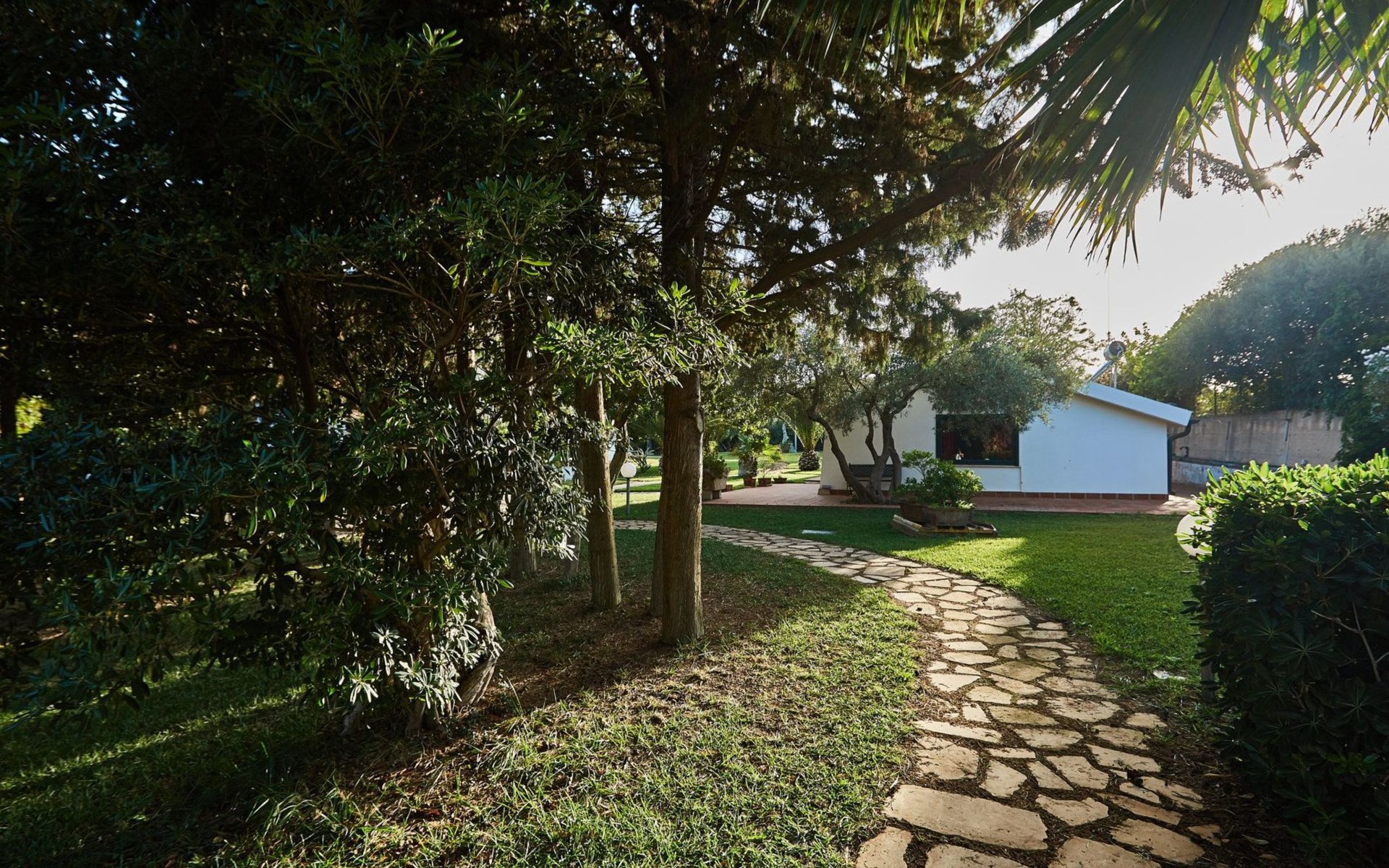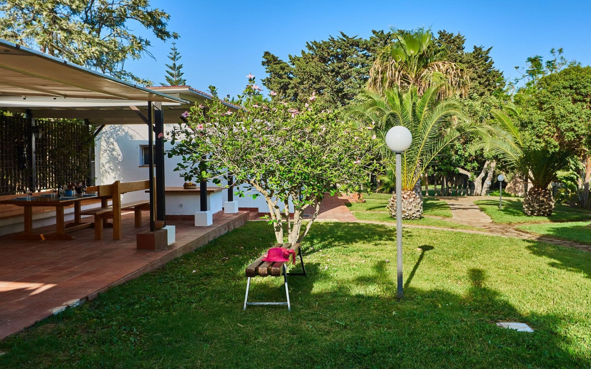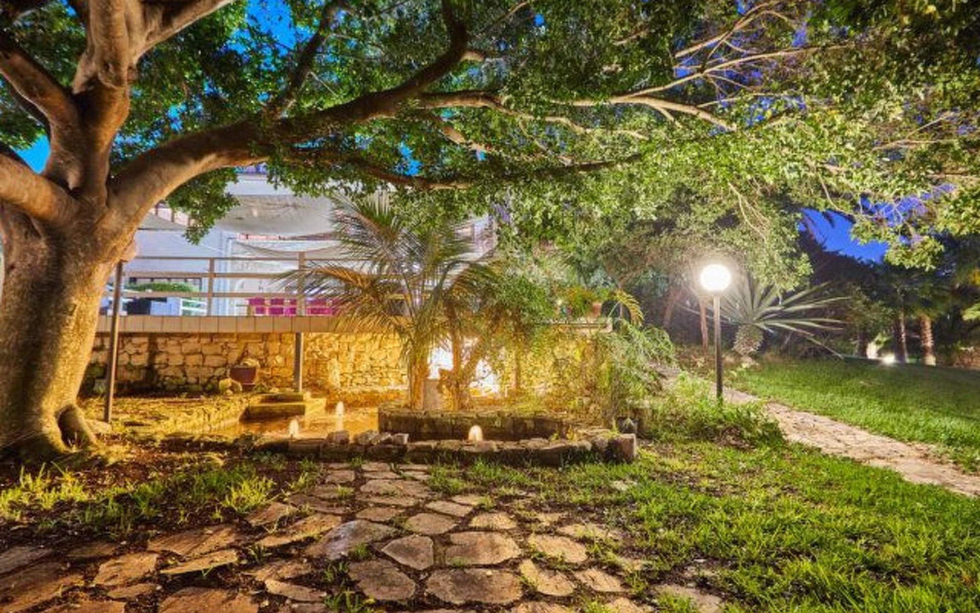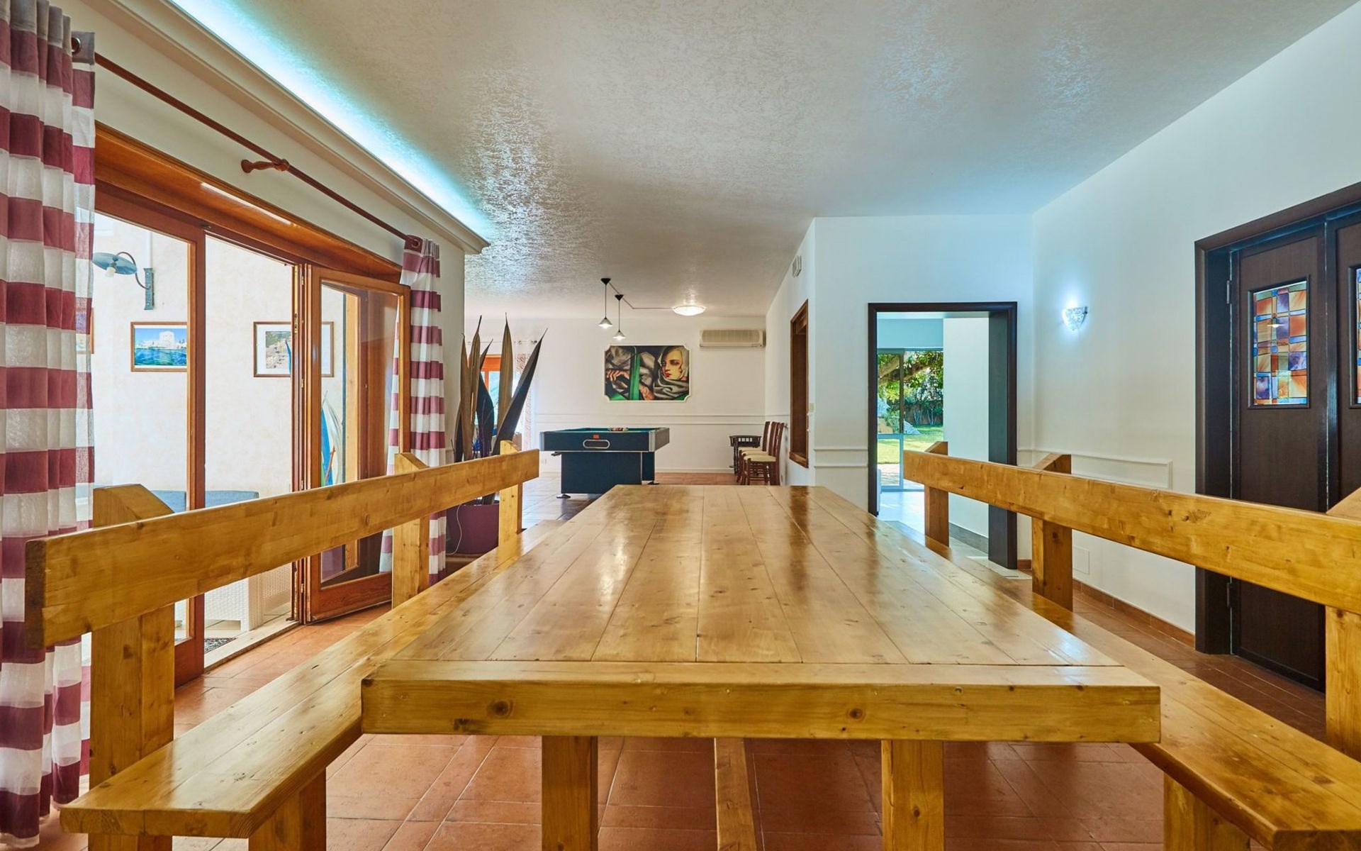 Von dem Raum, in dem sich der große Tisch befindet, gelangt man in einen etwa 50 Quadratmeter großen Innenhof mit Polirattan-Sesseln und einem Tisch für 20 Personen, wo man abends in der Kühle des Parks speisen kann. Sobald man das Eingangstor durchschreitet, hat man das Gefühl, an einem wunderschönen Ort angekommen zu sein, denn den Gästen steht eine 10.000 Quadratmeter große Rasenfläche zur Verfügung, die mit Palmen und jahrhundertealten Johannisbrotbäumen sowie vielen anderen mediterranen Pflanzenarten geschmückt und verziert ist. Der Park ist von Wegen aus einheimischen weißen Steinen durchzogen, so dass er bereits wie ein Gemälde wirkt. Dann finden wir einen Pavillon mit einem sehr großen Holztisch zum Grillen und in unmittelbarer Nähe grenzt ein weiterer Bereich an, in dem sich eine schöne Tischtennisplatte befindet, und weiter hinten gibt es zur Freude der Kleinen einen kleinen Spielplatz. Wenn man den Spaziergang fortsetzt, kommt man zum Herzstück des Parks, einem großen, unregelmäßigen Schwimmbad mit Liegestühlen und Sonnenschirmen rundherum und 2 runden, schmiedeeisernen Tischen mit Stühlen, so dass man Tage in absoluter Entspannung verbringen kann. Etwa 15 Meter entfernt befindet sich eine halb überdachte Terrasse mit Segeln und Polirattan-Liegen, die an die Küche angrenzt.