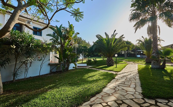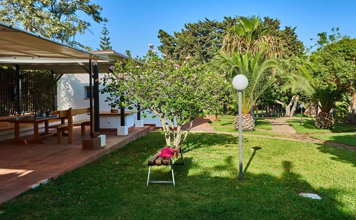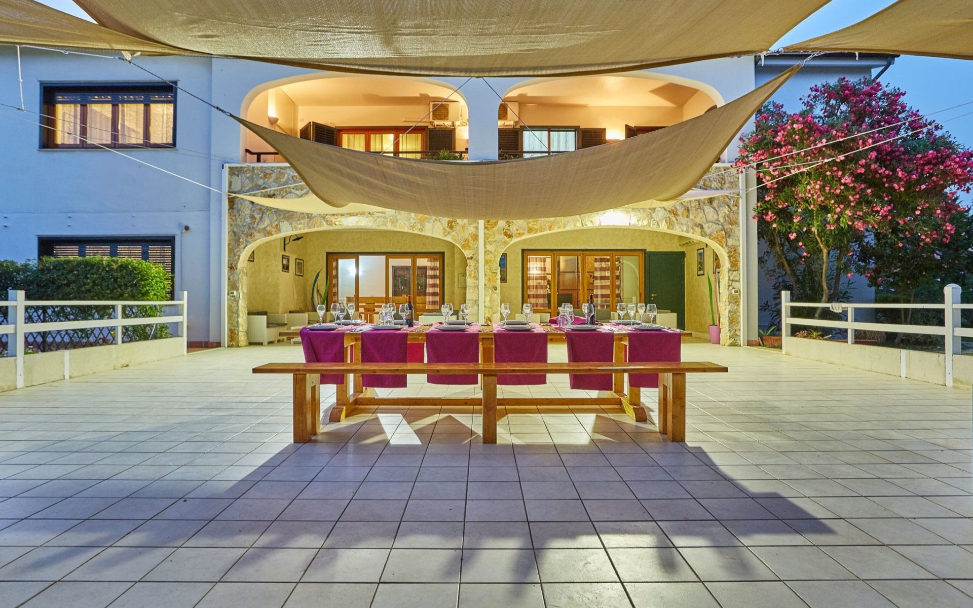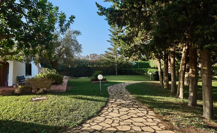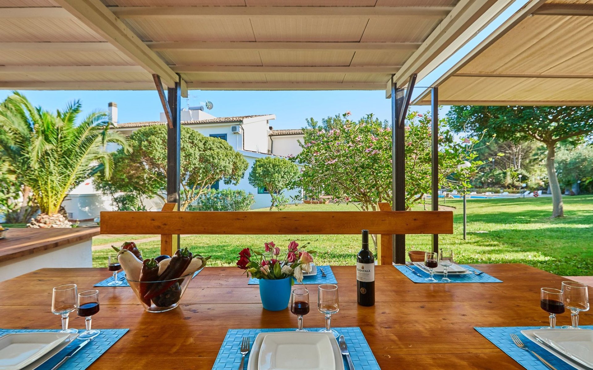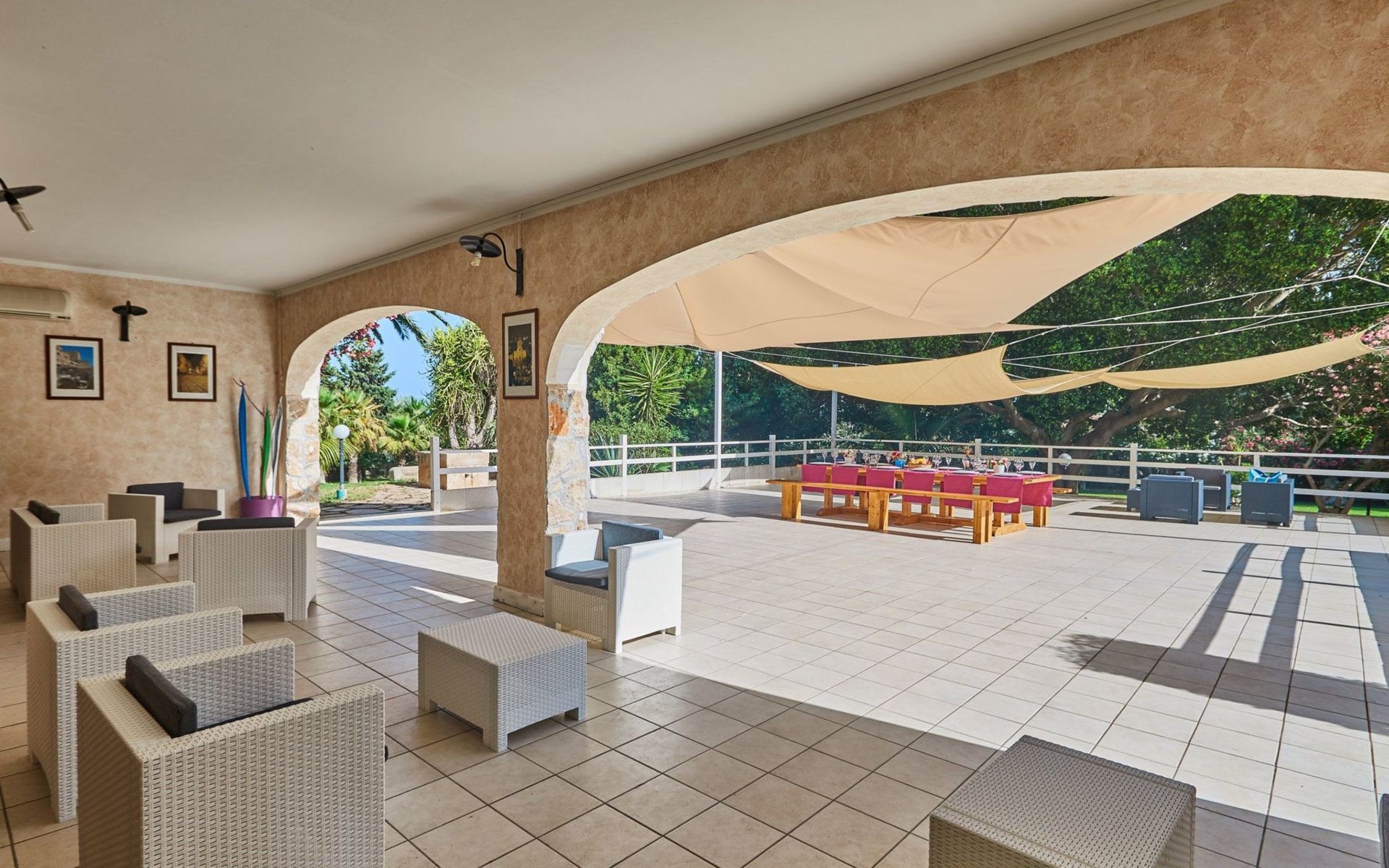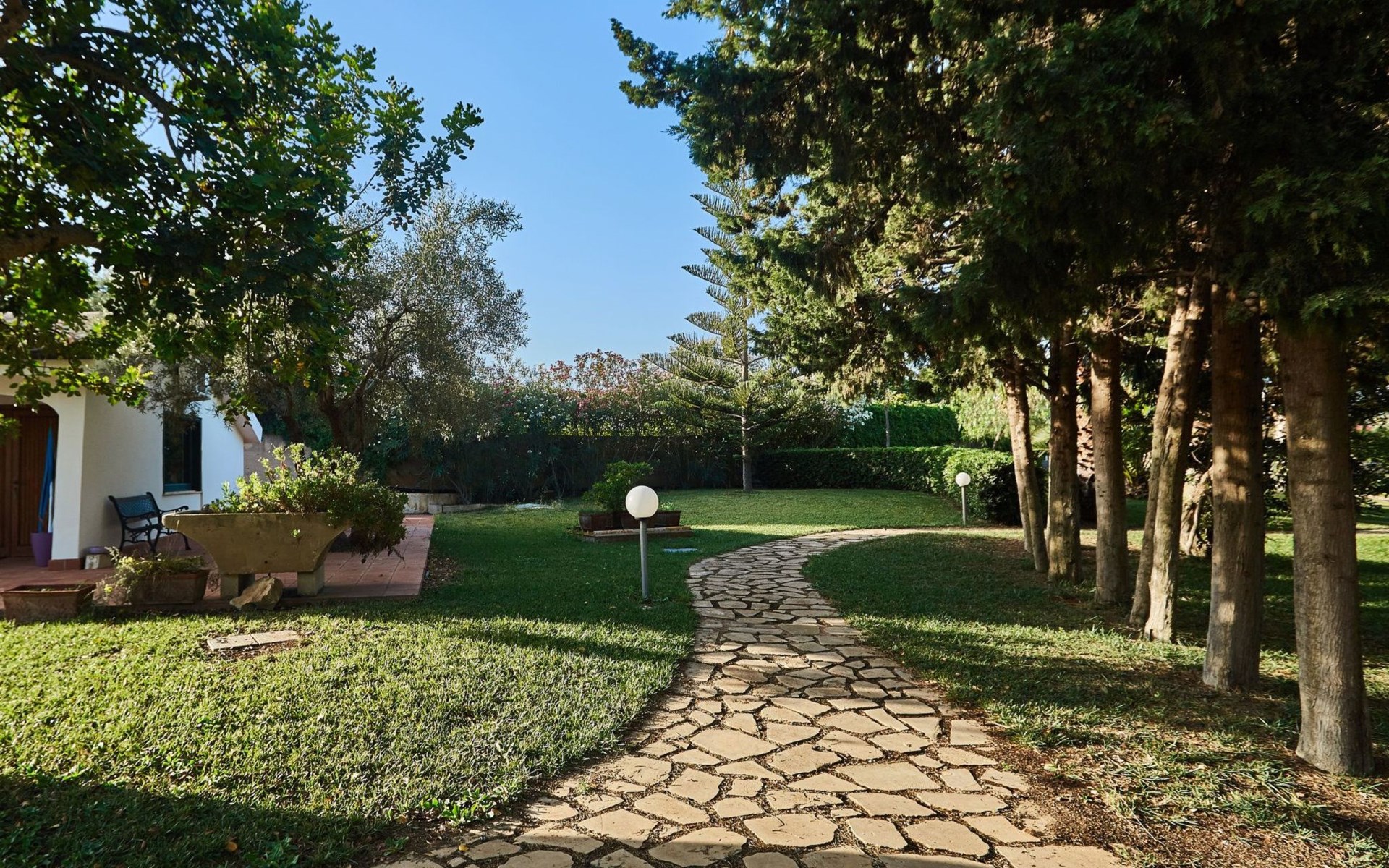 Von dem Raum, in dem sich der große Tisch befindet, gelangt man in einen etwa 50 Quadratmeter großen Innenhof mit Polirattan-Sesseln und einem Tisch für 20 Personen, wo man abends in der Kühle des Parks speisen kann. Sobald man das Eingangstor durchschreitet, hat man das Gefühl, an einem wunderschönen Ort angekommen zu sein, denn den Gästen steht eine 10.000 Quadratmeter große Rasenfläche zur Verfügung, die mit Palmen und jahrhundertealten Johannisbrotbäumen sowie vielen anderen mediterranen Pflanzenarten geschmückt und verziert ist. Der Park ist von Wegen aus einheimischen weißen Steinen durchzogen, so dass er bereits wie ein Gemälde wirkt. Dann finden wir einen Pavillon mit einem sehr großen Holztisch zum Grillen und in unmittelbarer Nähe grenzt ein weiterer Bereich an, in dem sich eine schöne Tischtennisplatte befindet, und weiter hinten gibt es zur Freude der Kleinen einen kleinen Spielplatz. Wenn man den Spaziergang fortsetzt, kommt man zum Herzstück des Parks, einem großen, unregelmäßigen Schwimmbad mit Liegestühlen und Sonnenschirmen rundherum und 2 runden, schmiedeeisernen Tischen mit Stühlen, so dass man Tage in absoluter Entspannung verbringen kann. Etwa 15 Meter entfernt befindet sich eine halb überdachte Terrasse mit Segeln und Polirattan-Liegen, die an die Küche angrenzt.