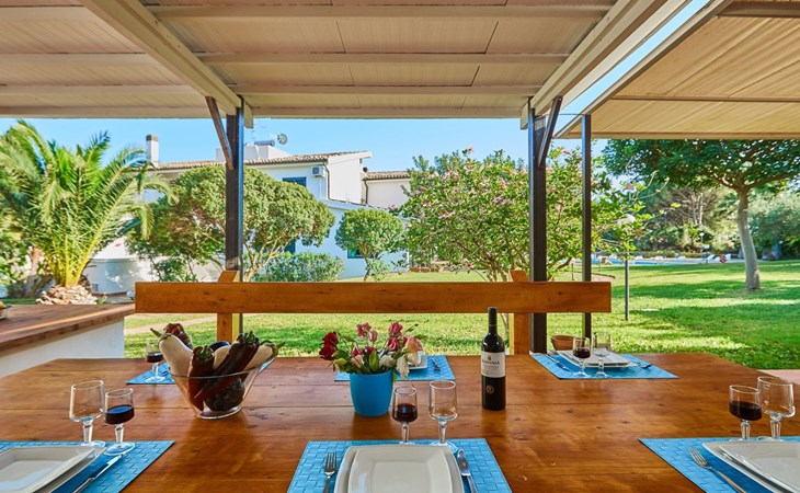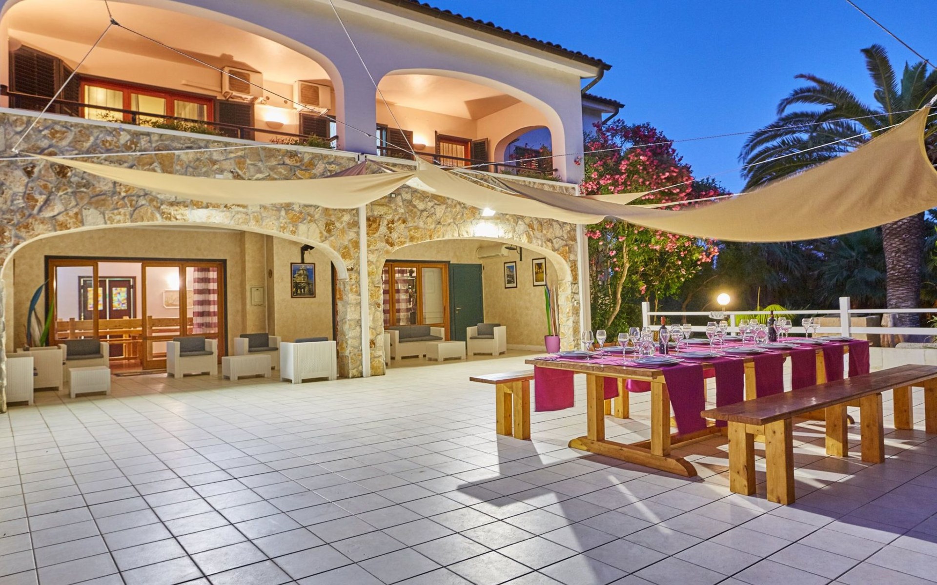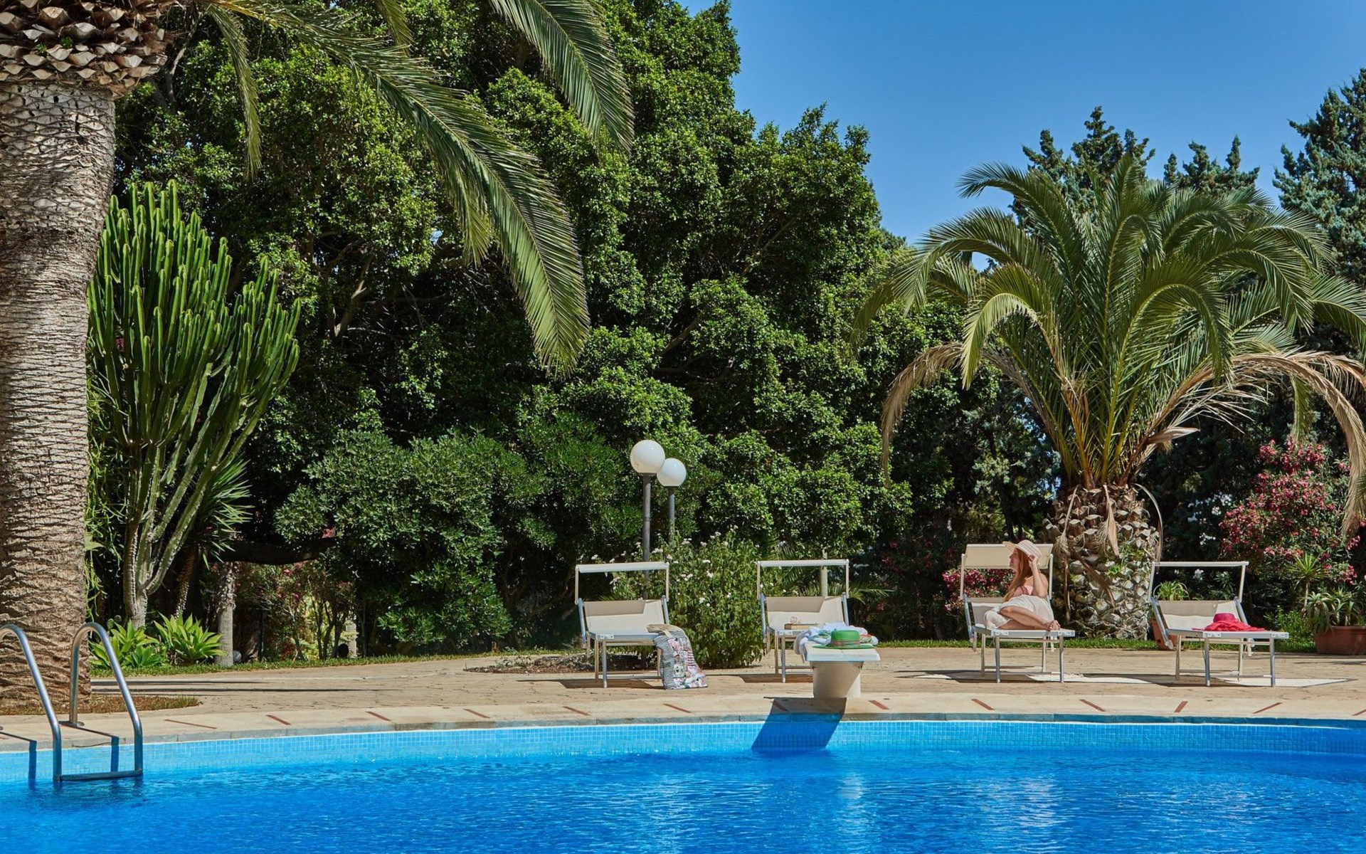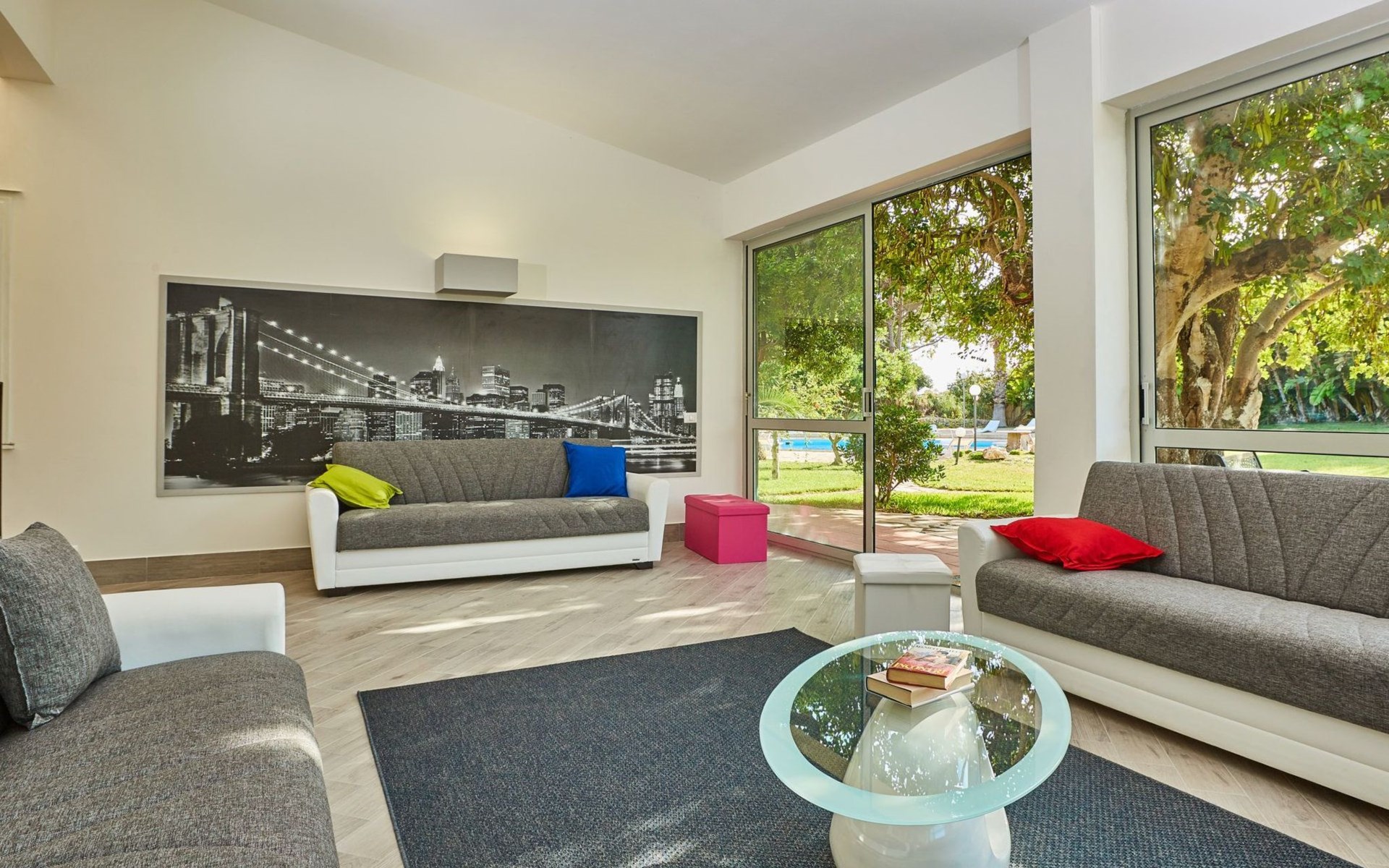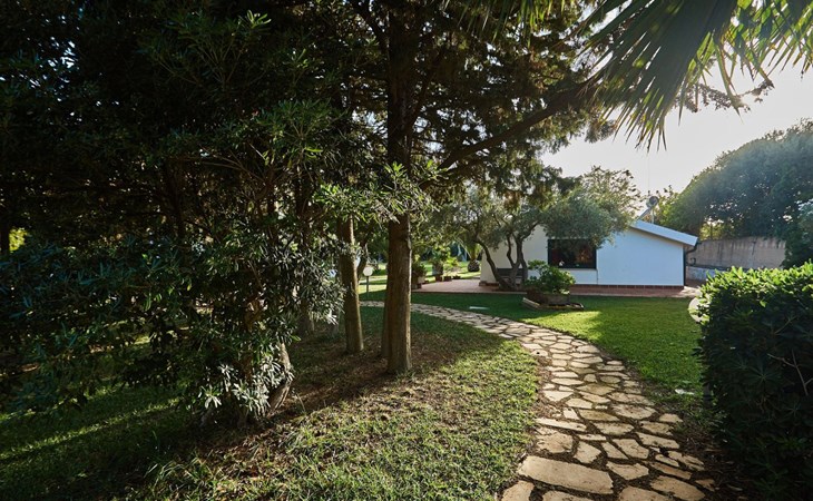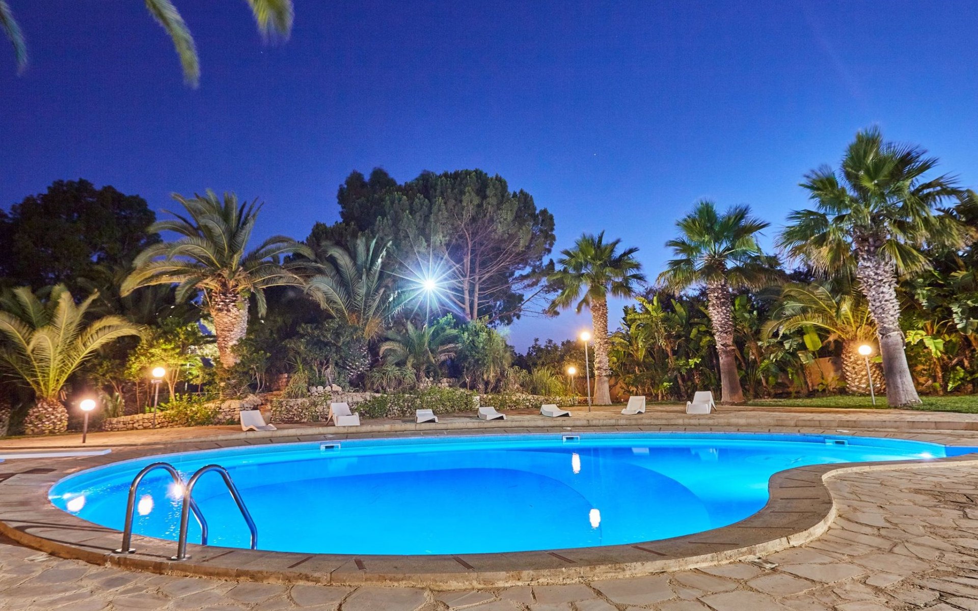 Von dem Raum, in dem sich der große Tisch befindet, gelangt man in einen etwa 50 Quadratmeter großen Innenhof mit Polirattan-Sesseln und einem Tisch für 20 Personen, wo man abends in der Kühle des Parks speisen kann. Sobald man das Eingangstor durchschreitet, hat man das Gefühl, an einem wunderschönen Ort angekommen zu sein, denn den Gästen steht eine 10.000 Quadratmeter große Rasenfläche zur Verfügung, die mit Palmen und jahrhundertealten Johannisbrotbäumen sowie vielen anderen mediterranen Pflanzenarten geschmückt und verziert ist. Der Park ist von Wegen aus einheimischen weißen Steinen durchzogen, so dass er bereits wie ein Gemälde wirkt. Dann finden wir einen Pavillon mit einem sehr großen Holztisch zum Grillen und in unmittelbarer Nähe grenzt ein weiterer Bereich an, in dem sich eine schöne Tischtennisplatte befindet, und weiter hinten gibt es zur Freude der Kleinen einen kleinen Spielplatz. Wenn man den Spaziergang fortsetzt, kommt man zum Herzstück des Parks, einem großen, unregelmäßigen Schwimmbad mit Liegestühlen und Sonnenschirmen rundherum und 2 runden, schmiedeeisernen Tischen mit Stühlen, so dass man Tage in absoluter Entspannung verbringen kann. Etwa 15 Meter entfernt befindet sich eine halb überdachte Terrasse mit Segeln und Polirattan-Liegen, die an die Küche angrenzt.