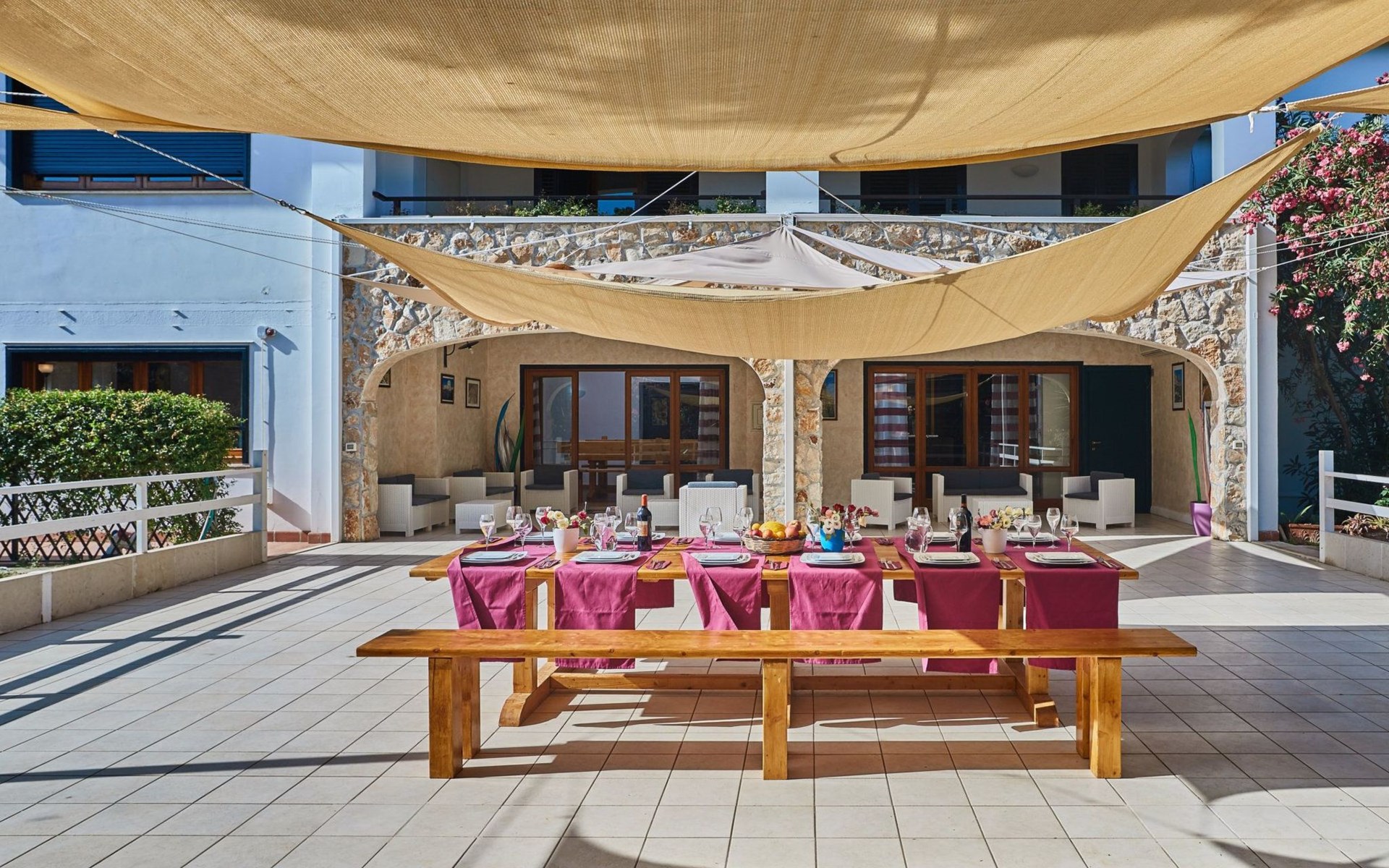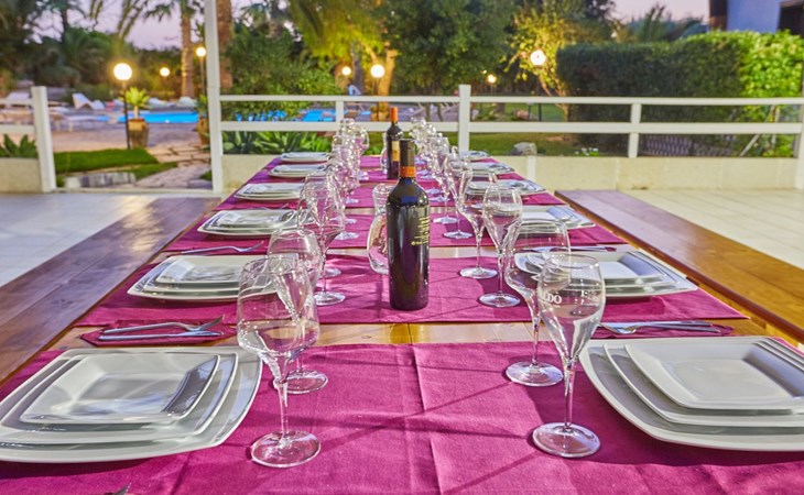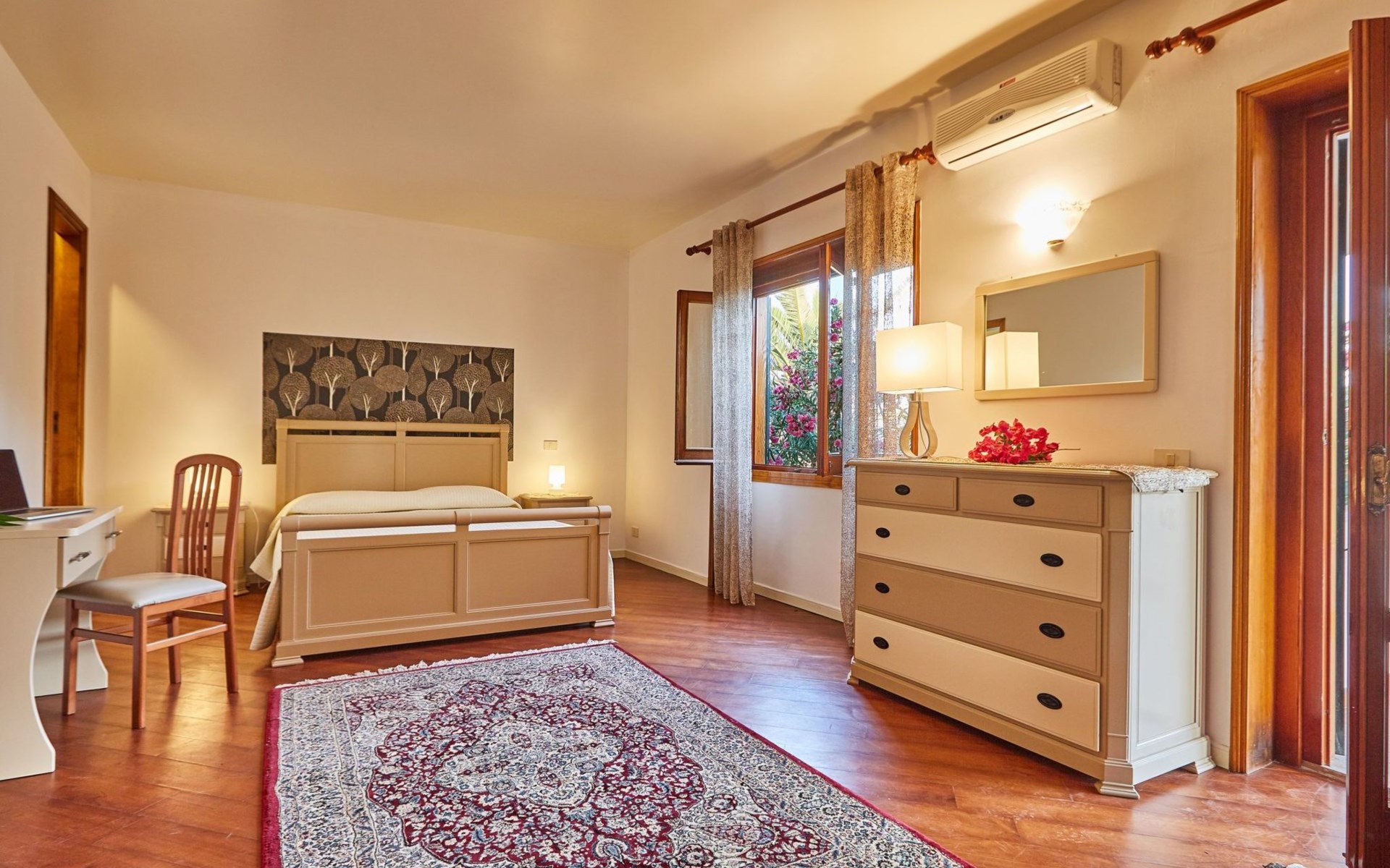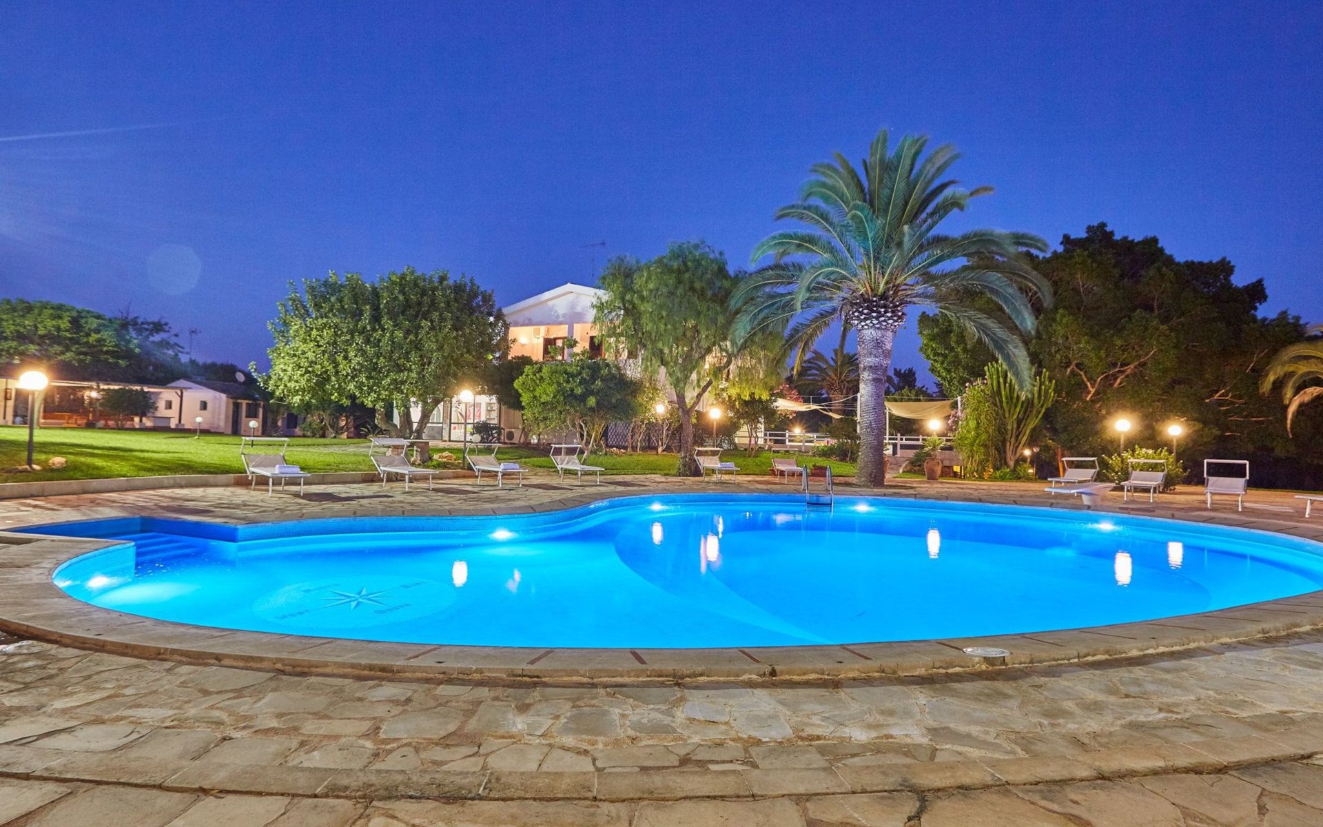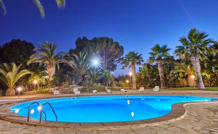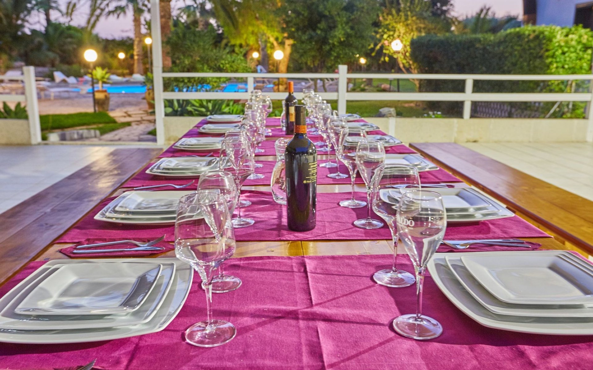 Von dem Raum, in dem sich der große Tisch befindet, gelangt man in einen etwa 50 Quadratmeter großen Innenhof mit Polirattan-Sesseln und einem Tisch für 20 Personen, wo man abends in der Kühle des Parks speisen kann. Sobald man das Eingangstor durchschreitet, hat man das Gefühl, an einem wunderschönen Ort angekommen zu sein, denn den Gästen steht eine 10.000 Quadratmeter große Rasenfläche zur Verfügung, die mit Palmen und jahrhundertealten Johannisbrotbäumen sowie vielen anderen mediterranen Pflanzenarten geschmückt und verziert ist. Der Park ist von Wegen aus einheimischen weißen Steinen durchzogen, so dass er bereits wie ein Gemälde wirkt. Dann finden wir einen Pavillon mit einem sehr großen Holztisch zum Grillen und in unmittelbarer Nähe grenzt ein weiterer Bereich an, in dem sich eine schöne Tischtennisplatte befindet, und weiter hinten gibt es zur Freude der Kleinen einen kleinen Spielplatz. Wenn man den Spaziergang fortsetzt, kommt man zum Herzstück des Parks, einem großen, unregelmäßigen Schwimmbad mit Liegestühlen und Sonnenschirmen rundherum und 2 runden, schmiedeeisernen Tischen mit Stühlen, so dass man Tage in absoluter Entspannung verbringen kann. Etwa 15 Meter entfernt befindet sich eine halb überdachte Terrasse mit Segeln und Polirattan-Liegen, die an die Küche angrenzt.
