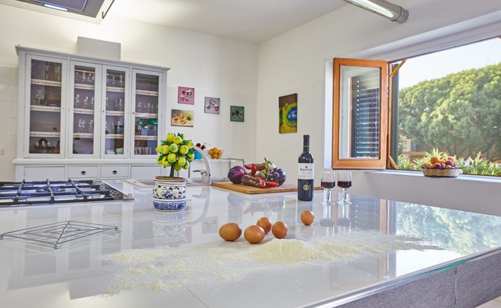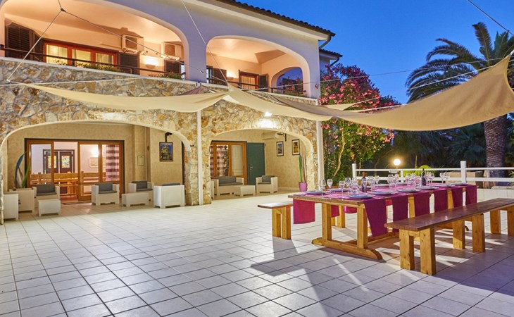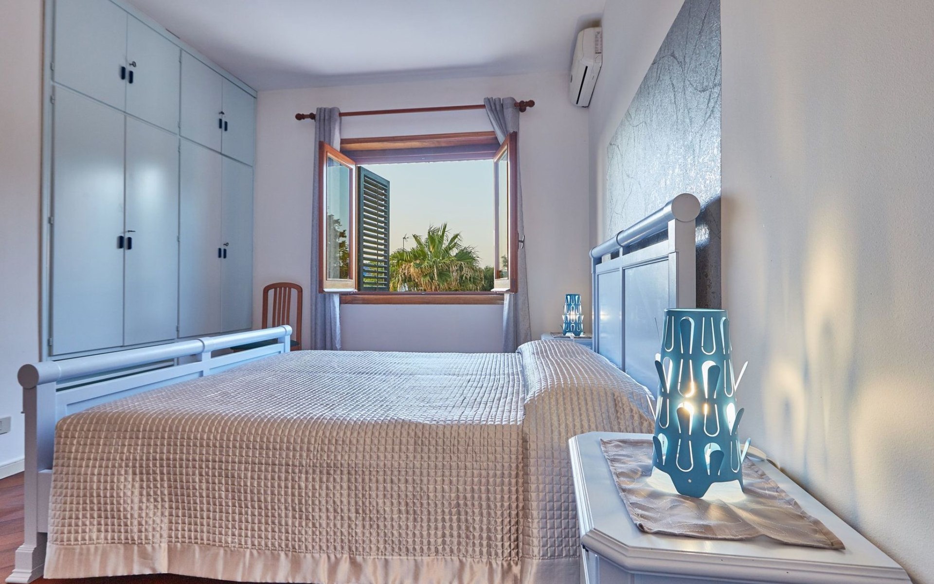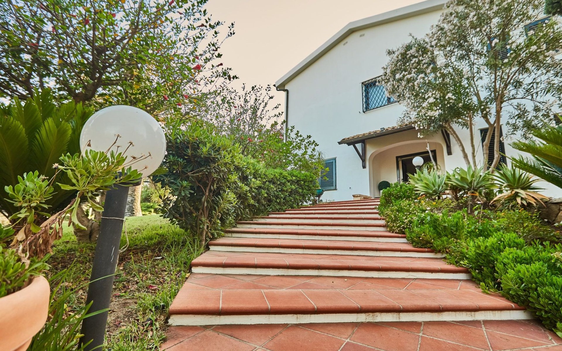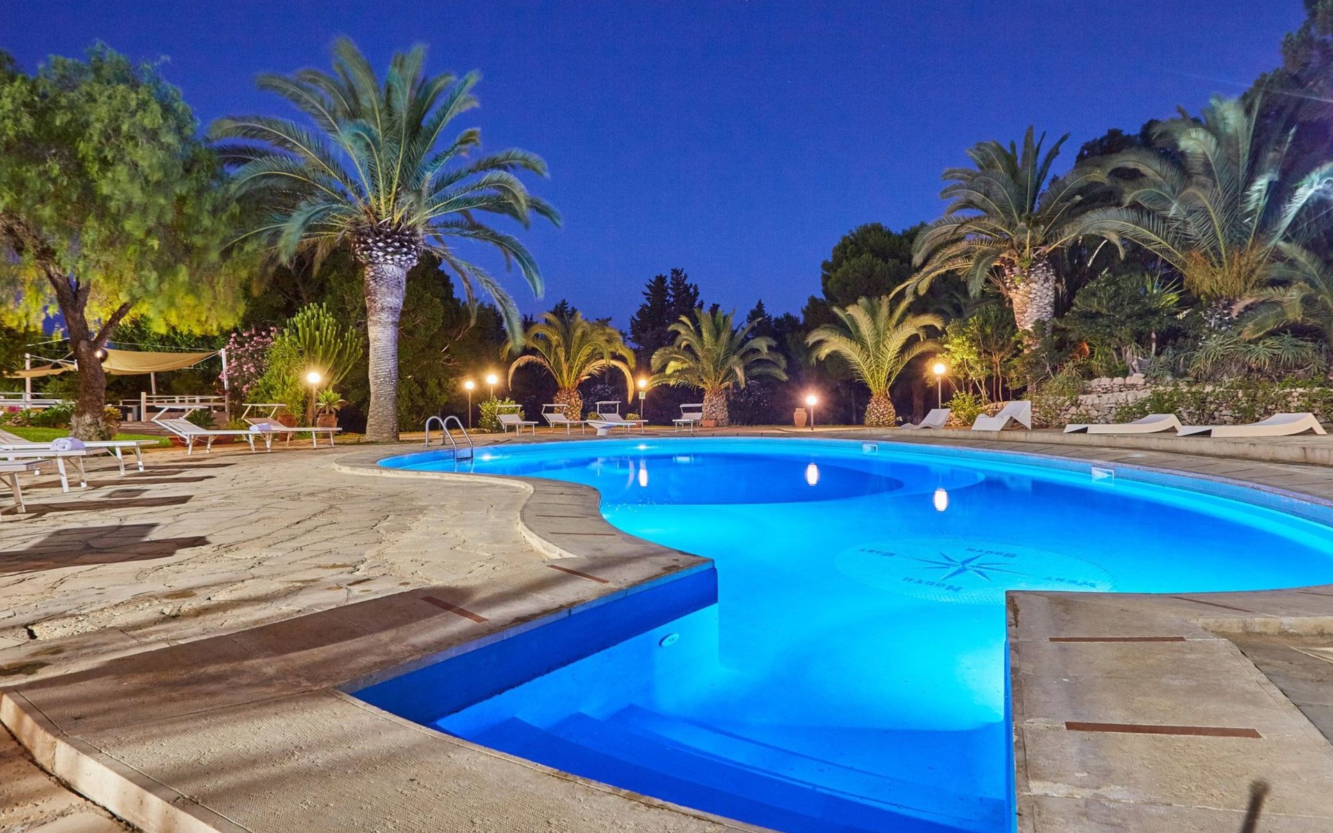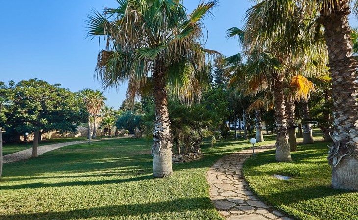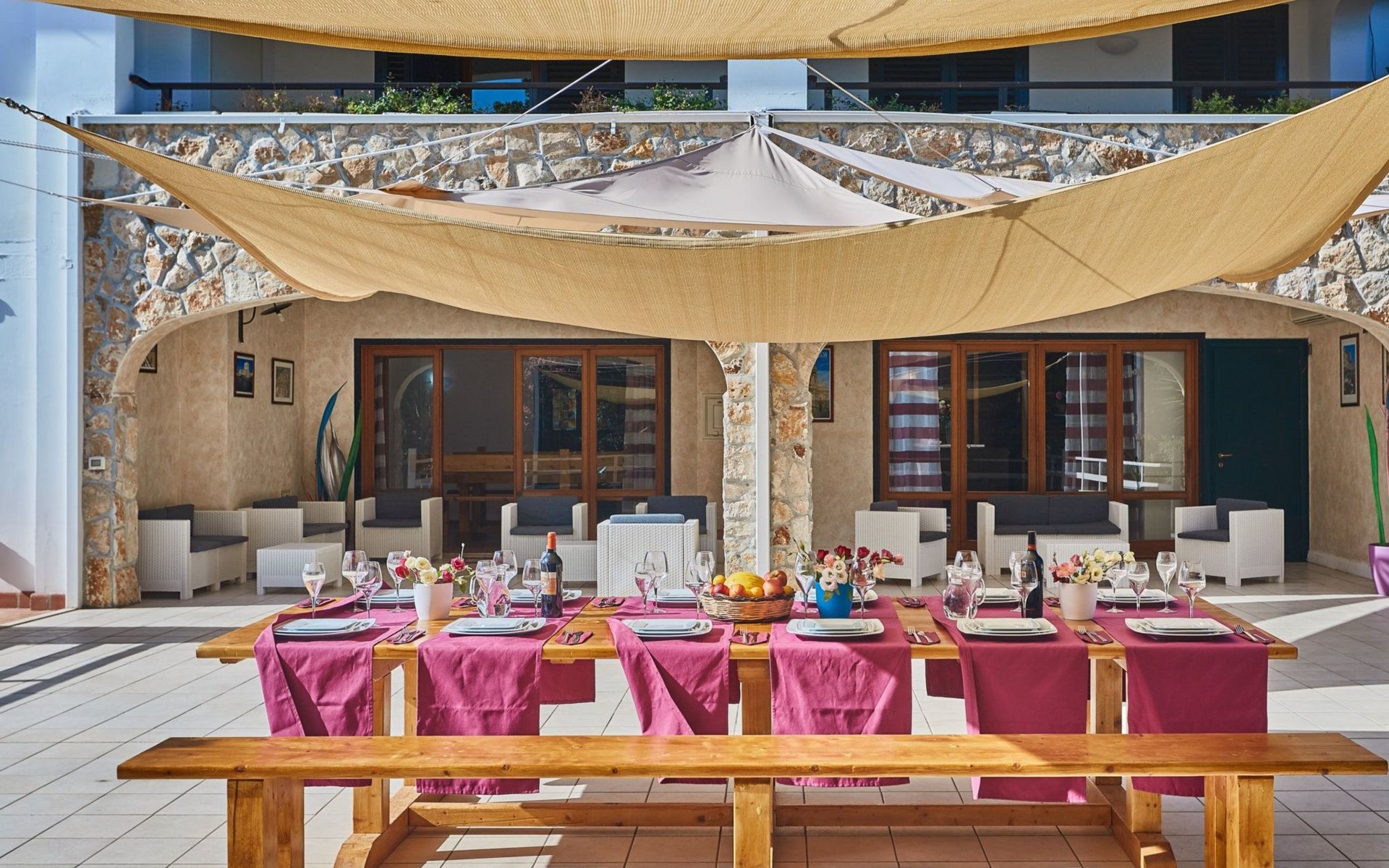 Von dem Raum, in dem sich der große Tisch befindet, gelangt man in einen etwa 50 Quadratmeter großen Innenhof mit Polirattan-Sesseln und einem Tisch für 20 Personen, wo man abends in der Kühle des Parks speisen kann. Sobald man das Eingangstor durchschreitet, hat man das Gefühl, an einem wunderschönen Ort angekommen zu sein, denn den Gästen steht eine 10.000 Quadratmeter große Rasenfläche zur Verfügung, die mit Palmen und jahrhundertealten Johannisbrotbäumen sowie vielen anderen mediterranen Pflanzenarten geschmückt und verziert ist. Der Park ist von Wegen aus einheimischen weißen Steinen durchzogen, so dass er bereits wie ein Gemälde wirkt. Dann finden wir einen Pavillon mit einem sehr großen Holztisch zum Grillen und in unmittelbarer Nähe grenzt ein weiterer Bereich an, in dem sich eine schöne Tischtennisplatte befindet, und weiter hinten gibt es zur Freude der Kleinen einen kleinen Spielplatz. Wenn man den Spaziergang fortsetzt, kommt man zum Herzstück des Parks, einem großen, unregelmäßigen Schwimmbad mit Liegestühlen und Sonnenschirmen rundherum und 2 runden, schmiedeeisernen Tischen mit Stühlen, so dass man Tage in absoluter Entspannung verbringen kann. Etwa 15 Meter entfernt befindet sich eine halb überdachte Terrasse mit Segeln und Polirattan-Liegen, die an die Küche angrenzt.