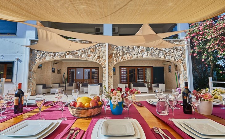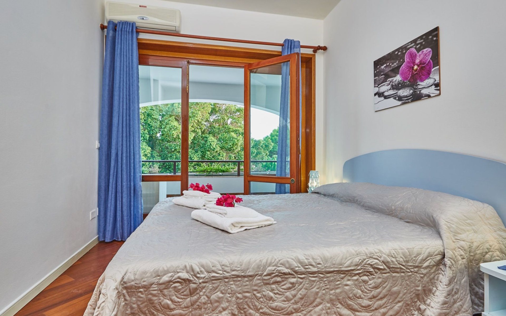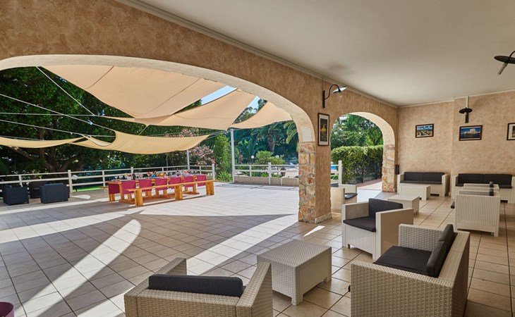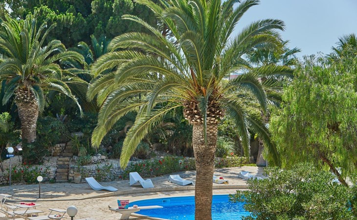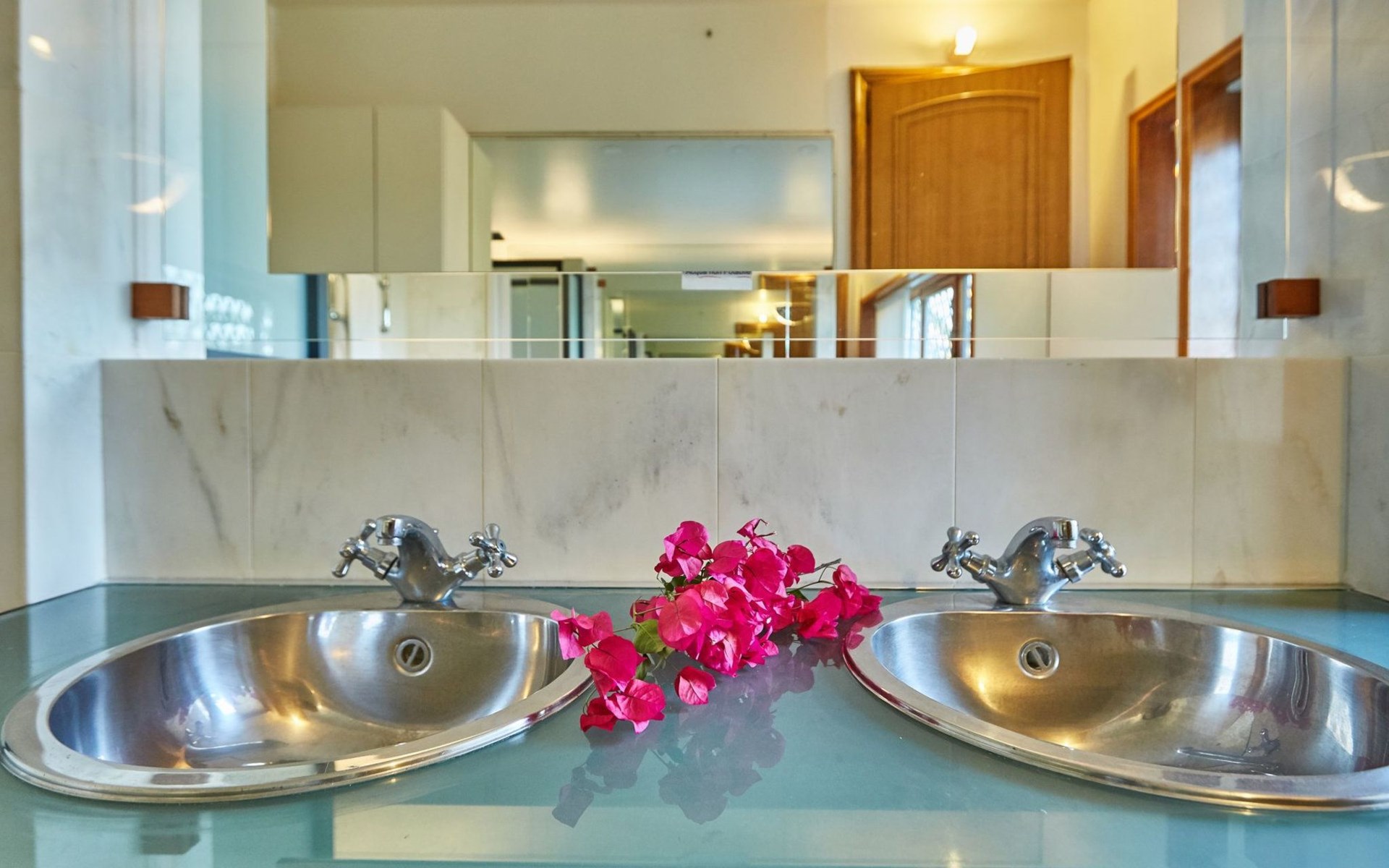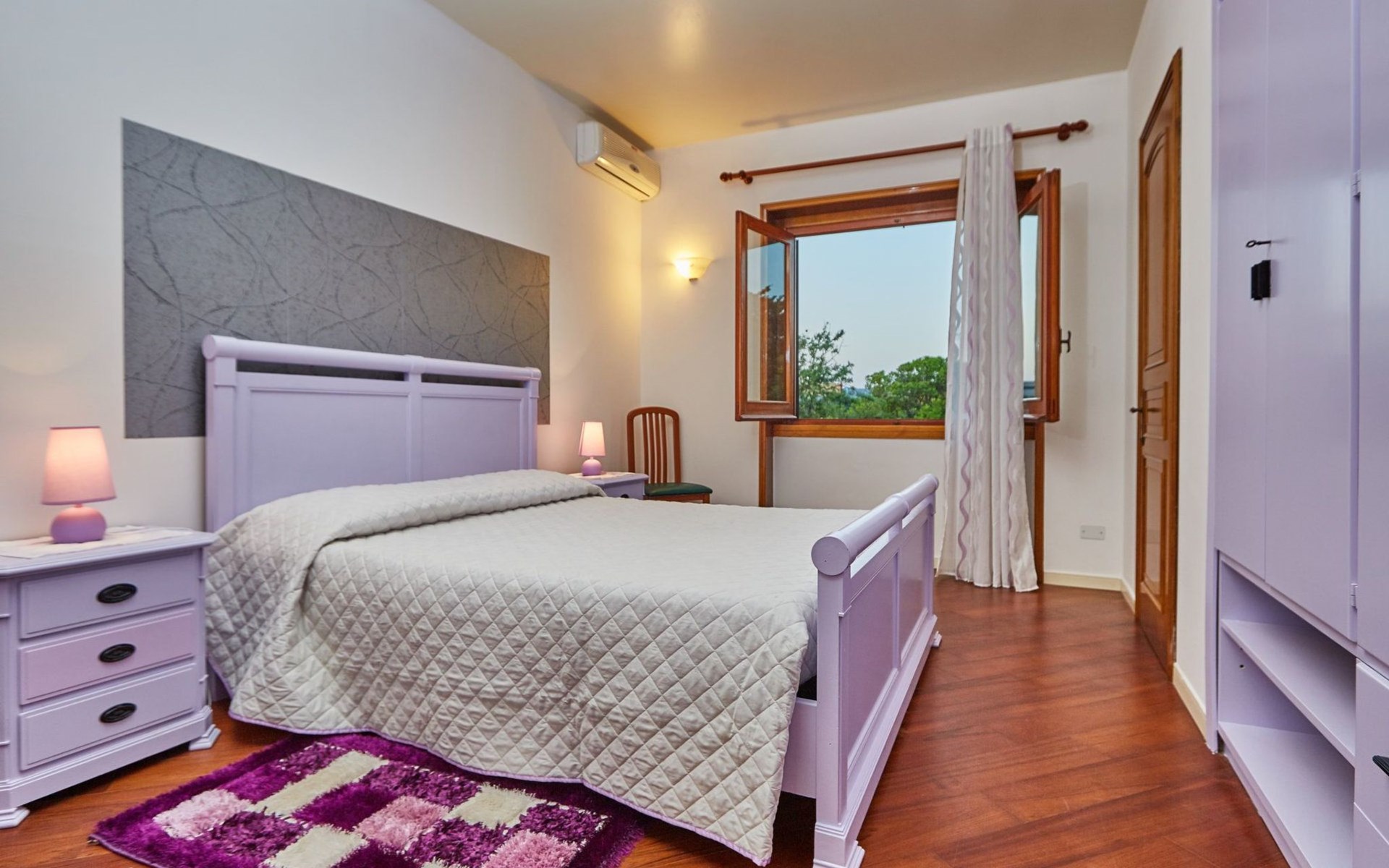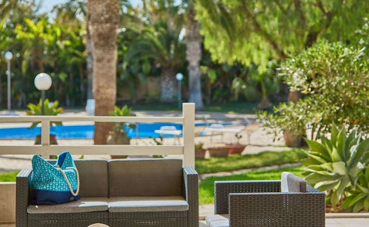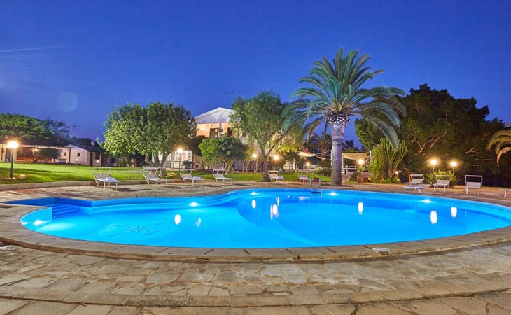 Von dem Raum, in dem sich der große Tisch befindet, gelangt man in einen etwa 50 Quadratmeter großen Innenhof mit Polirattan-Sesseln und einem Tisch für 20 Personen, wo man abends in der Kühle des Parks speisen kann. Sobald man das Eingangstor durchschreitet, hat man das Gefühl, an einem wunderschönen Ort angekommen zu sein, denn den Gästen steht eine 10.000 Quadratmeter große Rasenfläche zur Verfügung, die mit Palmen und jahrhundertealten Johannisbrotbäumen sowie vielen anderen mediterranen Pflanzenarten geschmückt und verziert ist. Der Park ist von Wegen aus einheimischen weißen Steinen durchzogen, so dass er bereits wie ein Gemälde wirkt. Dann finden wir einen Pavillon mit einem sehr großen Holztisch zum Grillen und in unmittelbarer Nähe grenzt ein weiterer Bereich an, in dem sich eine schöne Tischtennisplatte befindet, und weiter hinten gibt es zur Freude der Kleinen einen kleinen Spielplatz. Wenn man den Spaziergang fortsetzt, kommt man zum Herzstück des Parks, einem großen, unregelmäßigen Schwimmbad mit Liegestühlen und Sonnenschirmen rundherum und 2 runden, schmiedeeisernen Tischen mit Stühlen, so dass man Tage in absoluter Entspannung verbringen kann. Etwa 15 Meter entfernt befindet sich eine halb überdachte Terrasse mit Segeln und Polirattan-Liegen, die an die Küche angrenzt.