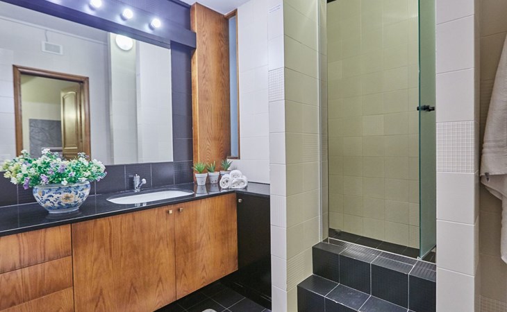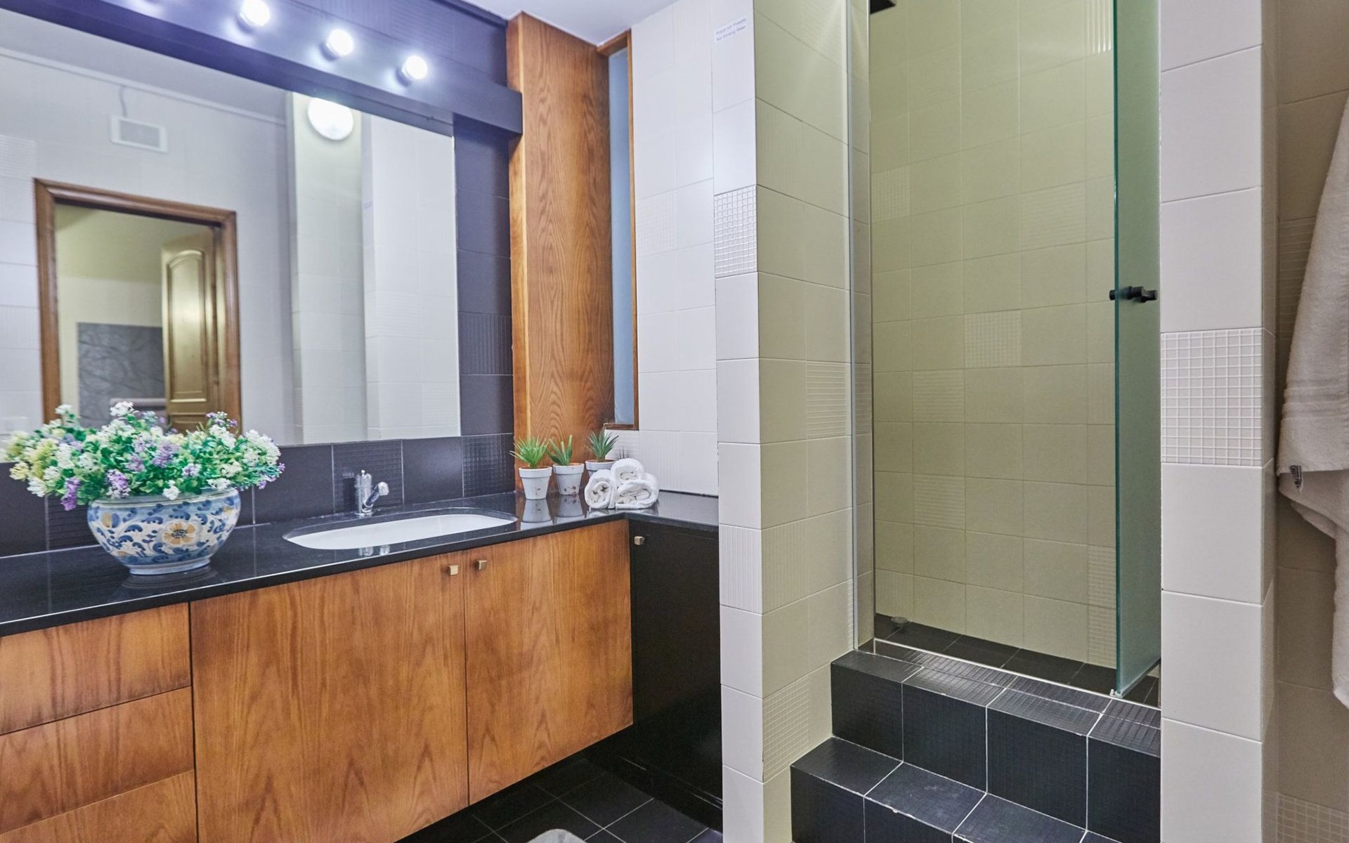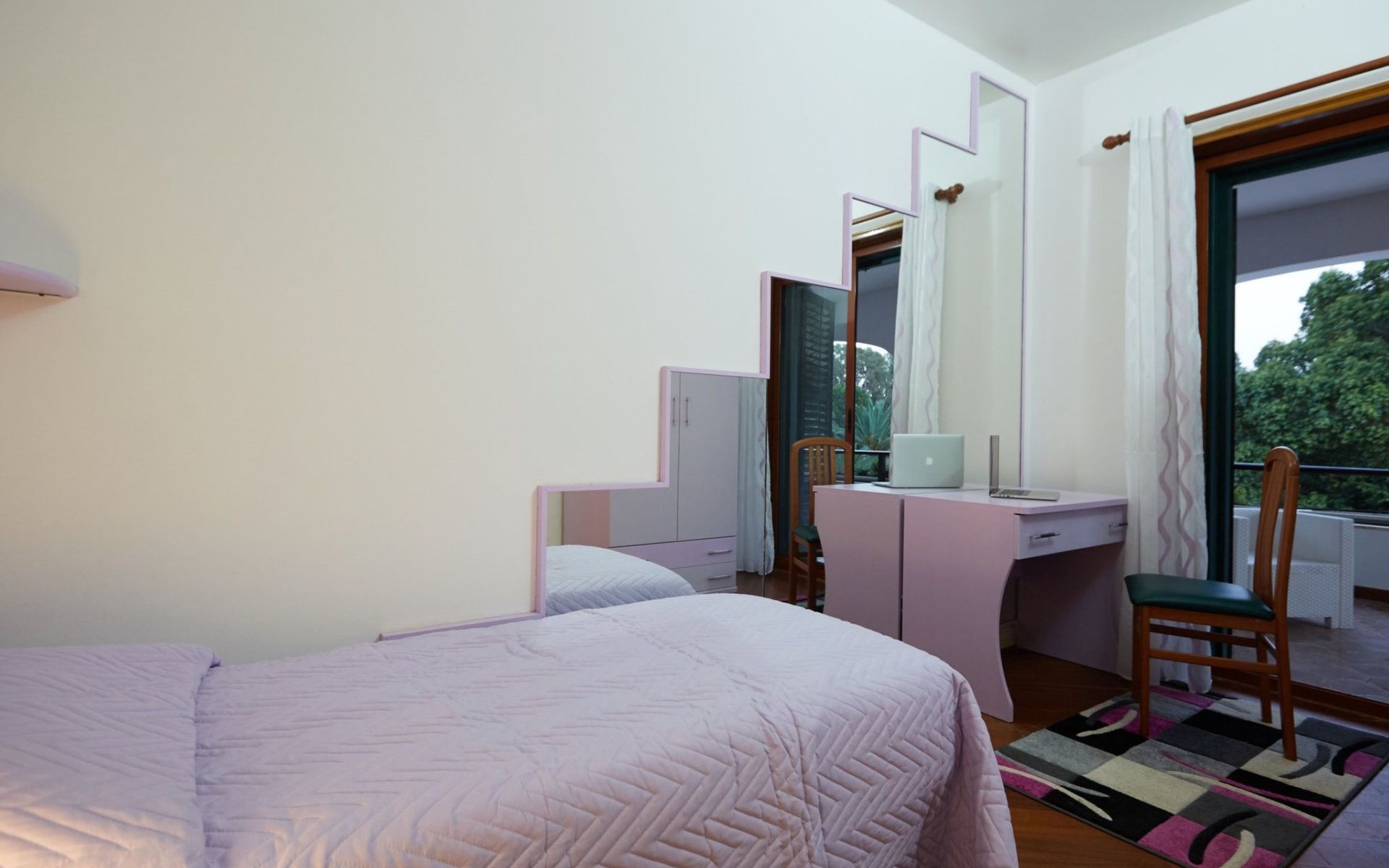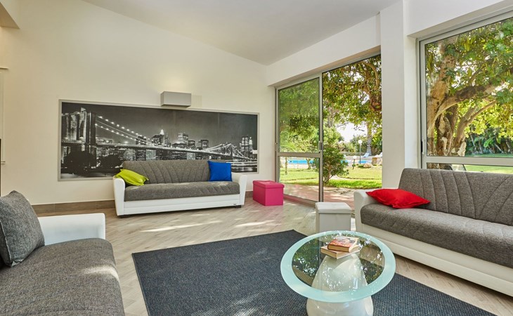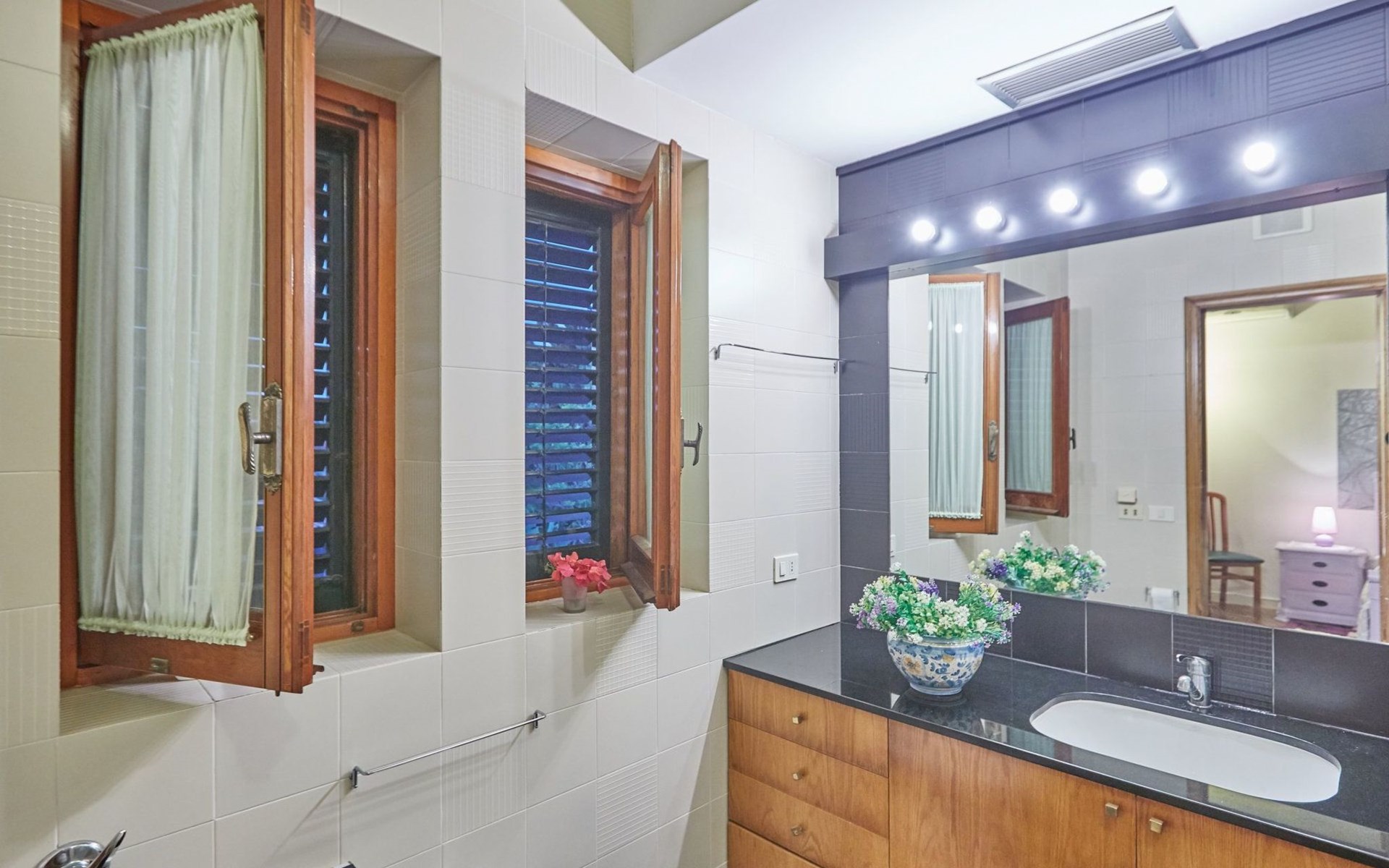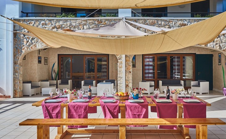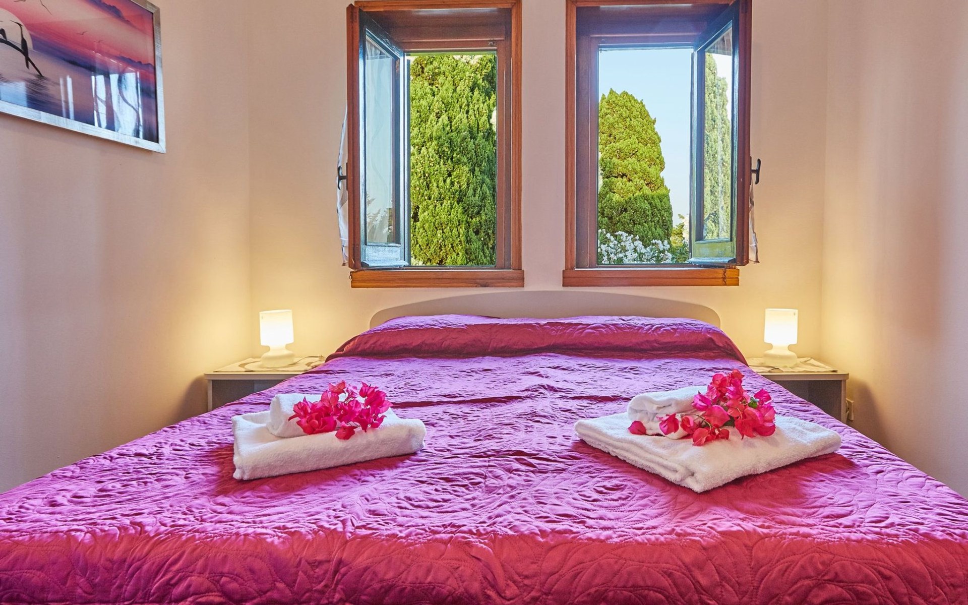 Von dem Raum, in dem sich der große Tisch befindet, gelangt man in einen etwa 50 Quadratmeter großen Innenhof mit Polirattan-Sesseln und einem Tisch für 20 Personen, wo man abends in der Kühle des Parks speisen kann. Sobald man das Eingangstor durchschreitet, hat man das Gefühl, an einem wunderschönen Ort angekommen zu sein, denn den Gästen steht eine 10.000 Quadratmeter große Rasenfläche zur Verfügung, die mit Palmen und jahrhundertealten Johannisbrotbäumen sowie vielen anderen mediterranen Pflanzenarten geschmückt und verziert ist. Der Park ist von Wegen aus einheimischen weißen Steinen durchzogen, so dass er bereits wie ein Gemälde wirkt. Dann finden wir einen Pavillon mit einem sehr großen Holztisch zum Grillen und in unmittelbarer Nähe grenzt ein weiterer Bereich an, in dem sich eine schöne Tischtennisplatte befindet, und weiter hinten gibt es zur Freude der Kleinen einen kleinen Spielplatz. Wenn man den Spaziergang fortsetzt, kommt man zum Herzstück des Parks, einem großen, unregelmäßigen Schwimmbad mit Liegestühlen und Sonnenschirmen rundherum und 2 runden, schmiedeeisernen Tischen mit Stühlen, so dass man Tage in absoluter Entspannung verbringen kann. Etwa 15 Meter entfernt befindet sich eine halb überdachte Terrasse mit Segeln und Polirattan-Liegen, die an die Küche angrenzt.