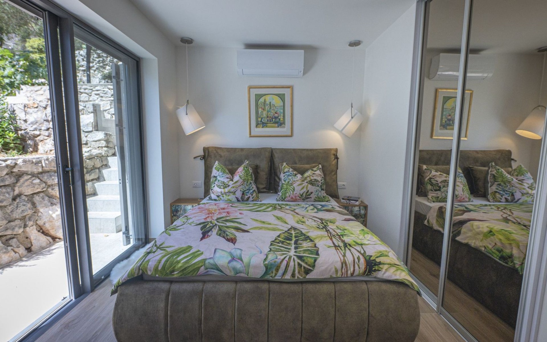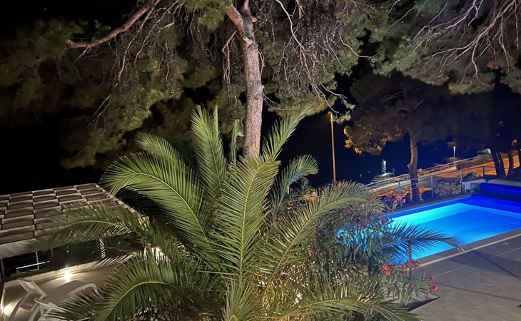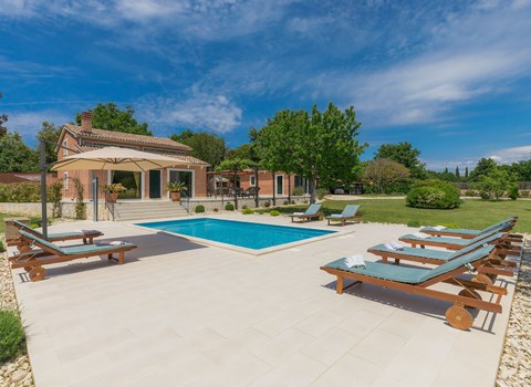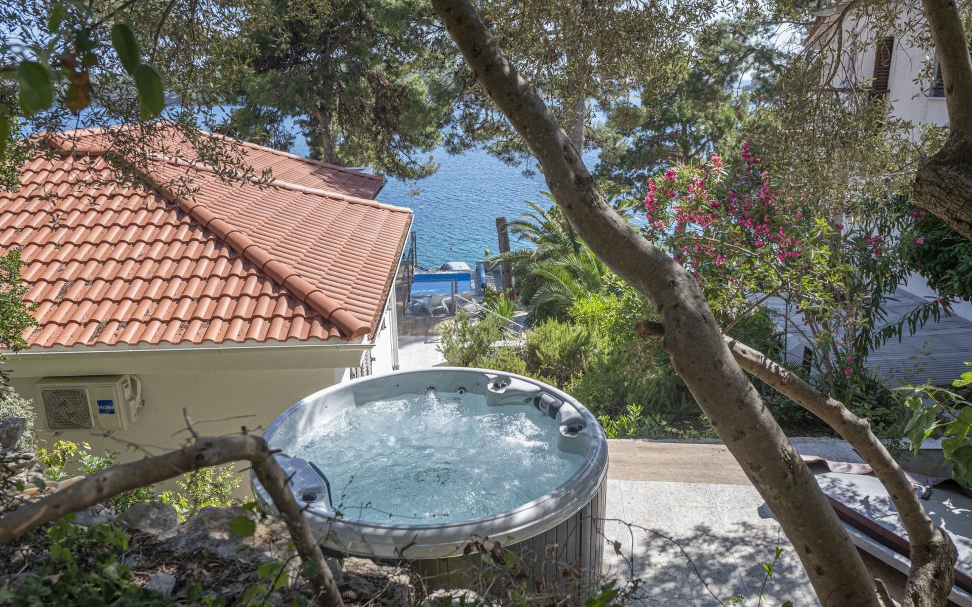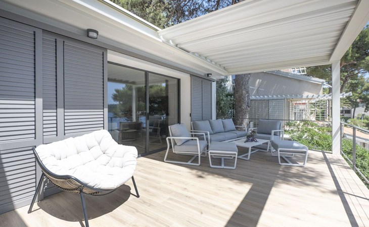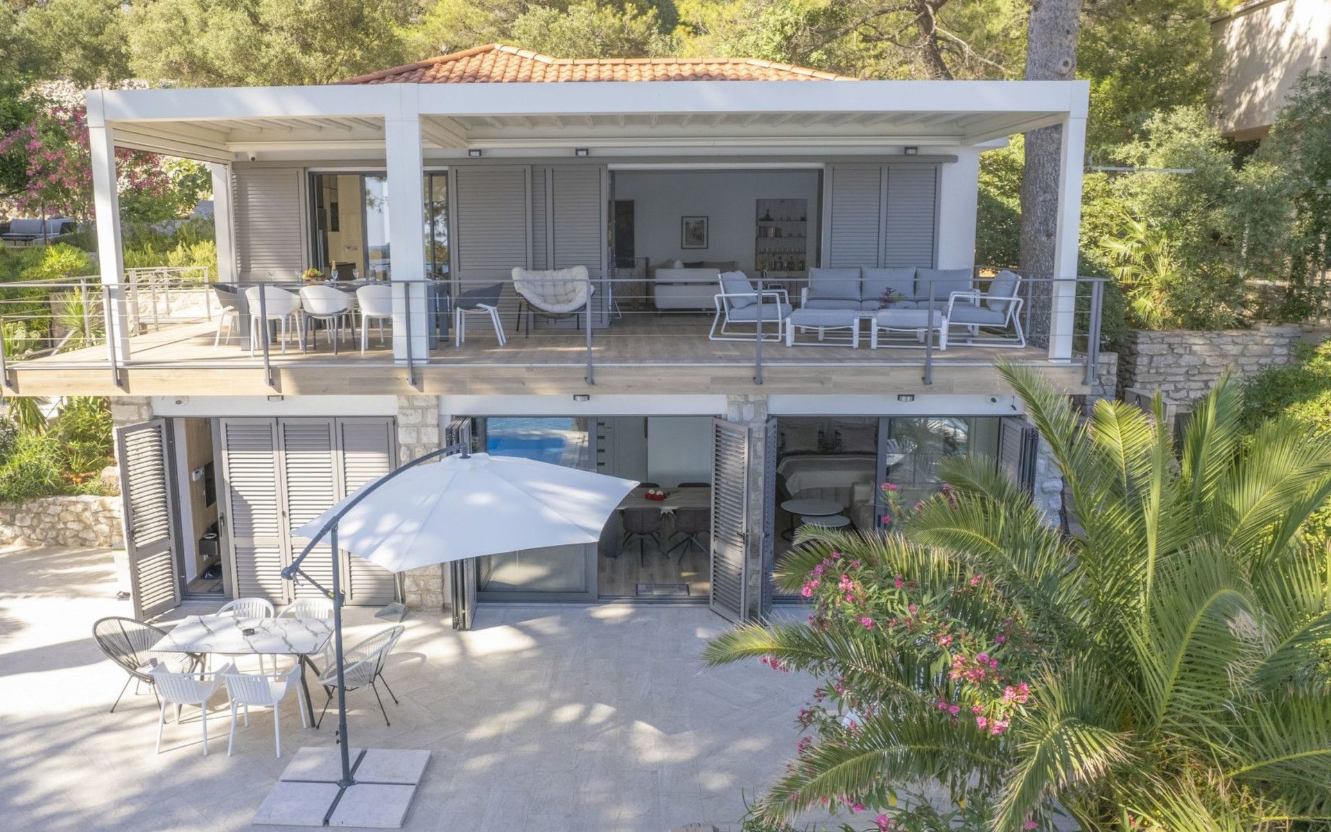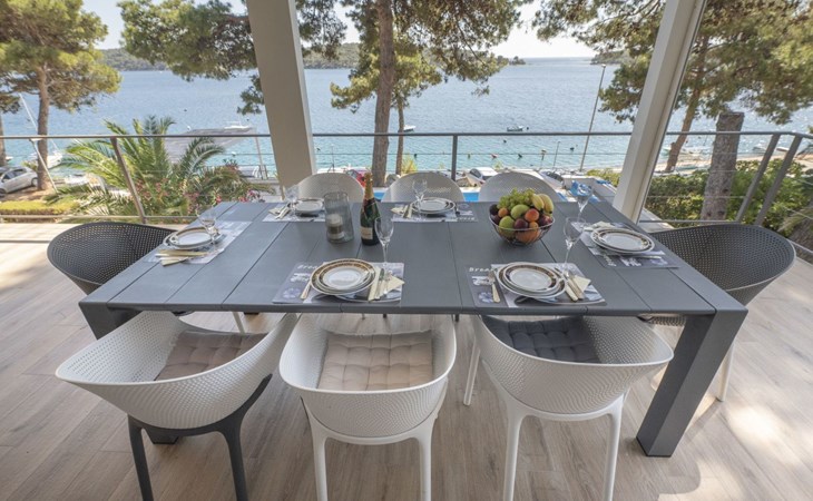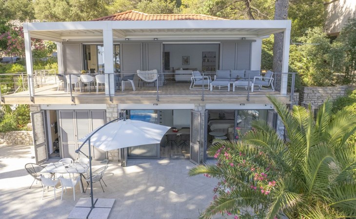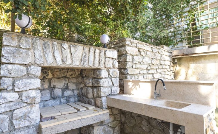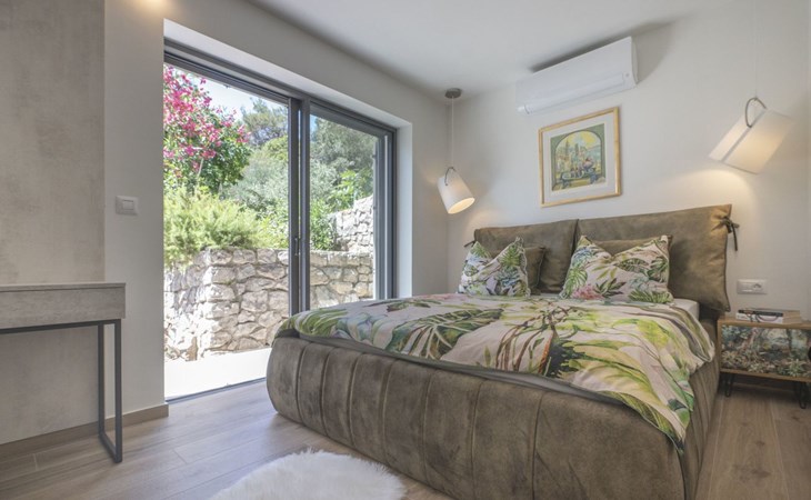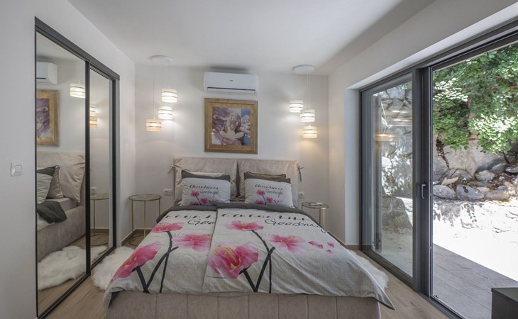 Das Äußere der Villa Hana ist ebenso beeindruckend wie ihr Inneres. Die Villa ist von üppigen Gärten umgeben und verfügt über mehrere Terrassen, von denen jede ihren eigenen Charme hat, sei es zum Faulenzen am privaten beheizten Pool, zum Genießen einer Mahlzeit im Grillbereich oder einfach zum Genießen der Ruhe, die der Außenbereich bietet. Das Vorhandensein einer Garage und von sechs Parkplätzen bietet höchsten Komfort für Gäste mit Fahrzeugen.