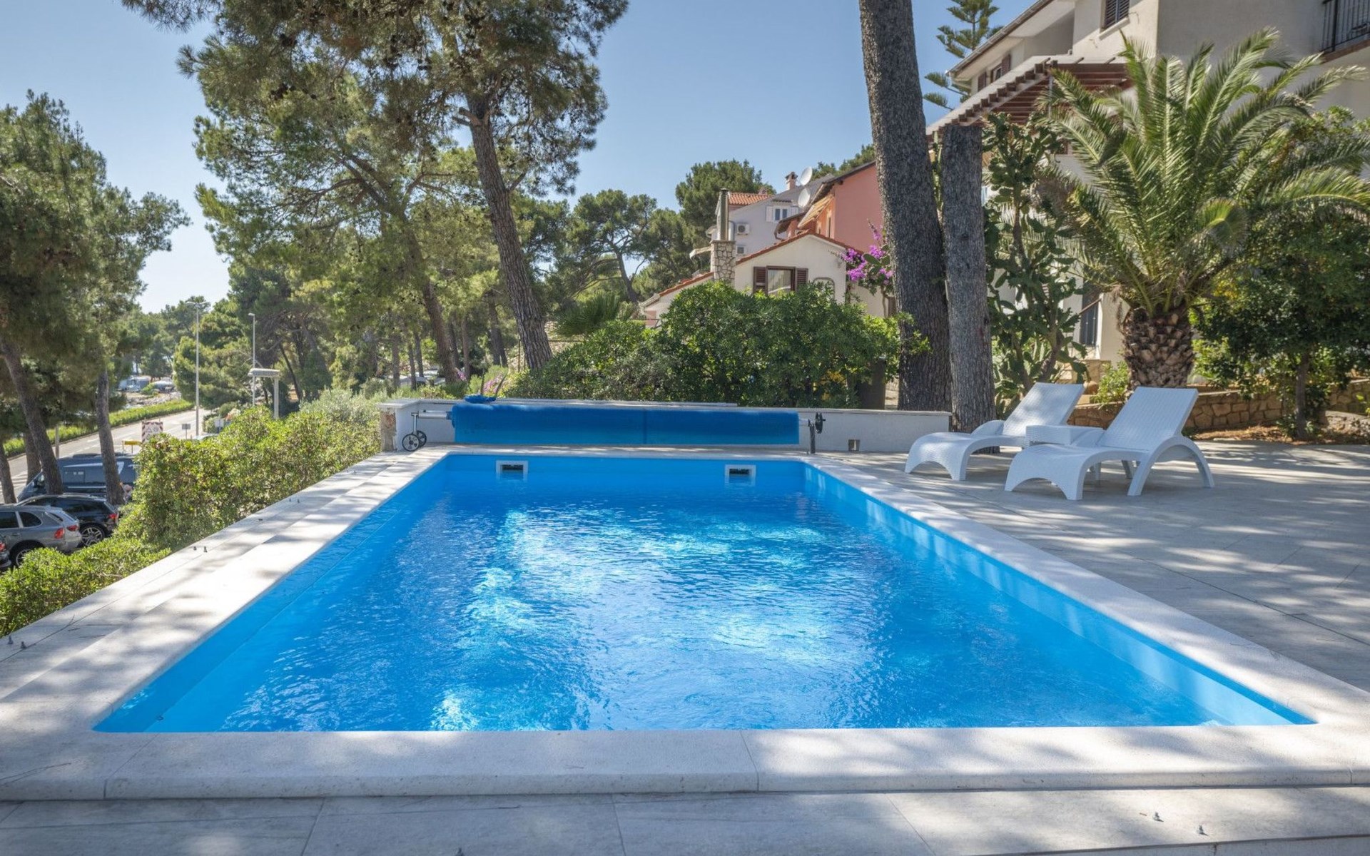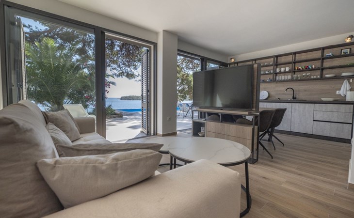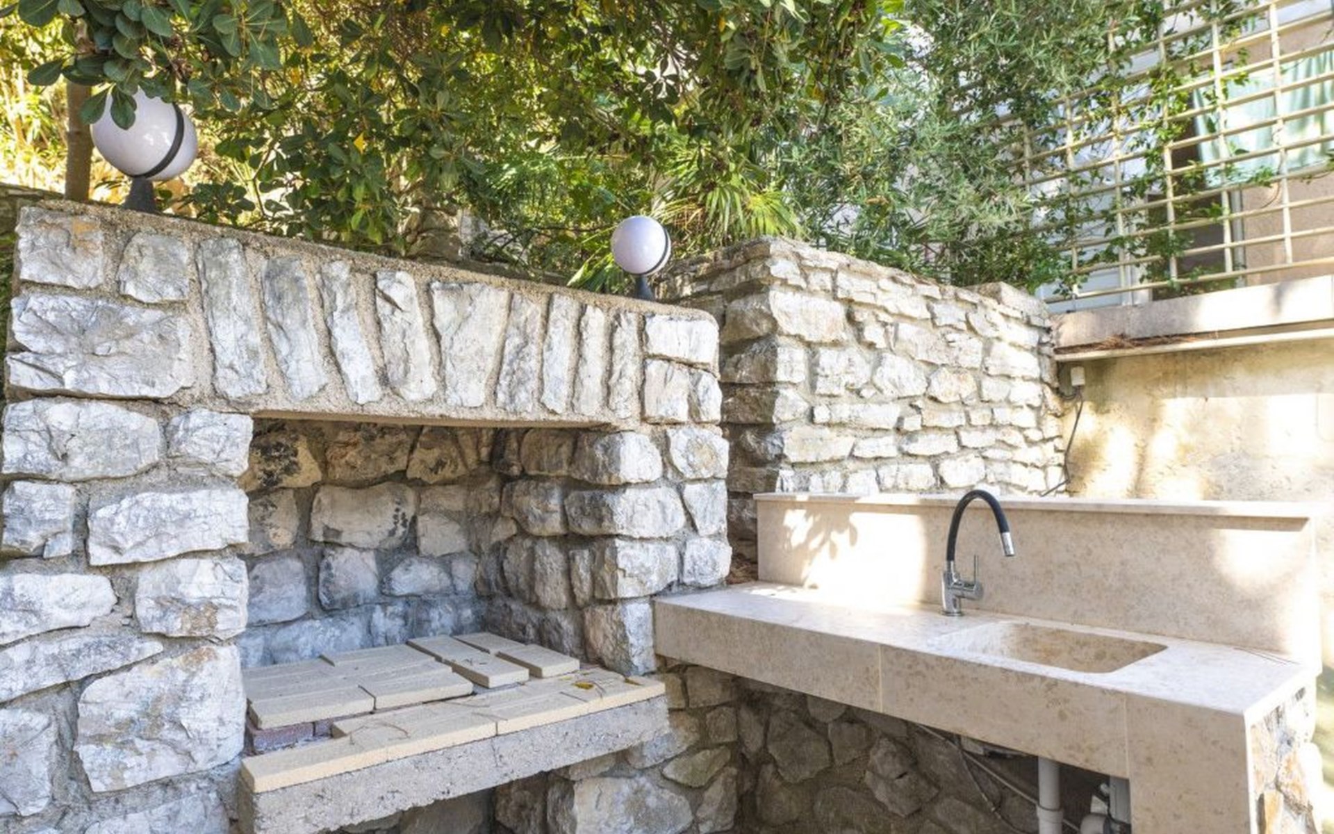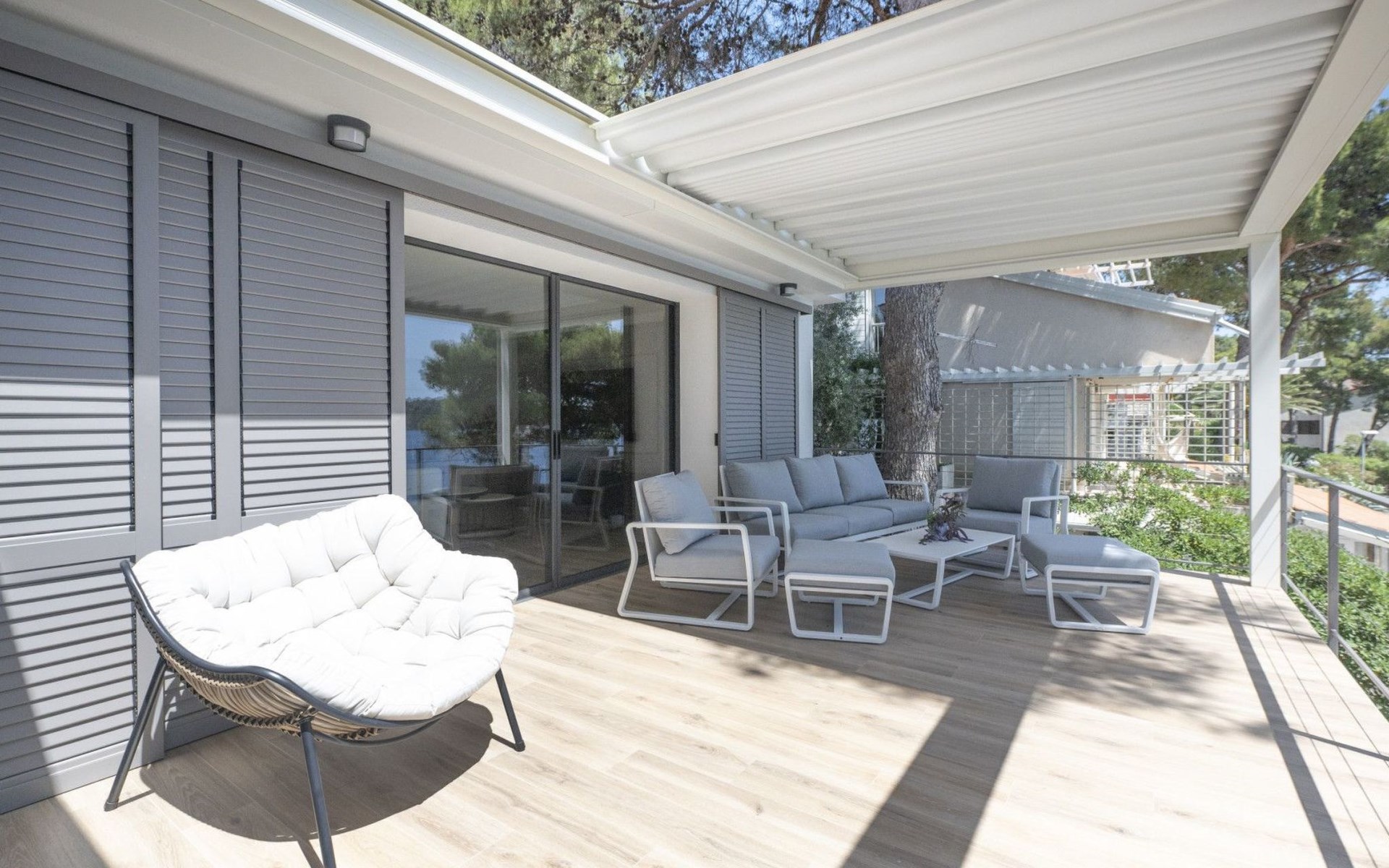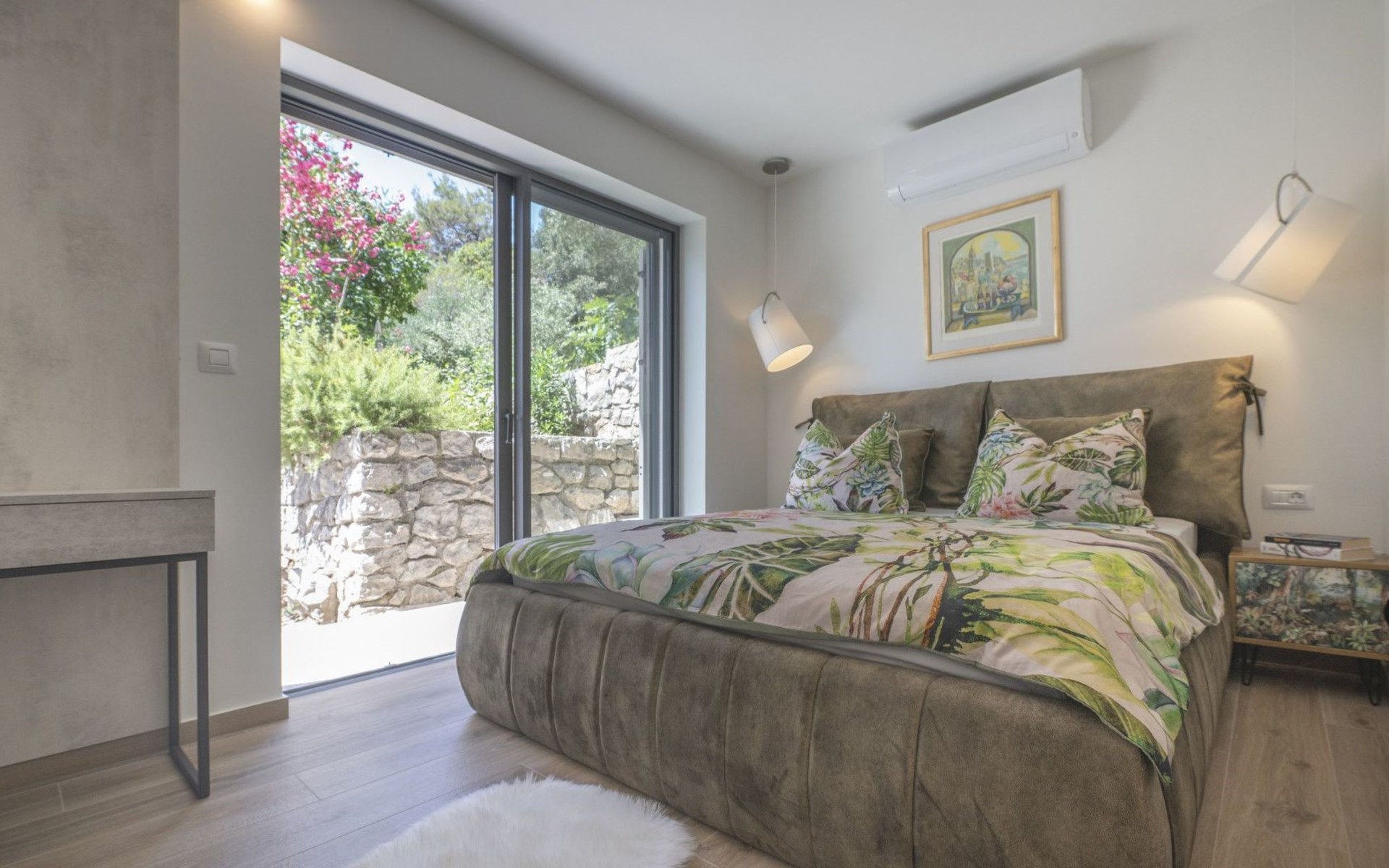 Das Äußere der Villa Hana ist ebenso beeindruckend wie ihr Inneres. Die Villa ist von üppigen Gärten umgeben und verfügt über mehrere Terrassen, von denen jede ihren eigenen Charme hat, sei es zum Faulenzen am privaten beheizten Pool, zum Genießen einer Mahlzeit im Grillbereich oder einfach zum Genießen der Ruhe, die der Außenbereich bietet. Das Vorhandensein einer Garage und von sechs Parkplätzen bietet höchsten Komfort für Gäste mit Fahrzeugen.