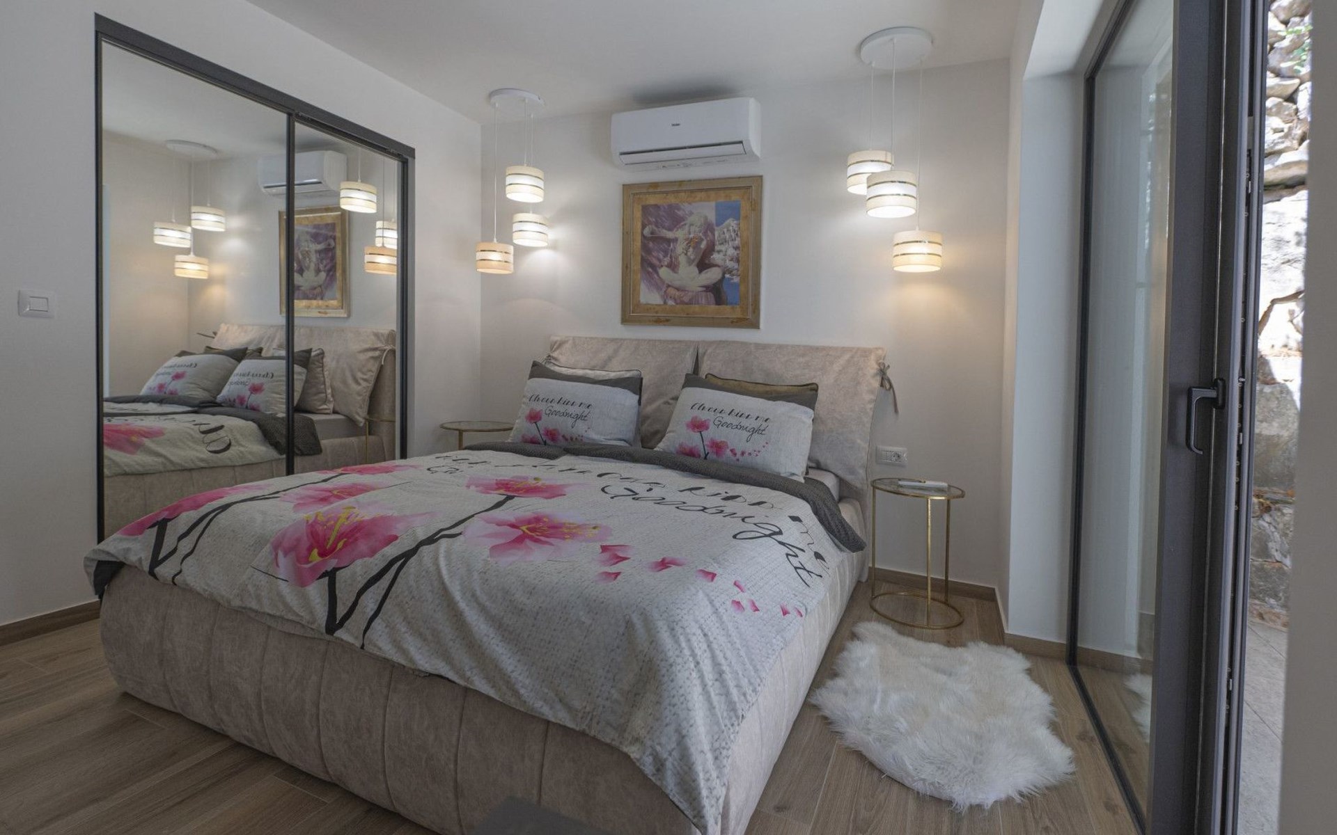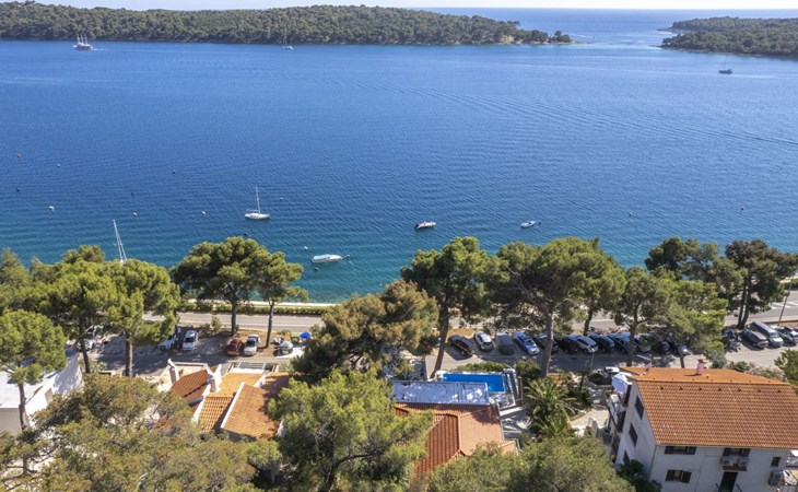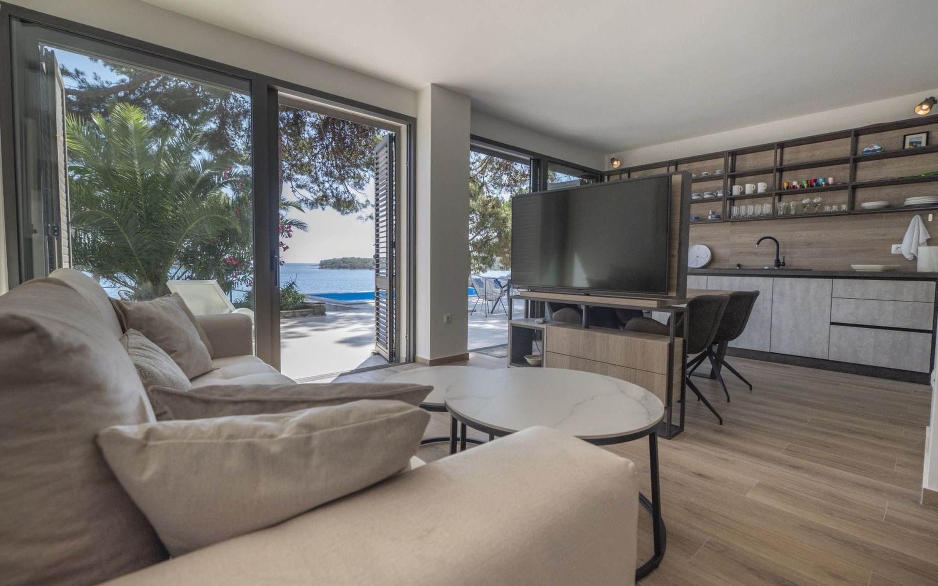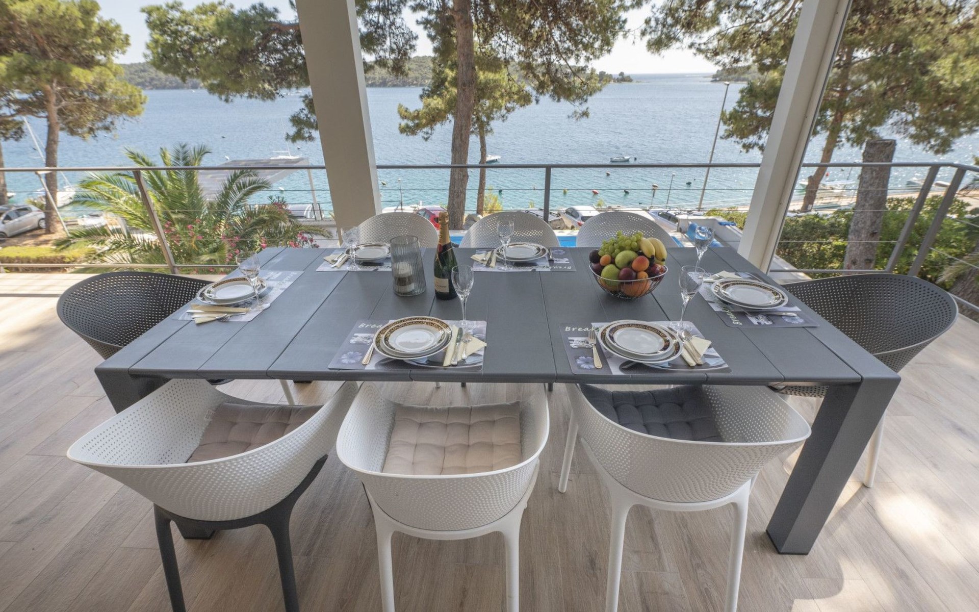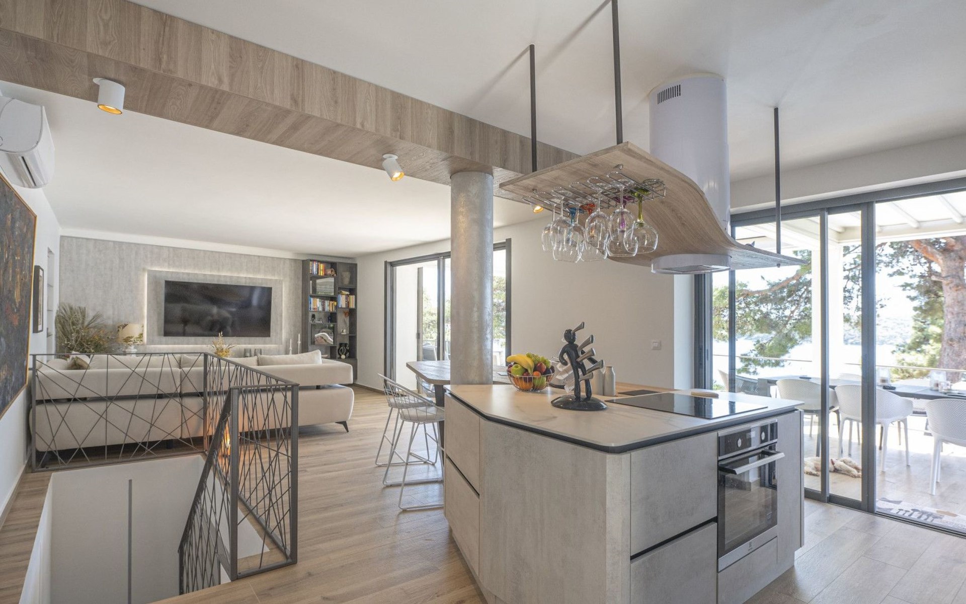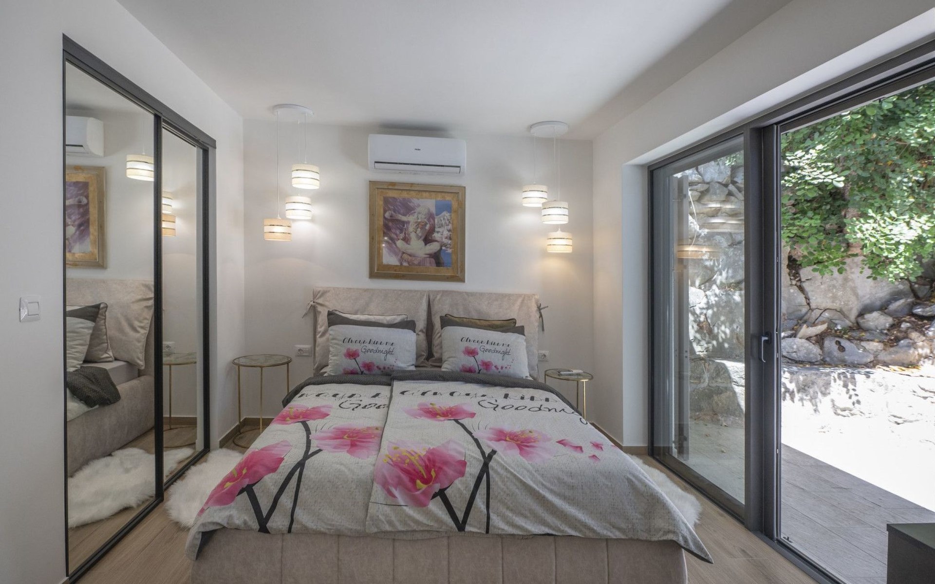 Das Äußere der Villa Hana ist ebenso beeindruckend wie ihr Inneres. Die Villa ist von üppigen Gärten umgeben und verfügt über mehrere Terrassen, von denen jede ihren eigenen Charme hat, sei es zum Faulenzen am privaten beheizten Pool, zum Genießen einer Mahlzeit im Grillbereich oder einfach zum Genießen der Ruhe, die der Außenbereich bietet. Das Vorhandensein einer Garage und von sechs Parkplätzen bietet höchsten Komfort für Gäste mit Fahrzeugen.