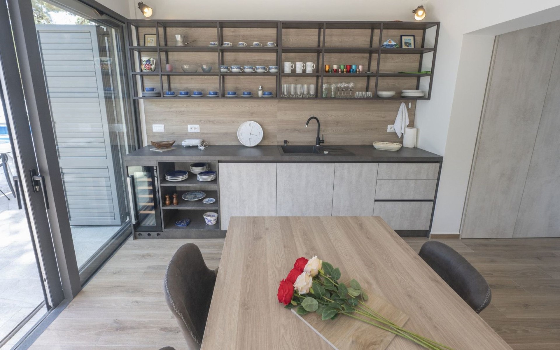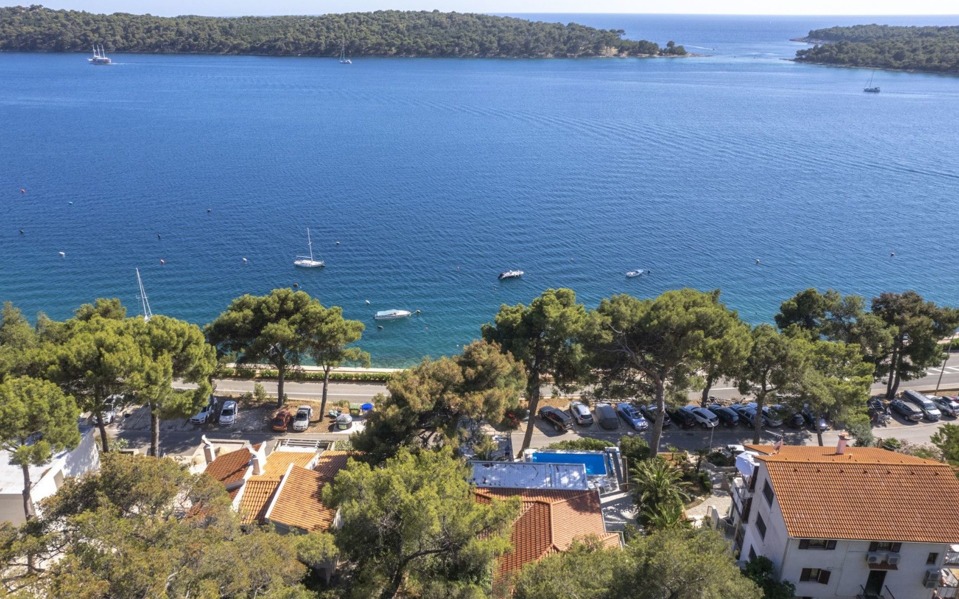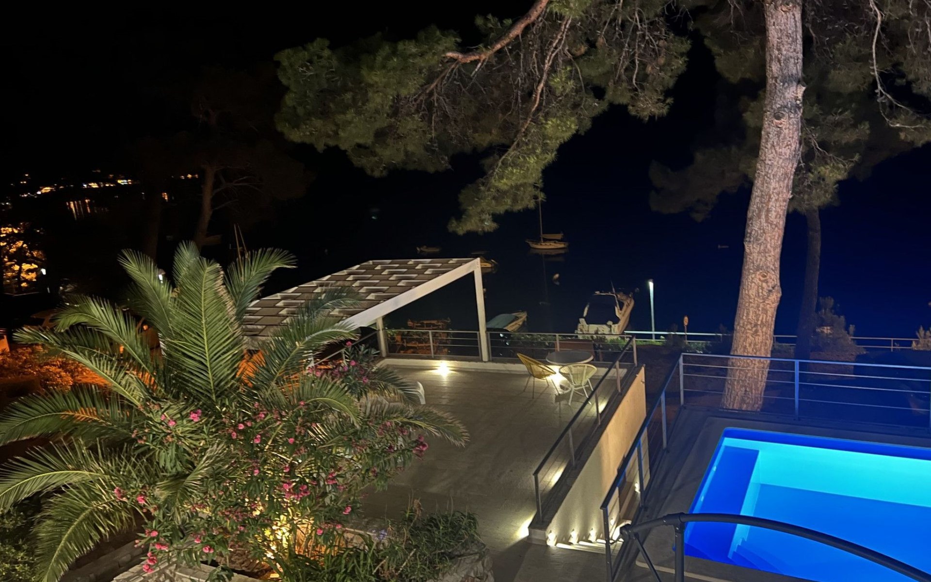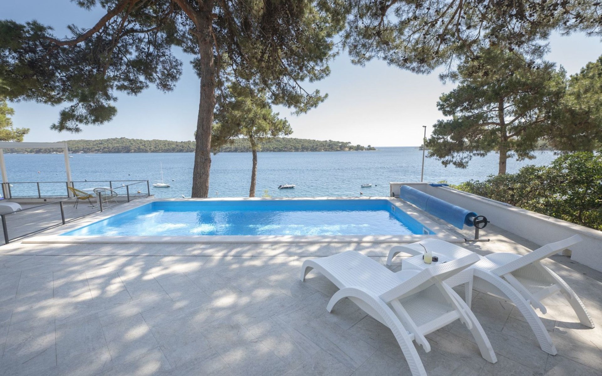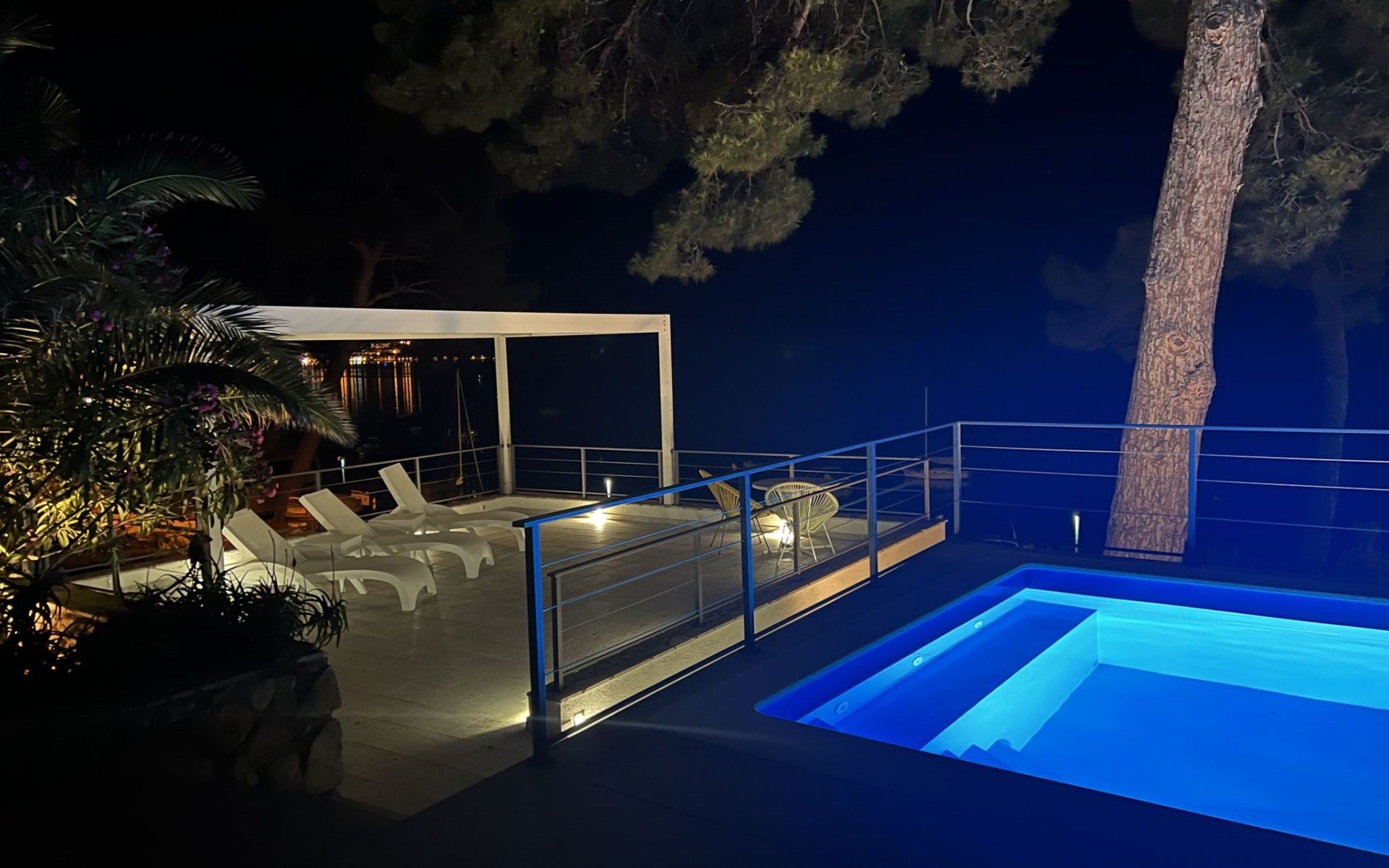 Das Äußere der Villa Hana ist ebenso beeindruckend wie ihr Inneres. Die Villa ist von üppigen Gärten umgeben und verfügt über mehrere Terrassen, von denen jede ihren eigenen Charme hat, sei es zum Faulenzen am privaten beheizten Pool, zum Genießen einer Mahlzeit im Grillbereich oder einfach zum Genießen der Ruhe, die der Außenbereich bietet. Das Vorhandensein einer Garage und von sechs Parkplätzen bietet höchsten Komfort für Gäste mit Fahrzeugen.