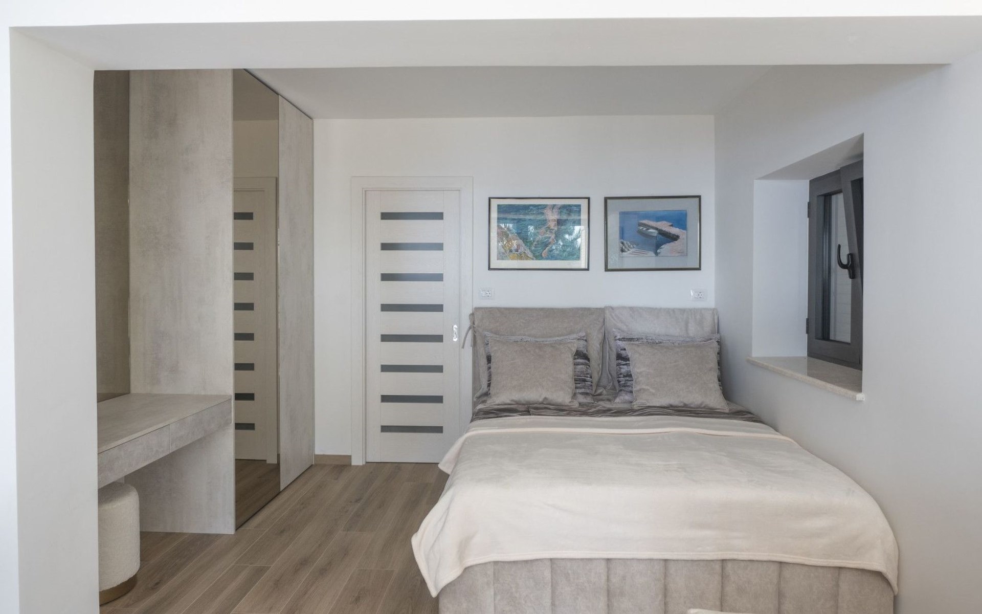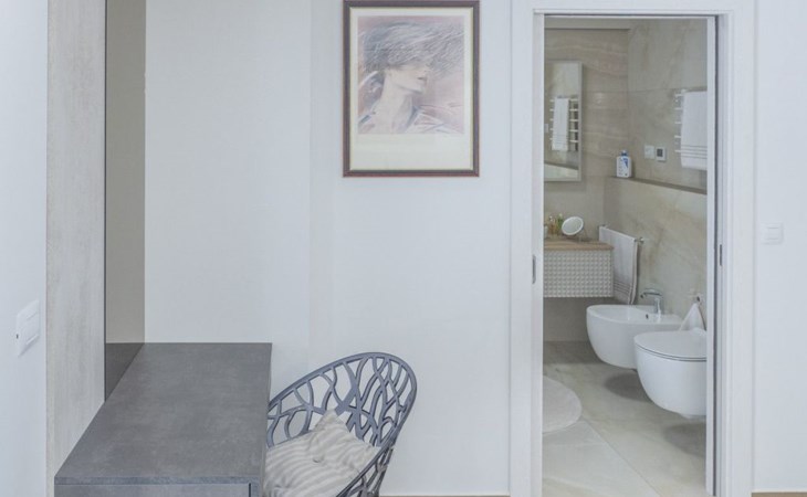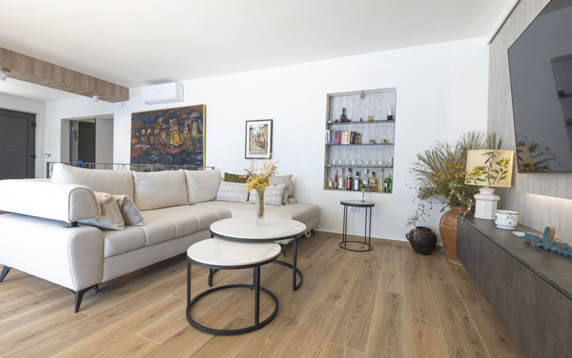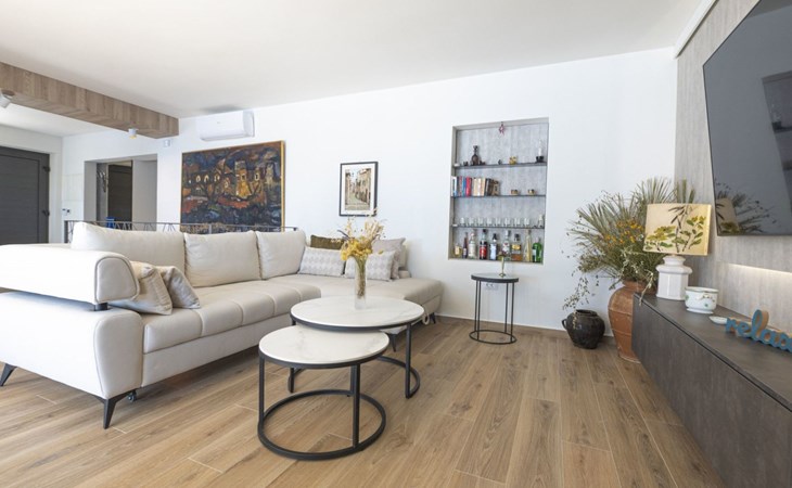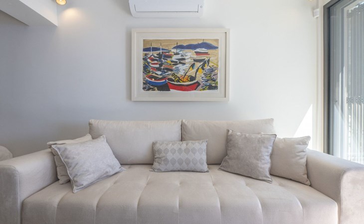 Das Innere der Villa bietet eine harmonische Mischung aus Komfort und Funktionalität, so dass Sie jeden Moment Ihres Aufenthalts genießen können. Jedes der drei geräumigen Schlafzimmer ist mit einem eigenen Bad, einer Klimaanlage, einer Fußbodenheizung und einem Schreibtisch ausgestattet, so dass Sie sich sowohl erholen als auch produktiv sein können. Der zusammenhängende Wohnbereich mit einer Küche, die mit modernen Geräten wie einem Geschirrspüler, einem Wasserkocher und einer Kaffeemaschine ausgestattet ist, geht nahtlos in ein einladendes Wohnzimmer über. Der Raum öffnet sich zu einer großen Terrasse, die den Wohnbereich ins Freie erweitert und sich perfekt für Versammlungen oder ruhige Kontemplation eignet.
