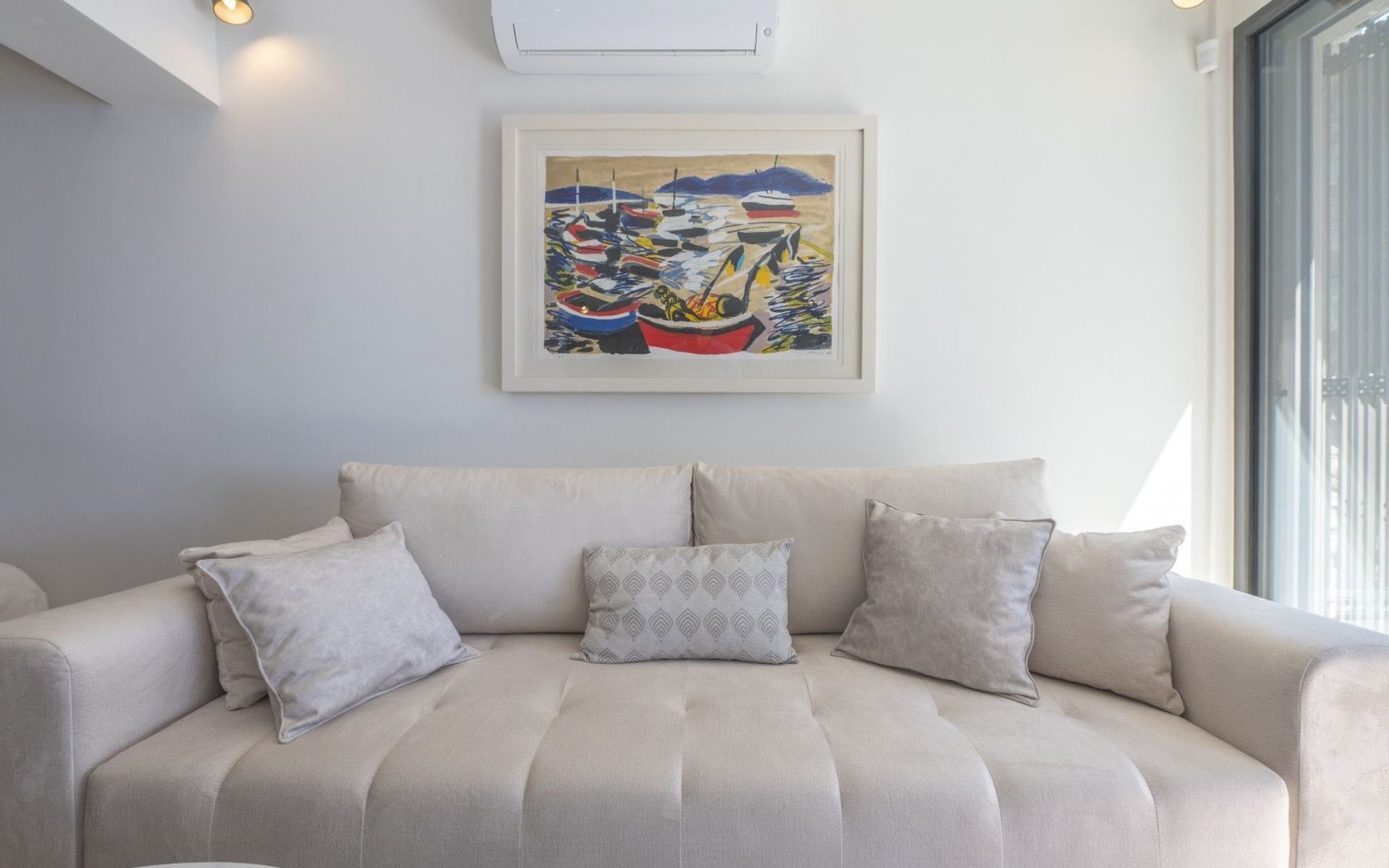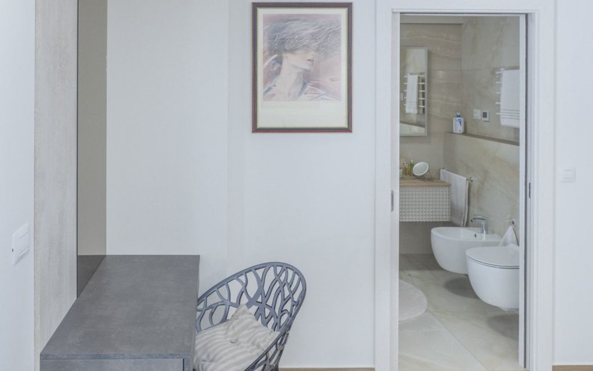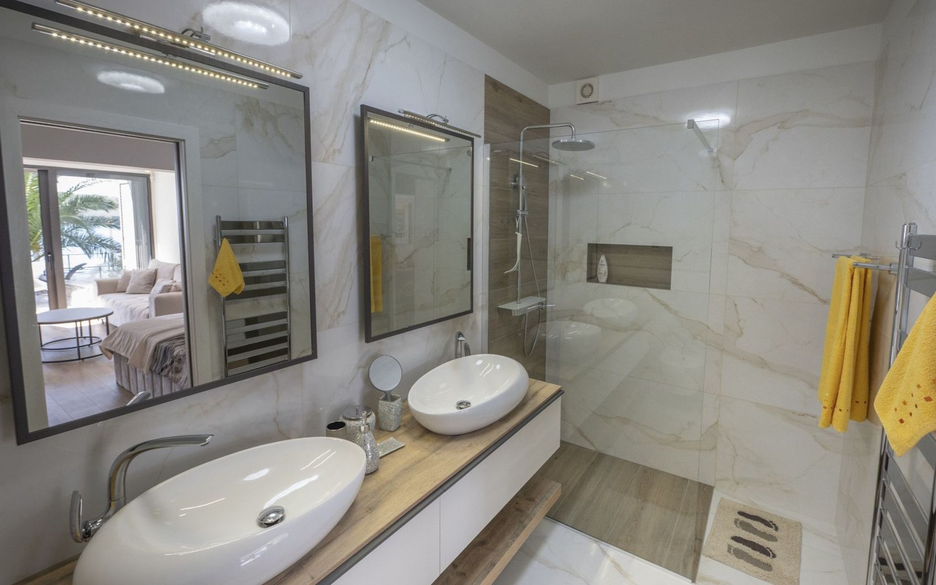Das Innere der Villa bietet eine harmonische Mischung aus Komfort und Funktionalität, so dass Sie jeden Moment Ihres Aufenthalts genießen können. Jedes der drei geräumigen Schlafzimmer ist mit einem eigenen Bad, einer Klimaanlage, einer Fußbodenheizung und einem Schreibtisch ausgestattet, so dass Sie sich sowohl erholen als auch produktiv sein können. Der zusammenhängende Wohnbereich mit einer Küche, die mit modernen Geräten wie einem Geschirrspüler, einem Wasserkocher und einer Kaffeemaschine ausgestattet ist, geht nahtlos in ein einladendes Wohnzimmer über. Der Raum öffnet sich zu einer großen Terrasse, die den Wohnbereich ins Freie erweitert und sich perfekt für Versammlungen oder ruhige Kontemplation eignet.