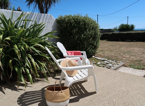 Es gibt eine große, eigene Terrasse. Gartenmöbel, Sonnenschirm und ein Grill sind vorhanden. Hier kann man gemütlich sitzen und grillen oder abends ein Glas Wein trinken.
