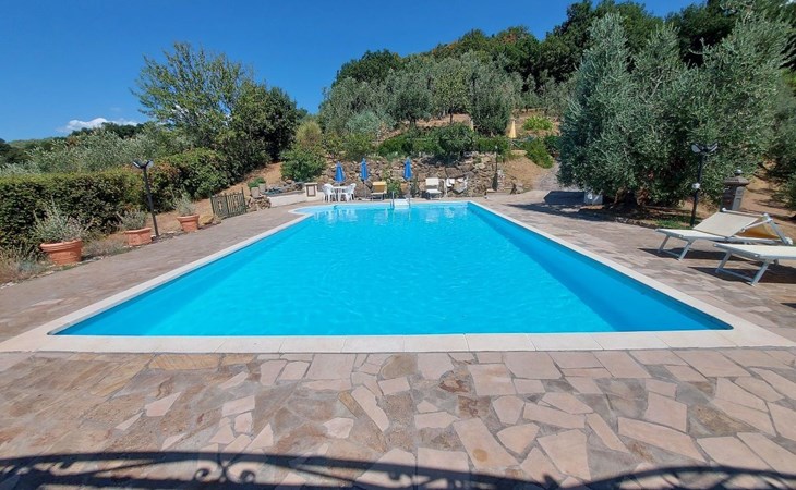 Auf der Rückseite des Ferienhauses, in erhöhter Lage, befindet sich ein 6 x 12 m großer Swimmingpool mit einer Tiefe von 1,20 bis 2,10 m, der über eine Steintreppe oder über zwei getrennte Wege erreichbar ist. Der Pool des Agriturismo ist mit einer Kalt- und Warmwasserdusche, einem großen, von Pflanzen und Blumen umgebenen Beckenrand und einem großen Pavillon mit Entspannungsbereichen ausgestattet, der mit Geräten versehen ist, um den Ort bis zum Sonnenuntergang voll und ganz genießen zu können.