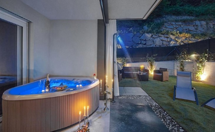 Der Außenbereich mit Blick auf den privaten Garten besteht aus einer Außenküche, einem Barbereich, einem Tisch für 5/6 Personen, einer finnischen Sauna, einem Whirlpool und einer Außendusche.