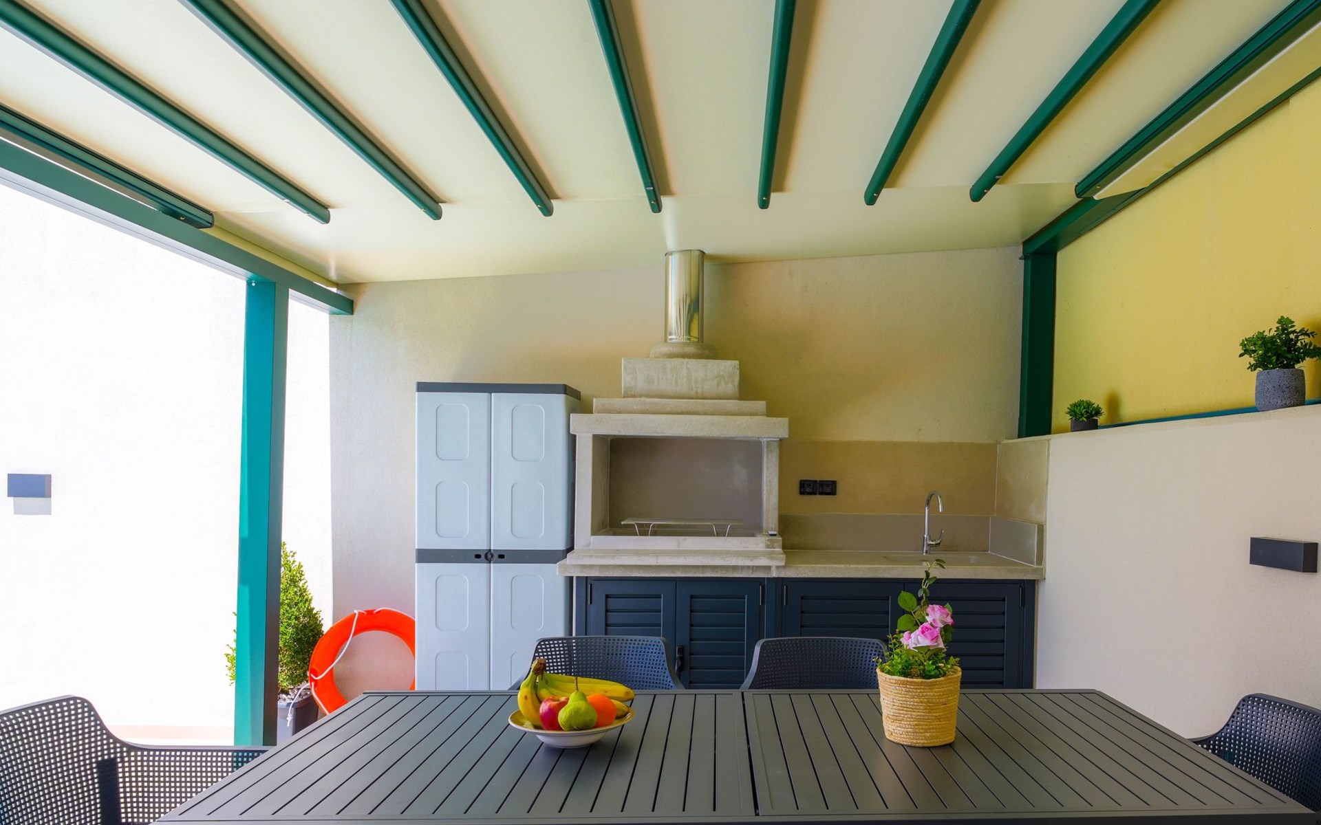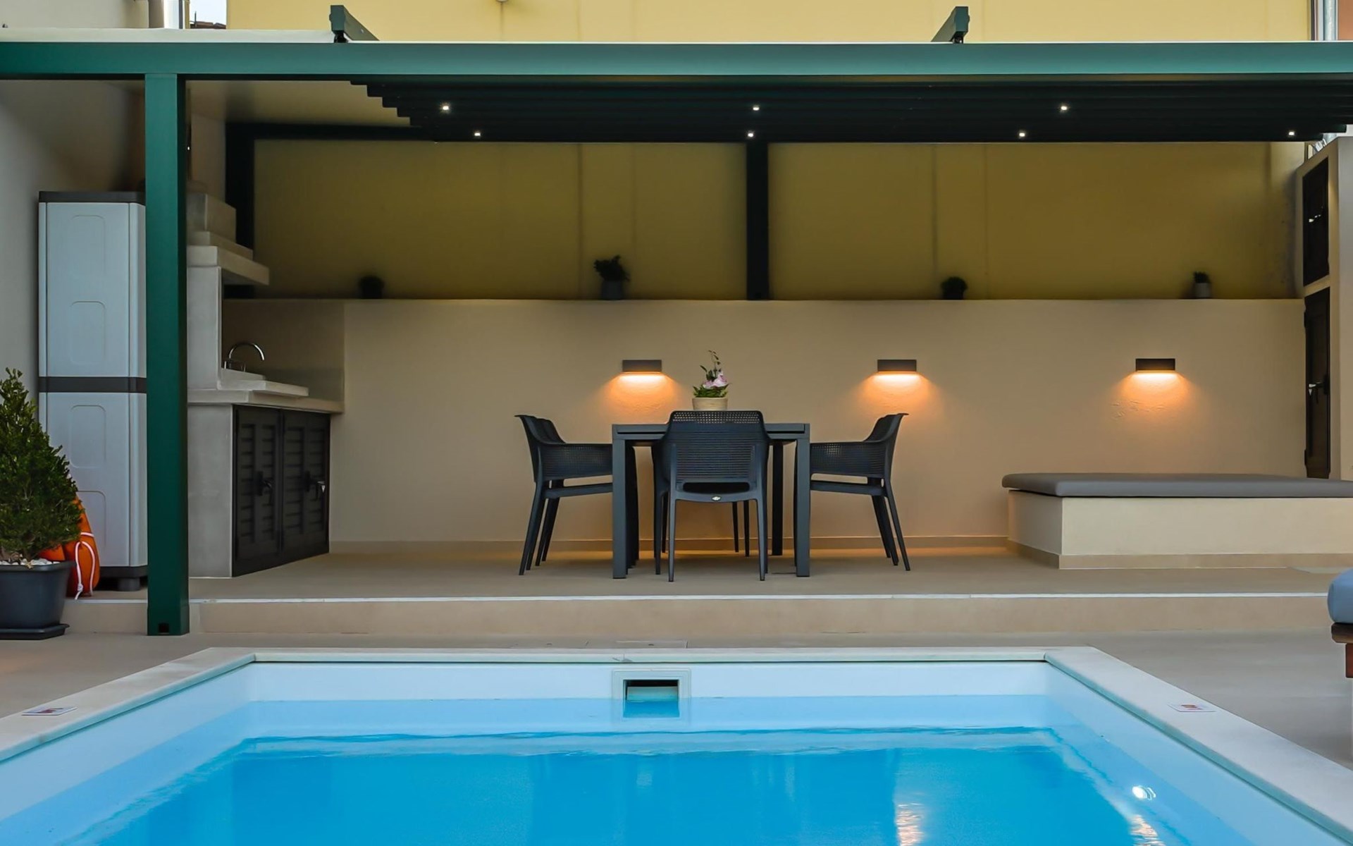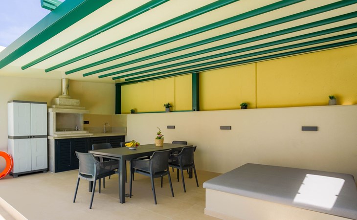 Gehen Sie hinaus in den geräumigen privaten Innenhof, wo Sie sich entspannen und unterhalten können. Eine Pergola bietet schattigen Komfort, und ein Tisch mit Stühlen lädt zum Essen im Freien ein. Der Grillplatz ist perfekt für unvergessliche Sommerfeste. Ob Sie im erfrischenden Wasser des Pools schwimmen, eine Mahlzeit unter dem Sternenhimmel genießen oder einfach nur in der Sonne faulenzen, die Außenanlagen sind so gestaltet, dass sich jeder Moment Ihres Urlaubs wie ein Stück vom Paradies anfühlt.