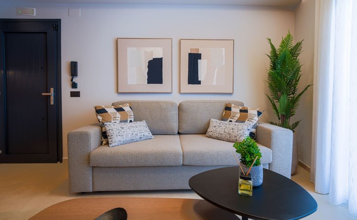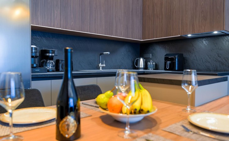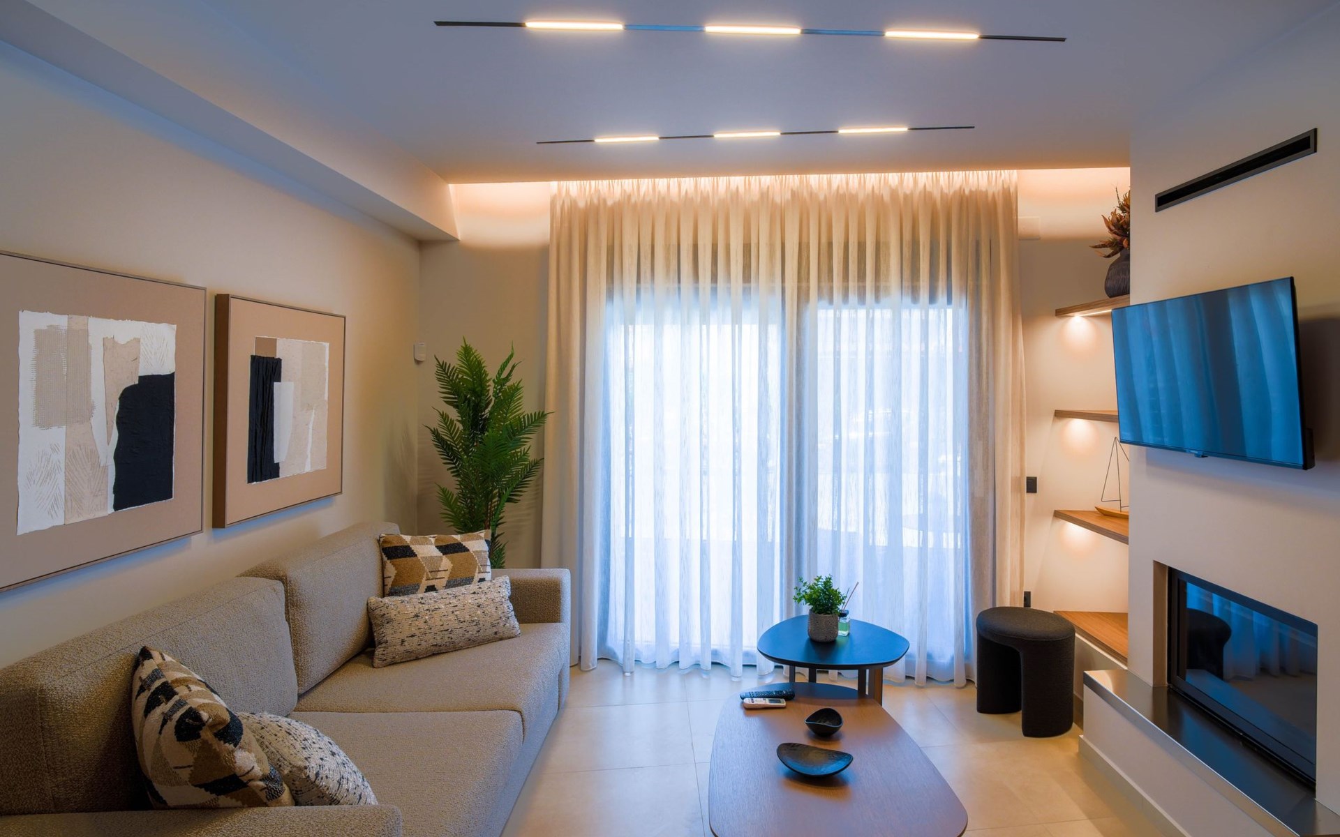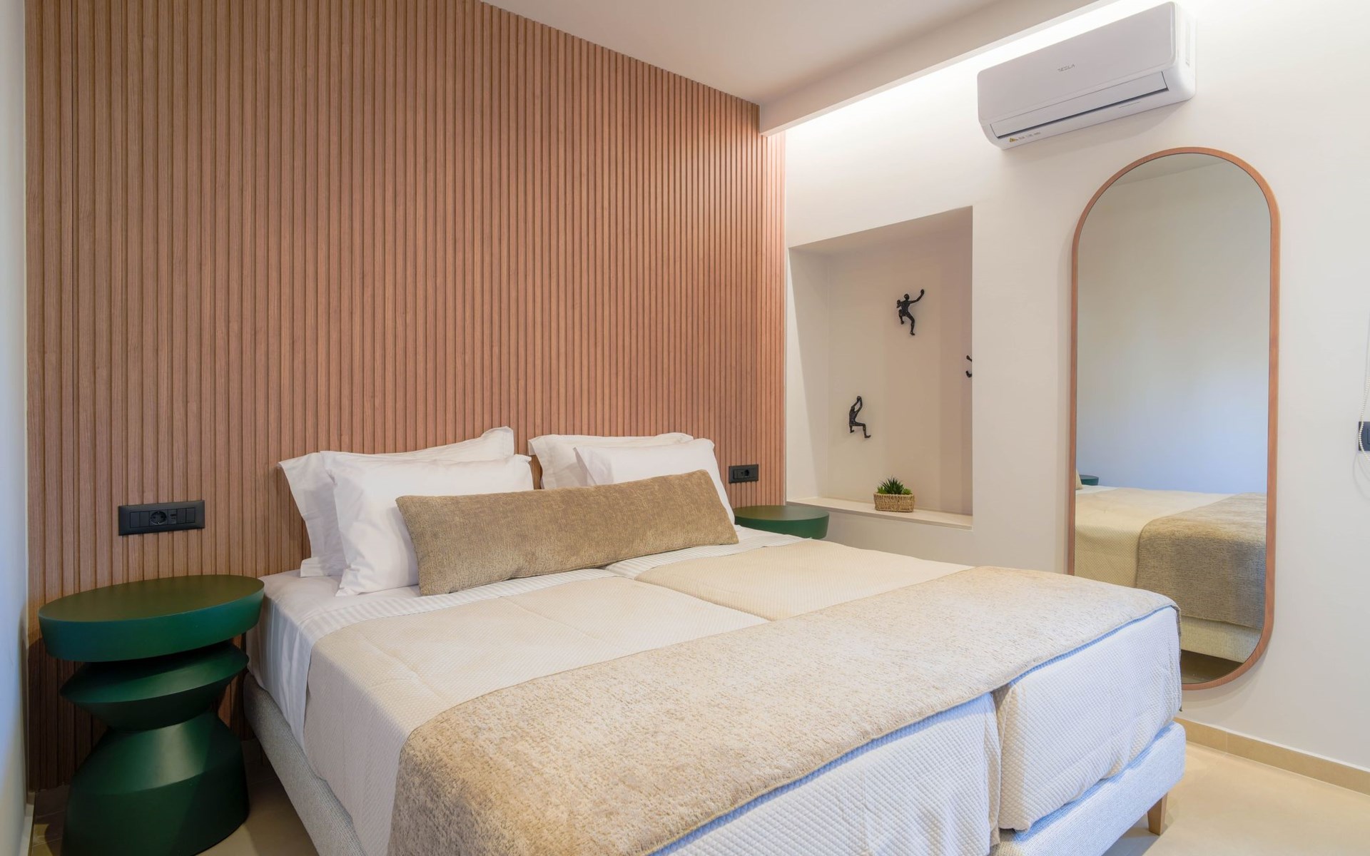 Das Innere dieses Ferienparadieses ist auf Entspannung und Komfort ausgelegt. Es verfügt über zwei gut ausgestattete Schlafzimmer, jedes mit einem Kingsize-Bett (die Betten in einem Zimmer können auf Wunsch in zwei Einzelbetten aufgeteilt werden), Kleiderschränke mit zusätzlichen Kissen, Klimaanlage und Fernseher für Ihre Unterhaltung. Das Wohnzimmer verfügt über viel Tageslicht, ein großes Sofa, das auch als Doppelbett genutzt werden kann, einen gemütlichen Kamin und einen modernen Esstisch mit 6 Plätzen. Die voll ausgestattete Küche lässt keine kulinarischen Wünsche offen: Kühlschrank, Backofen, Herd, Geschirrspüler, Nespresso-Maschine, Kaffeefiltermaschine, Toaster, Wasserkocher und vieles mehr sorgen für einen angenehmen Aufenthalt.