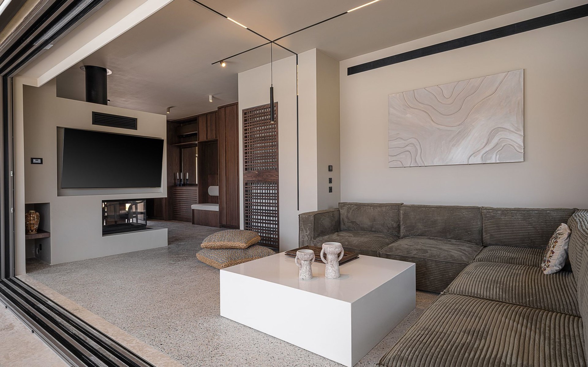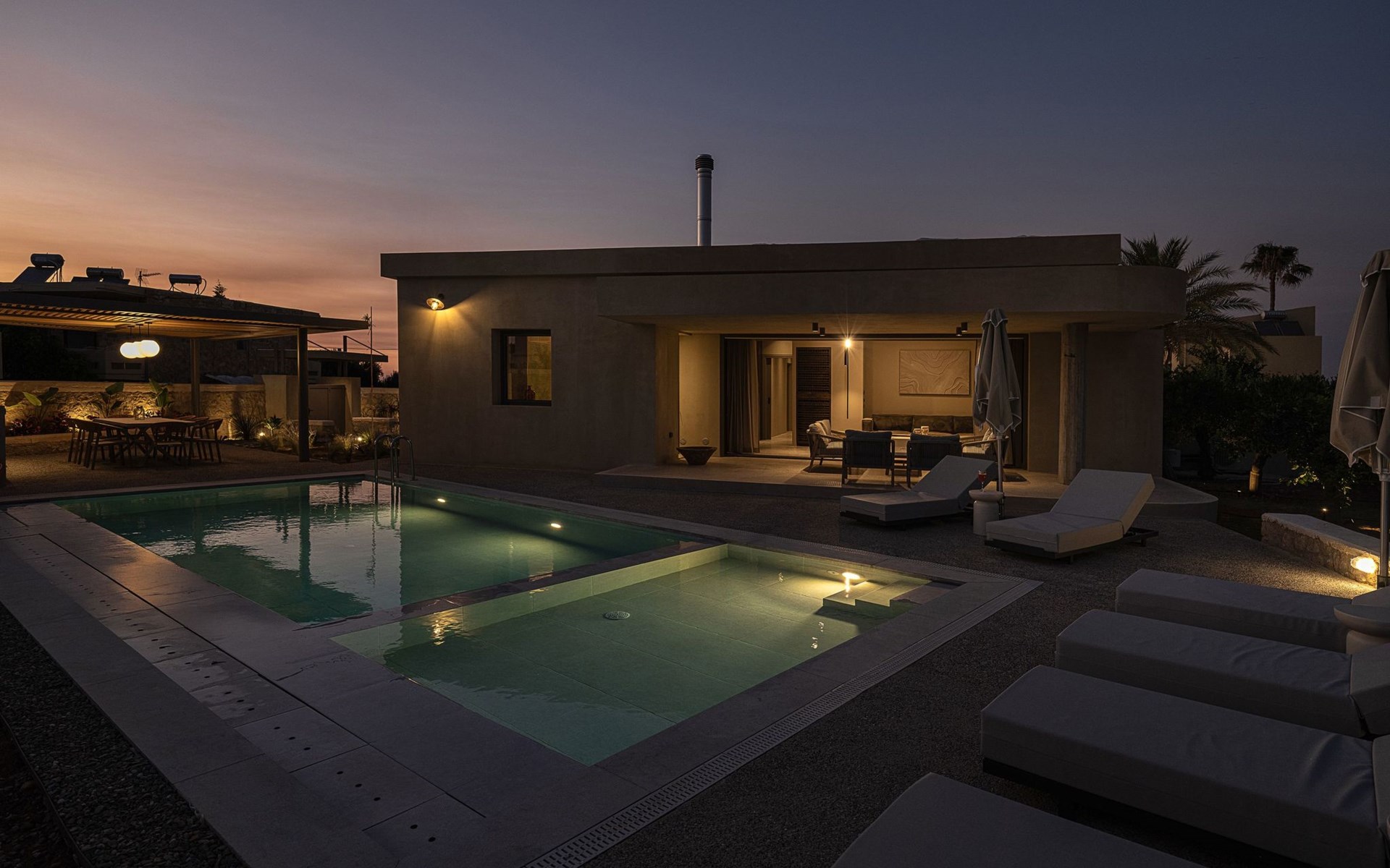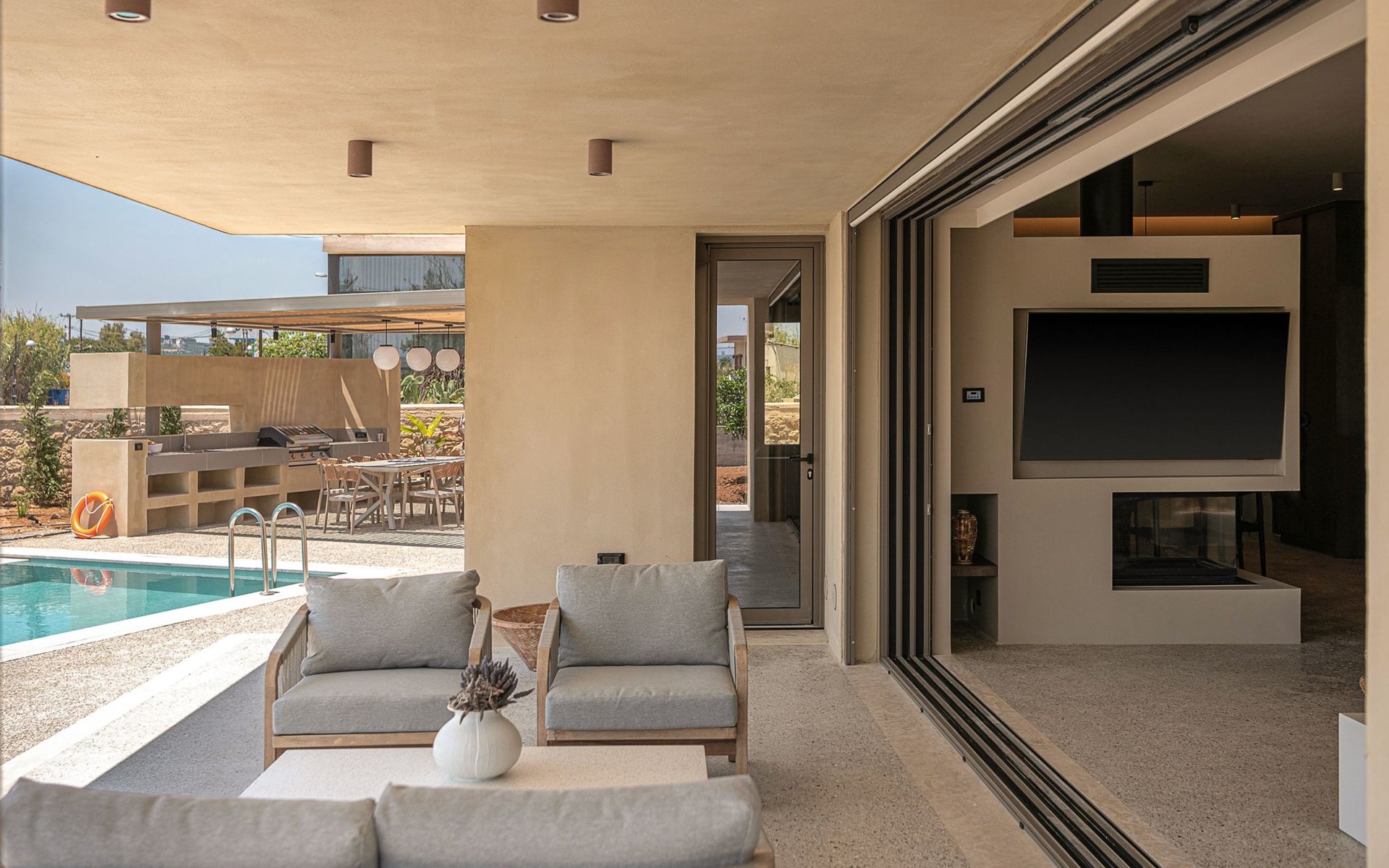 Die voll ausgestattete Küche verfügt über einen Backofen, einen Herd, einen Geschirrspüler, eine Espressomaschine, einen Toaster und alles, was Sie für langsame, gemütliche Mahlzeiten benötigen. Versammeln Sie sich um den Esstisch im Innenbereich für 6-8 Personen oder gehen Sie nach draußen, um unter dem Sternenhimmel zu speisen.WohnbereichWarm und minimalistisch lädt das Wohnzimmer zum Entspannen ein. Mit einem eleganten Kamin, einer gemütlichen Sofaecke, Loungesesseln, einem Fernseher und freiem Blick auf den Pool ist es der perfekte Ort, um sich zu erholen und zu entspannen.