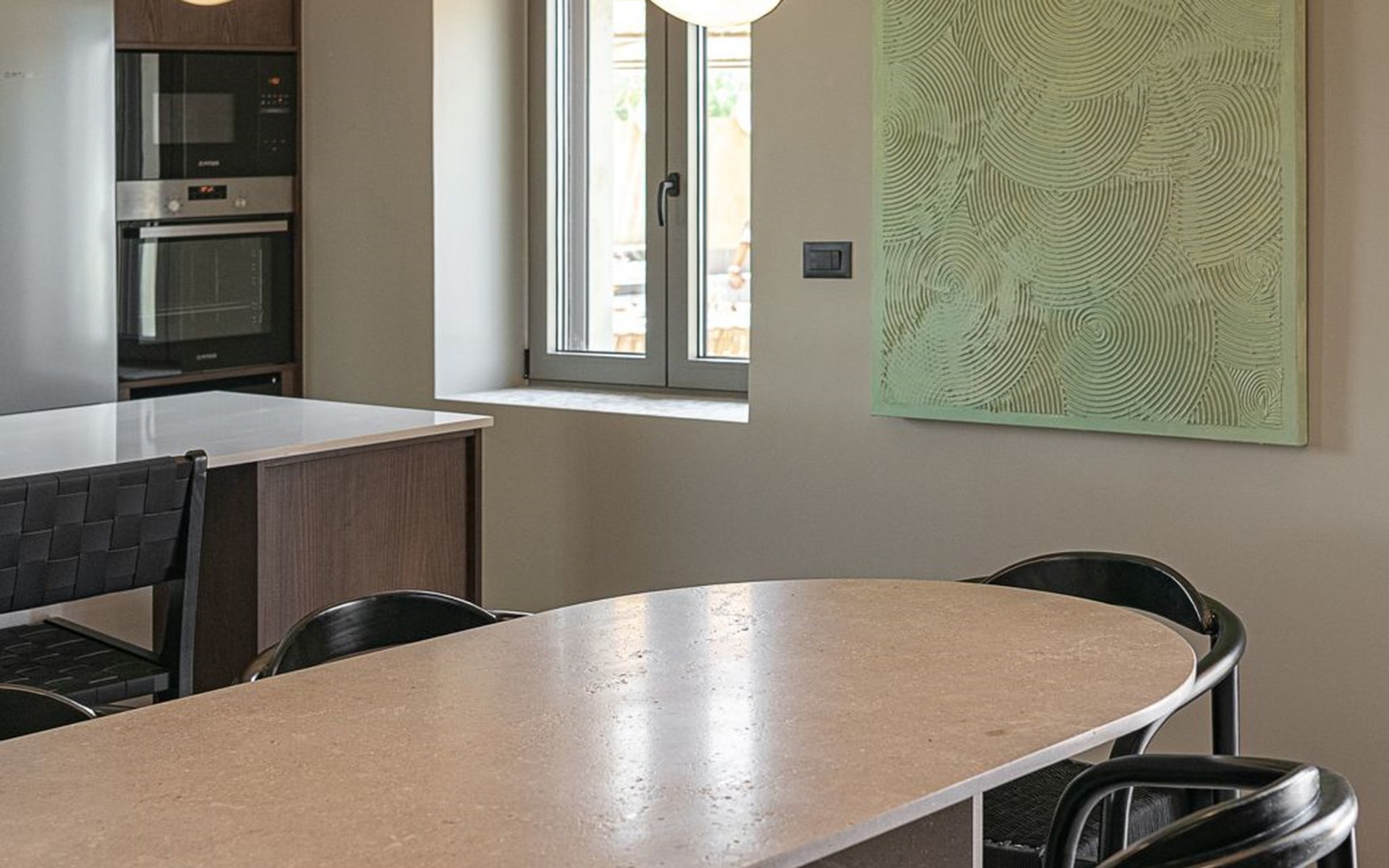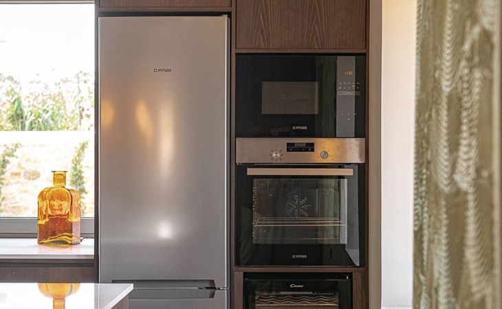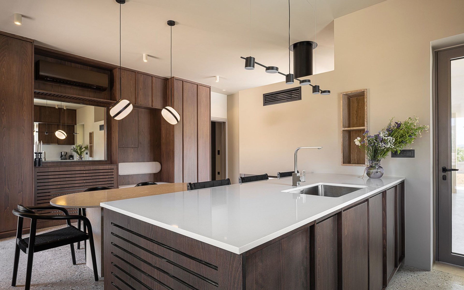 Die voll ausgestattete Küche verfügt über einen Backofen, einen Herd, einen Geschirrspüler, eine Espressomaschine, einen Toaster und alles, was Sie für langsame, gemütliche Mahlzeiten benötigen. Versammeln Sie sich um den Esstisch im Innenbereich für 6-8 Personen oder gehen Sie nach draußen, um unter dem Sternenhimmel zu speisen.WohnbereichWarm und minimalistisch lädt das Wohnzimmer zum Entspannen ein. Mit einem eleganten Kamin, einer gemütlichen Sofaecke, Loungesesseln, einem Fernseher und freiem Blick auf den Pool ist es der perfekte Ort, um sich zu erholen und zu entspannen.