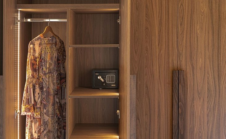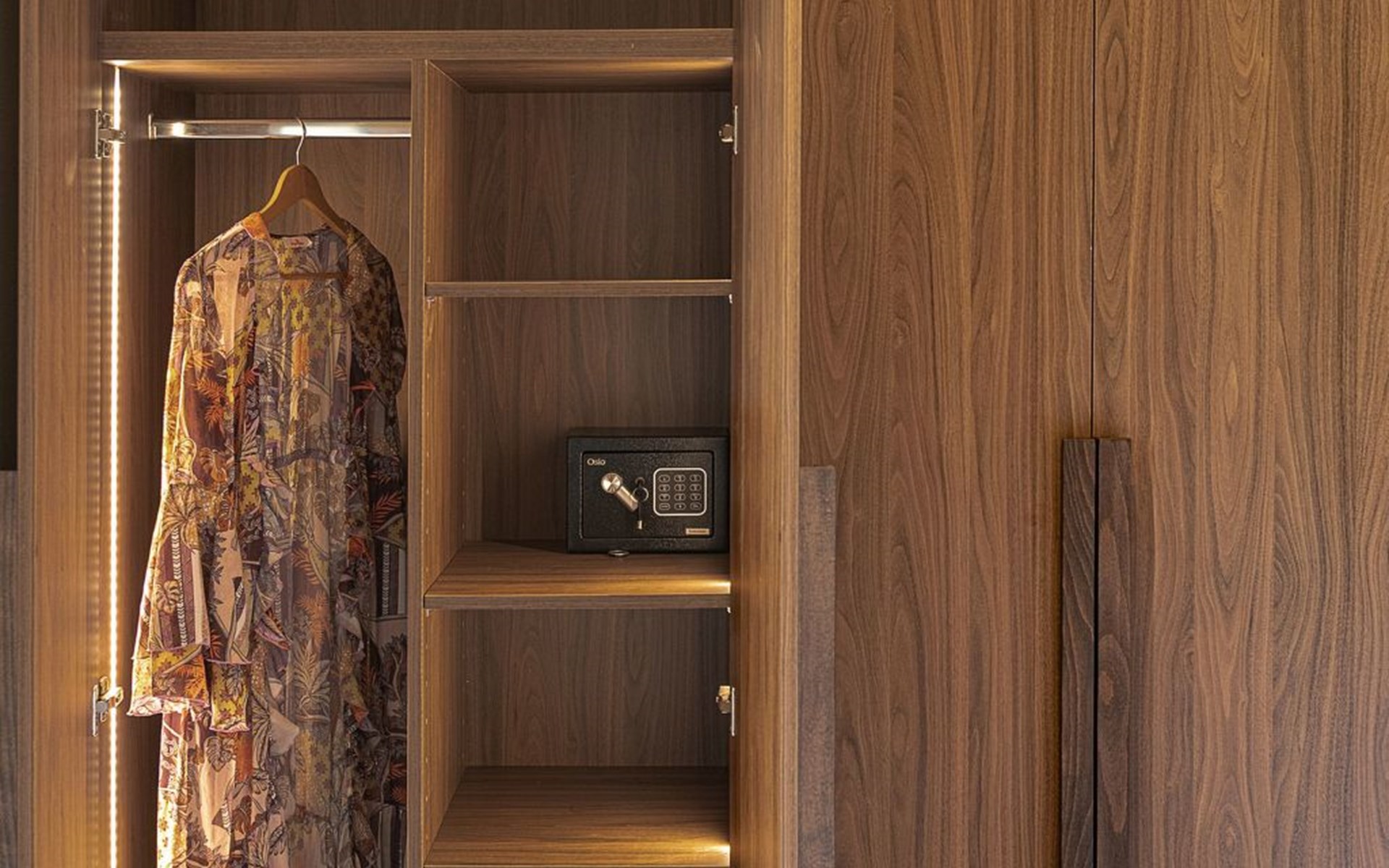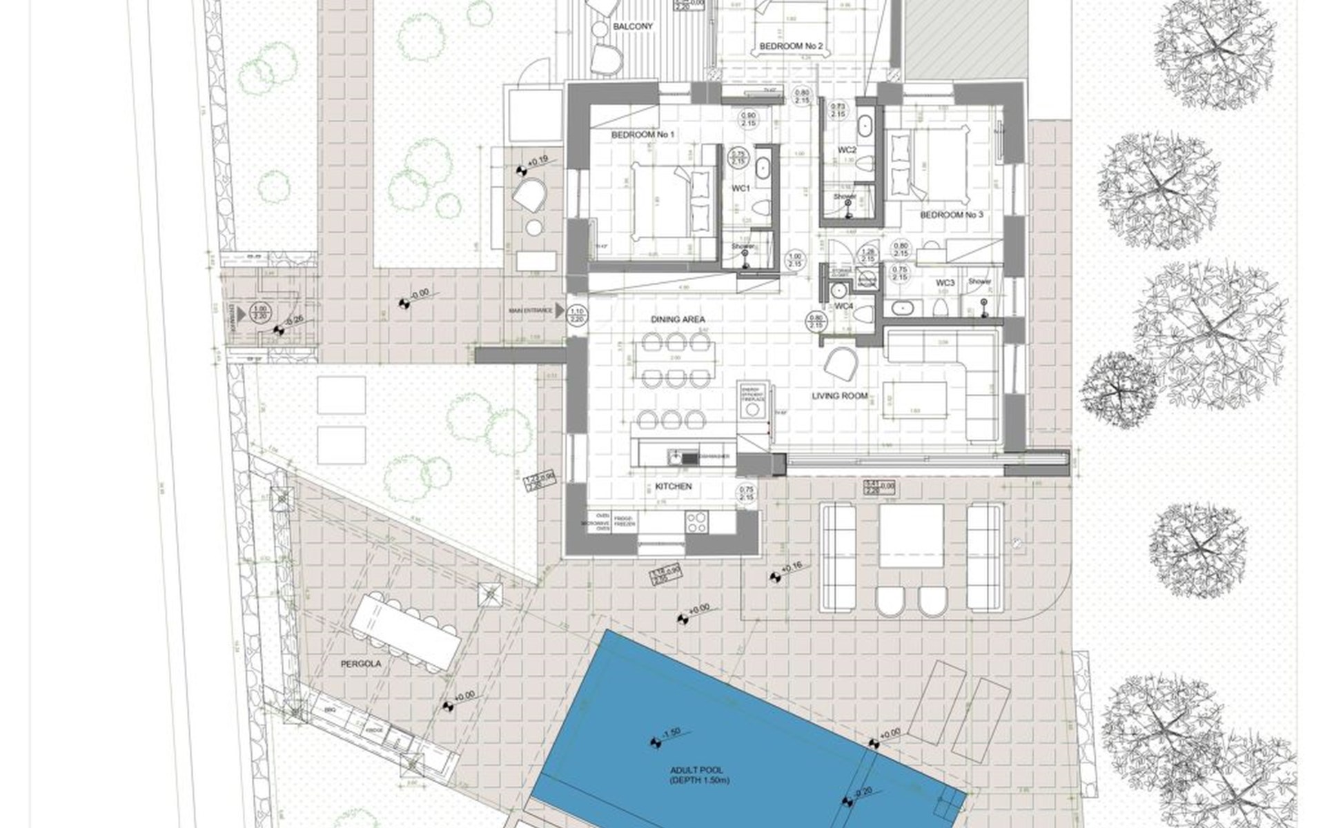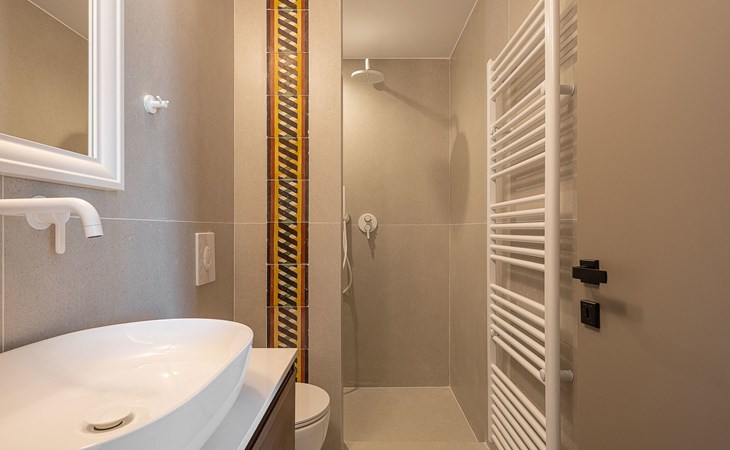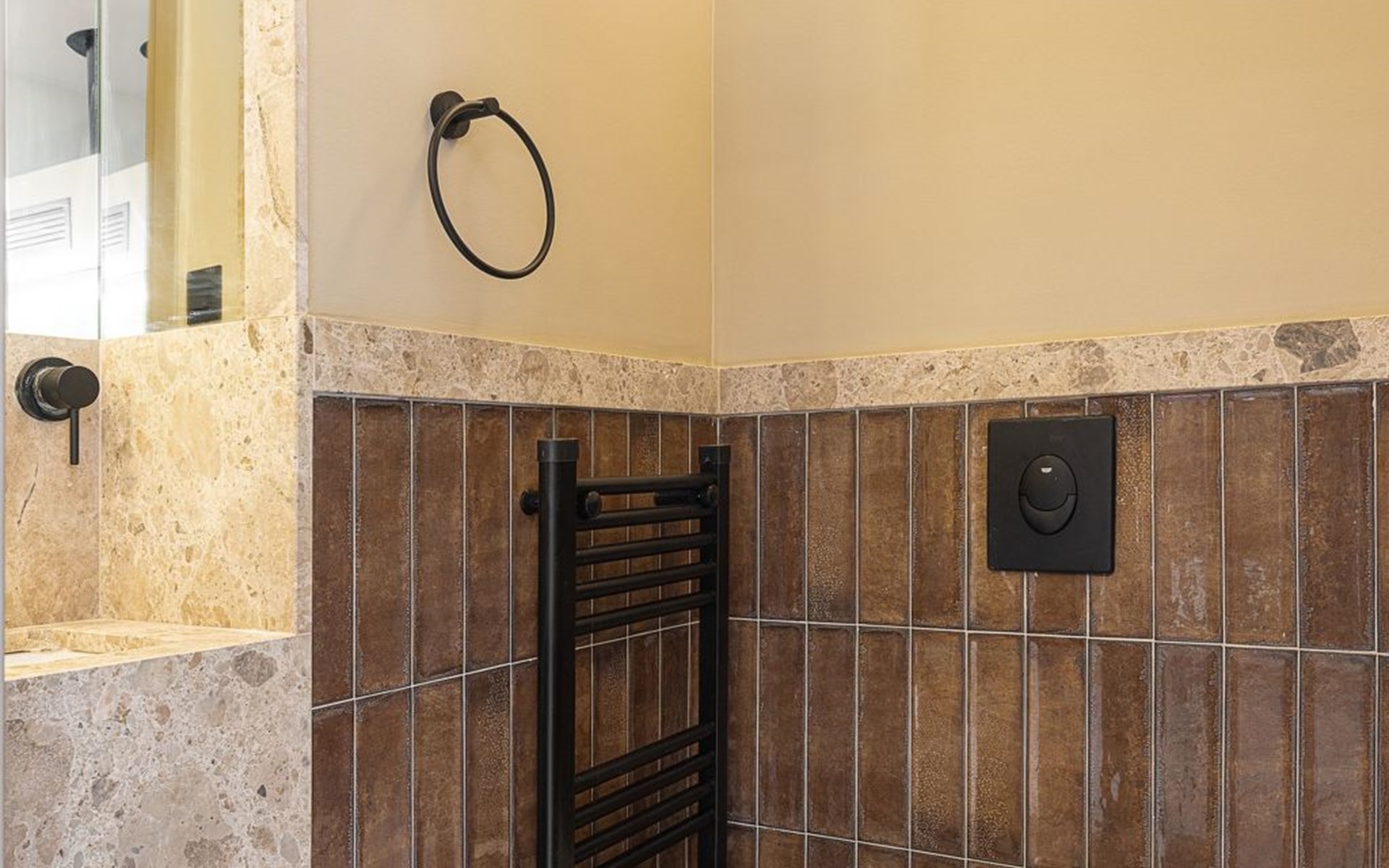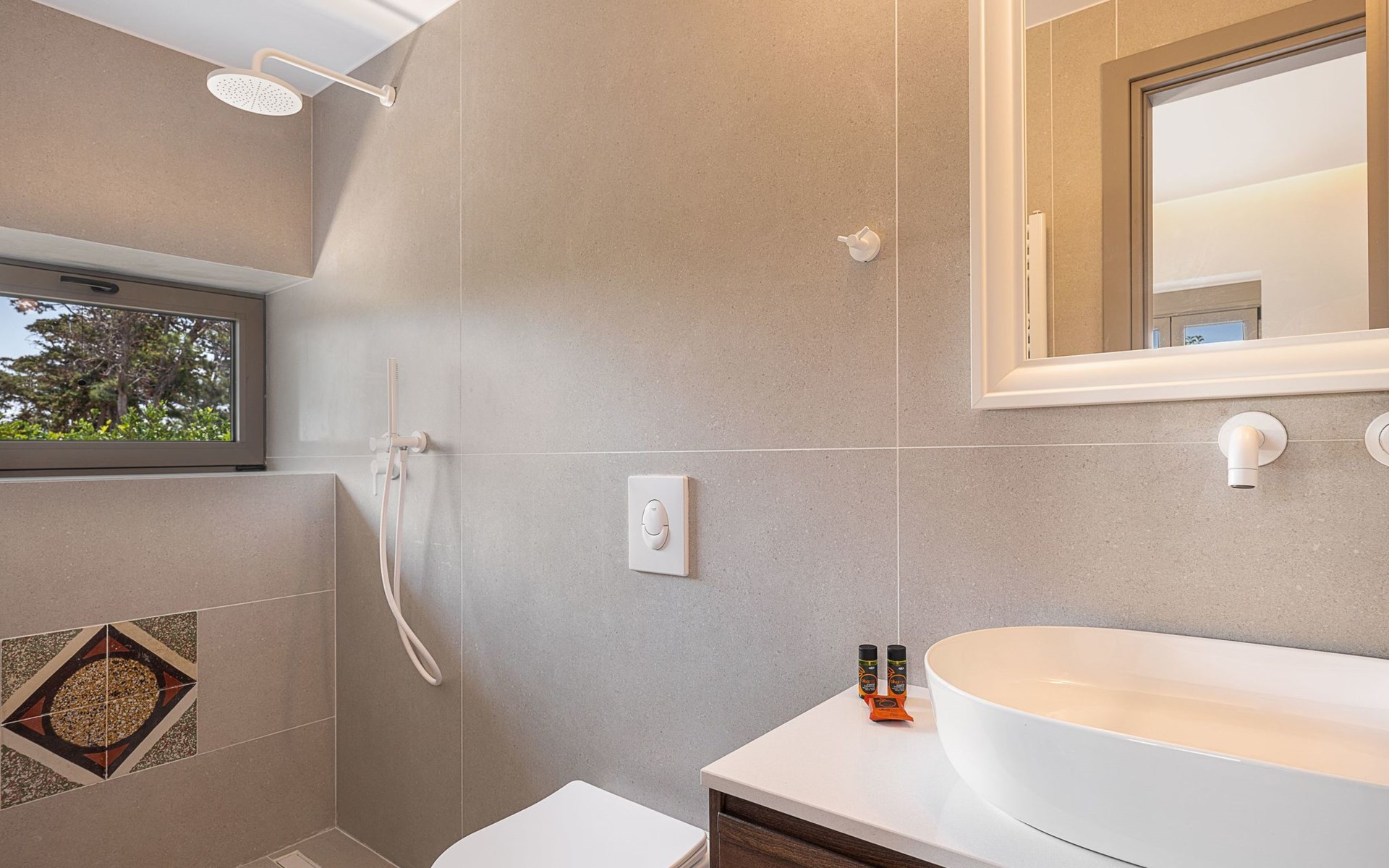 Alle Bäder sind mit begehbaren Regenduschen, eleganten Waschbecken und moderner Beleuchtung ausgestattet. Ein separates Gäste-WC ist ebenfalls in der Nähe des Wohnbereichs vorhanden.