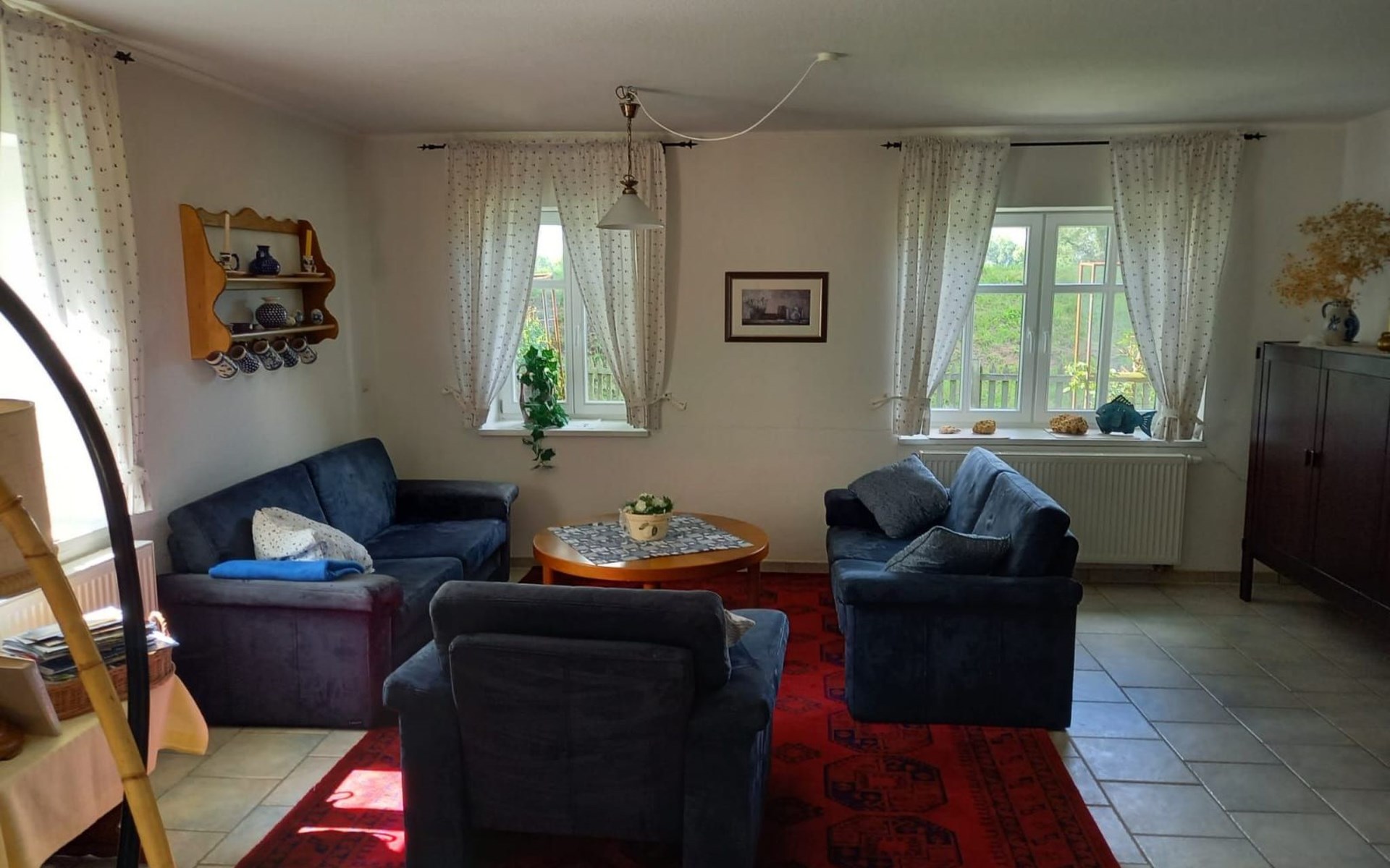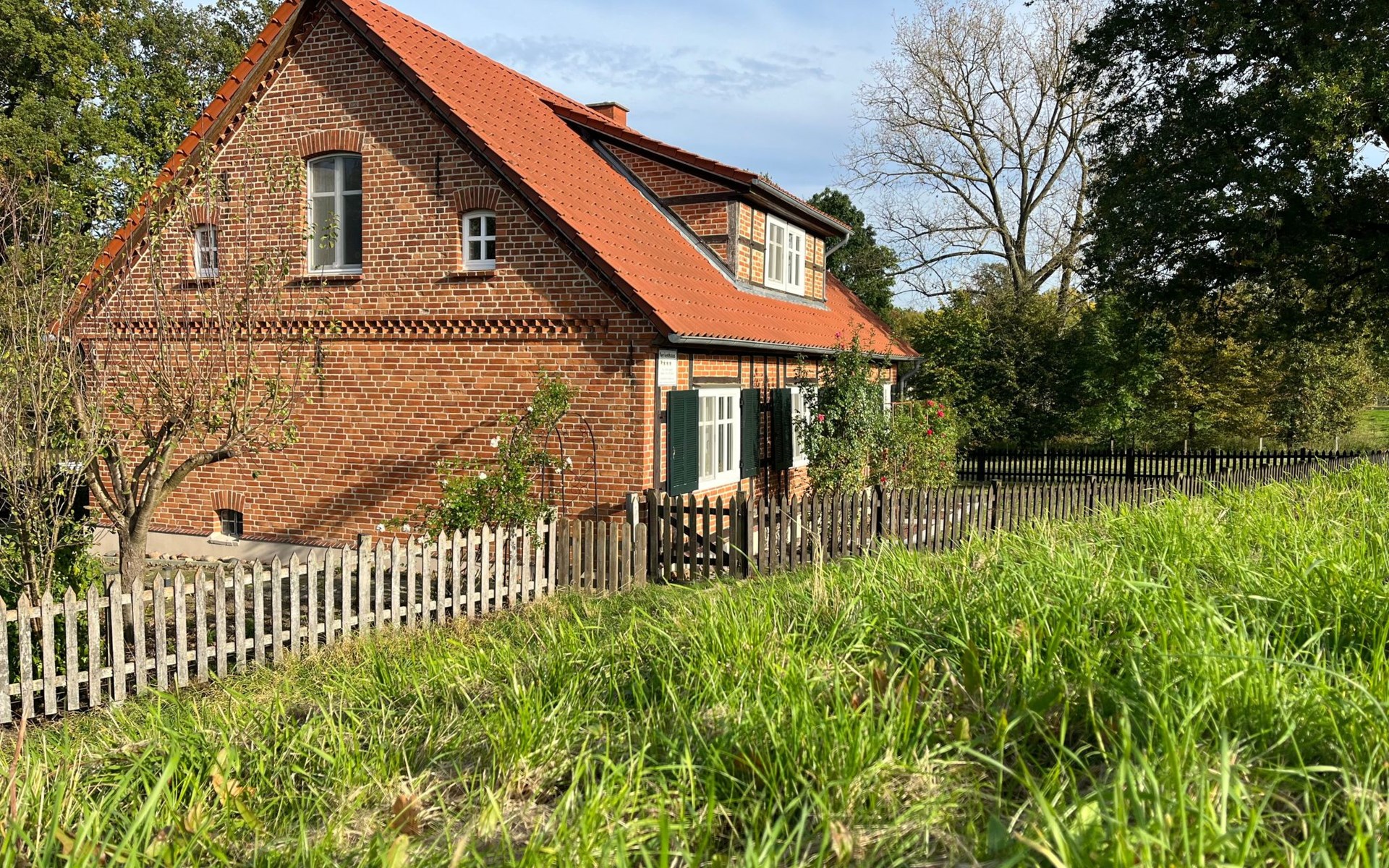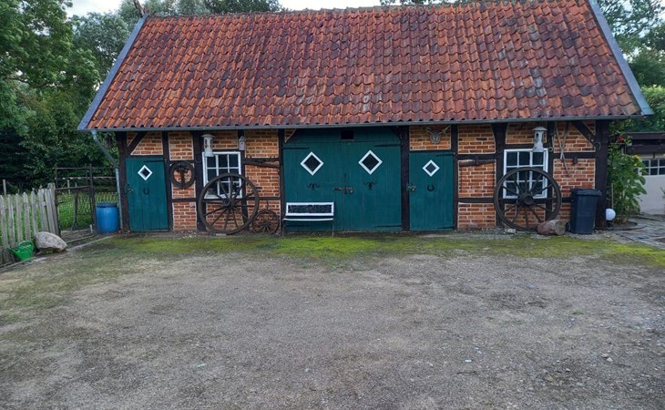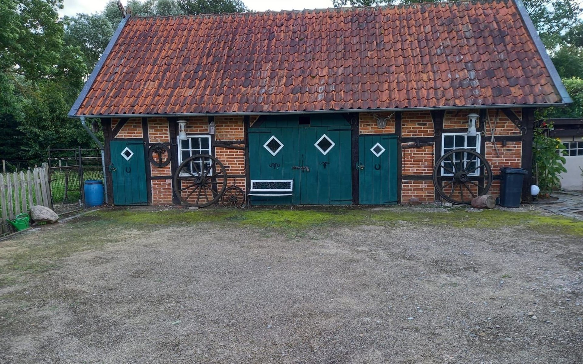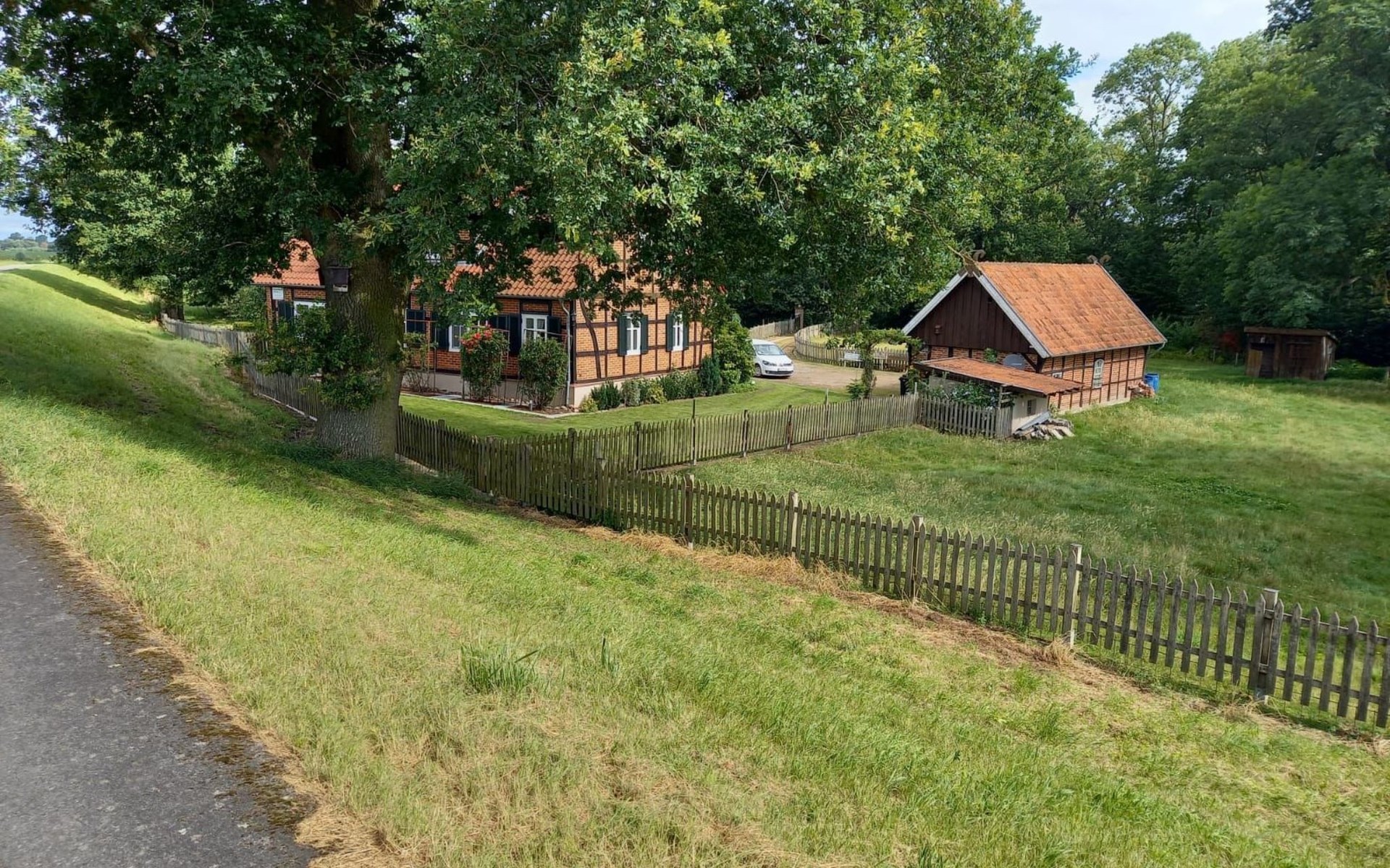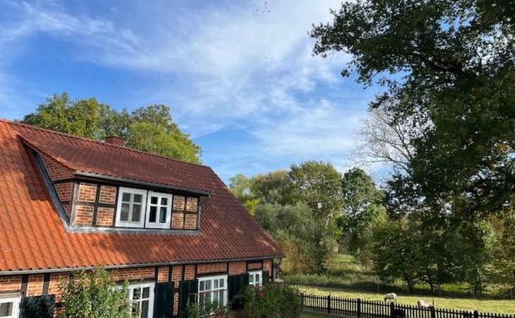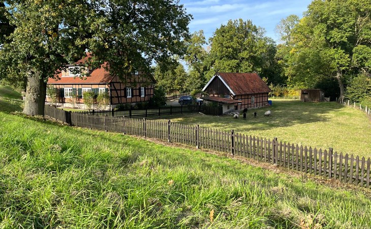 Die kleine Terrasse ist mit Gartenmöbeln und Sonnenschirm ausgestattet. Kinder spielen im umzäunten Hof mit grosser Rasenfläche gefahrlos. Hunde können frei laufen. Die Gatter mit den Ziegen und Schafen bitte geschlossen halten,die Tiere werden von einem Nachbarn artgerecht gefüttert und versorgt. Aus dem umzäunten Gartenbereich führt ein Tor direkt auf den Deich mit Bank zum Verweilen und um den Sonnenuntergang und die abendlichen Flüge der Vögel und Gänse mit dem hauseigenen Fernglas zu beobachten, oder einen Spaziergang in der Abendsonne zu unternehmen.Dort beginnen Sie auch Ihre Fahrradtouren Richtung Dömitz oder Lenzen.