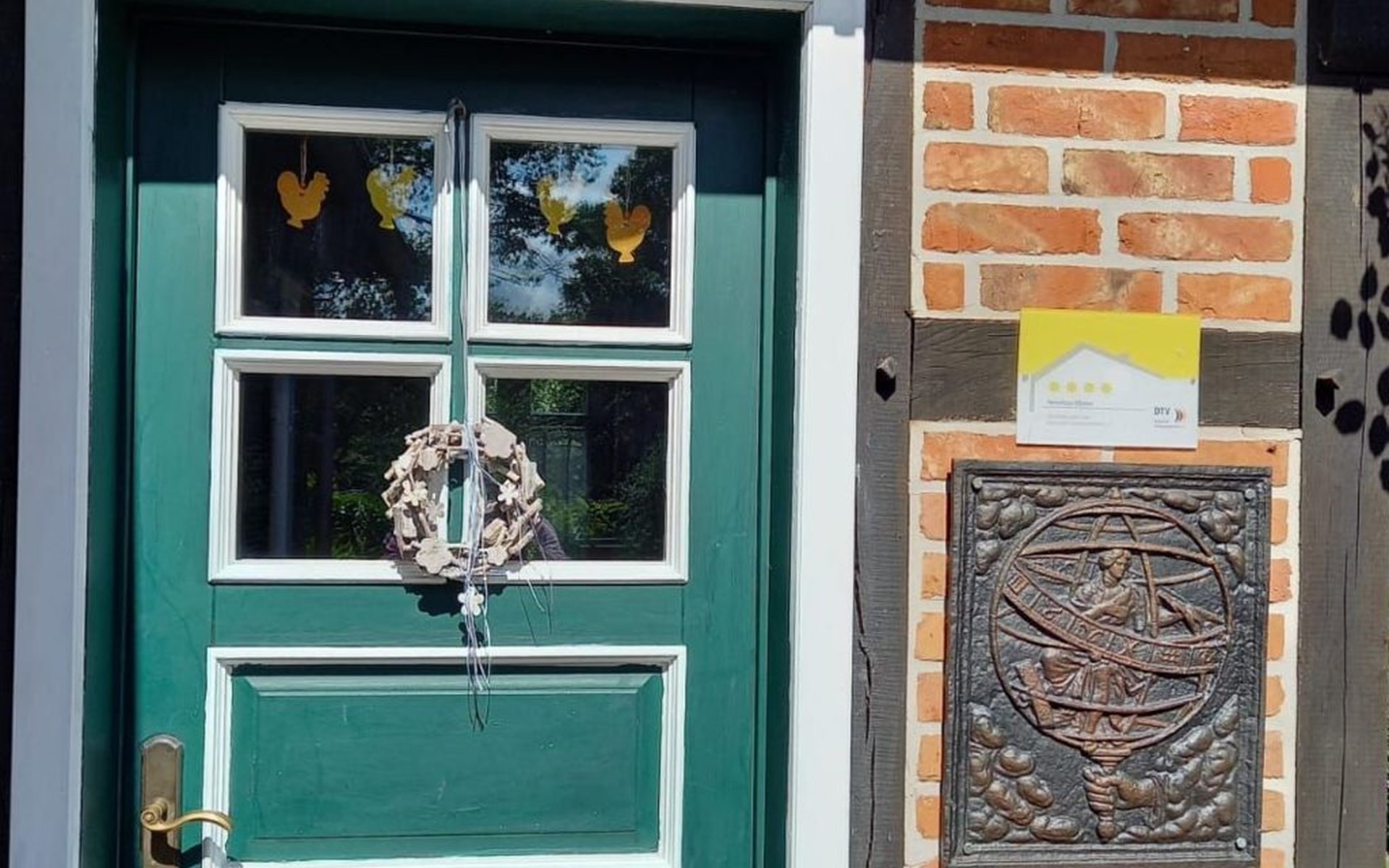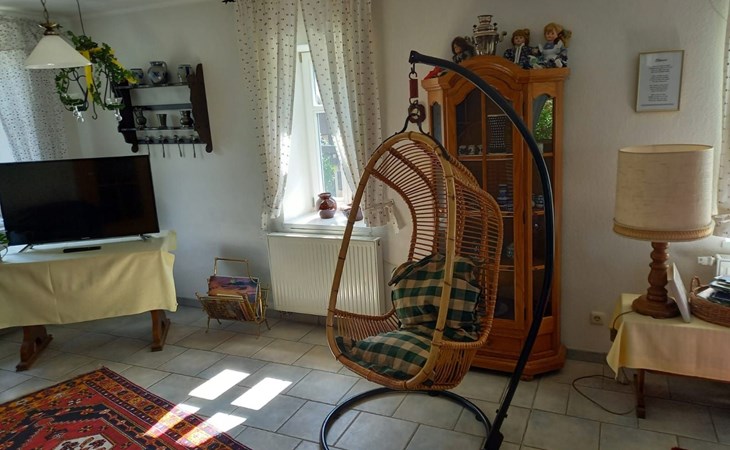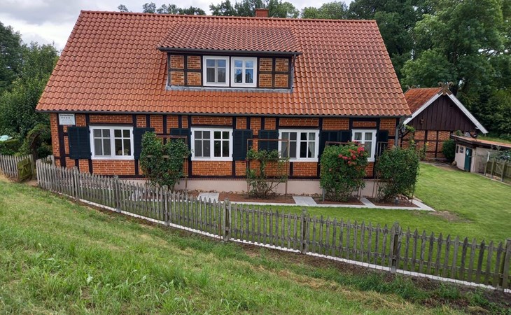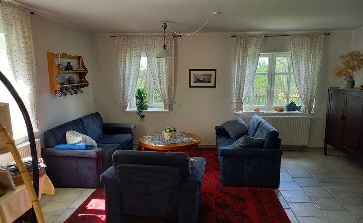 Vor der Haustür liegt die kleine Terrasse, auf der Sie schon des morgens in der Sonne frühstücken oder den Abend im Schatten ausklingen lassen können. Das Haus betreten Sie durch eine kleine Veranda, auch zum Verweilen geeignet mit Bank, Sesseln und einem kleinen Regal ausgestattet. Durch die innere Haustür gelangt man in den grossen Flur, an dem das Gäste- WC, Wohnzimmer und die Küche liegen. In dem hellen Wohnzimmer mit Fernsehecke und der anschließenden Sitzgruppe für 6 -8 Personen, sind in den Schränken Gläser und mehrere Spielesammlungen zu finden. Im Kachelofen können Sie ein gemütliches Feuer anzünden. Im Obergeschoß befinden sich die 2 Schlafzimmer und das Bad. Im großen Schlafzimmer finden Sie ein Doppelbett, 1 Einzelbett und ein Kinderbett als Zustellbett, einen Kleiderschrank sowie einen Sessel mit kleinem Tisch, zum Lesen Lampen am Bett. Aus den Fenstern sehen Sie auf den Deich Richtung Dömitz und zum Fluss Elbe.Im kleineren Schlafzimmer steht ein Doppelbett (1,40 x 2m ) evtl. ein Kinderzustellbett , 2 Kleiderschränke und ein offenes Regal mit vielen Büchern. Durch das Teleskop können Sie die Elbwiesen, den Fluß und den Deich mit den Fahrradfahrern beobachten. Beide Schlafzimmer haben 1 Fliegenfenster und sind abdunkelbar. Das Bad ist ausgestattet mit Badewanne, Dusche, WC, Wachbecken, Fön. Hier liegen auch die Handtücher für die Gäste bereit. Das Bad hat ein aufstellbares Dachflächenfenster.In der großen Küche mit Essecke für 6-8 Personen, ausgestattet mit hellen Küchenmöbeln, finden Sie außer E- 4 Plattenherd mit Backofen und Dunstabzug, Kühlschrank mit Gefrierfach, genügend Porzellan und Küchengeräten für 6- 8 Personen, Kaffeemaschine, Toaster, Backutensilien, Wasserkocher, Waffeleisen, Bügelbrett mit Bügeleisen u.v.m. Die Spülmaschine, Waschmaschine und Trockner stehen im Versorgungesraum im Anschluss an die Küche.