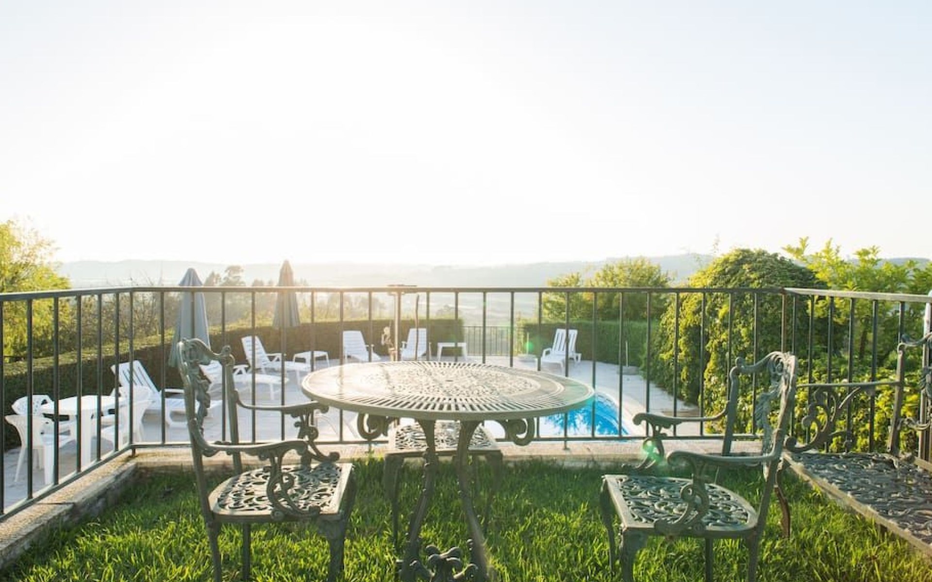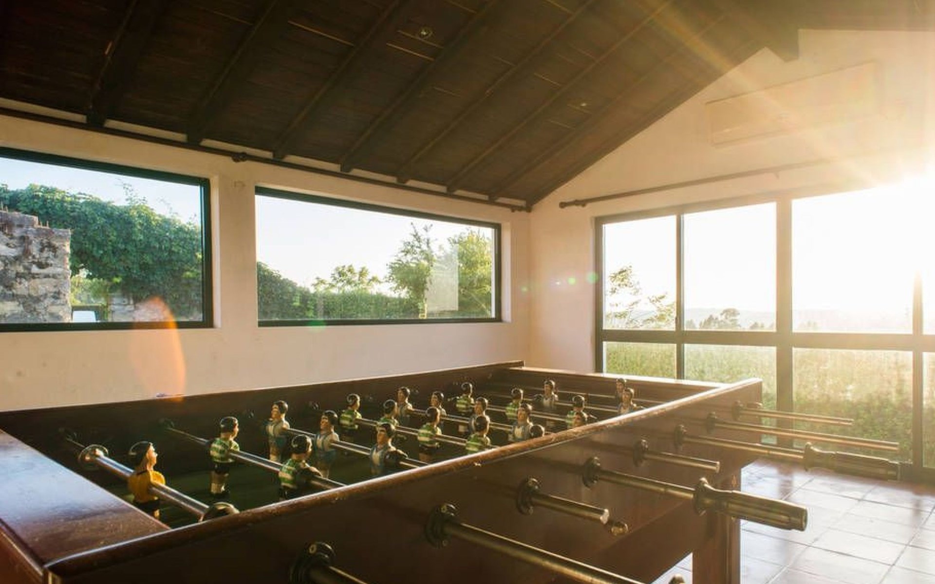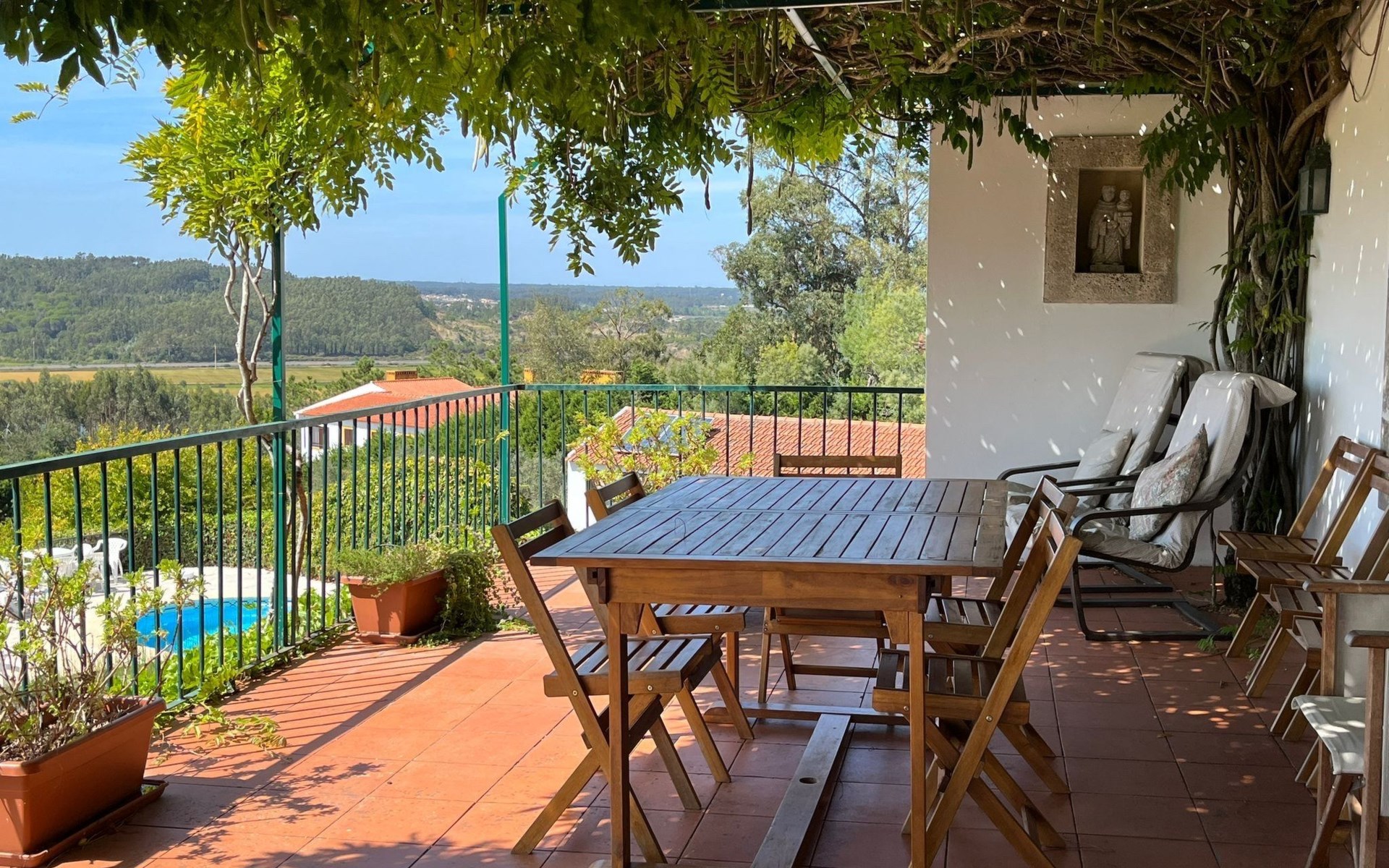 Im Außenbereich besticht das Anwesen durch einen großzügigen 45 m² großen Sonnenbalkon, der einen herrlichen Blick über die Reisfelder bis hin zum Fluss Mondego bietet. Der Außenbereich ist auf Genuss und Erholung ausgelegt und bietet einen saisonalen Swimmingpool, der von Mai bis September zur Verfügung steht. Neben dem Pool gibt es einen Poolraum, in dem Badesachen und Zubehör aufbewahrt werden können, sowie einen Fußballtisch und Tische und Stühle für Mahlzeiten im Freien. Für die Kleinen sorgt ein kleiner Spielplatz unterhalb des Balkons für fröhliche Momente in der Sonne. Ein separater Toilettenraum mit Dusche in der Nähe des Nebengebäudes ist für die Poolbenutzer bequem zu erreichen und macht das Leben im Freien noch angenehmer.