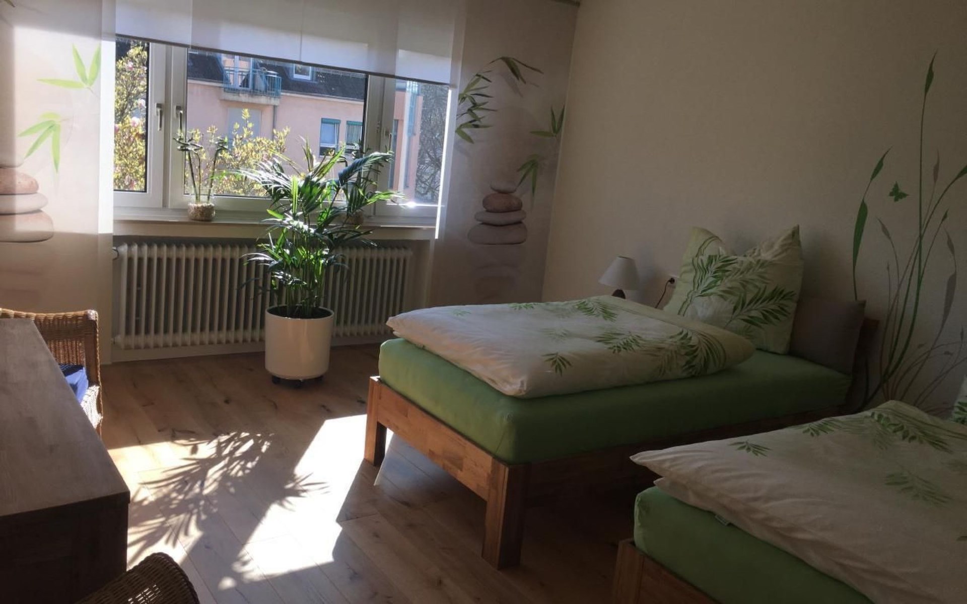 Innen bietet die 96 m² große Ferienwohnung im 2. Stock alles was das Herz begehrt. Mit einem komfortablen Wohnzimmer inklusive Schlafcouch, zwei gemütlichen Doppelschlafzimmern, einer voll ausgestatteten Küche mit Waschmaschine sowie einem Bad mit Dusche und WC. Der große Balkon mit Blick ins Grüne lädt zum Entspannen ein. Zudem steht Ihnen ein Parkplatz oder eine private Garage zur Verfügung, was in der Stadt ein echter Luxus ist.