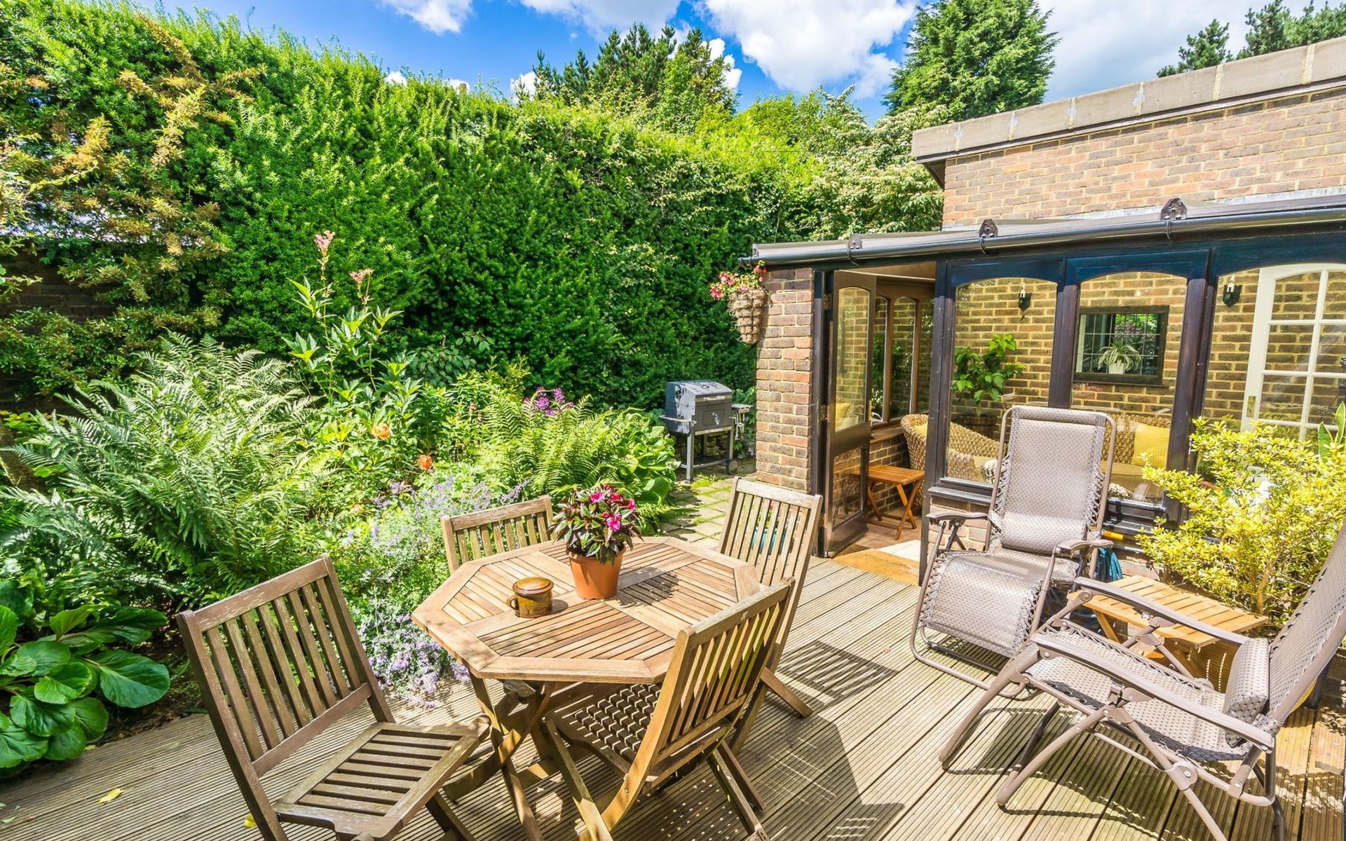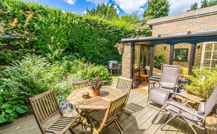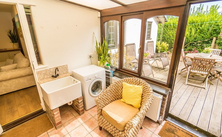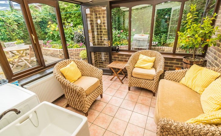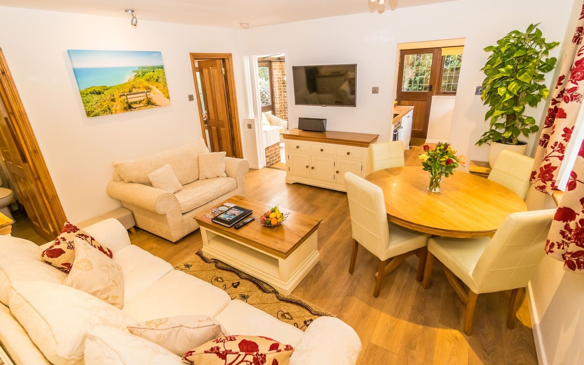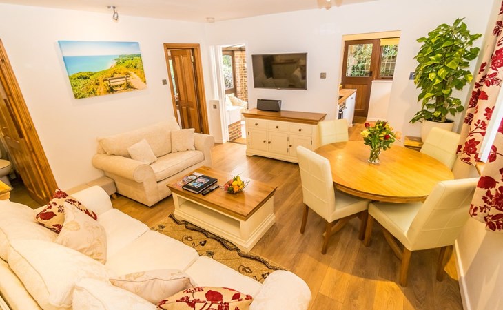 Das Wohnzimmer öffnet sich zu Ihrem privaten Wintergarten, wo Sie es sich am Tisch mit Stühlen bequem machen und gemütliche Grillabende genießen können.