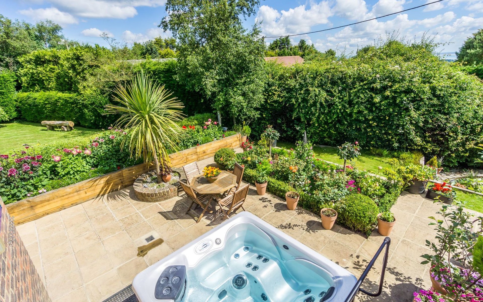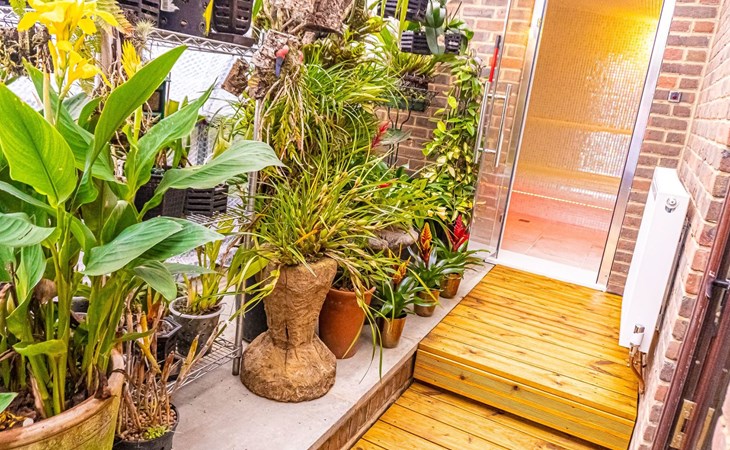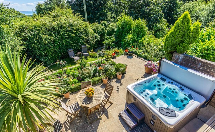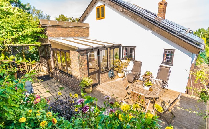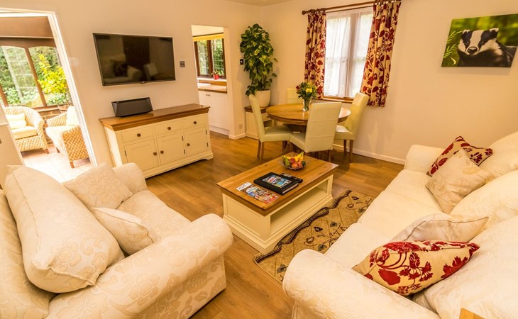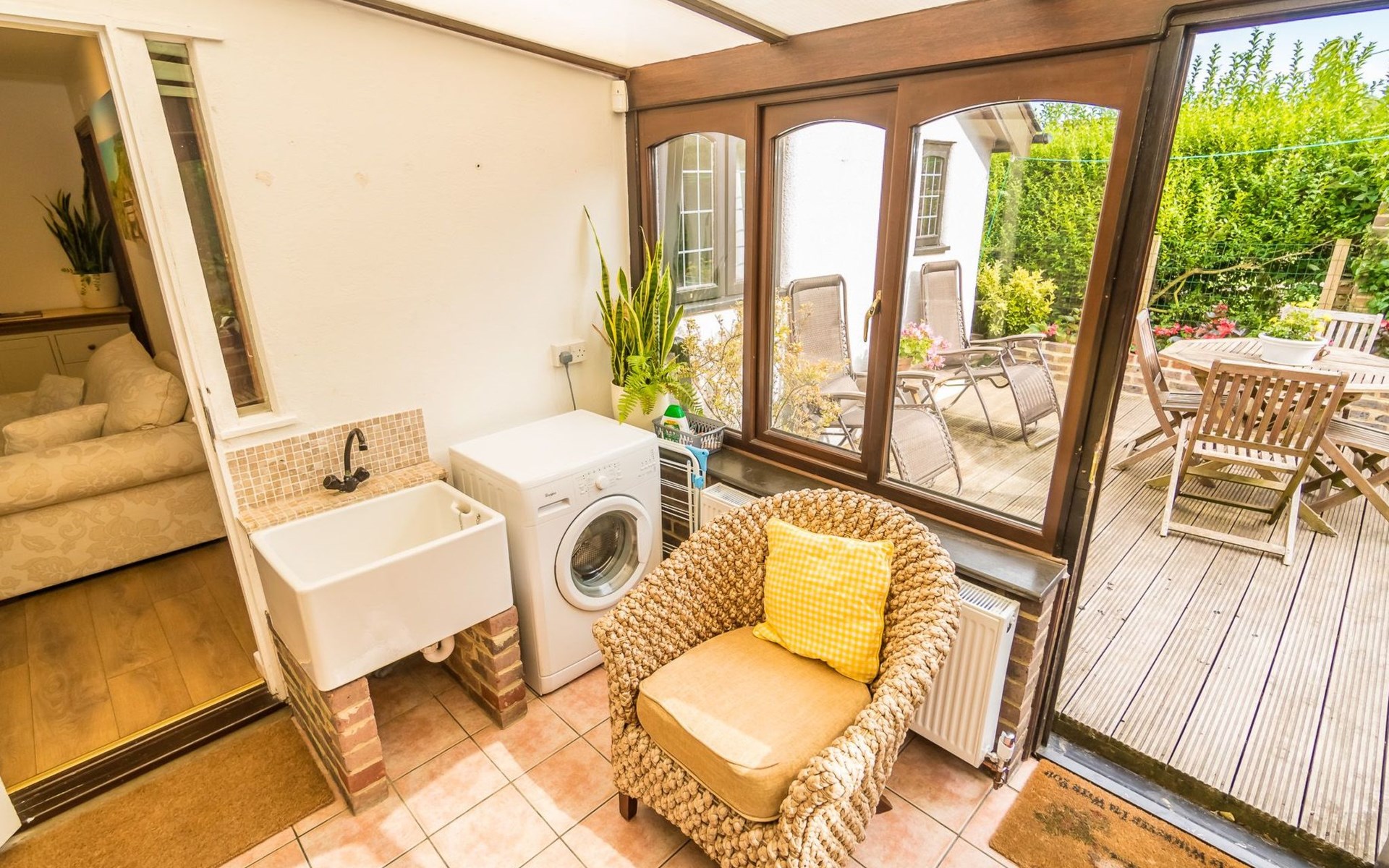 Das Wohnzimmer öffnet sich zu Ihrem privaten Wintergarten, wo Sie es sich am Tisch mit Stühlen bequem machen und gemütliche Grillabende genießen können.