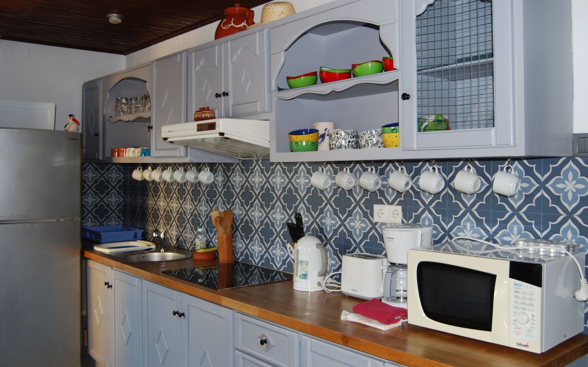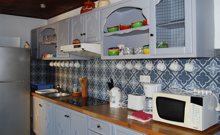 Das 190 m² große Haus bietet Platz für dreizehn Personen und ist einfach aber geschmackvoll eingerichtet. Es verfügt über drei Badezimmer mit Dusche und Toilette sowie fünf Schlafzimmer. Drei Schlafzimmer befinden sich im Erdgeschoss. Zwei Zimmer sind mit einem Doppelbett ausgestattet, das dritte Zimmer bietet drei Schlafsofas für eine Person. Jedes der beiden Schlafzimmer in der ersten Etage verfügt über ein Doppel- und ein Einzelbett. Im Wohnzimmer gibt es einen Kamin mit einem gemütlichen Sitzbereich davor. Es schließt sich die offene Küche an, die mit Herd, Kühlschrank, Mikrowelle, Kaffeemaschine und Wasserkocher ausgestattet ist.