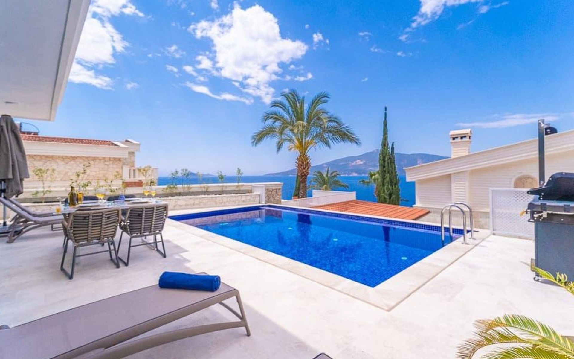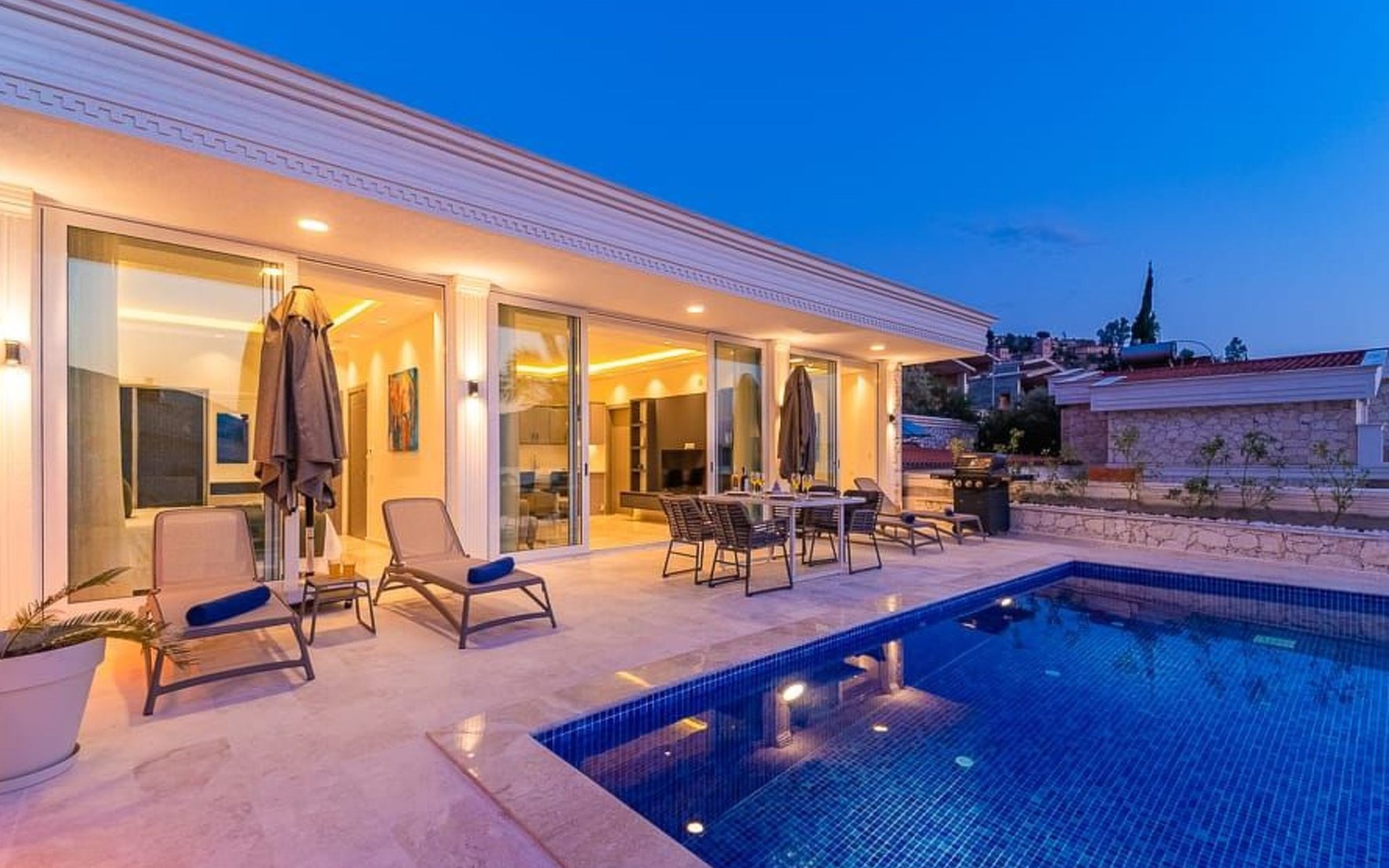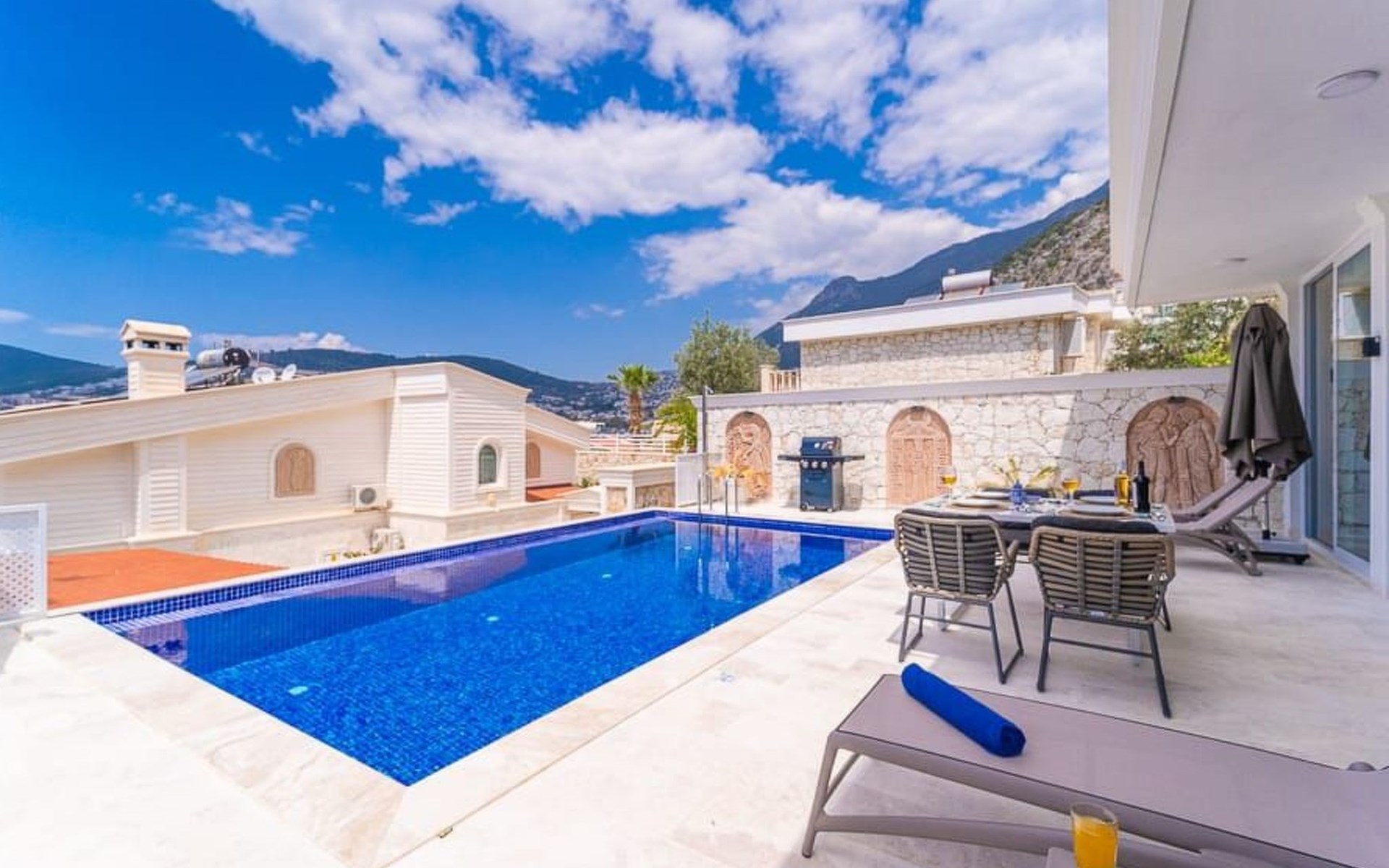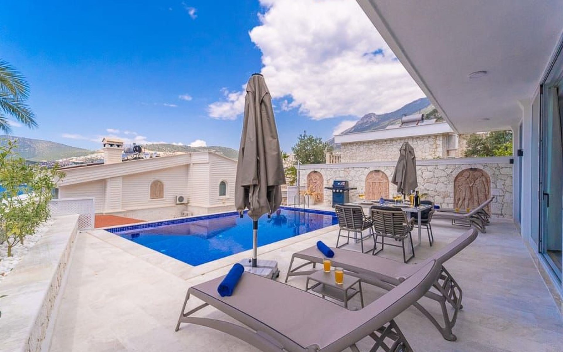 Der Außenbereich der Villa ist ebenso beeindruckend. Ein privater Swimmingpool lädt zum Entspannen und Erfrischen ein, während die Sonnenliegen und schattigen Bereiche perfekt zum Sonnenbaden und Lesen sind. Ein Essbereich im Freien und ein Grillplatz bieten die ideale Kulisse für gesellige Abende und köstliche Mahlzeiten im Freien.