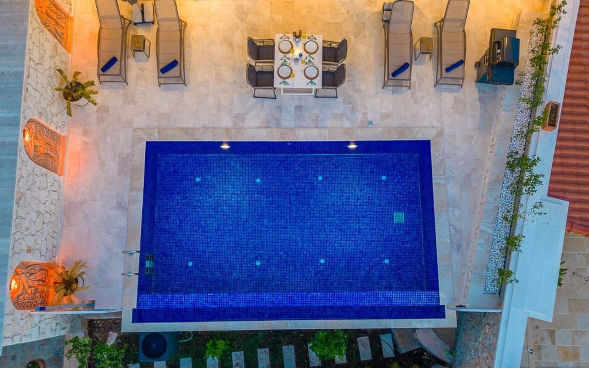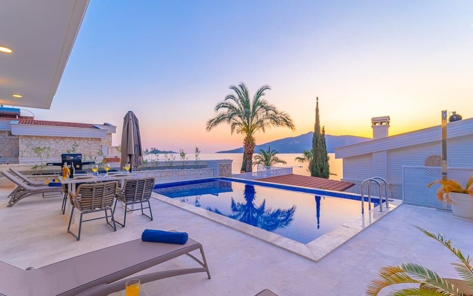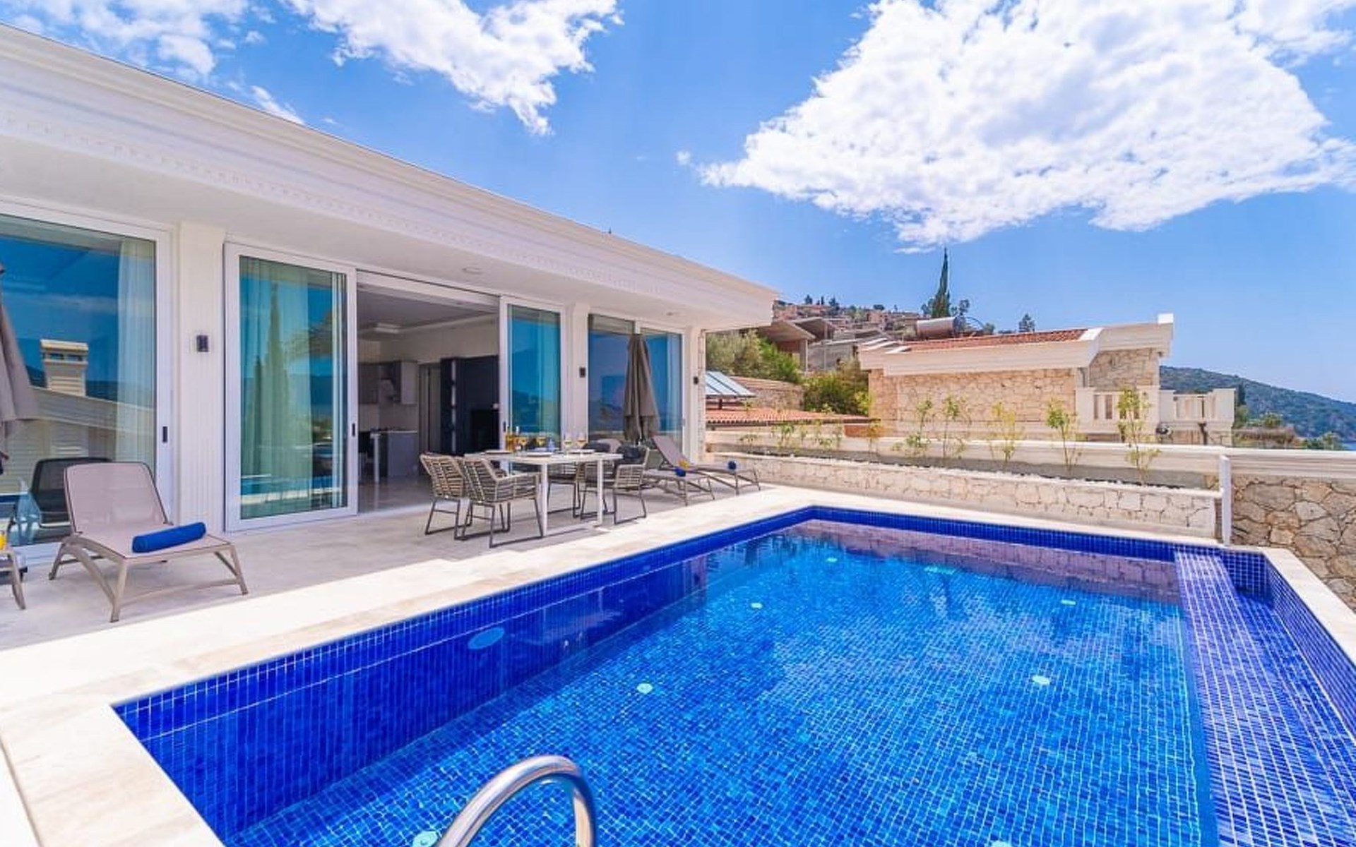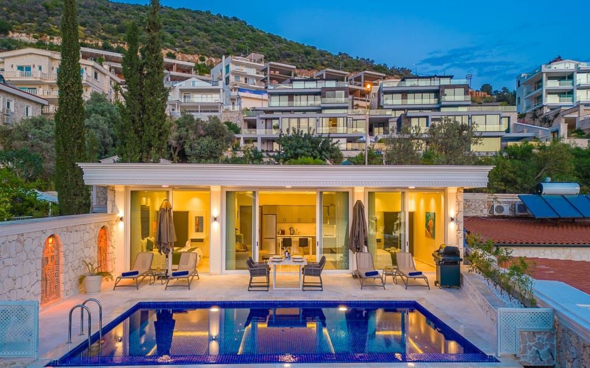 Der Außenbereich der Villa ist ebenso beeindruckend. Ein privater Swimmingpool lädt zum Entspannen und Erfrischen ein, während die Sonnenliegen und schattigen Bereiche perfekt zum Sonnenbaden und Lesen sind. Ein Essbereich im Freien und ein Grillplatz bieten die ideale Kulisse für gesellige Abende und köstliche Mahlzeiten im Freien.
