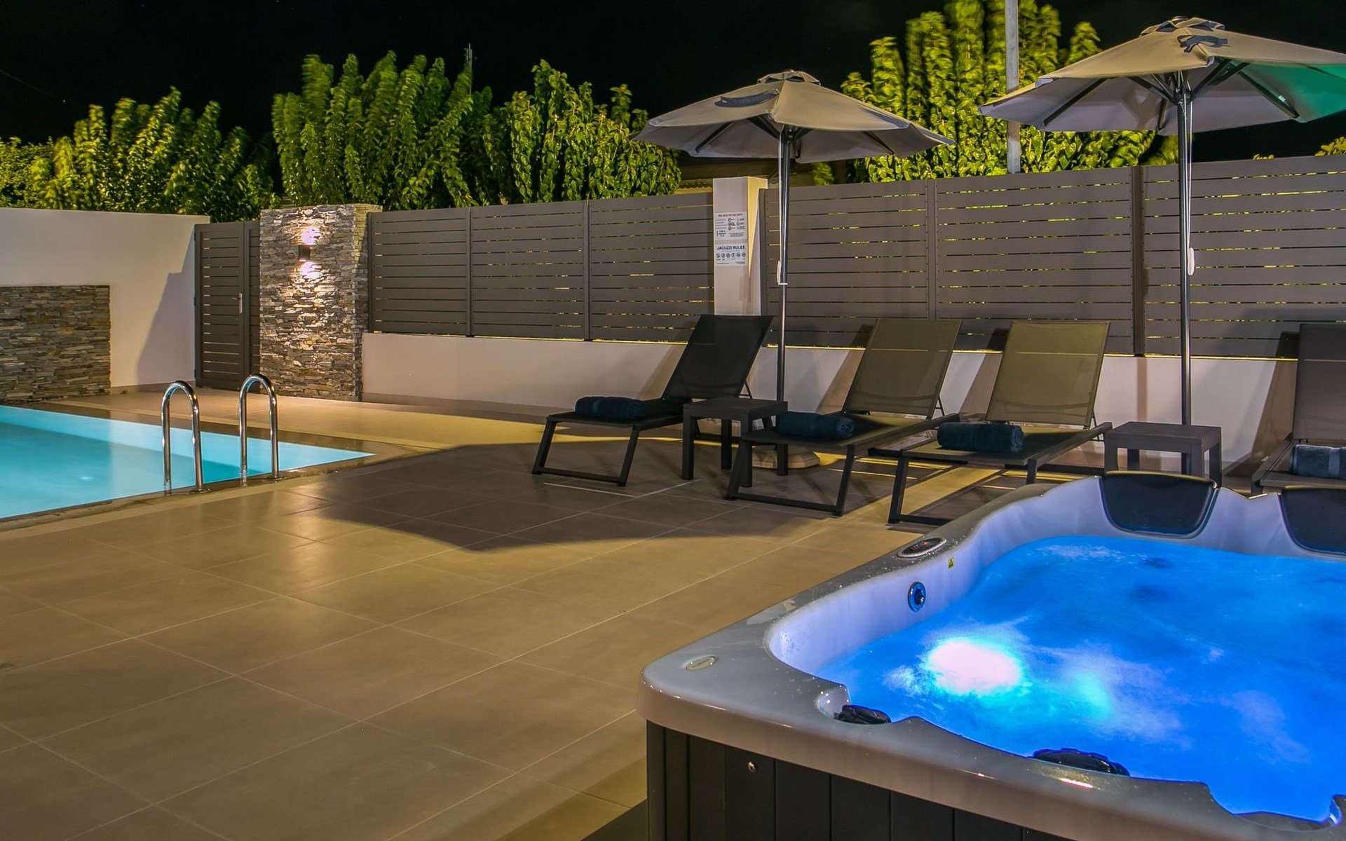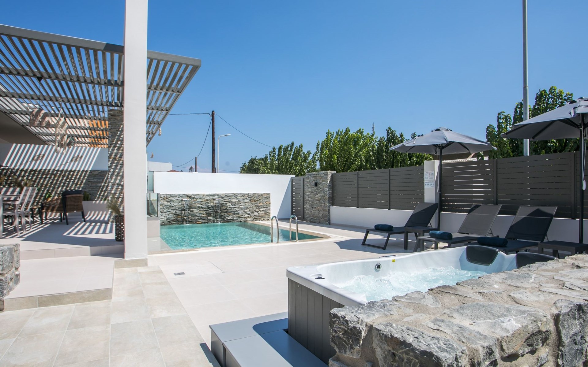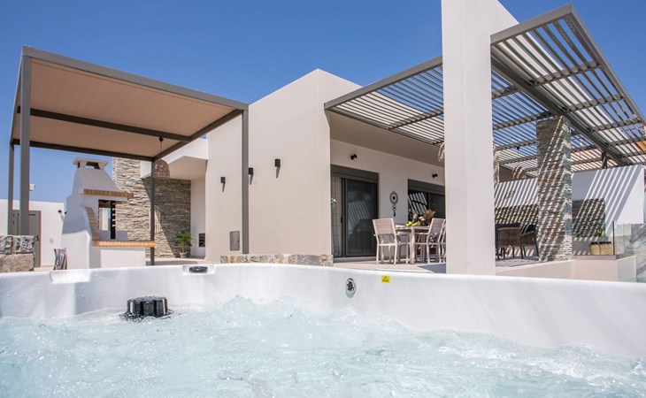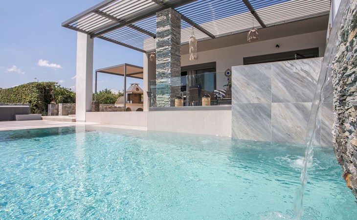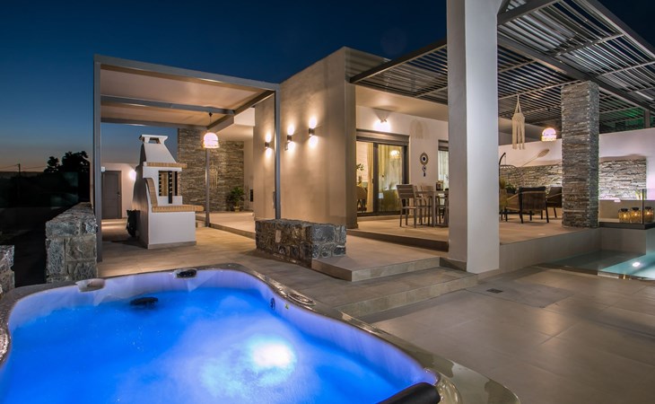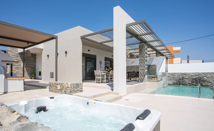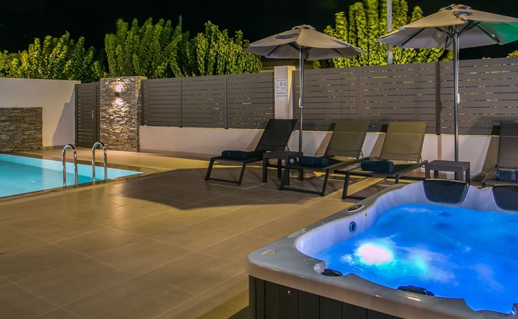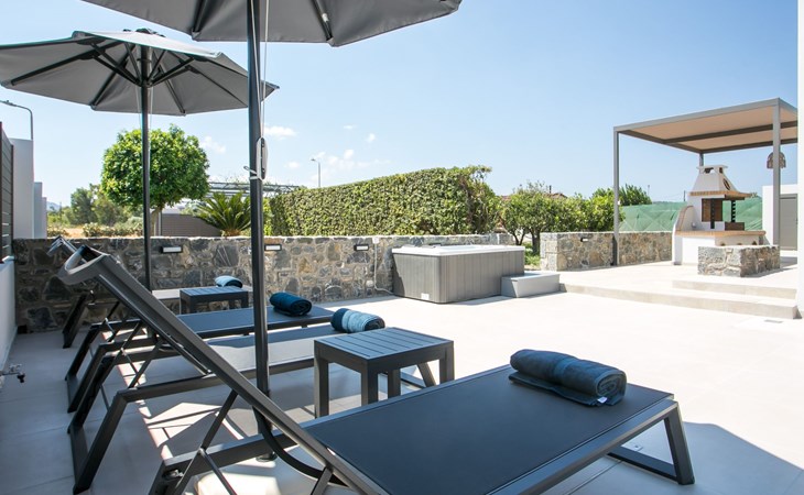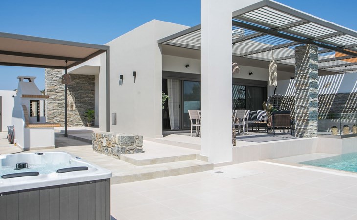 Im Außenbereich lädt ein großer privater Pool mit Liegen und Sonnenschirmen zum Entspannen ein, während der angrenzende Whirlpool luxuriöse Entspannung verspricht. Der Außenbereich der Villa umfasst auch einen stilvollen Essbereich mit Grill und ein gemütliches Wohnzimmer im Freien für abendliche Zusammenkünfte. Für zusätzlichen Komfort gibt es ein Badezimmer mit Dusche im Freien, so dass der Übergang vom Spaß am Pool zur Entspannung leicht ist.