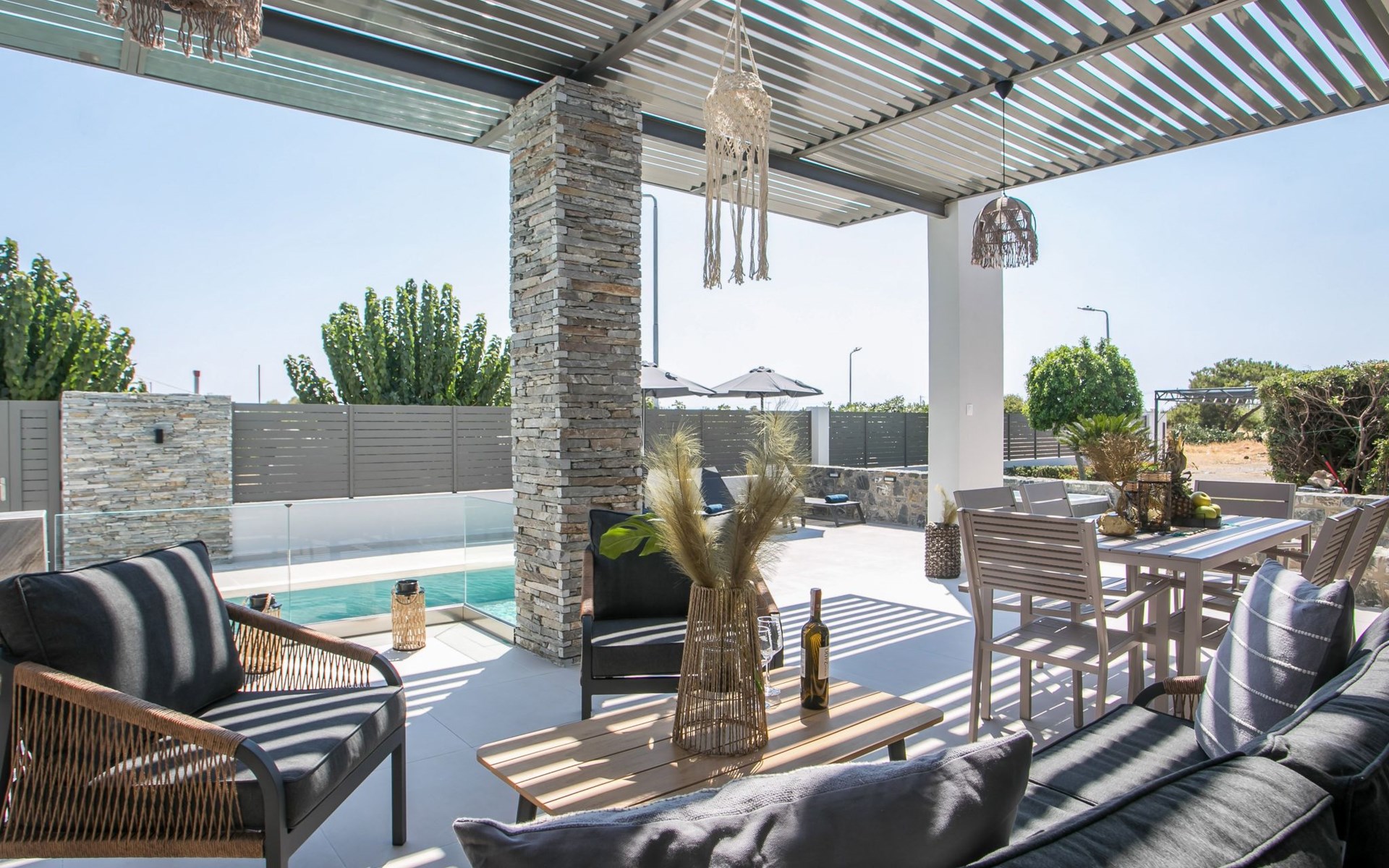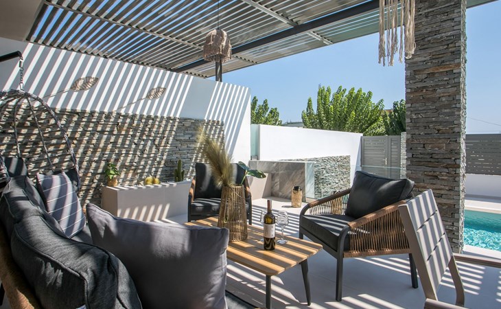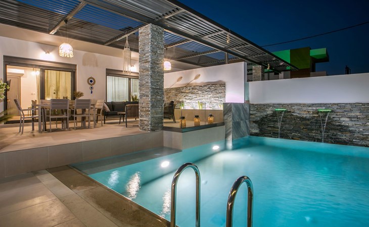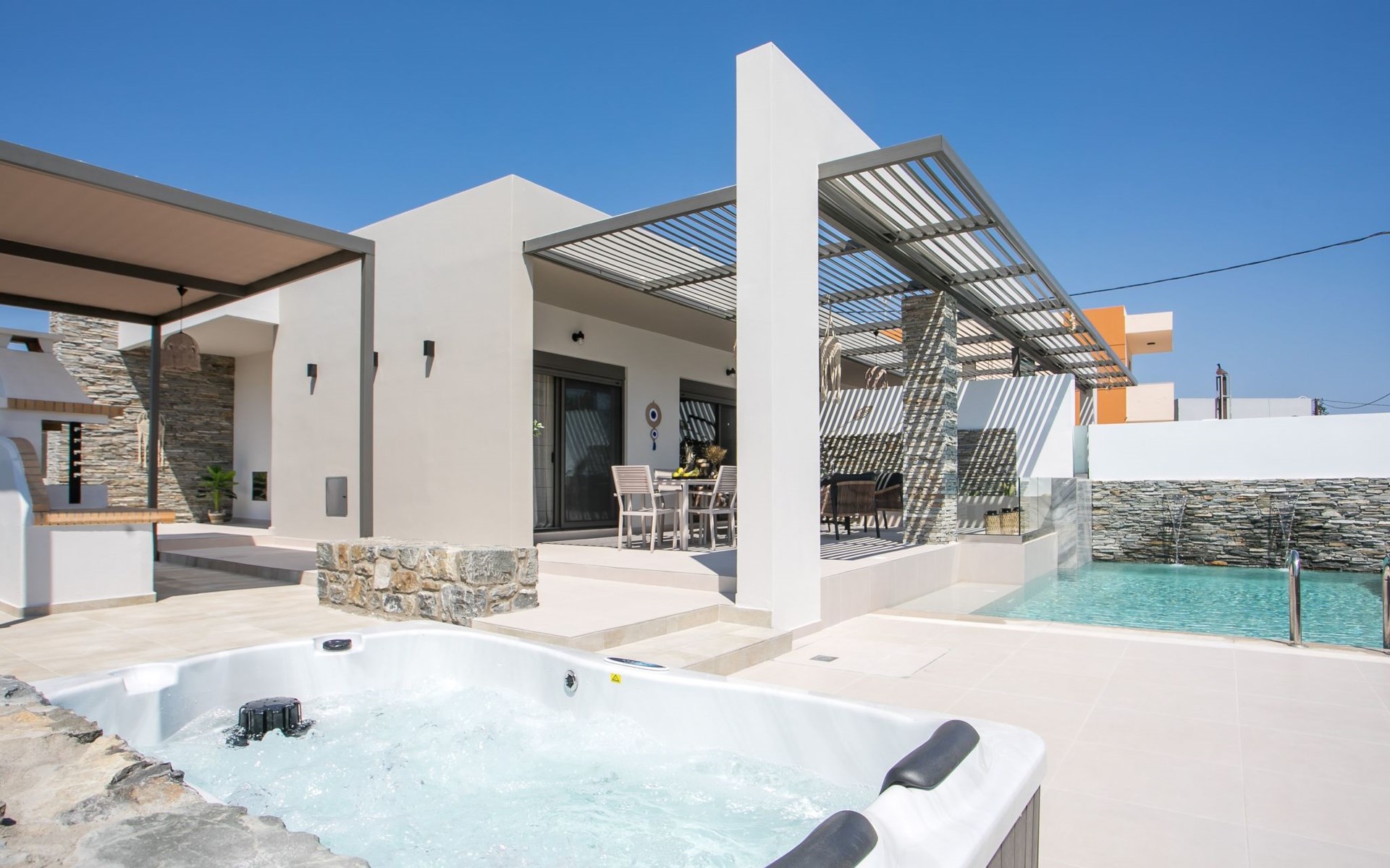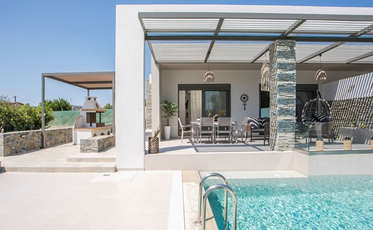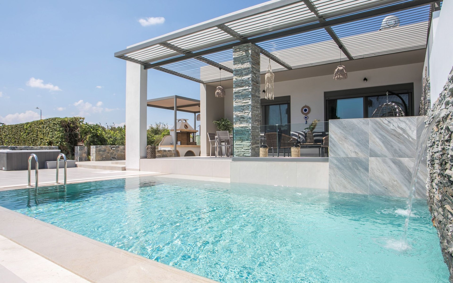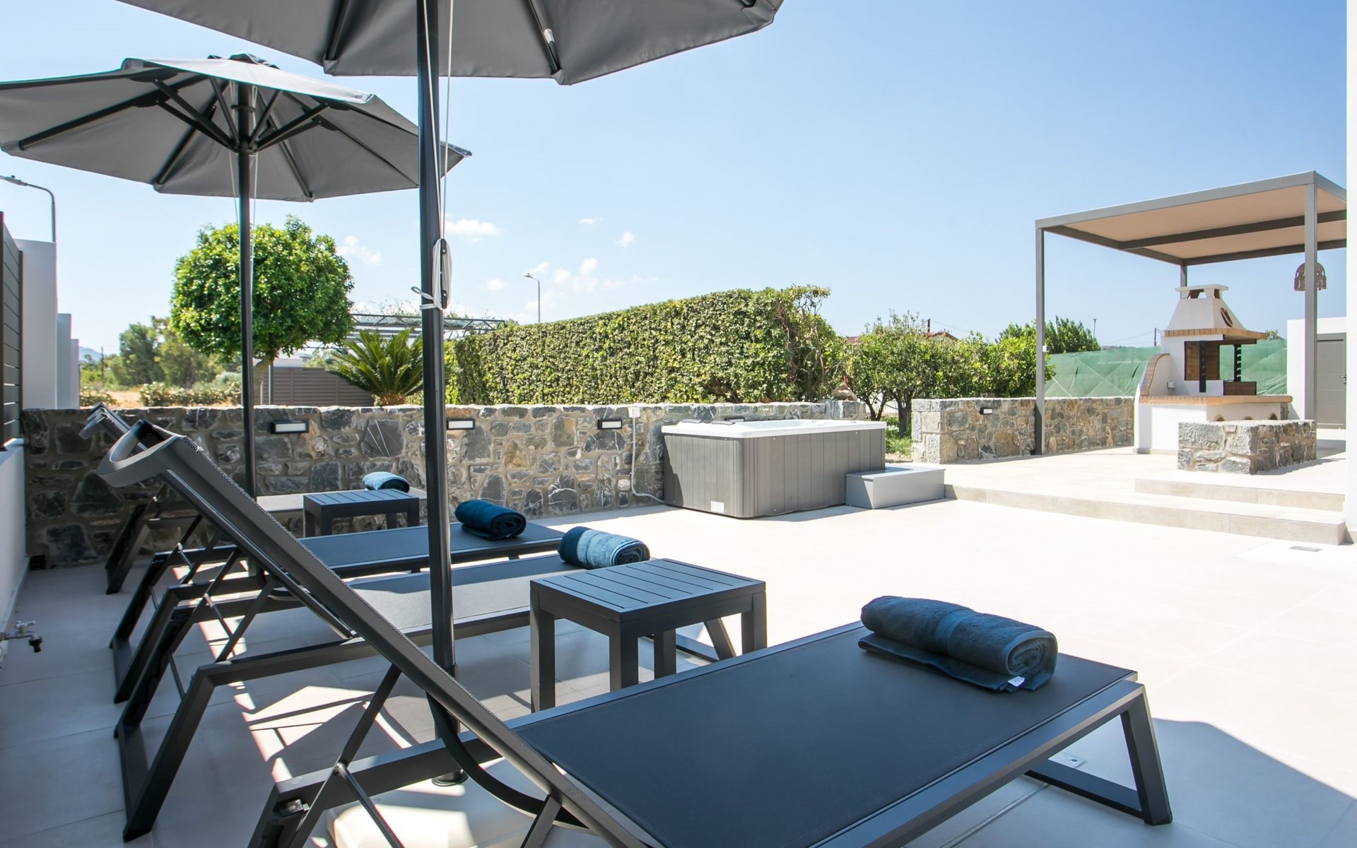 Im Außenbereich lädt ein großer privater Pool mit Liegen und Sonnenschirmen zum Entspannen ein, während der angrenzende Whirlpool luxuriöse Entspannung verspricht. Der Außenbereich der Villa umfasst auch einen stilvollen Essbereich mit Grill und ein gemütliches Wohnzimmer im Freien für abendliche Zusammenkünfte. Für zusätzlichen Komfort gibt es ein Badezimmer mit Dusche im Freien, so dass der Übergang vom Spaß am Pool zur Entspannung leicht ist.