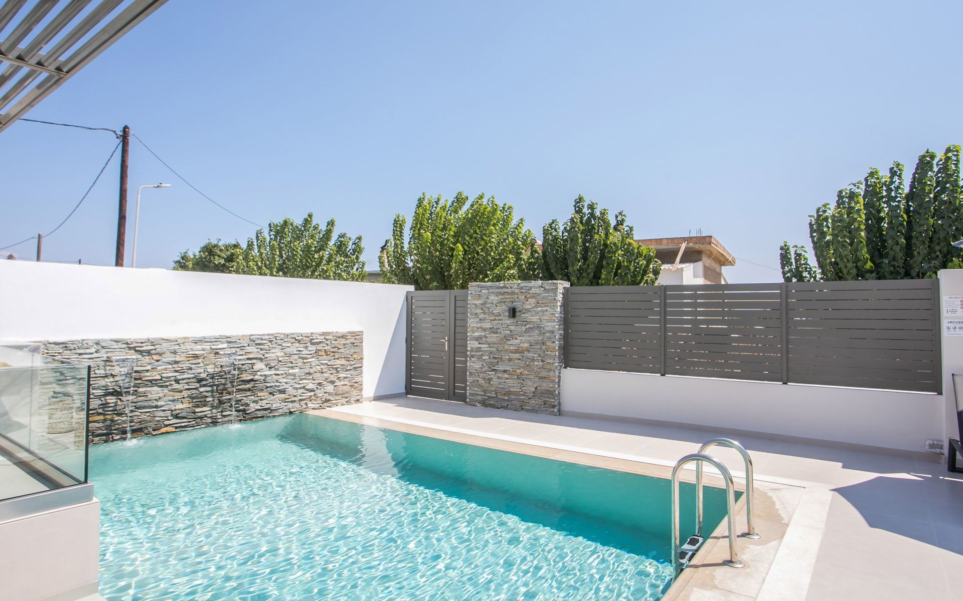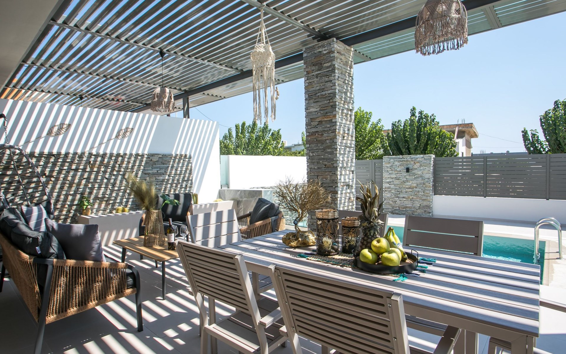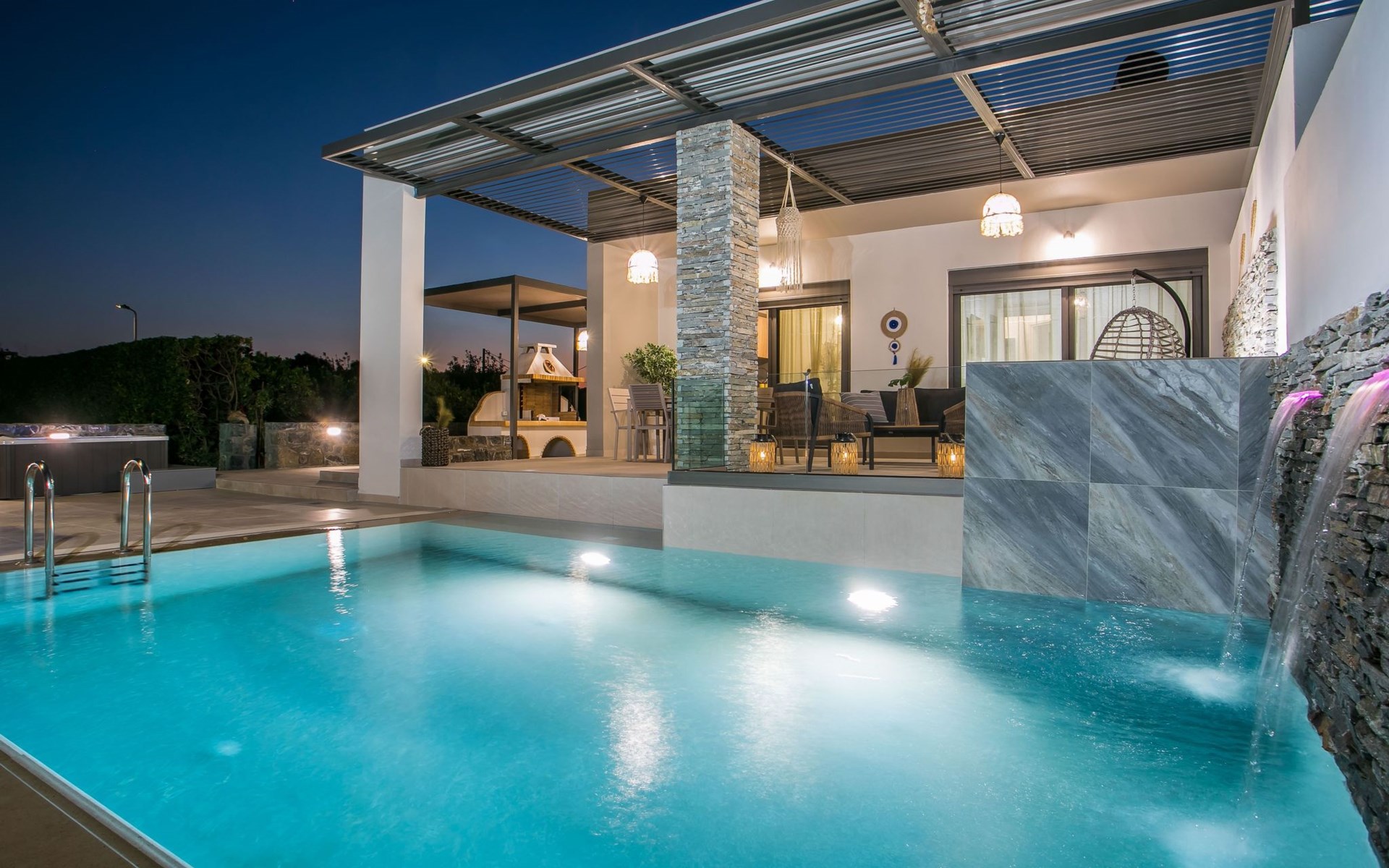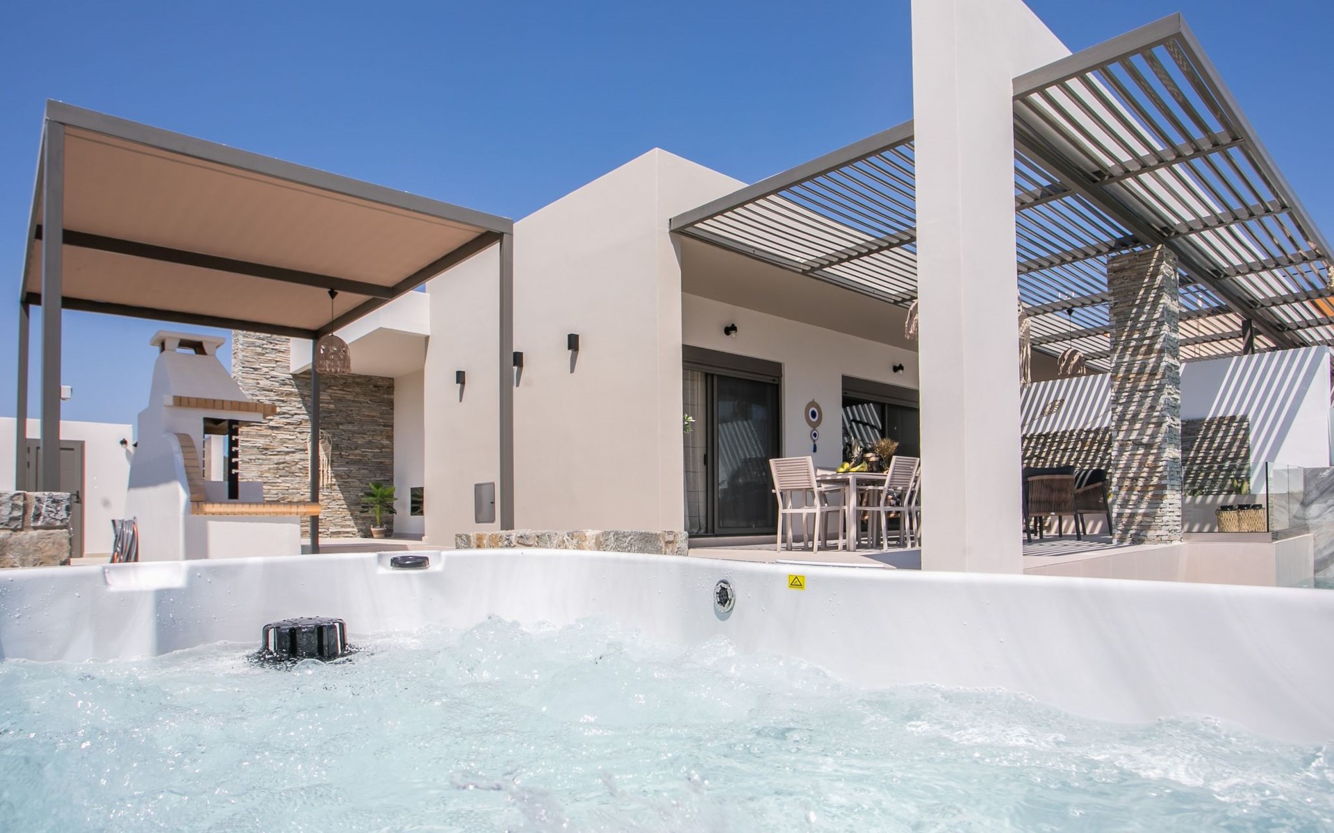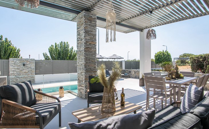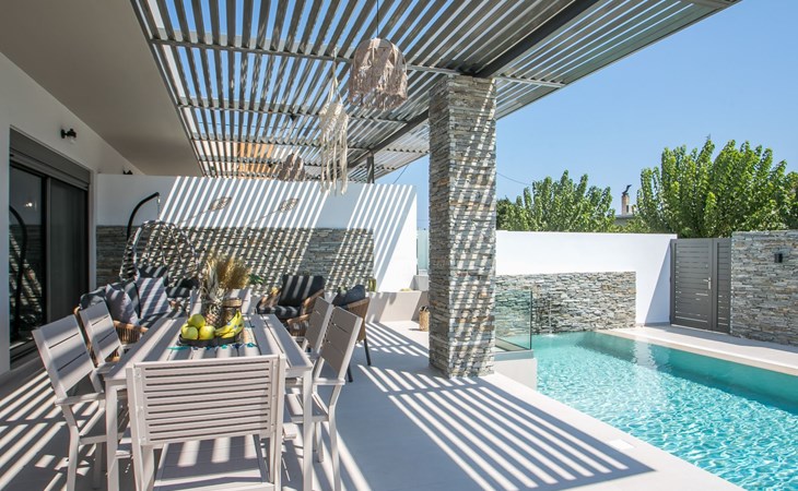 Im Außenbereich lädt ein großer privater Pool mit Liegen und Sonnenschirmen zum Entspannen ein, während der angrenzende Whirlpool luxuriöse Entspannung verspricht. Der Außenbereich der Villa umfasst auch einen stilvollen Essbereich mit Grill und ein gemütliches Wohnzimmer im Freien für abendliche Zusammenkünfte. Für zusätzlichen Komfort gibt es ein Badezimmer mit Dusche im Freien, so dass der Übergang vom Spaß am Pool zur Entspannung leicht ist.