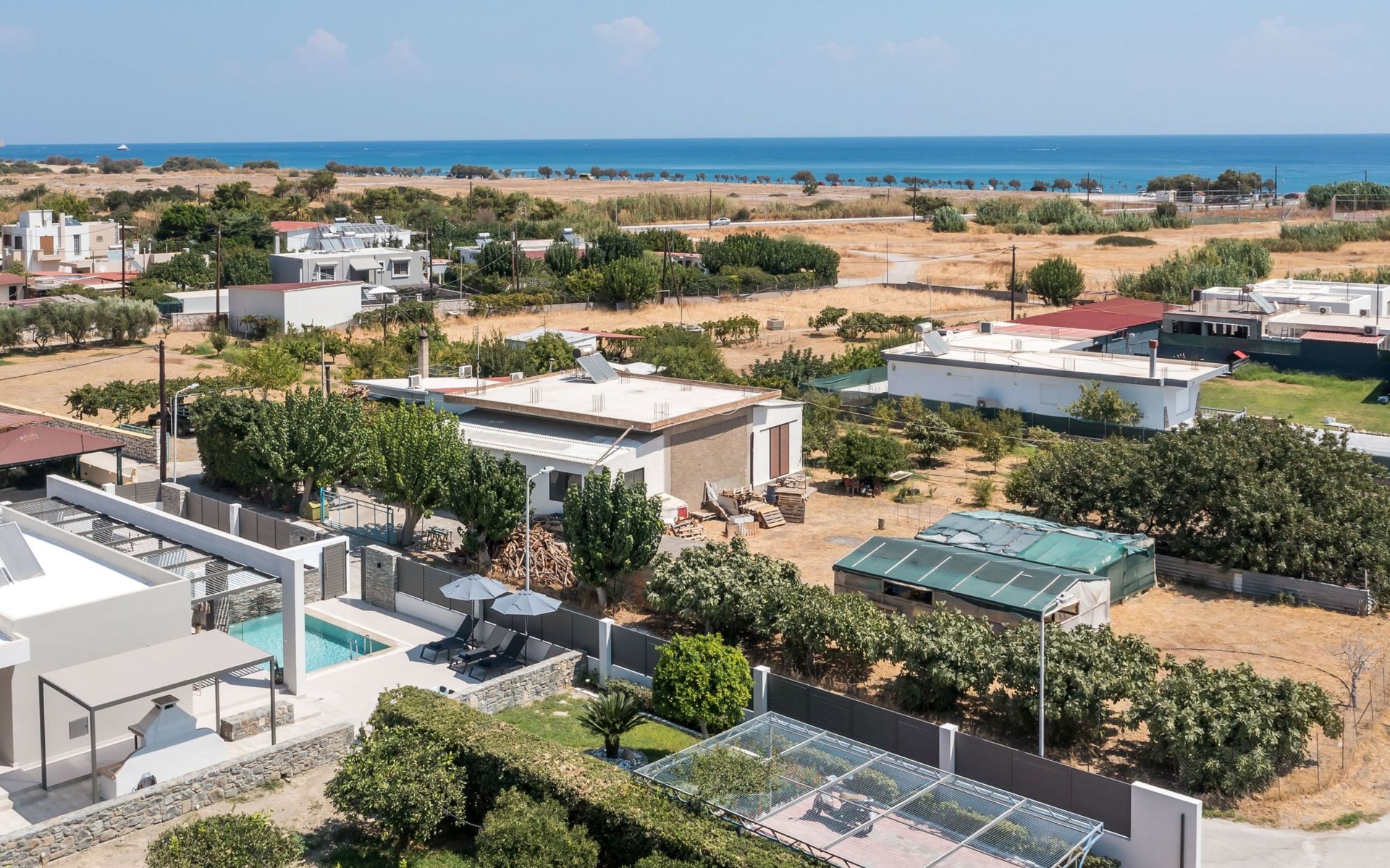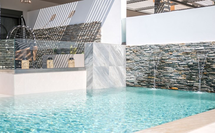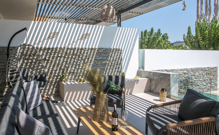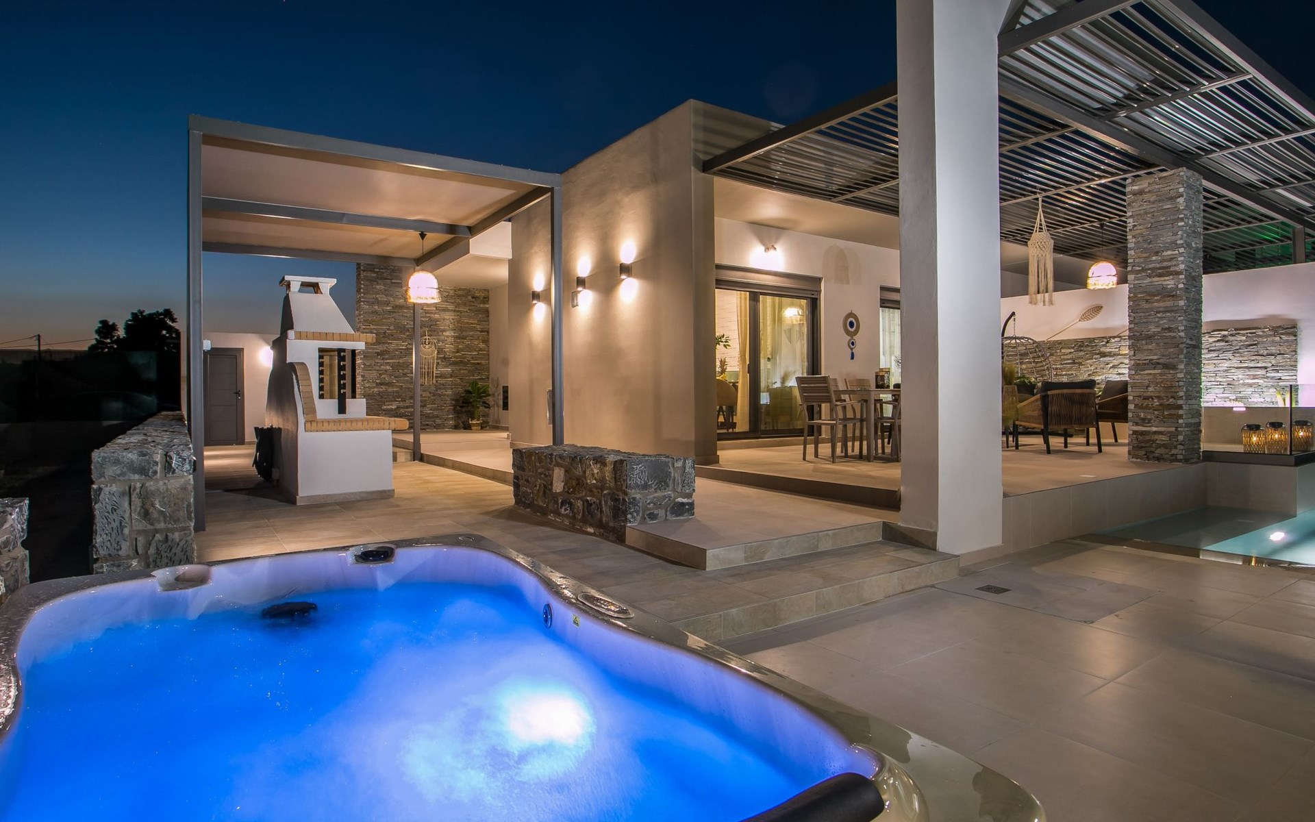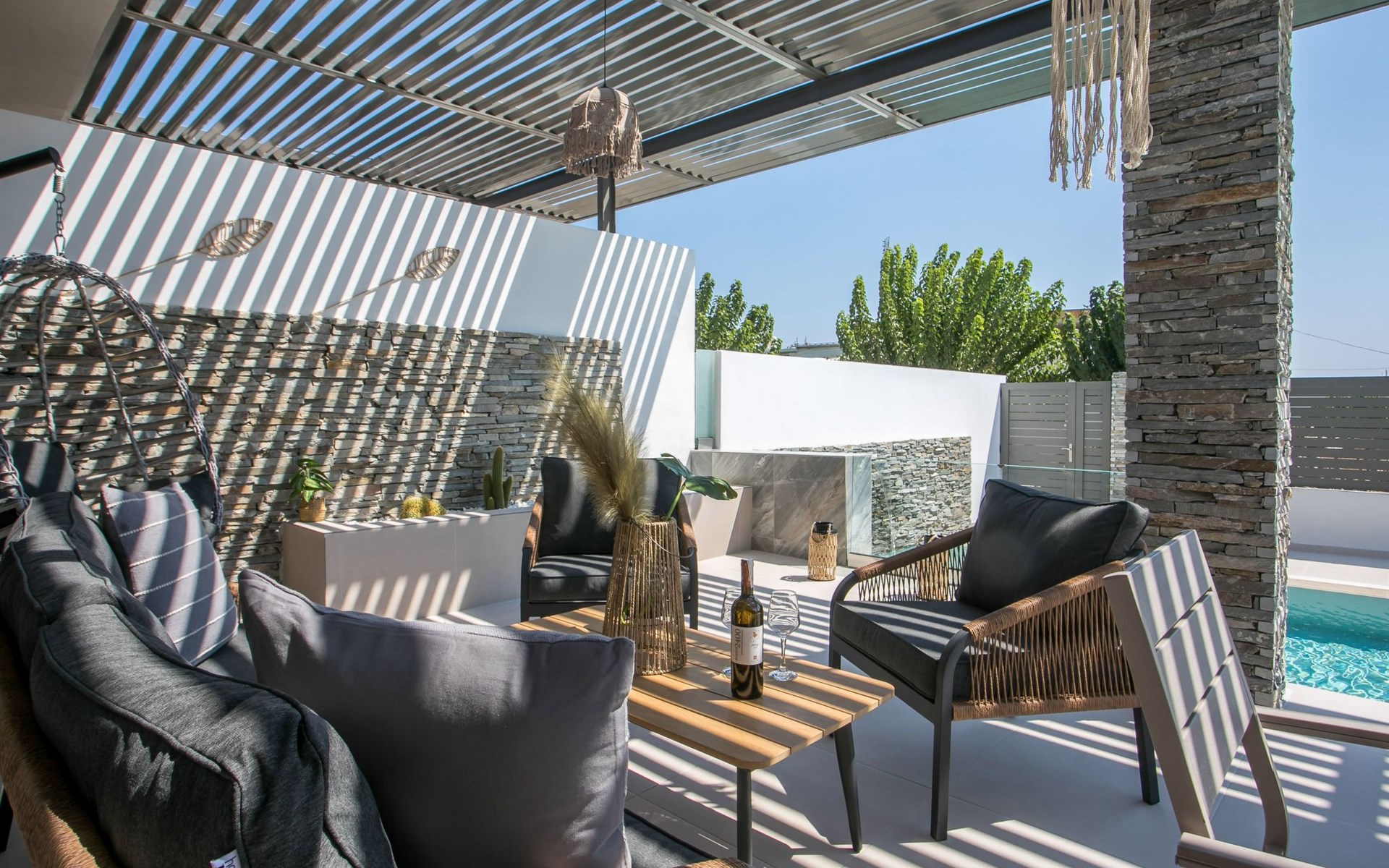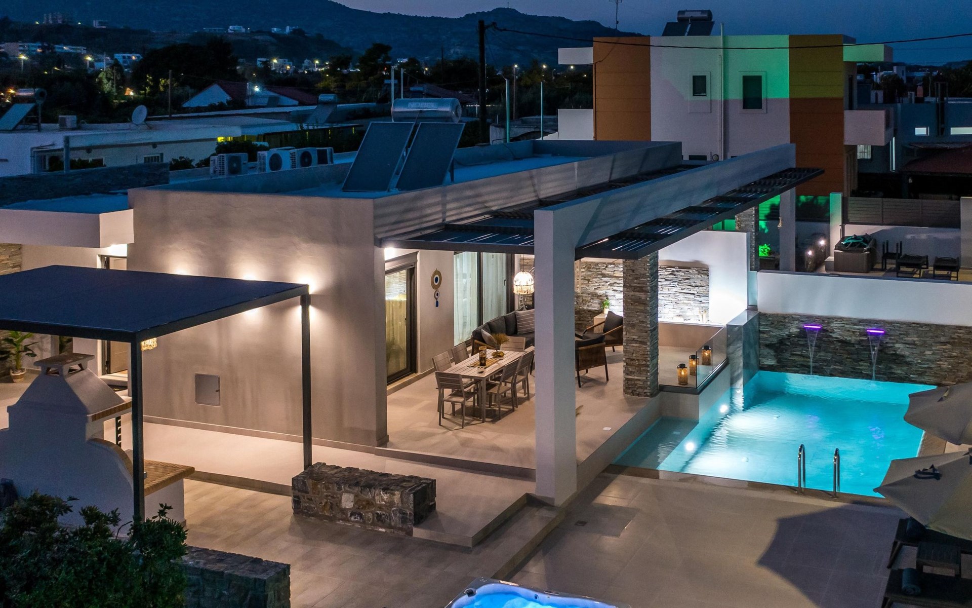 Im Außenbereich lädt ein großer privater Pool mit Liegen und Sonnenschirmen zum Entspannen ein, während der angrenzende Whirlpool luxuriöse Entspannung verspricht. Der Außenbereich der Villa umfasst auch einen stilvollen Essbereich mit Grill und ein gemütliches Wohnzimmer im Freien für abendliche Zusammenkünfte. Für zusätzlichen Komfort gibt es ein Badezimmer mit Dusche im Freien, so dass der Übergang vom Spaß am Pool zur Entspannung leicht ist.