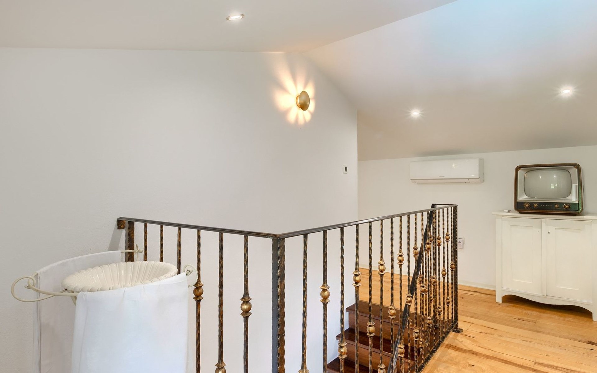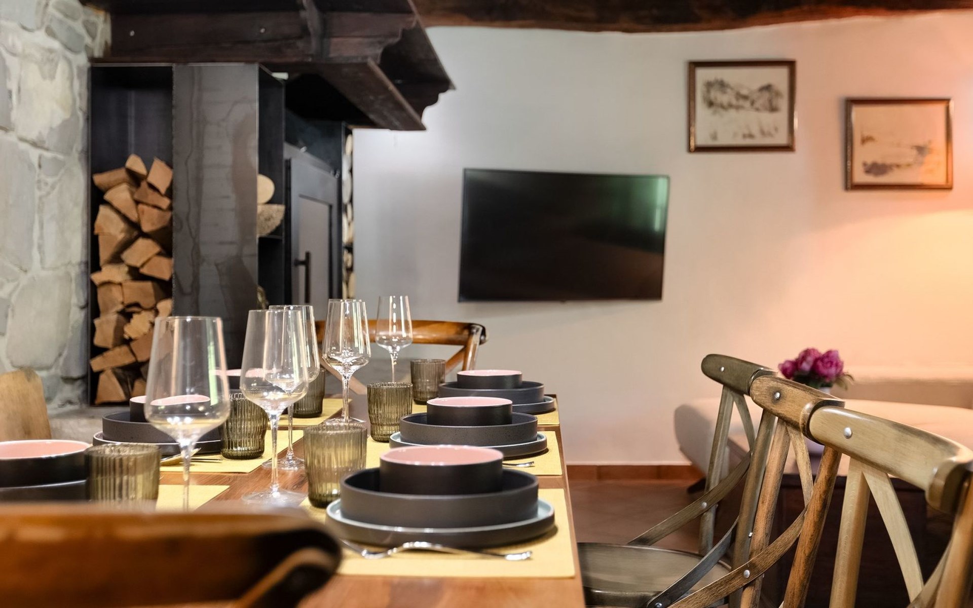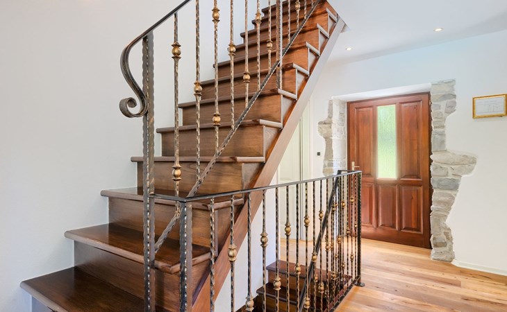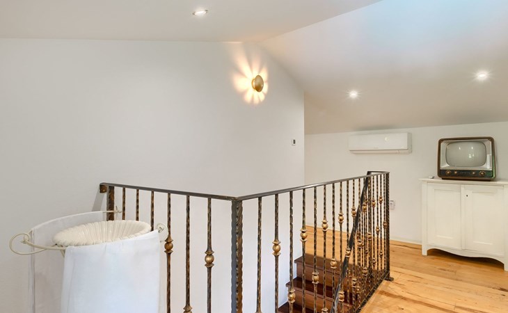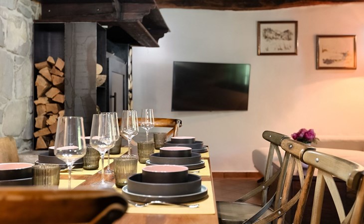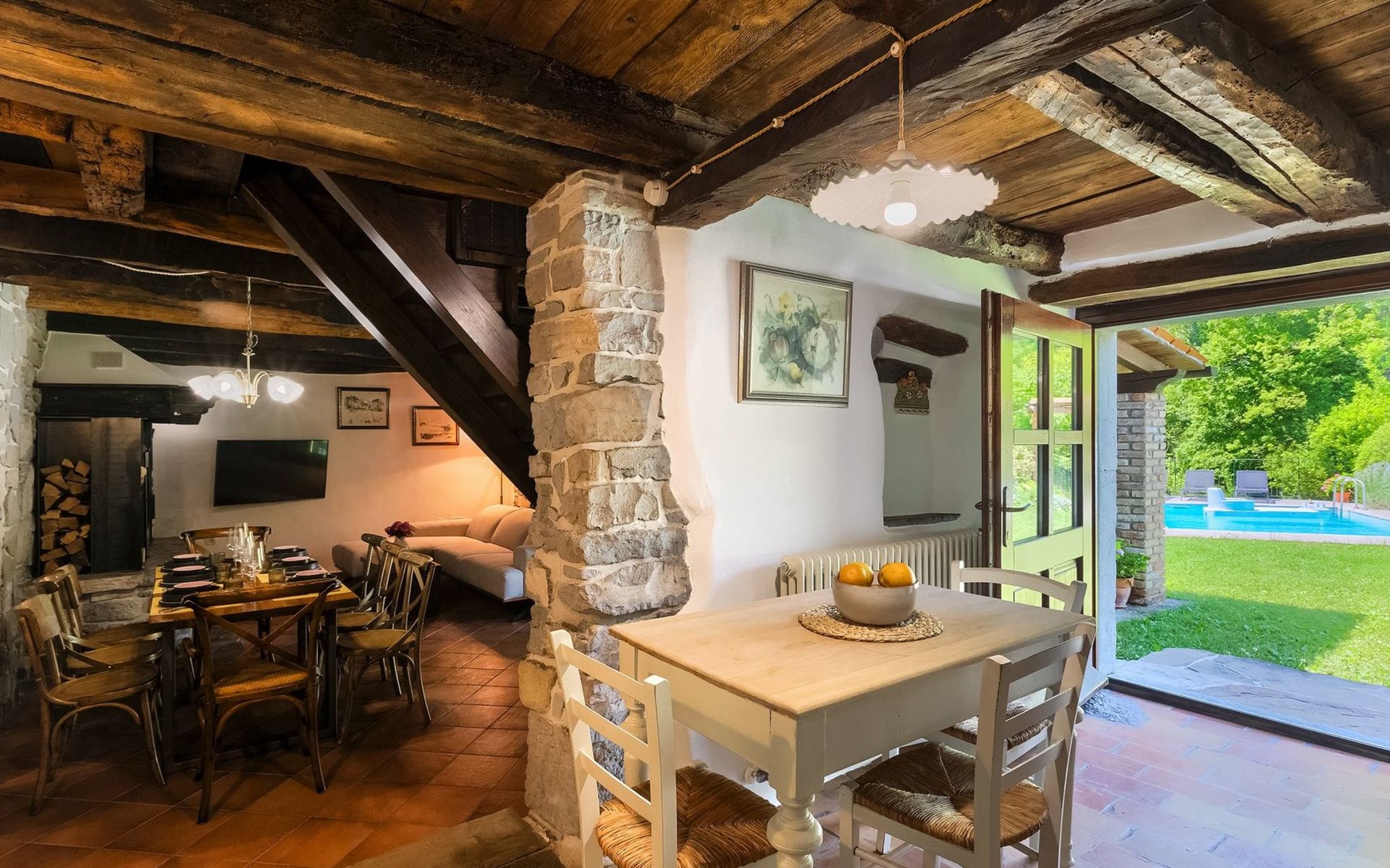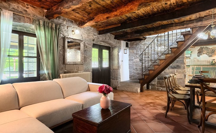 Das Innere der Villa strahlt Wärme und Authentizität aus, mit einem schön eingerichteten Essbereich und einem gemütlichen Wohnzimmer. Holzbalken und eine Treppe mit charakteristischen alten Möbeln schaffen eine besondere Atmosphäre, in der Sie sich entspannen und wie zu Hause fühlen werden.