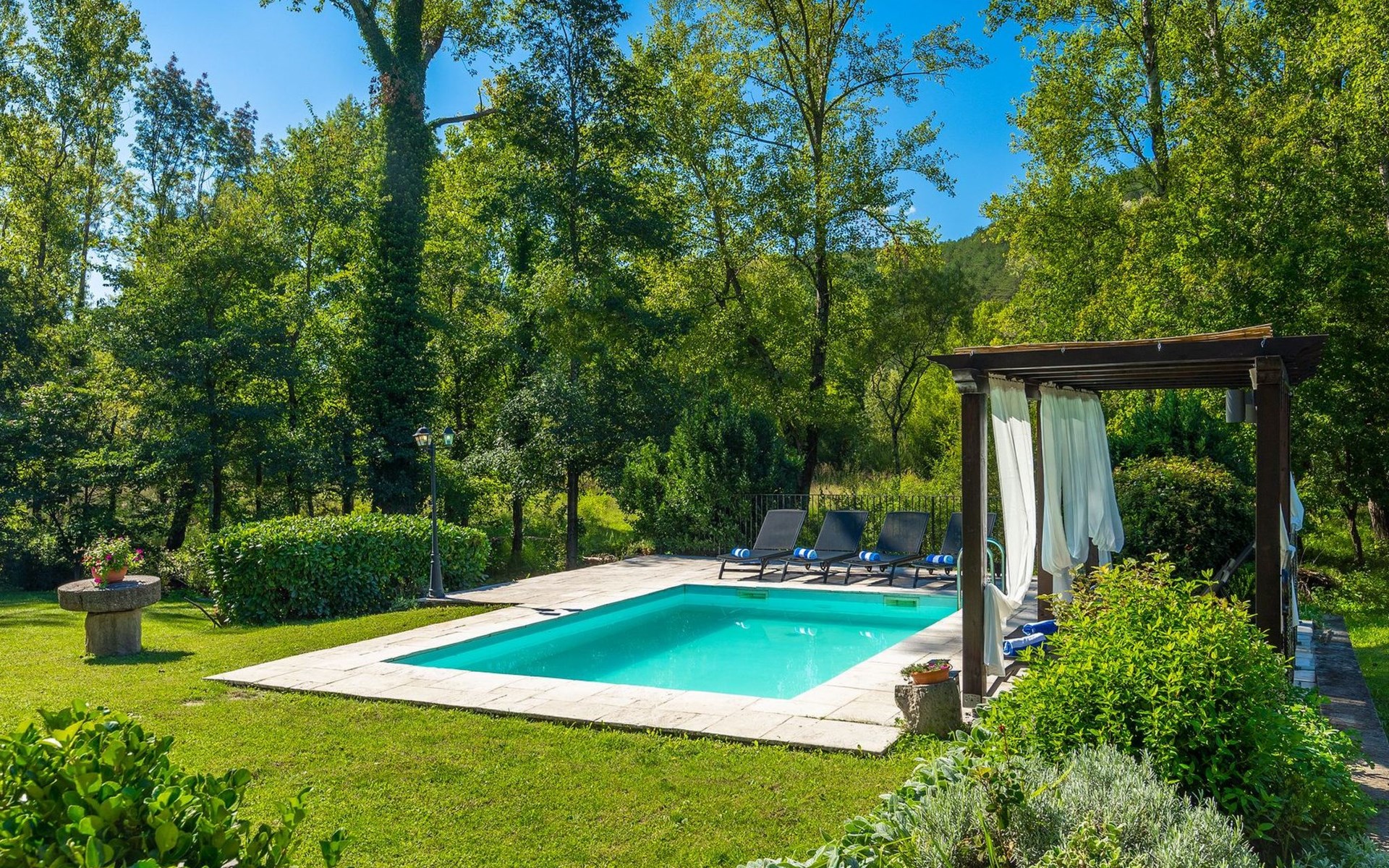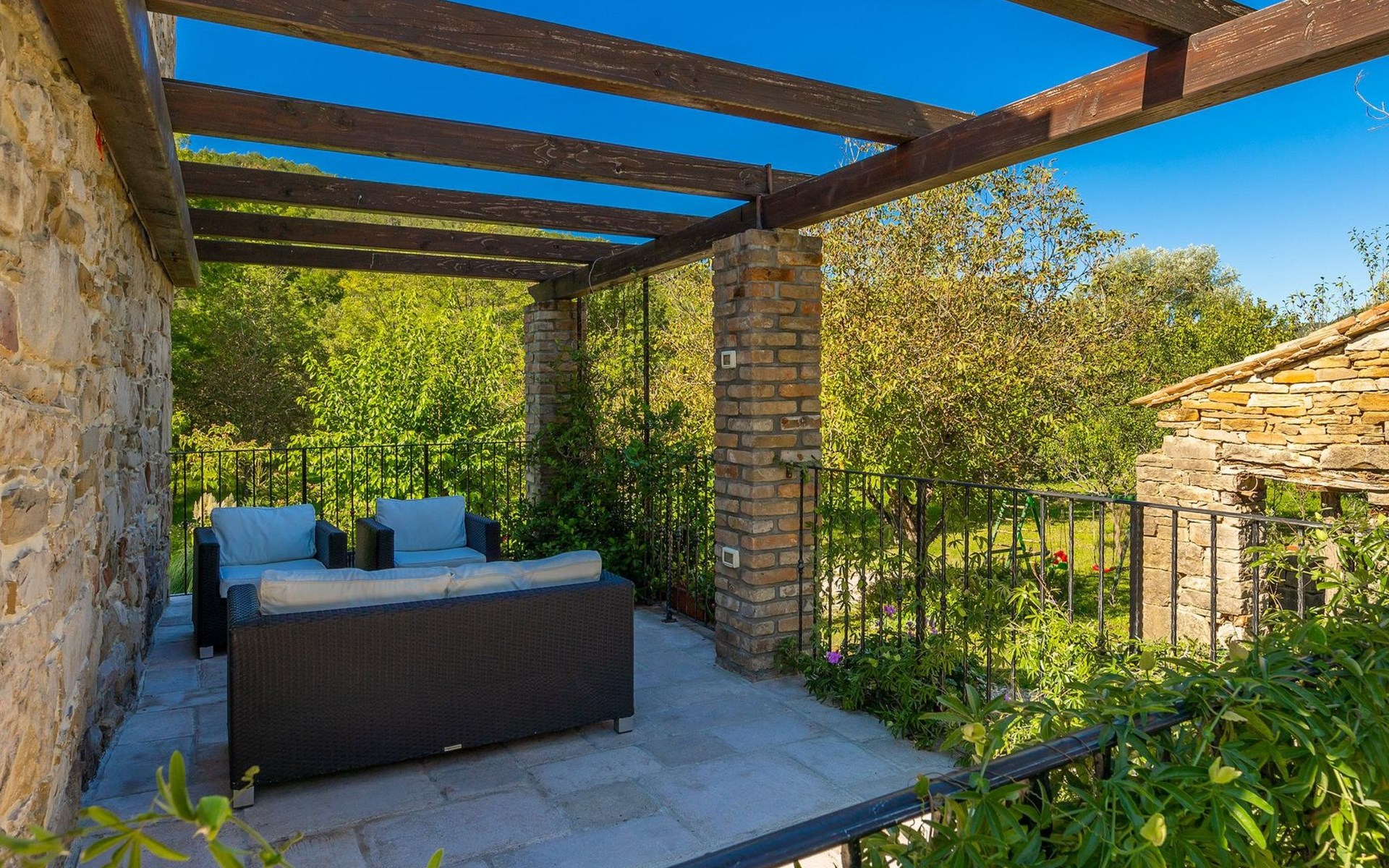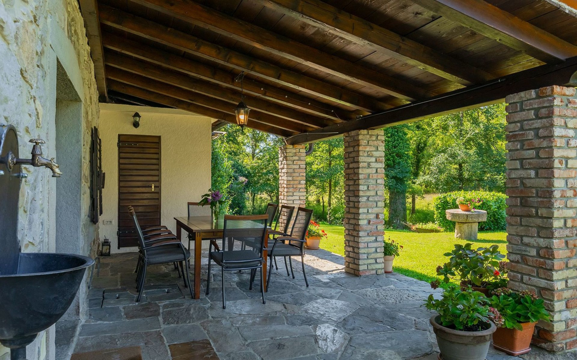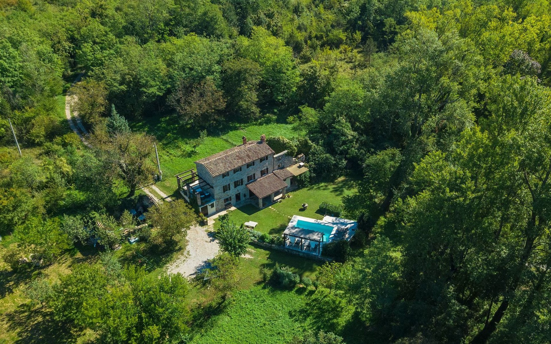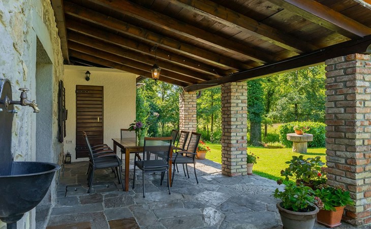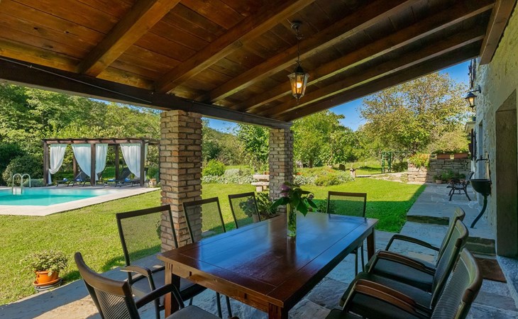 Der Außenbereich bezaubert durch seine Schönheit und Funktionalität. Die Villa Mulino liegt mitten im Grünen, umgeben von einem wunderschönen Wald, und wirkt wie ein versteckter Winkel. Genießen Sie den erfrischenden Pool oder entspannen Sie sich auf den Liegestühlen unter den warmen Strahlen der Sonne. Das Rauschen des Baches, der durch das Grundstück fließt, wird Ihnen ein zusätzliches Gefühl von Ruhe und Entspannung vermitteln, während Sie auf der überdachten Terrasse vor der Villa köstliche Mahlzeiten auf dem Steingrill im Garten zubereiten können.