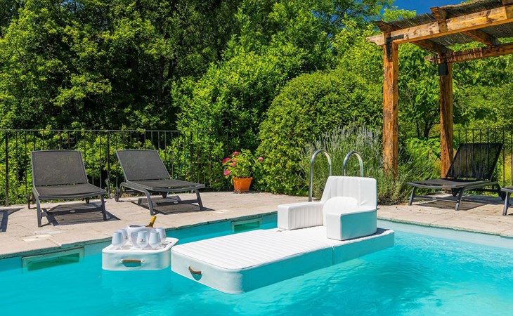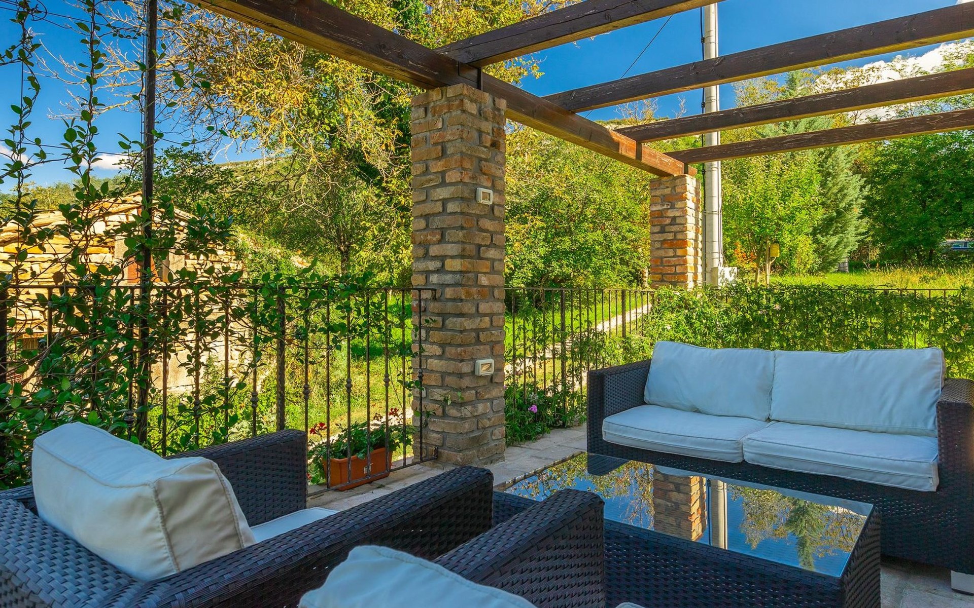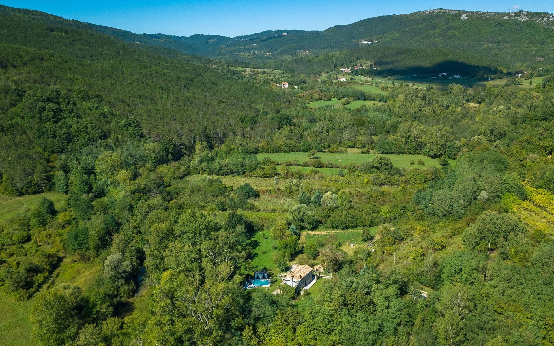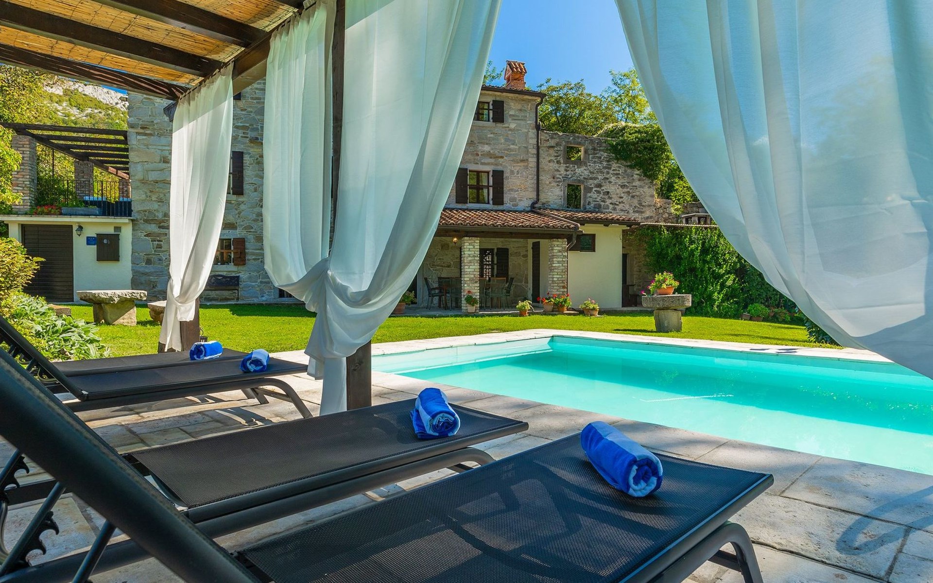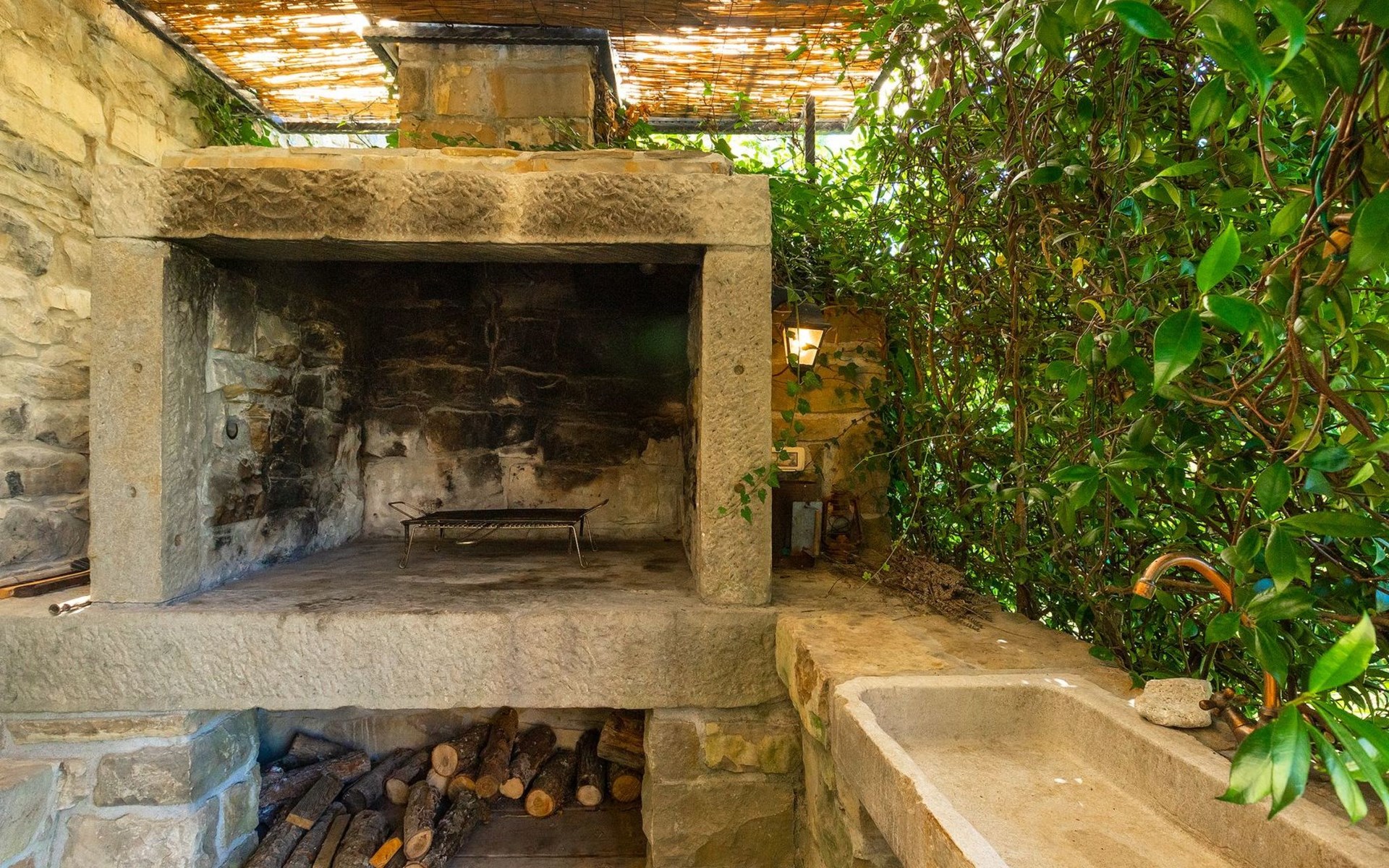 Der Außenbereich bezaubert durch seine Schönheit und Funktionalität. Die Villa Mulino liegt mitten im Grünen, umgeben von einem wunderschönen Wald, und wirkt wie ein versteckter Winkel. Genießen Sie den erfrischenden Pool oder entspannen Sie sich auf den Liegestühlen unter den warmen Strahlen der Sonne. Das Rauschen des Baches, der durch das Grundstück fließt, wird Ihnen ein zusätzliches Gefühl von Ruhe und Entspannung vermitteln, während Sie auf der überdachten Terrasse vor der Villa köstliche Mahlzeiten auf dem Steingrill im Garten zubereiten können.