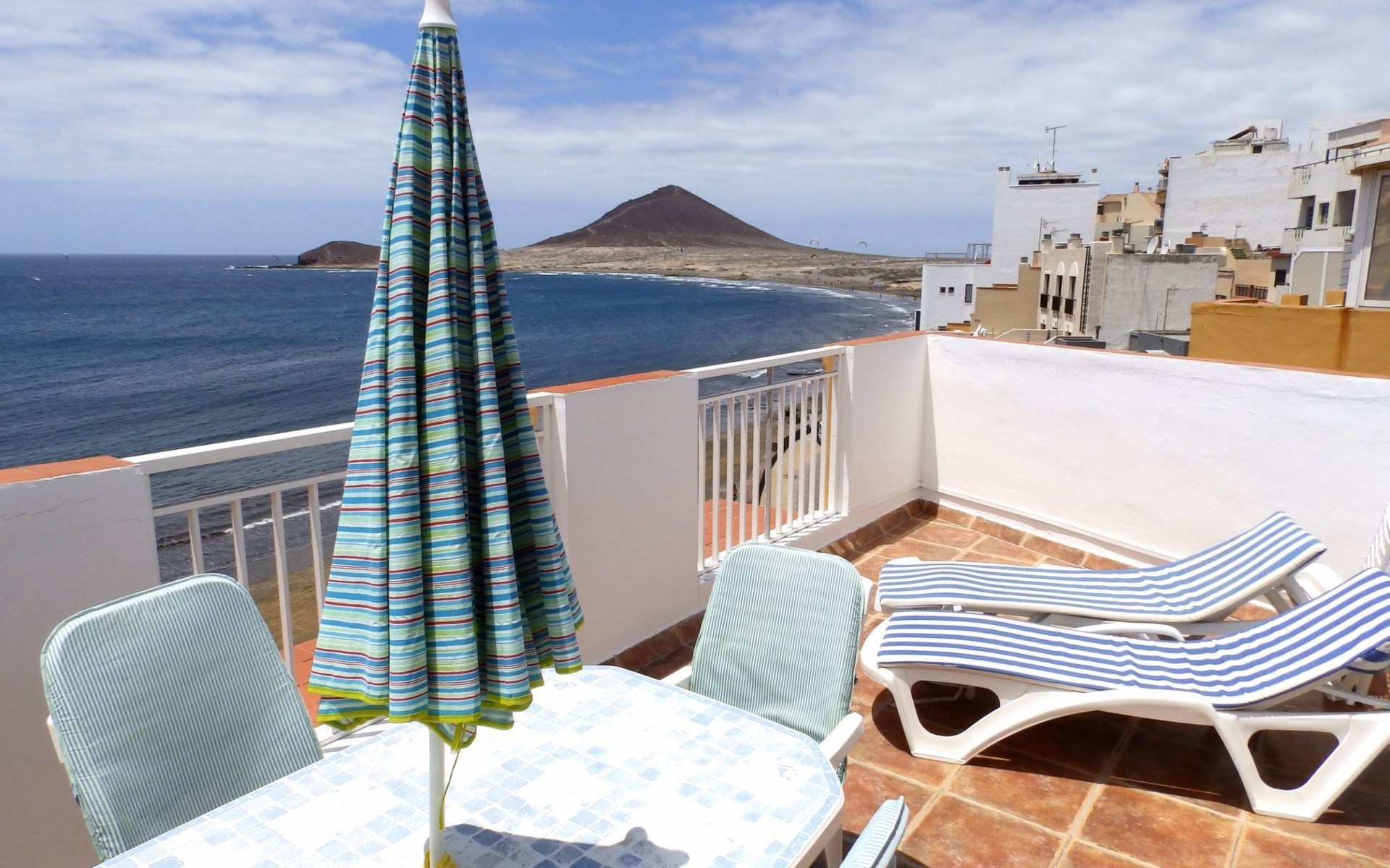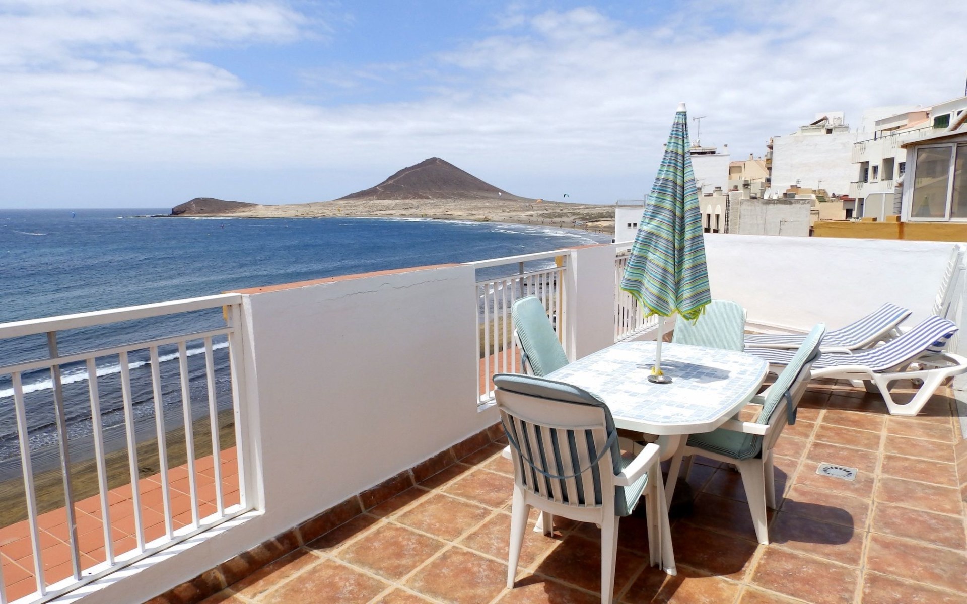 Der Außenbereich ist nicht weniger beeindruckend; vom Wohnzimmer aus führen zwei große Fenster auf eine geräumige Terrasse, die mit Sonnenliegen, Tisch und Stühlen ausgestattet ist. Sie ist der ideale Ort, um Mittag- und Abendessen im Freien zu genießen, begleitet von einem herrlichen Panoramablick auf den Strand und La Montaña Roja. Diese Terrasse ist das Herzstück unseres Penthouses und bietet den perfekten Rahmen, um sich zu entspannen, die Landschaft zu betrachten und die strahlende Sonne von El Médano aufzusaugen.