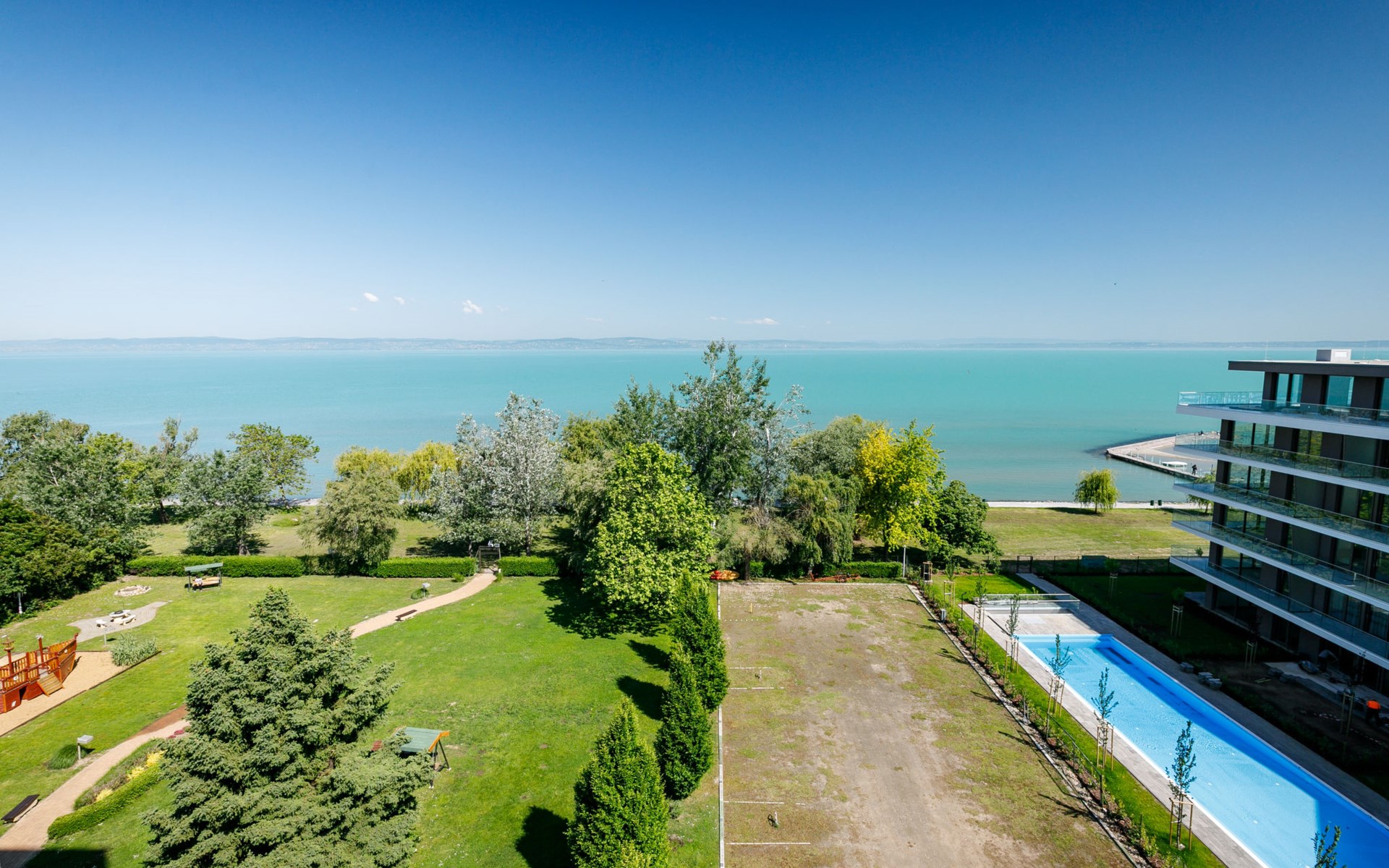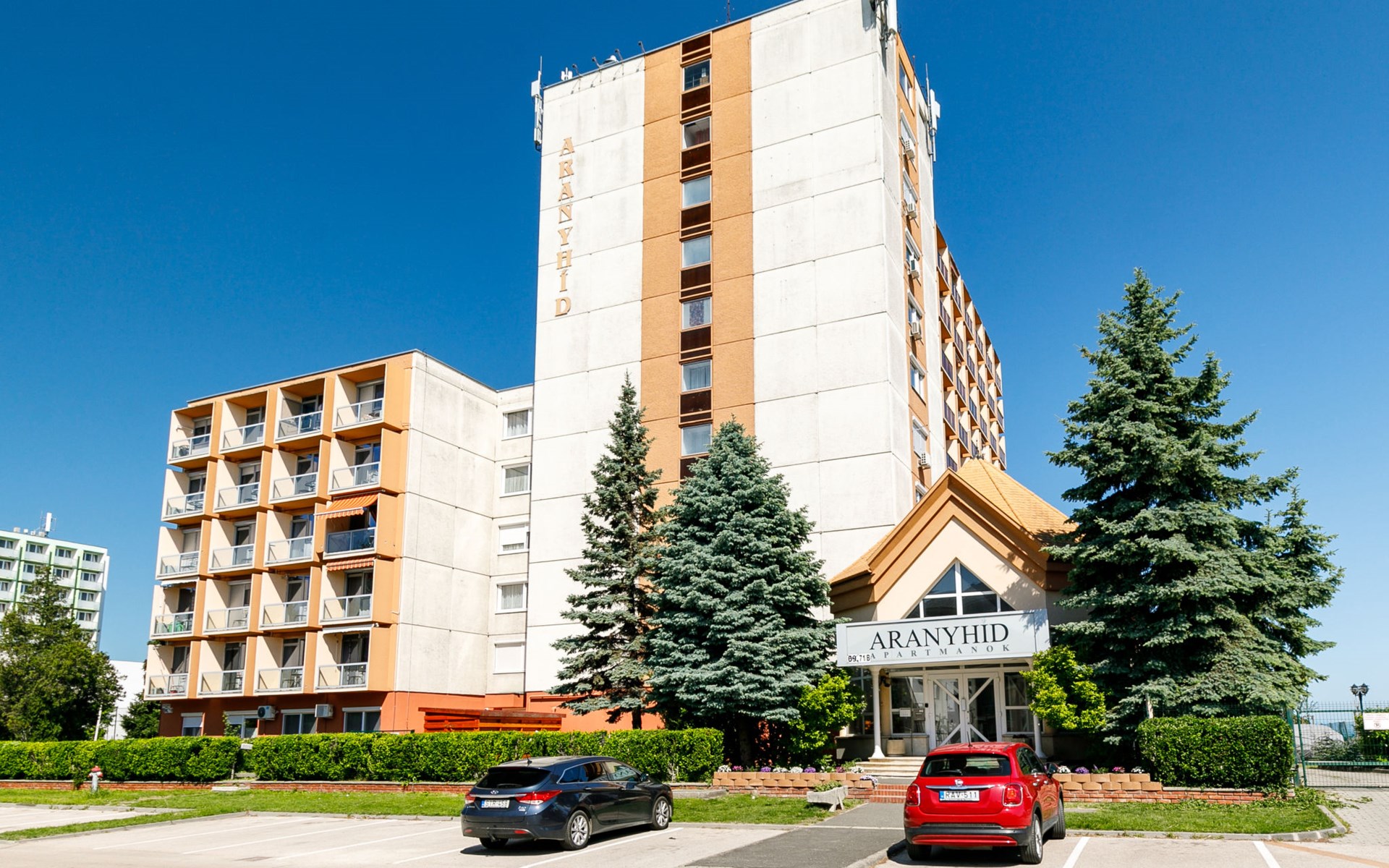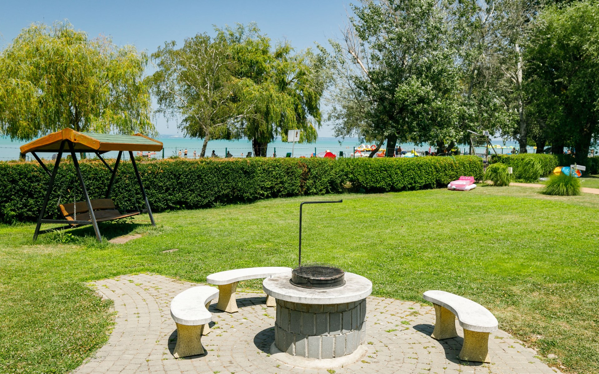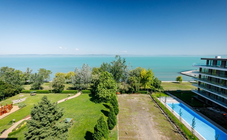 Siófok: Appartementhaus "Golden Gate". 50 m vom See, 100 m vom Strand, direkter Zugang zum Strand. Zur Mitbenutzung: Park 2'000 m2, gepflegter Garten. Grill, Feuerstelle, Kinderspielplatz (Rutschbahn, Schaukel, Sandkasten). In der Anlage: Empfang, Aufenthaltsraum mit TV, Wireless LAN, Sauna (extra). Sprudelbad (extra). Tischtennis, Fahrstuhl. Parkplatz Nr. 11. Hallenbad 500 m. Angelmöglichkeit 50 m. Bitte beachten: Angeln (mit Bewilligung).