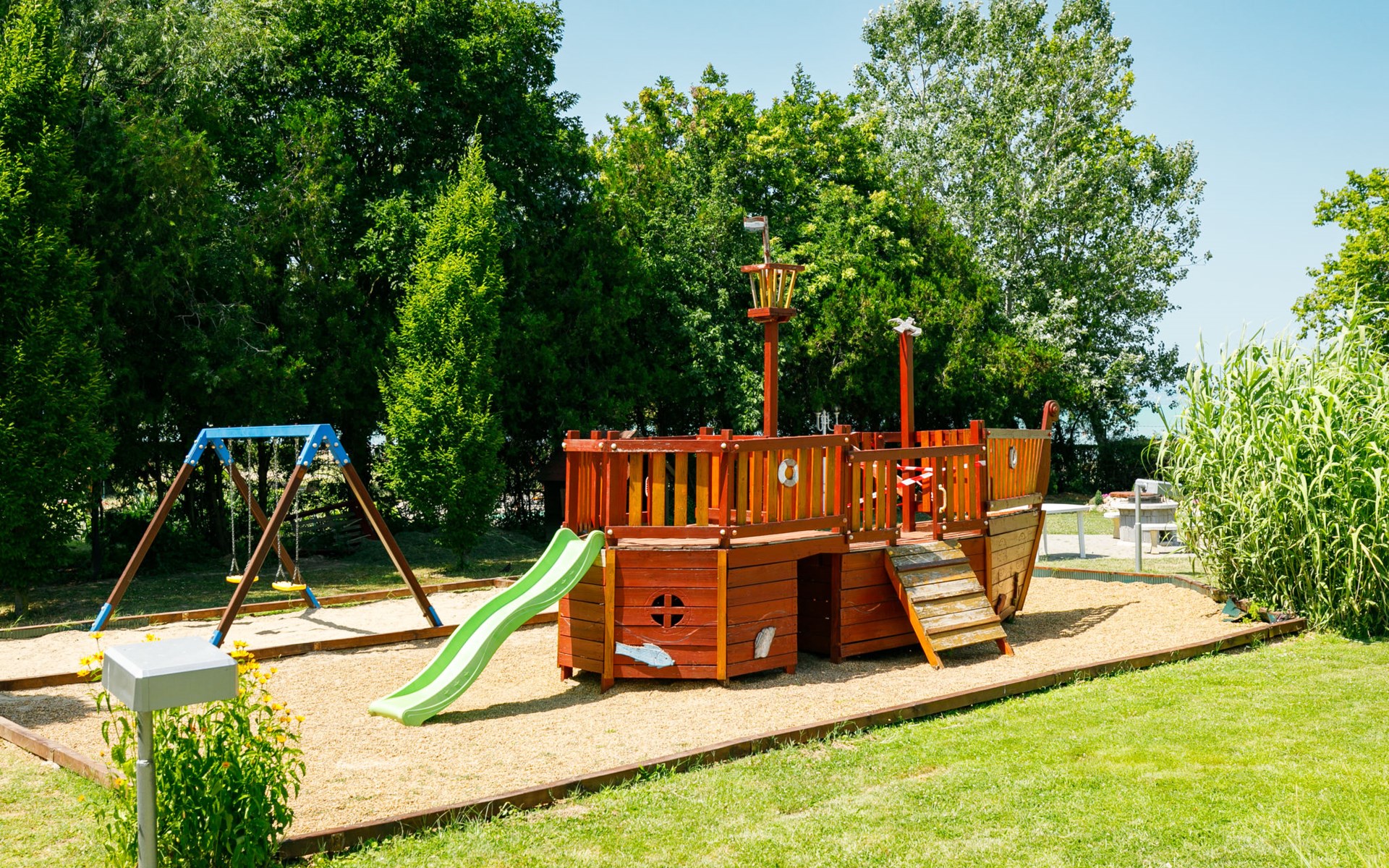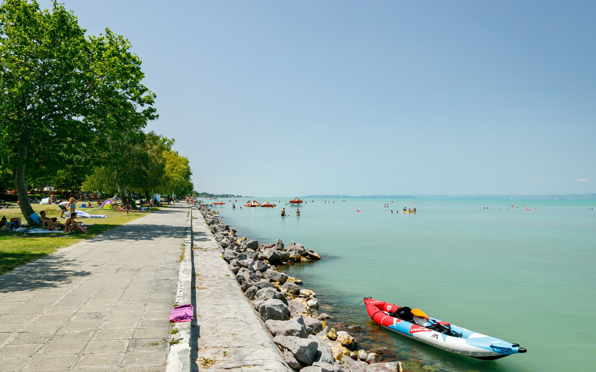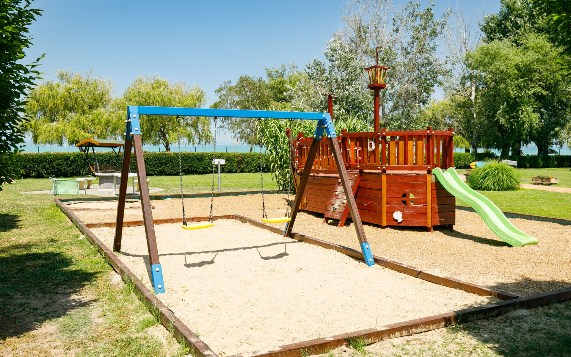 Siófok: Appartementhaus "Golden Gate". 50 m vom See, 100 m vom Strand, direkter Zugang zum Strand. Zur Mitbenutzung: Park 2'000 m2, gepflegter Garten. Grill, Feuerstelle, Kinderspielplatz (Rutschbahn, Schaukel, Sandkasten). In der Anlage: Empfang, Aufenthaltsraum mit TV, Wireless LAN, Sauna (extra). Sprudelbad (extra). Tischtennis, Fahrstuhl. Parkplatz Nr. 11. Hallenbad 500 m. Angelmöglichkeit 50 m. Bitte beachten: Angeln (mit Bewilligung).